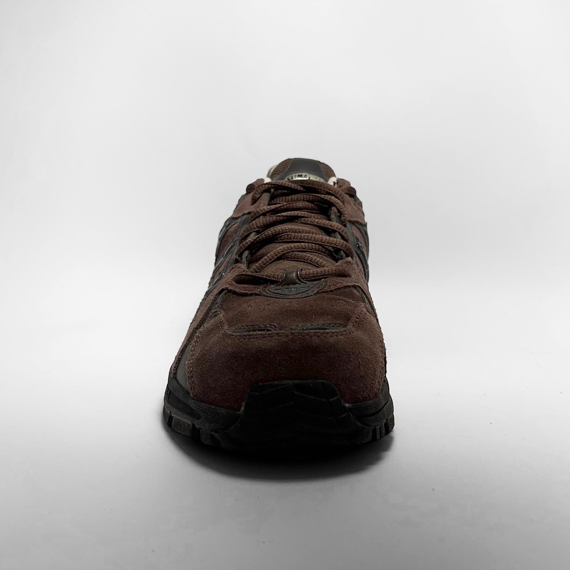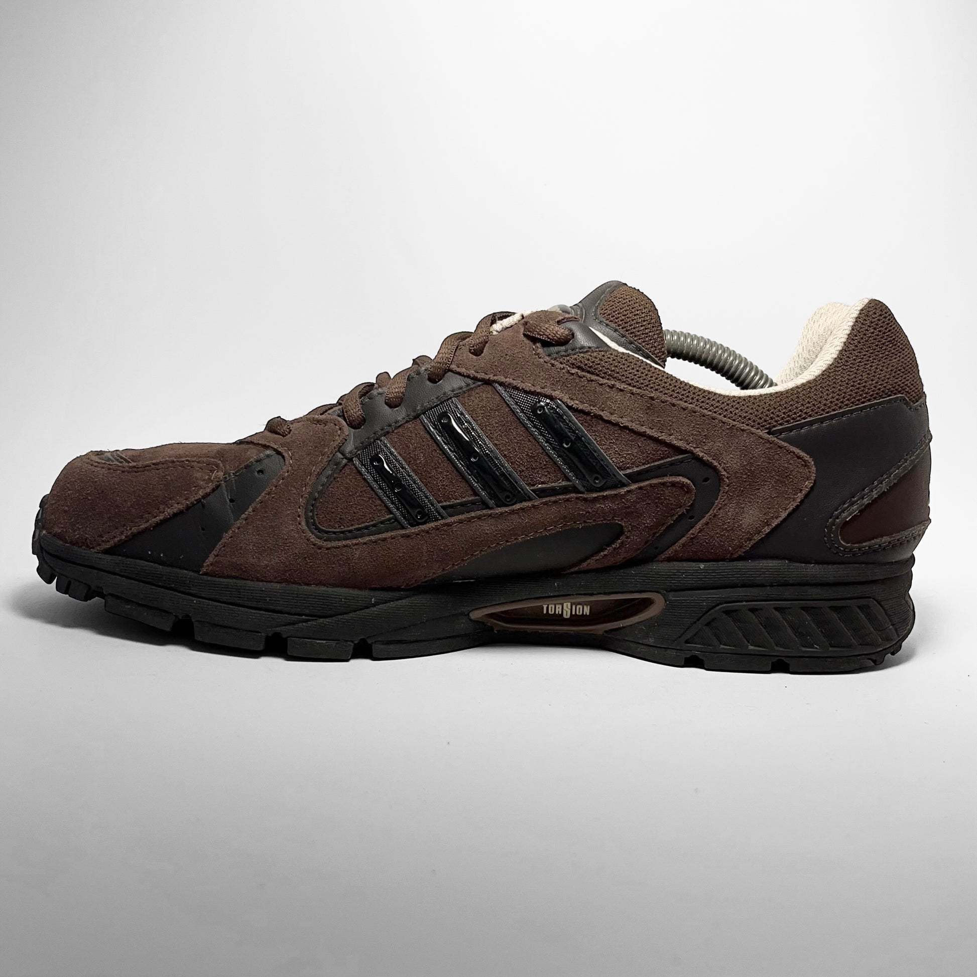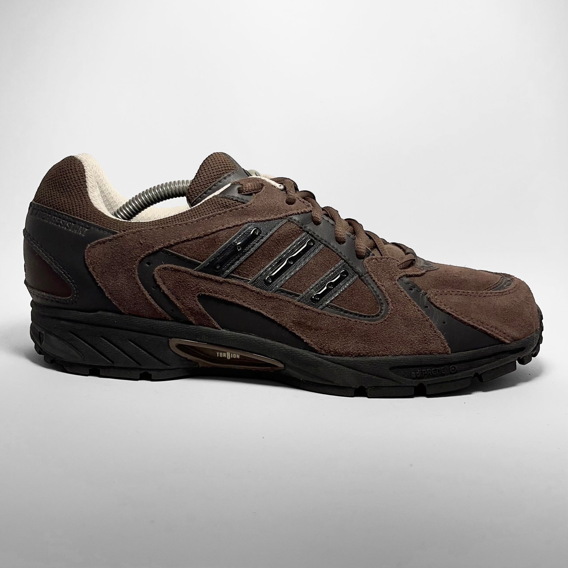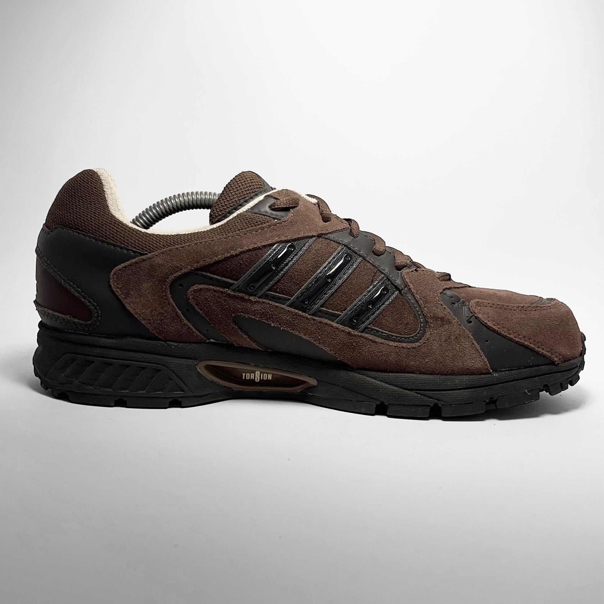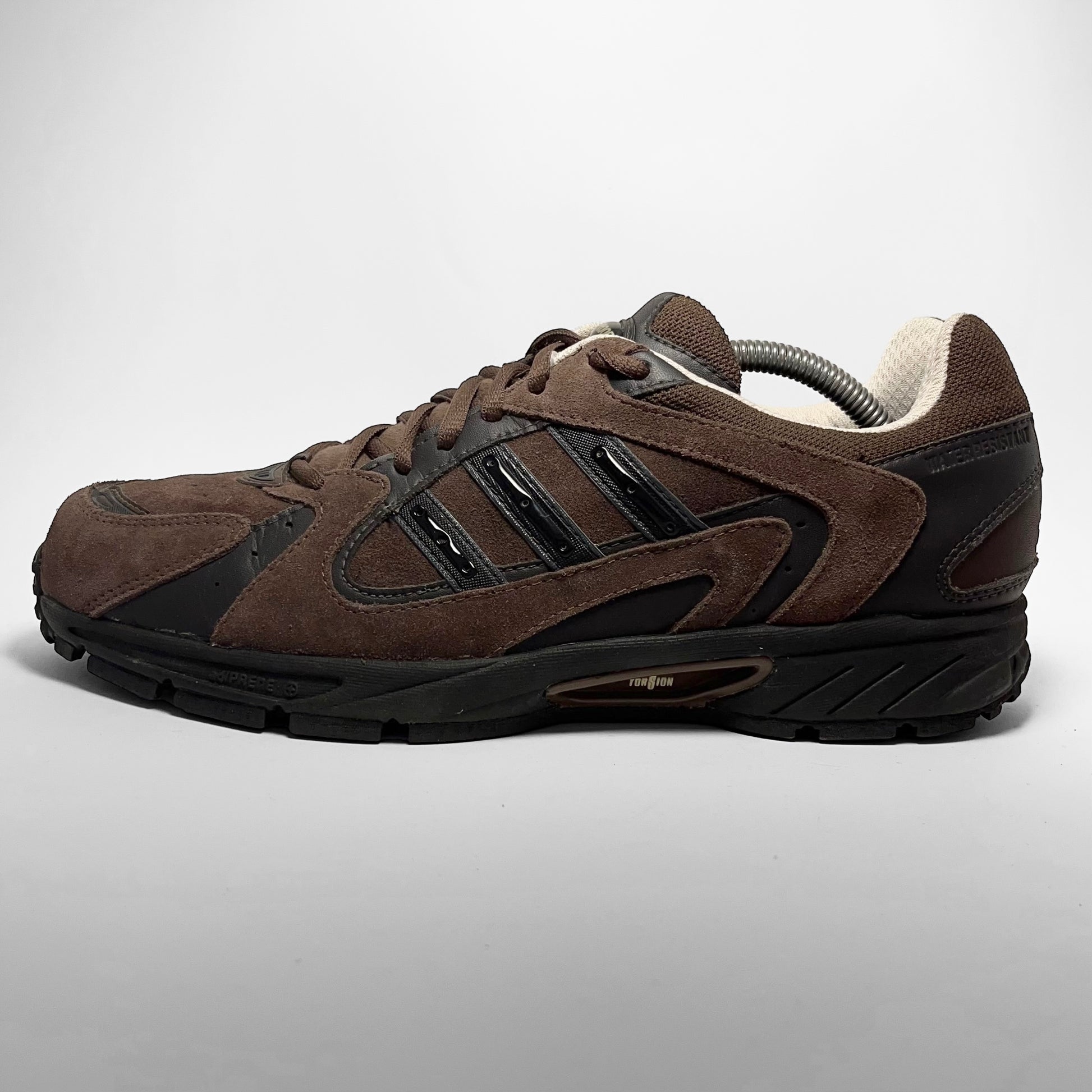 Condition is like new. Brown suede upper panels layered with black leather panels throughout and metallic black detailed three stripes, water resistant script embossed on the heel and torsion soling system.