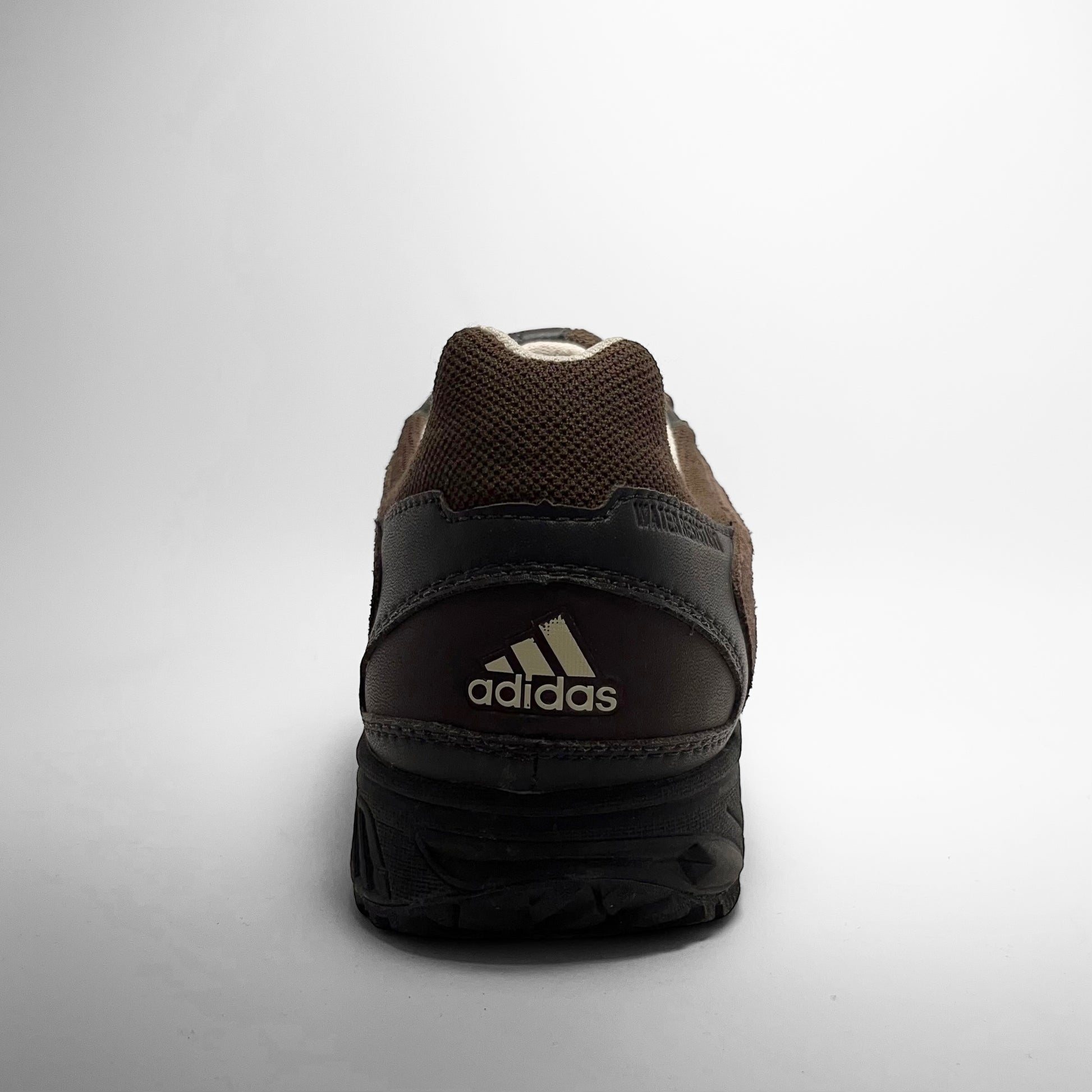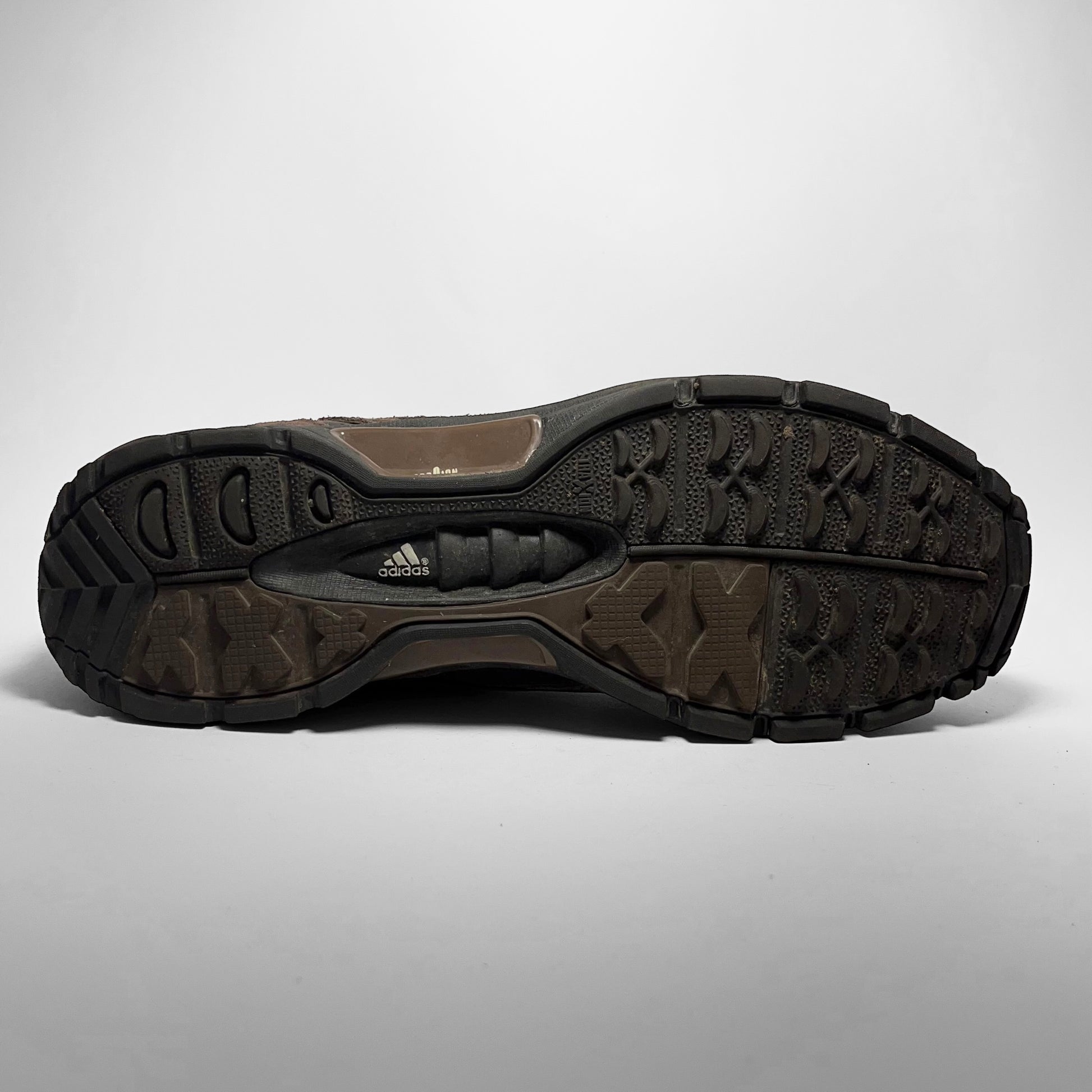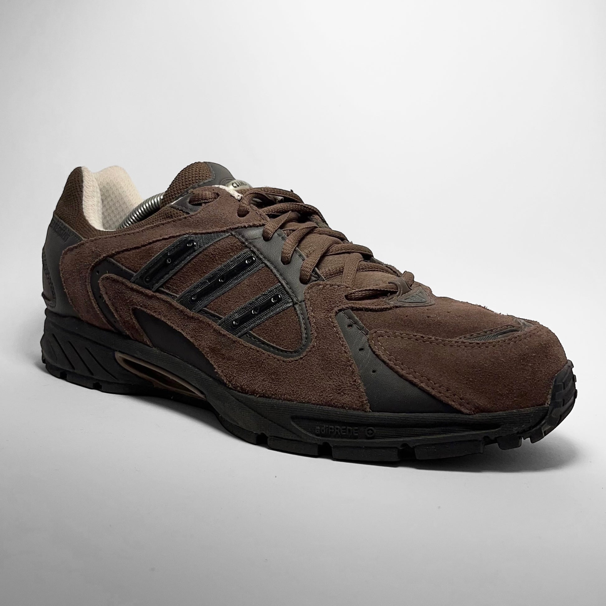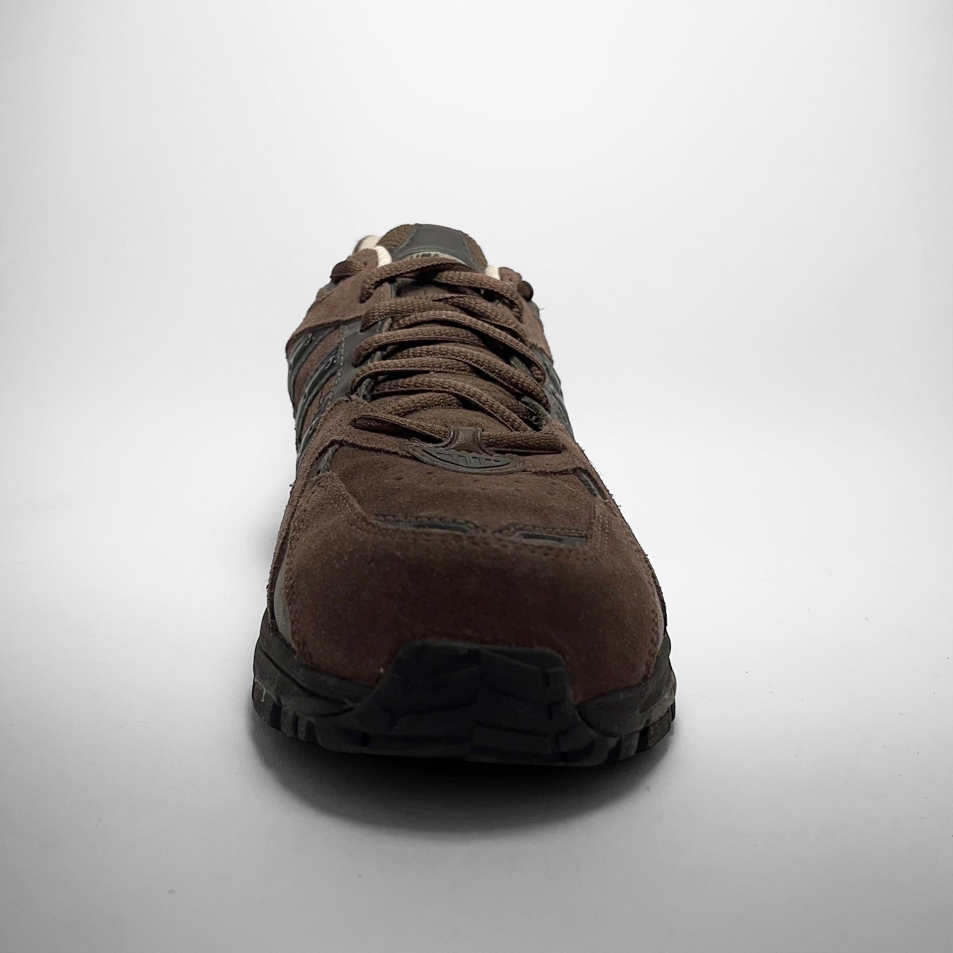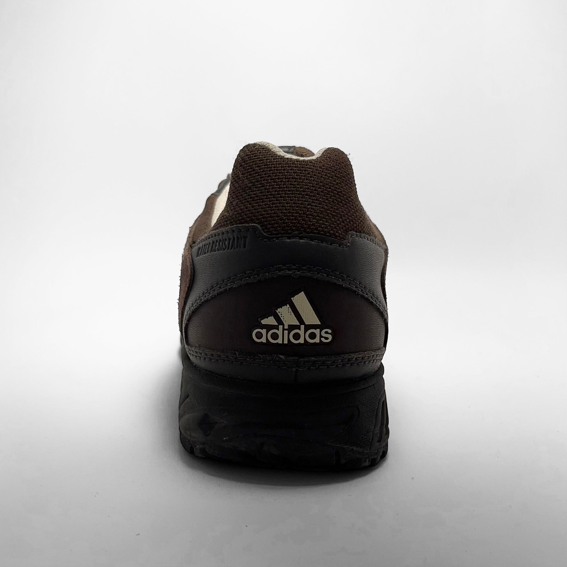 Condition is like new. Brown suede upper panels layered with black leather panels throughout and metallic black detailed three stripes, water resistant script embossed on the heel and torsion soling system.
