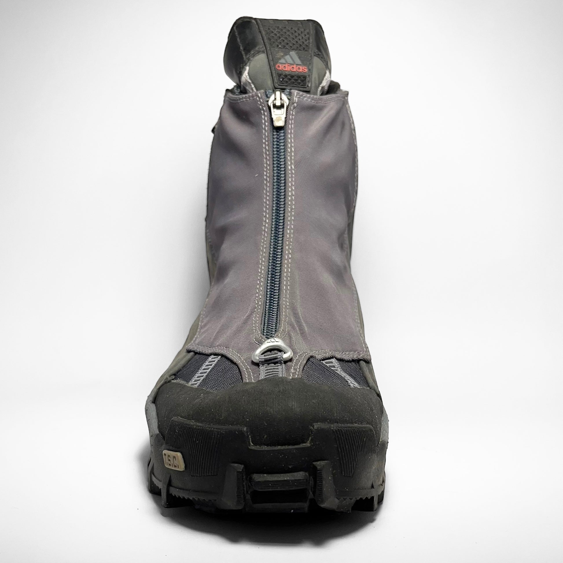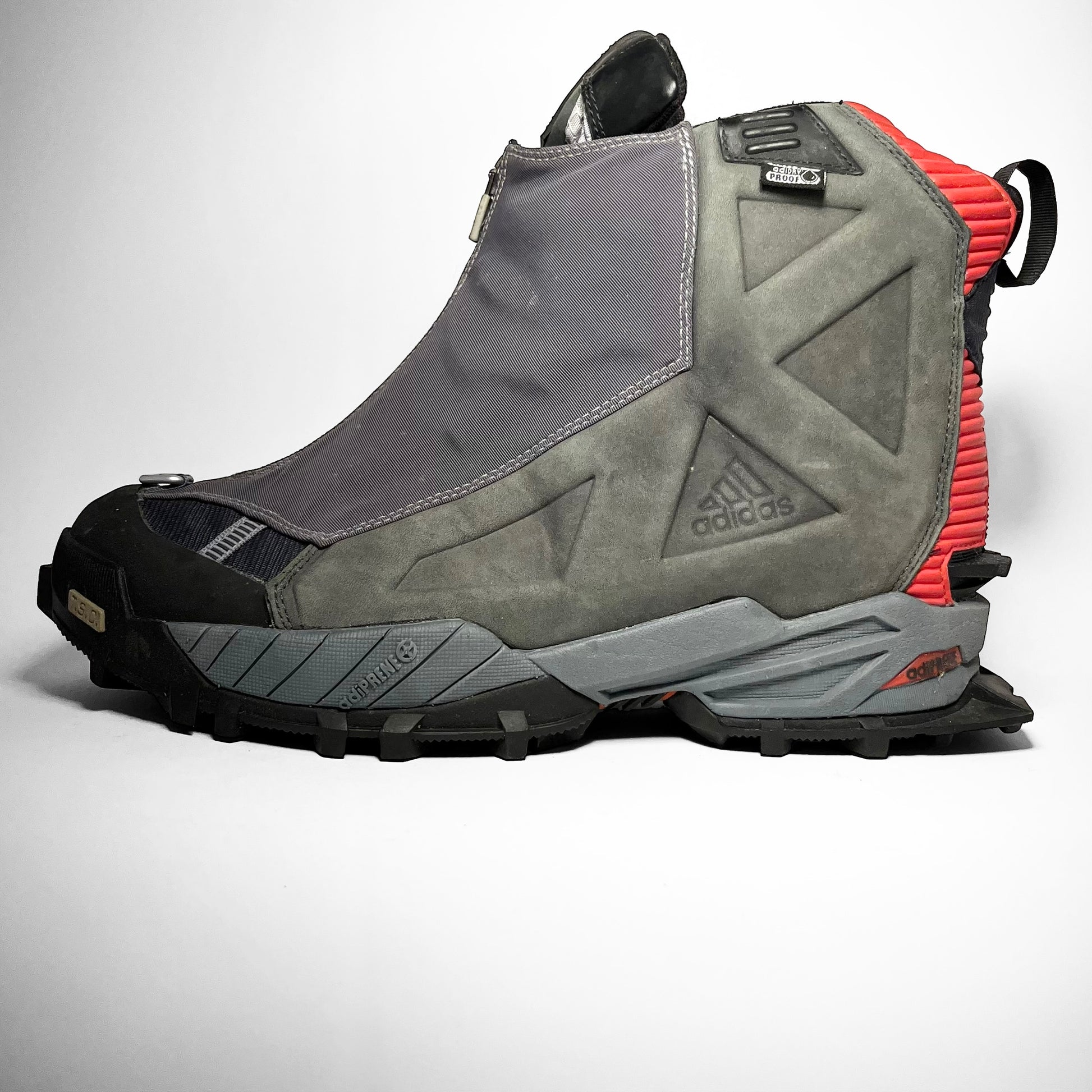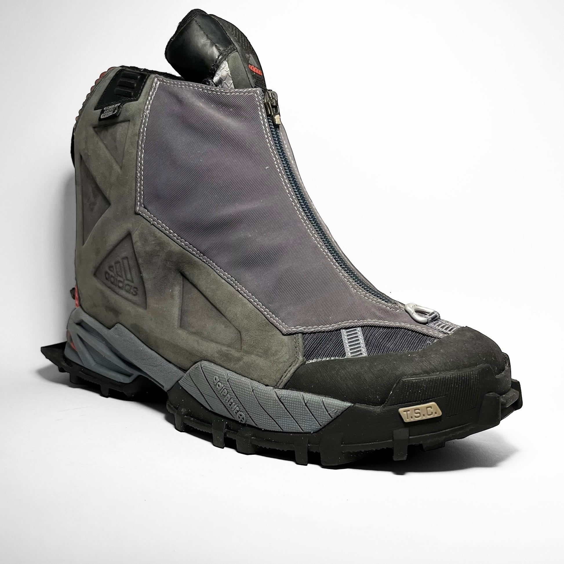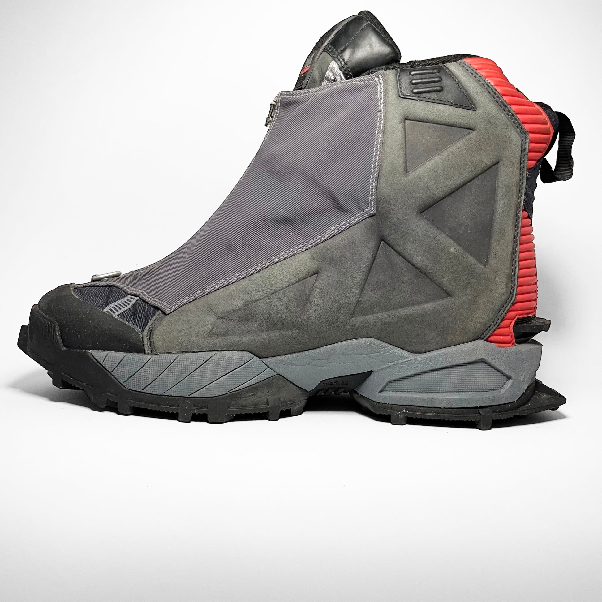 Grey leather panels with triangular embossed shapes, neoprene rain cover with clip to lock hike pants, TSC trail tooling (Temperature Sensitive Compound), red rubber detailed heelpanel, black leather and grey ripstop tongue.