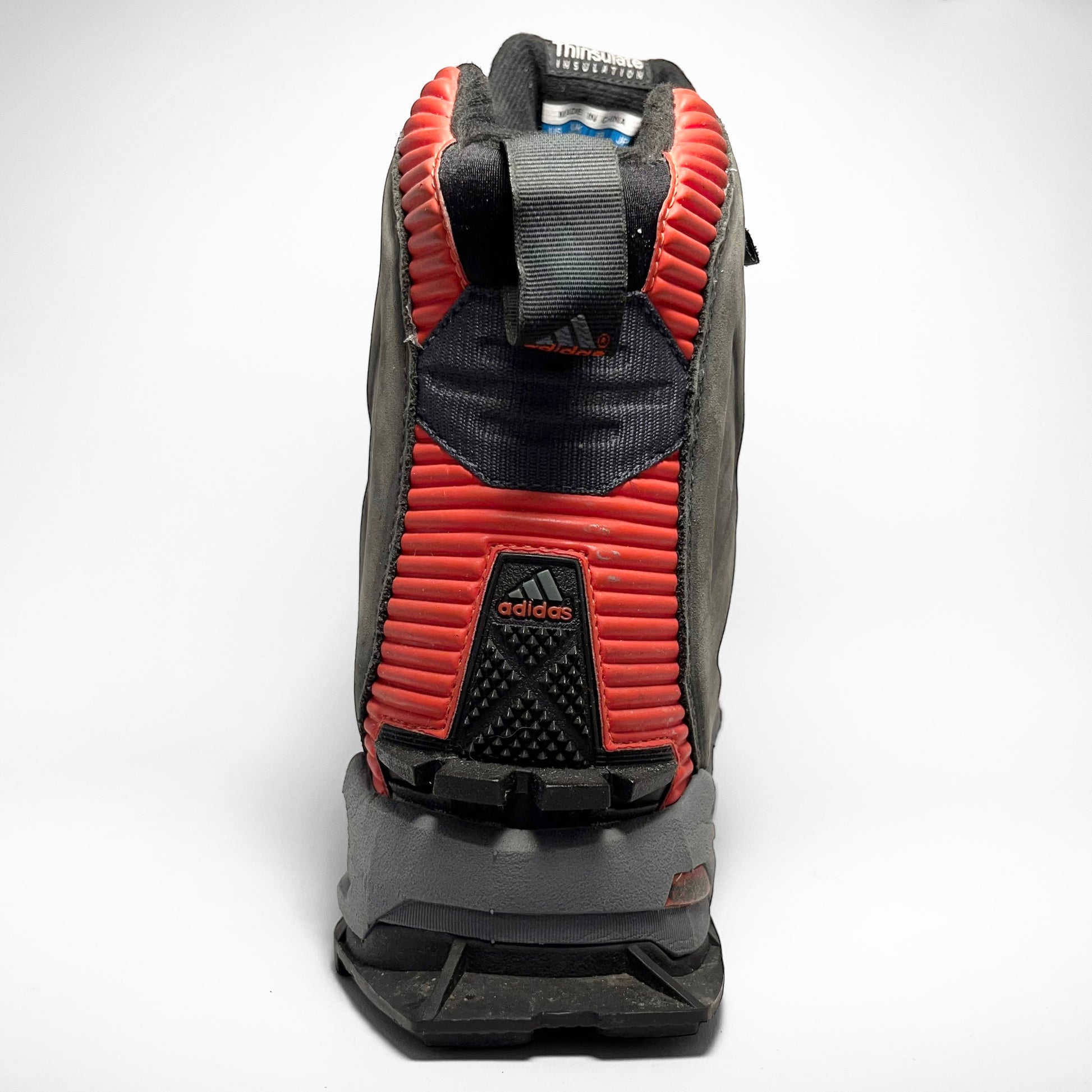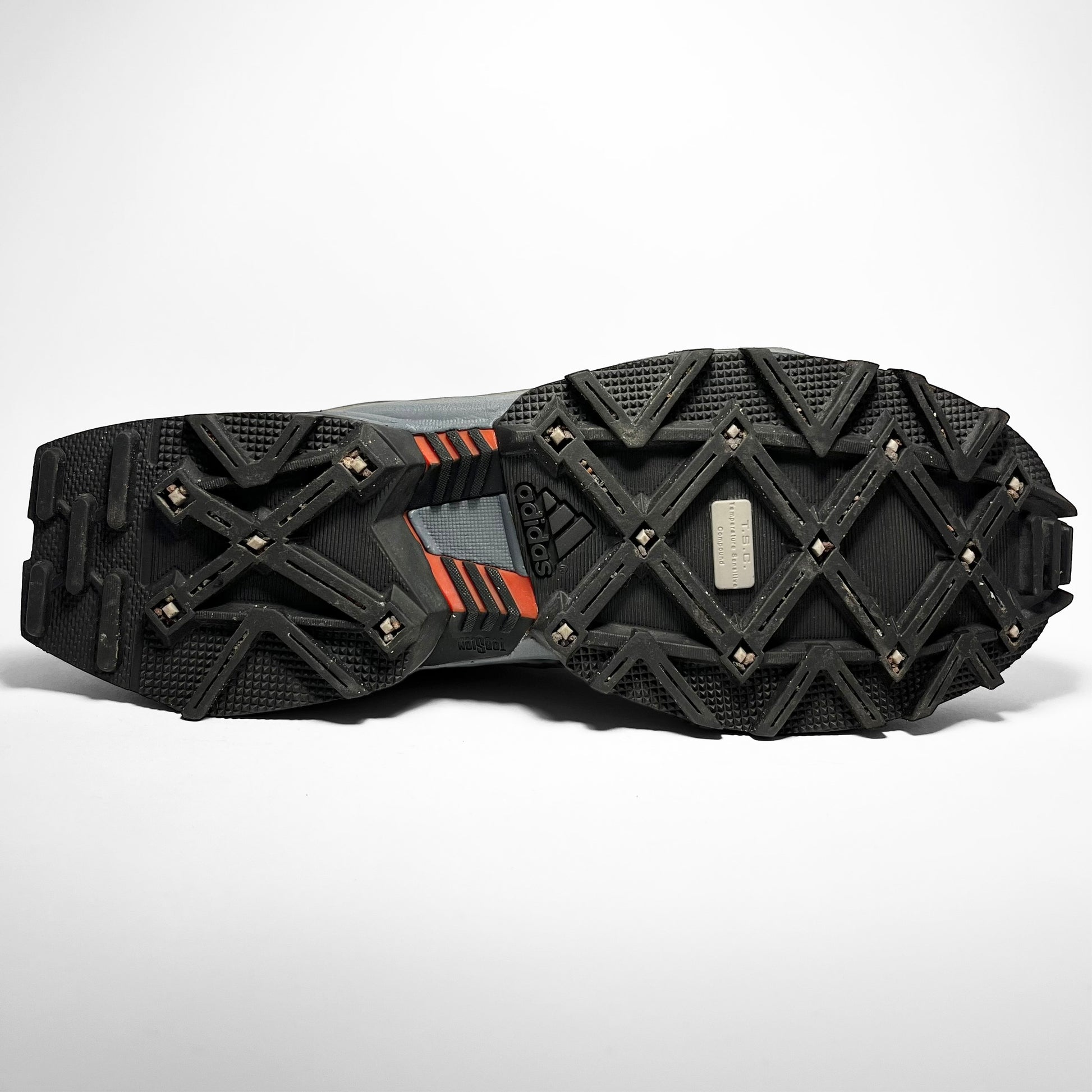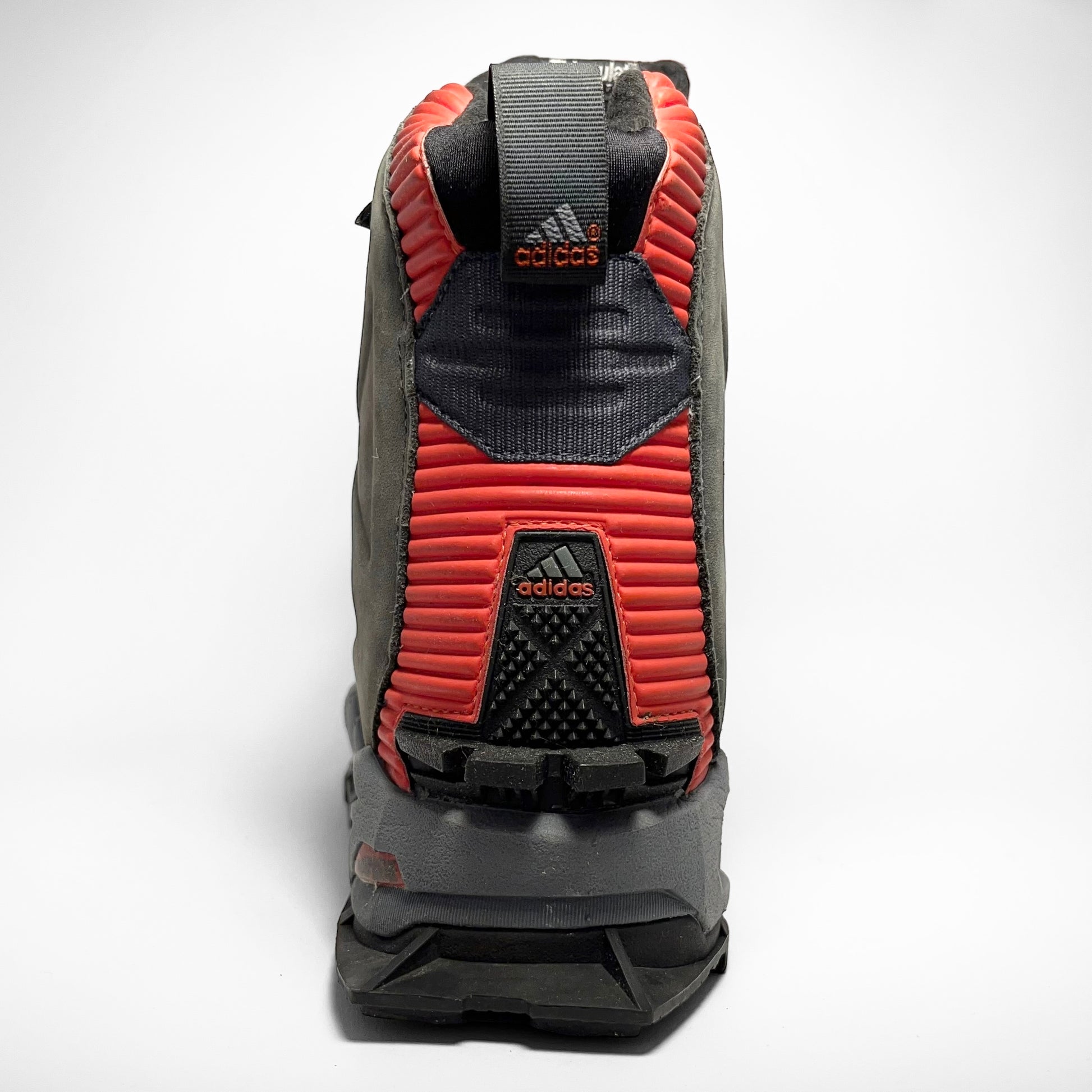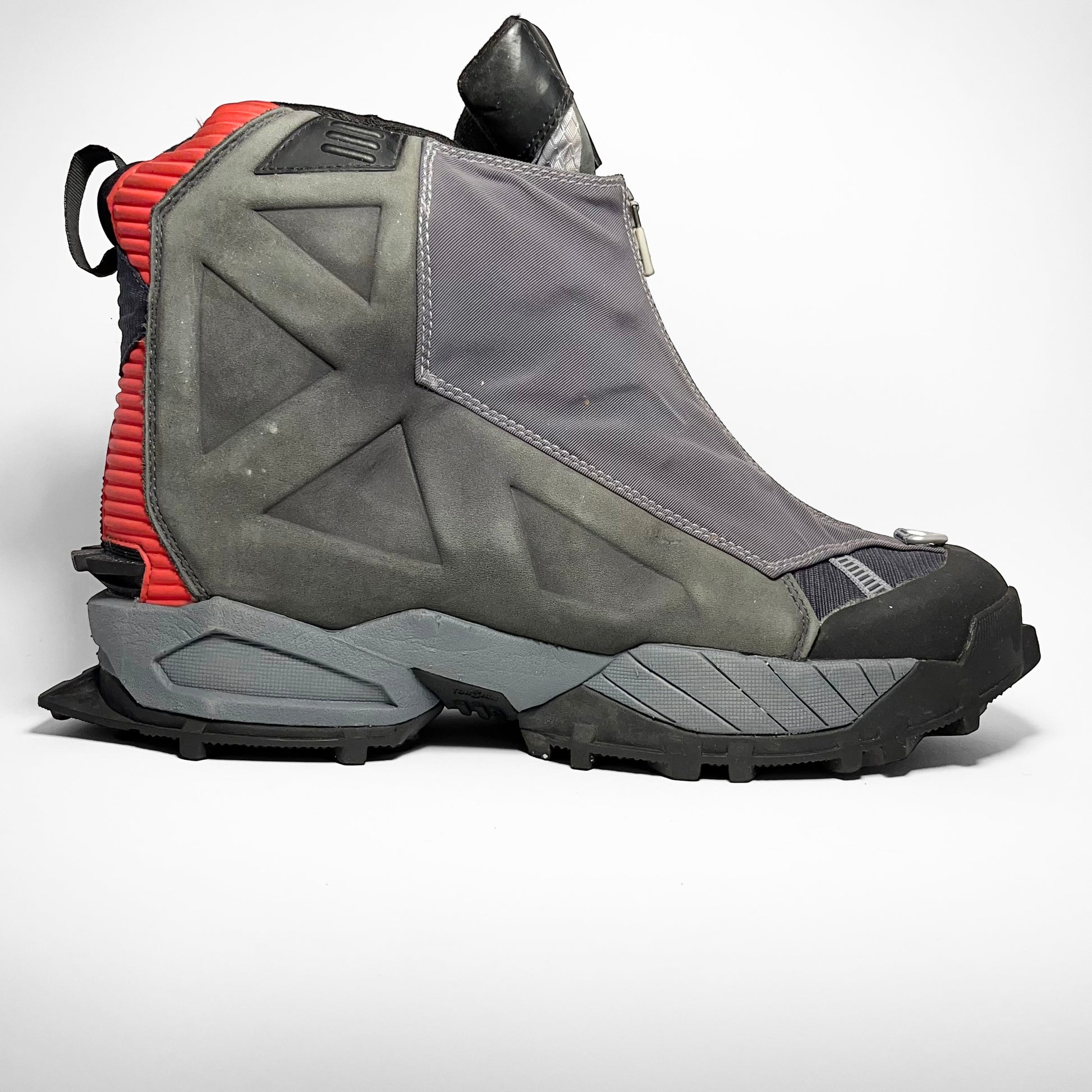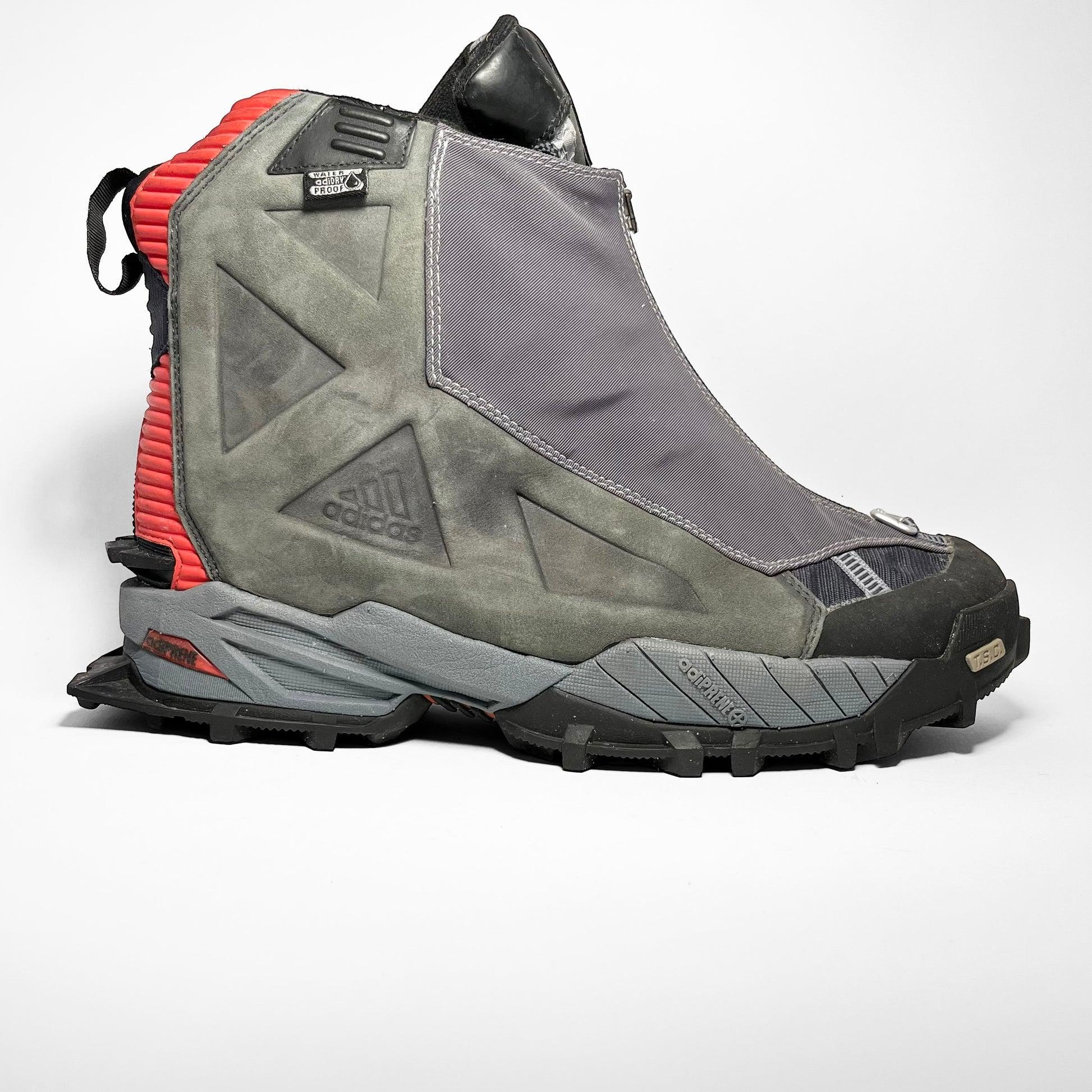 Grey leather panels with triangular embossed shapes, neoprene rain cover with clip to lock hike pants, TSC trail tooling (Temperature Sensitive Compound), red rubber detailed heelpanel, black leather and grey ripstop tongue.