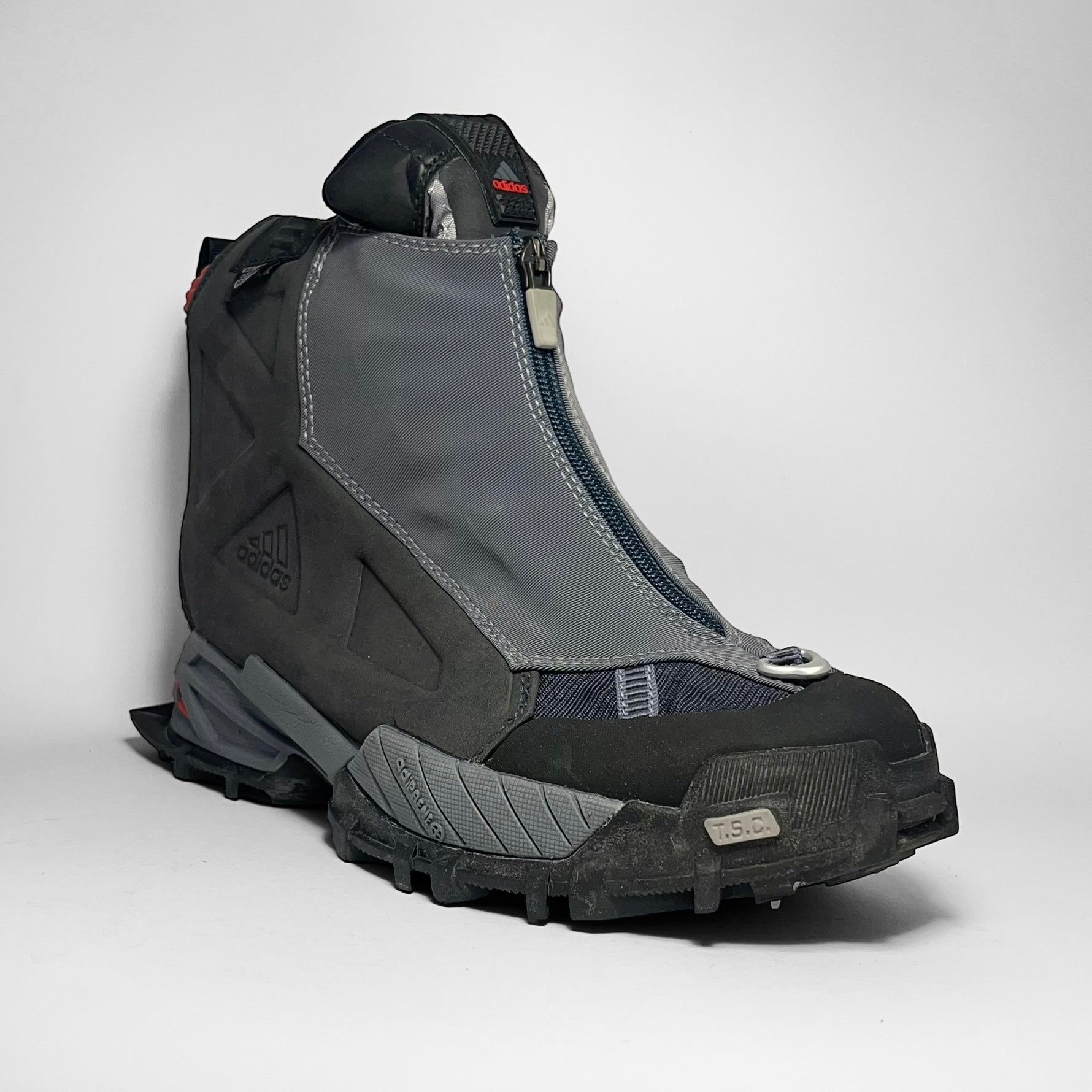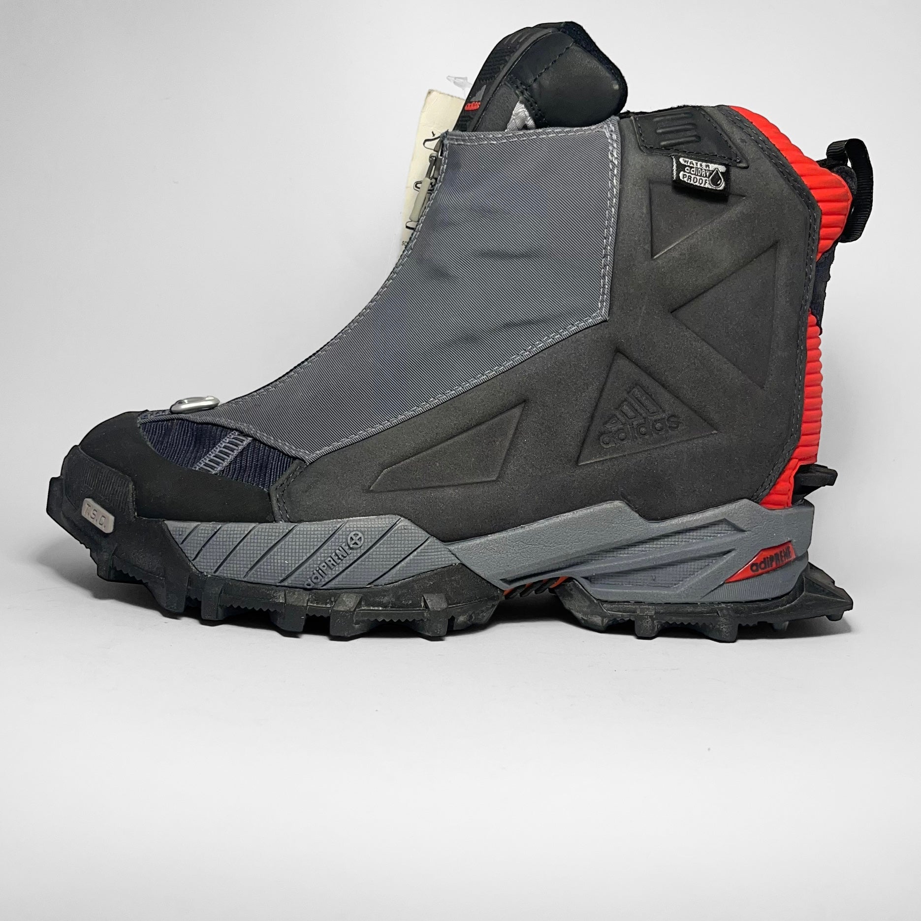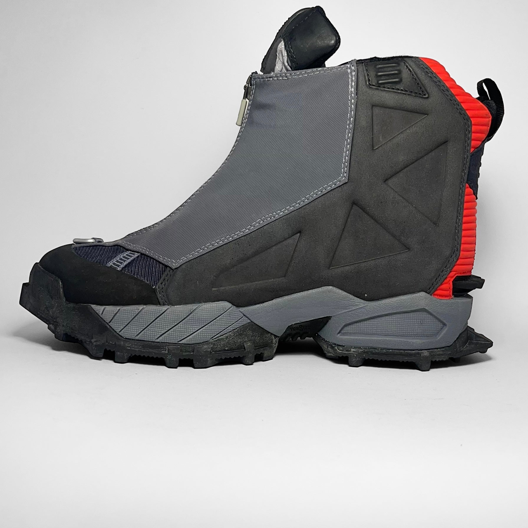 Sublime example of how to execute an off-terrain boot that can withstand all conditions. Woven nylon zip cover for the lacing system, woven nylon base front part with enforced belts, robust and embossed detailing side panels, rear-chassis, trail outsole, tooling and metal clip at front to secure your hiking pants. All with AdiDry (waterproof) technology. Perfect for styling and referencing.