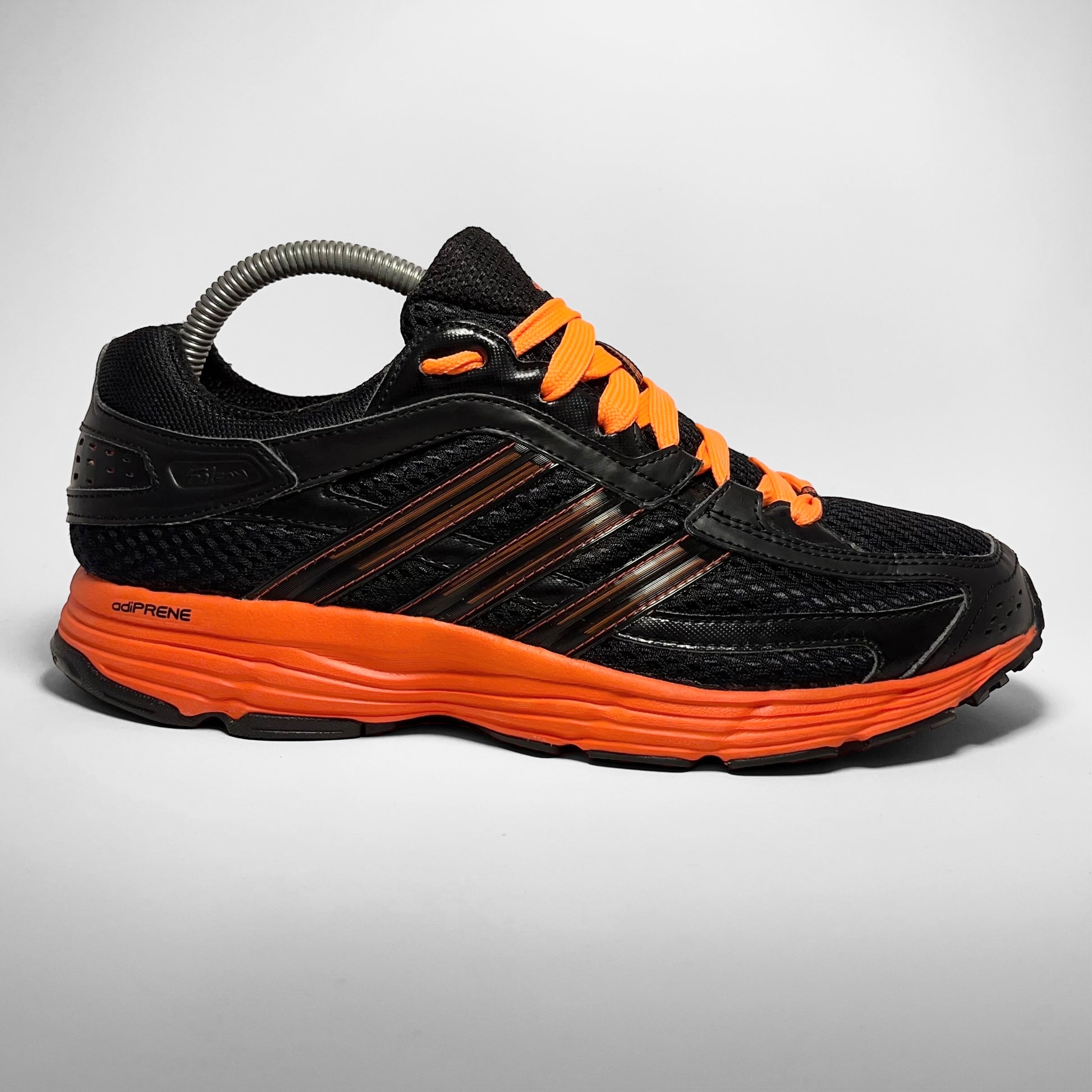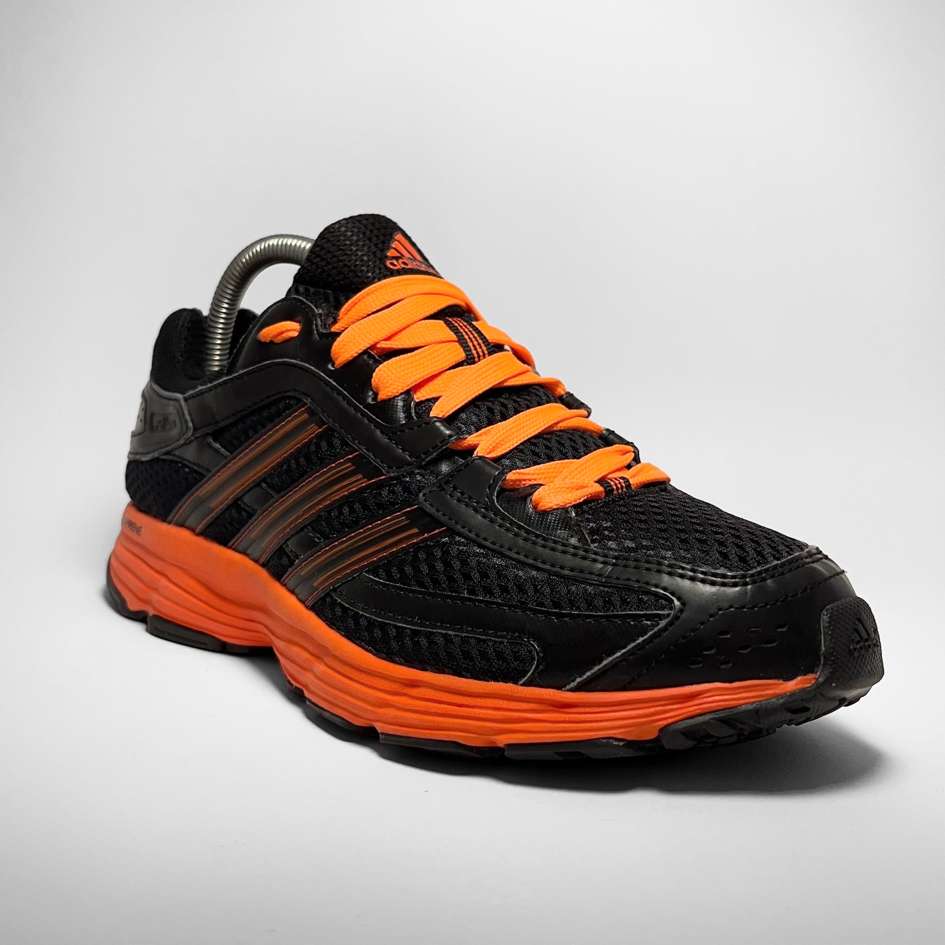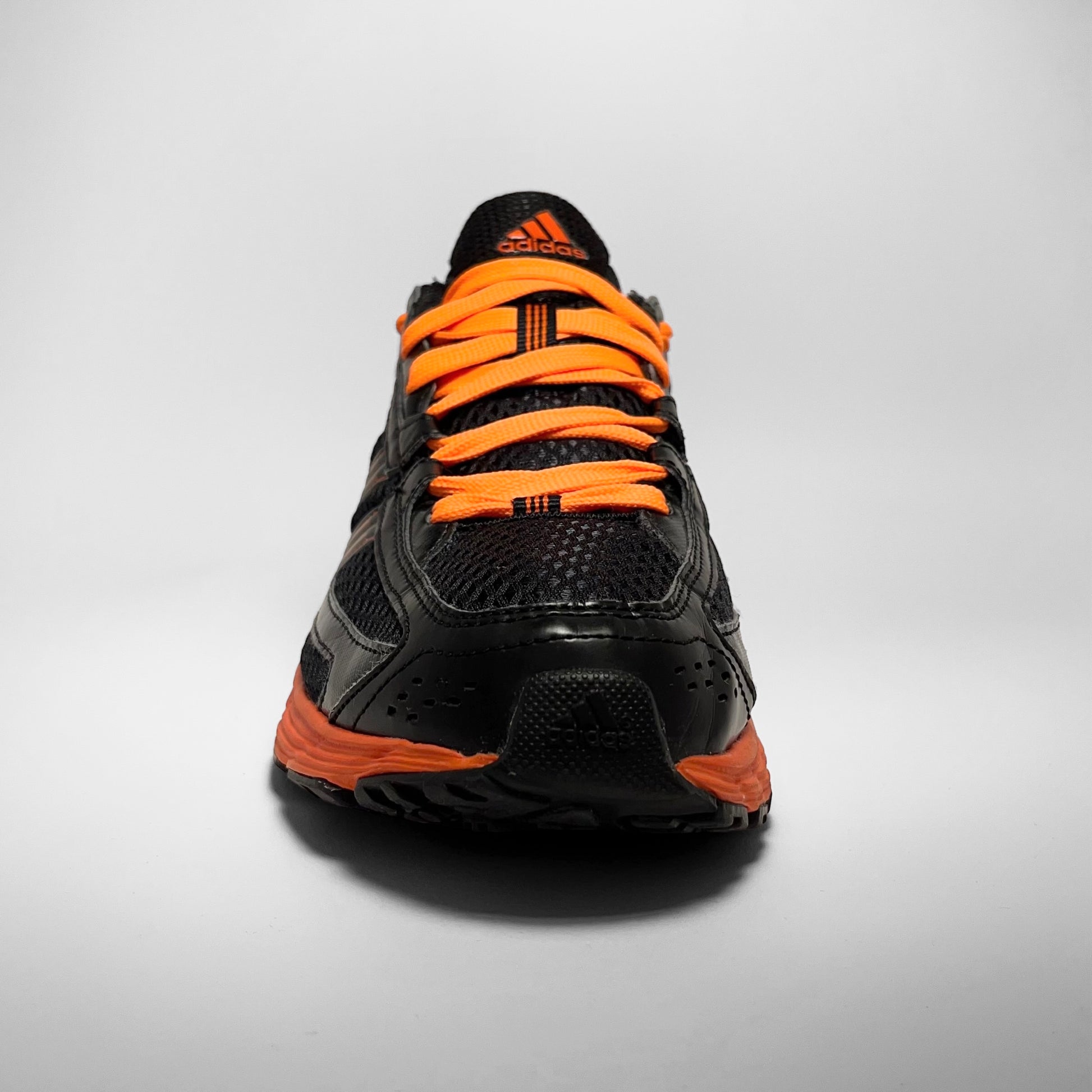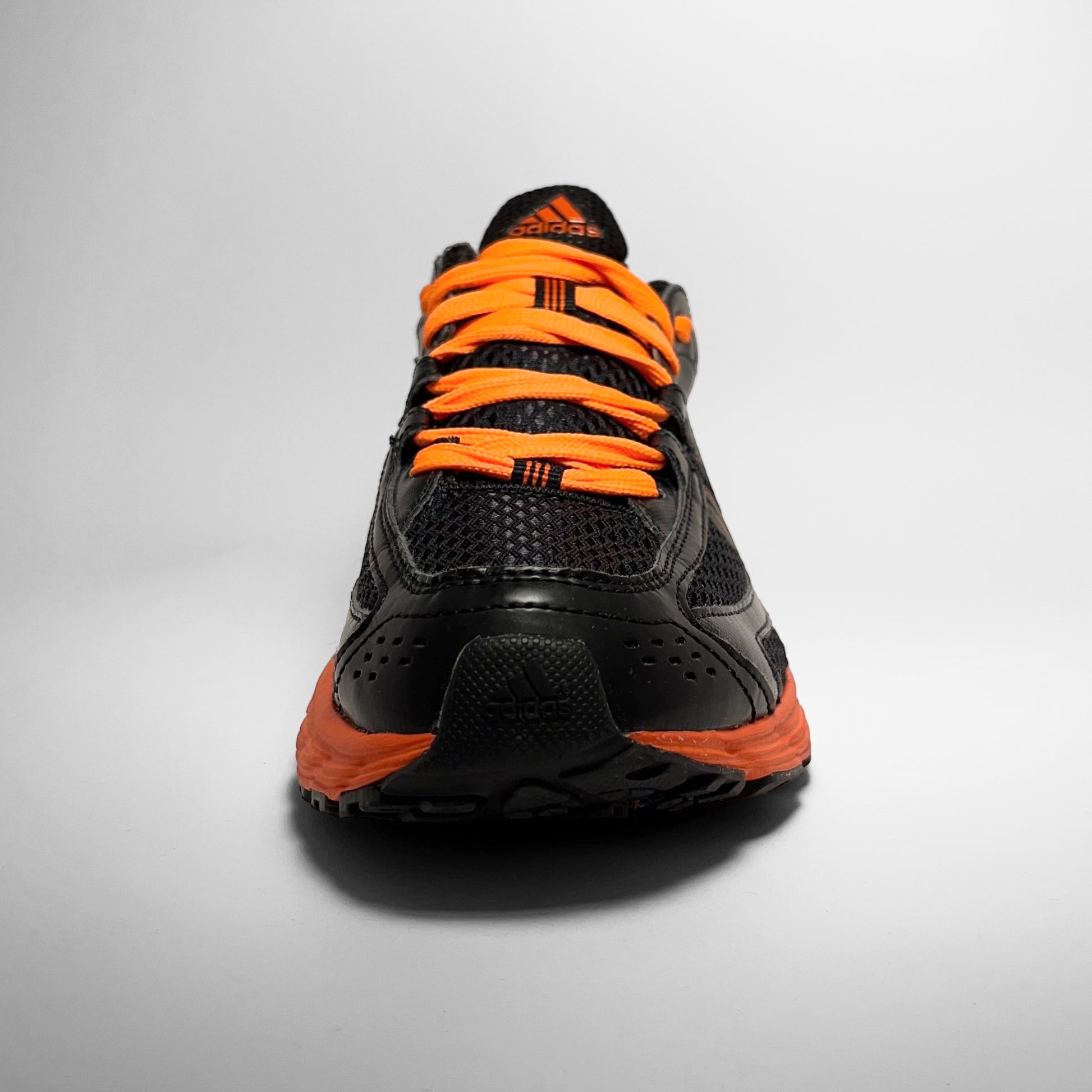 Bright orange laces mixed with 3-stripe outlined details and reflecting the midsole, diamond shaped black mesh combined with black leather perforated panels.