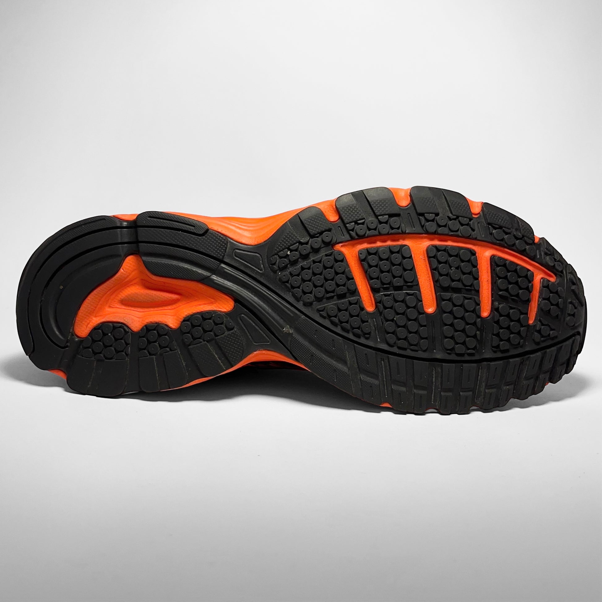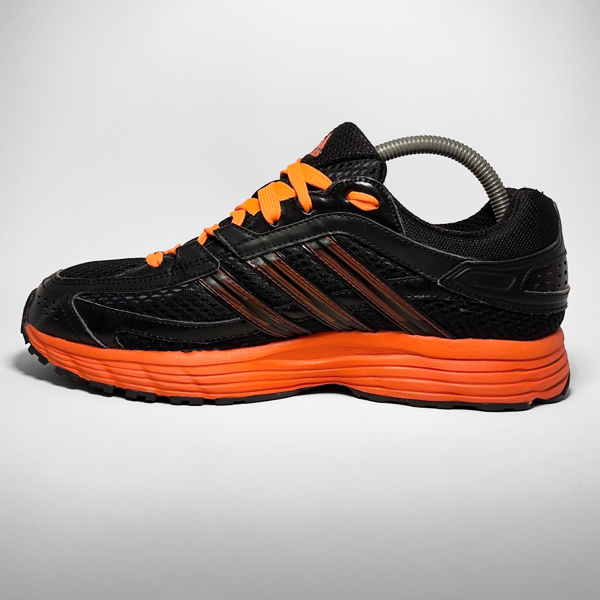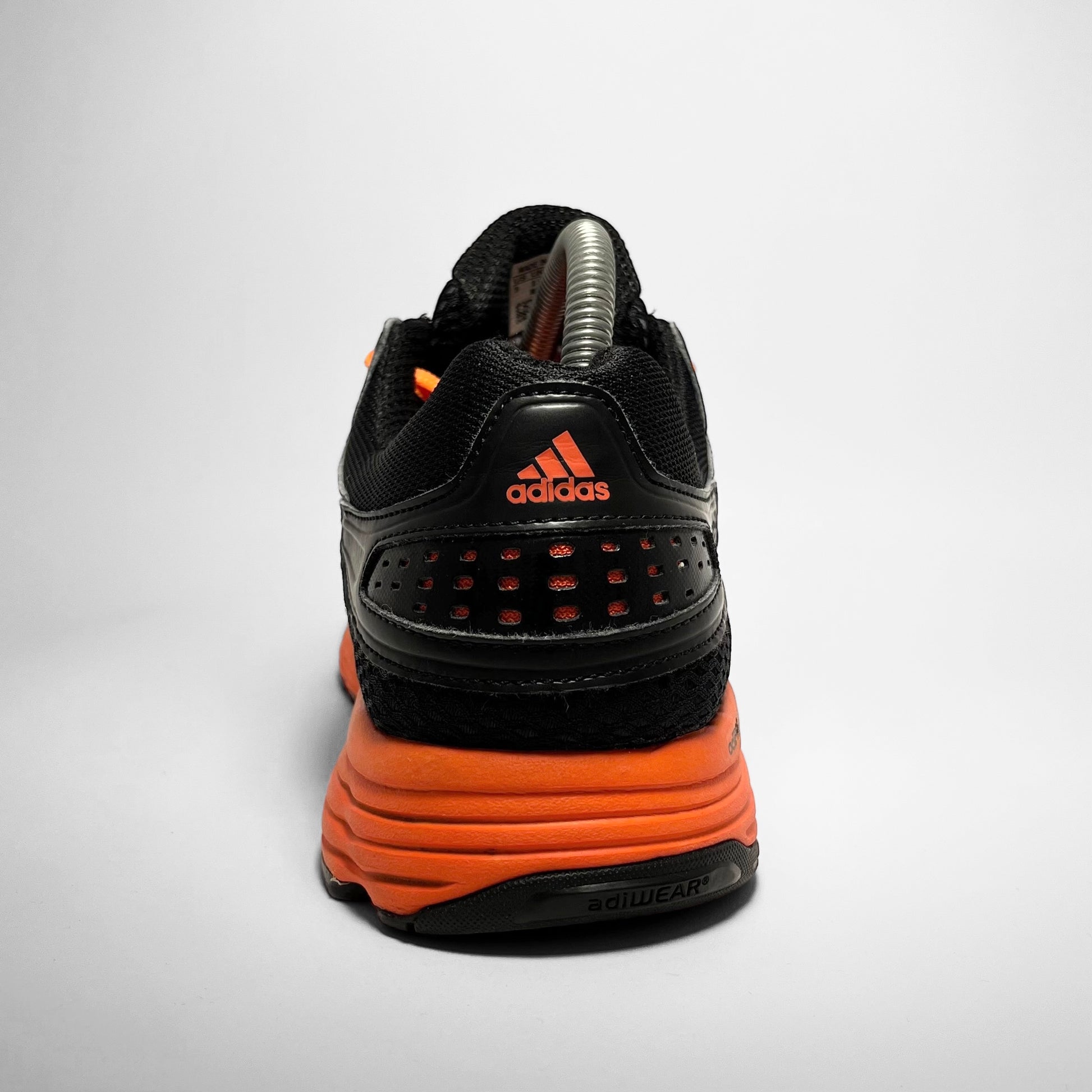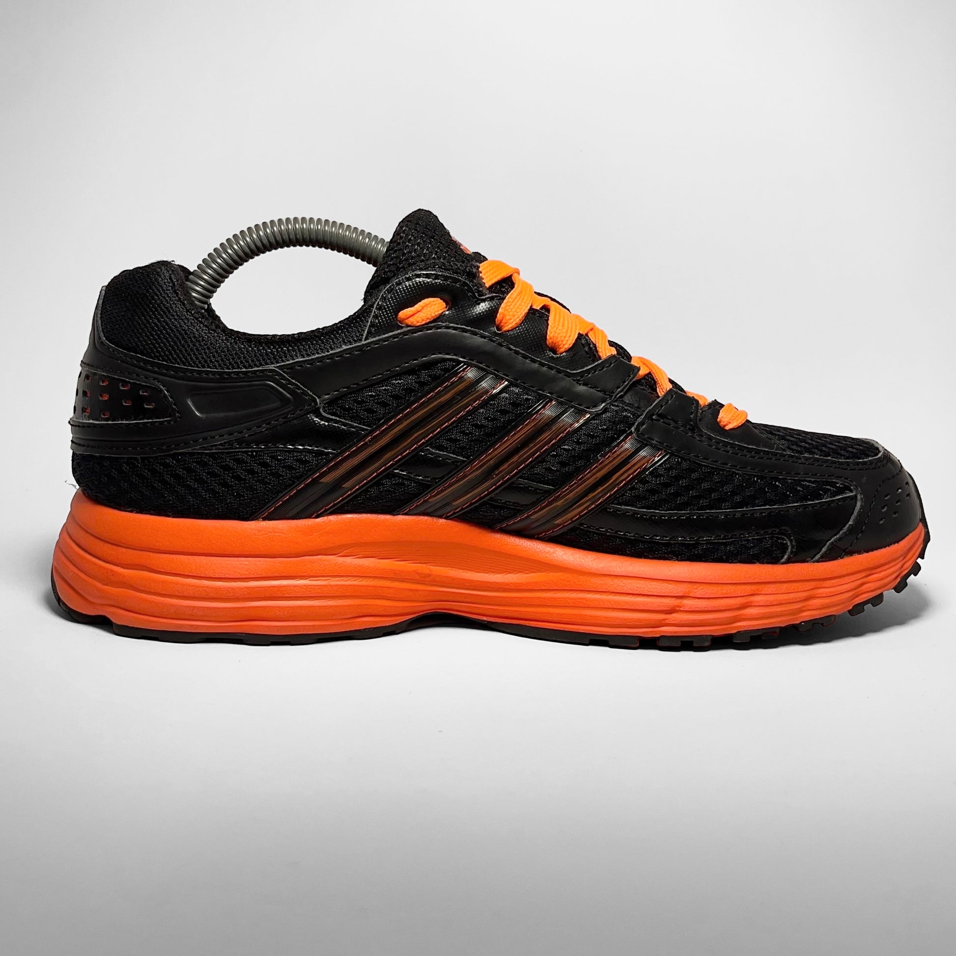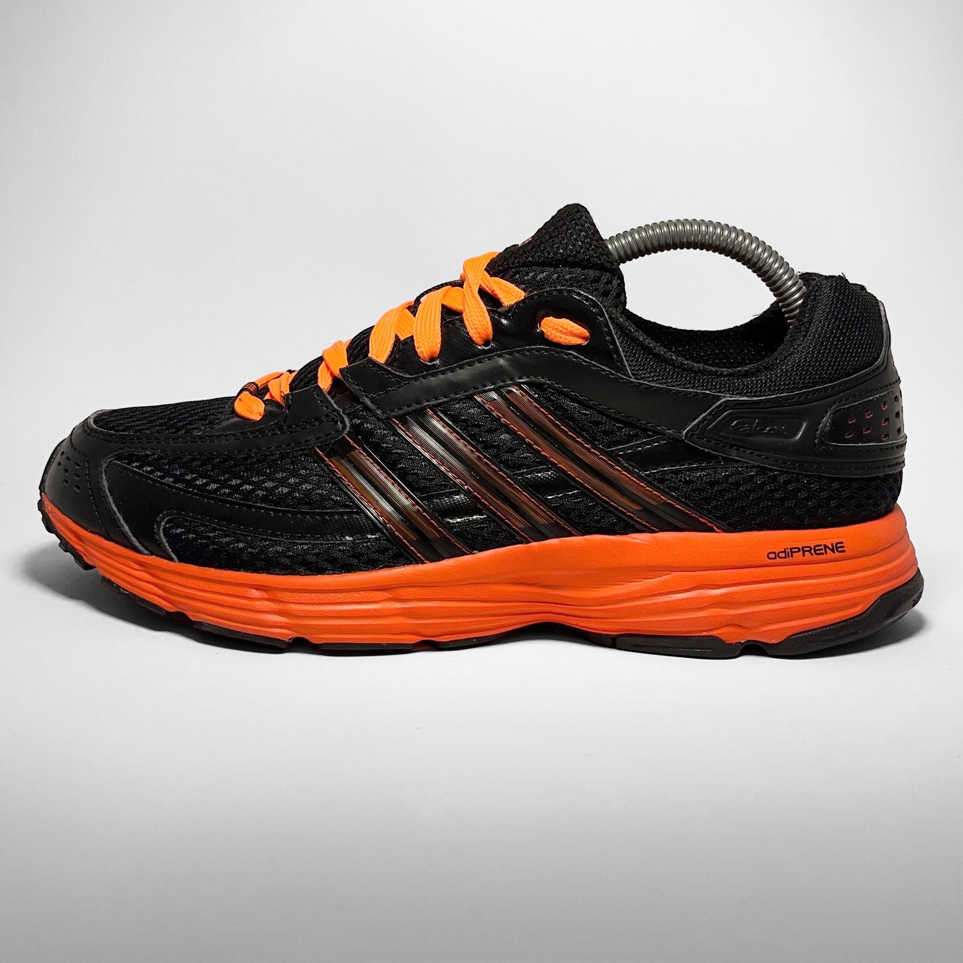 Bright orange laces mixed with 3-stripe outlined details and reflecting the midsole, diamond shaped black mesh combined with black leather perforated panels.