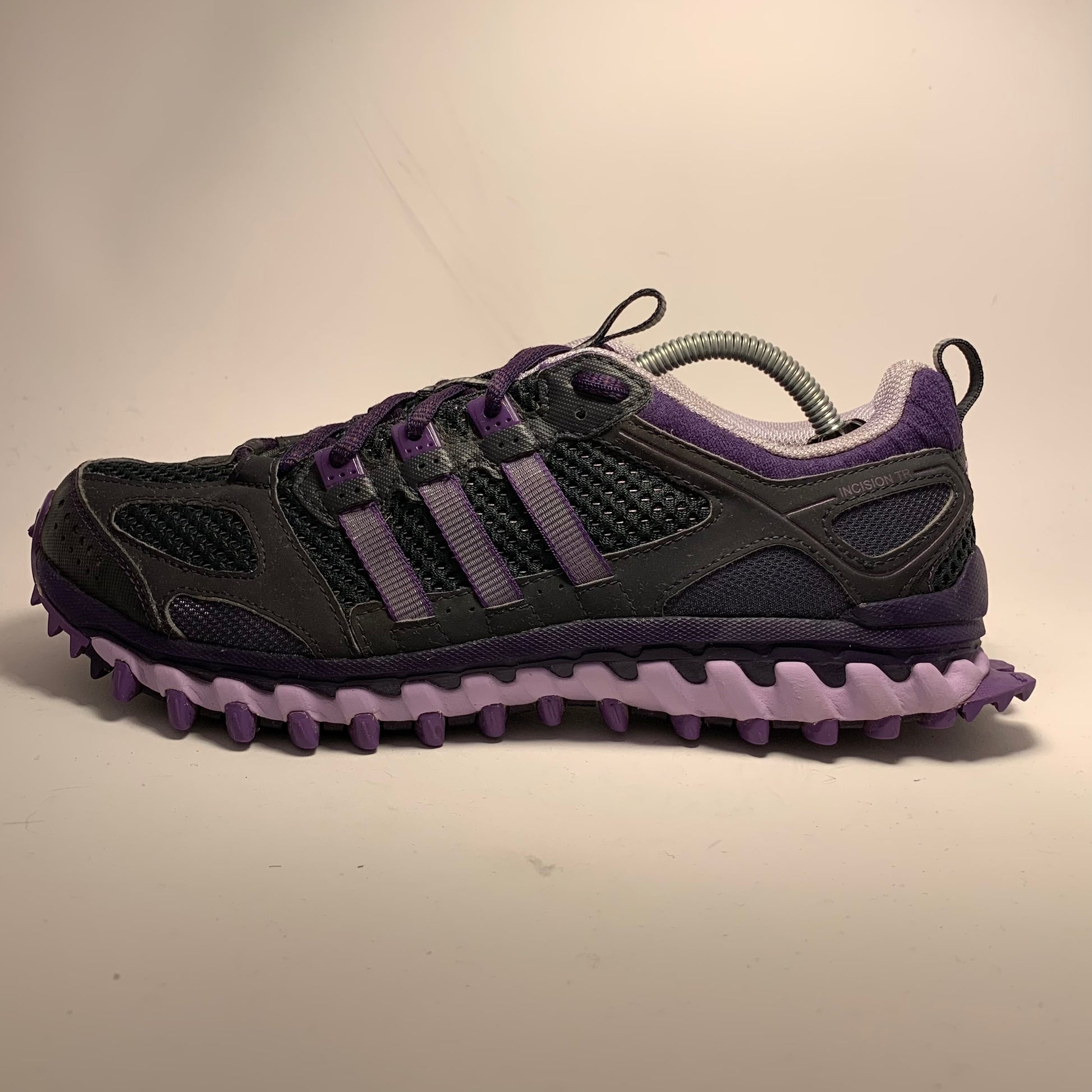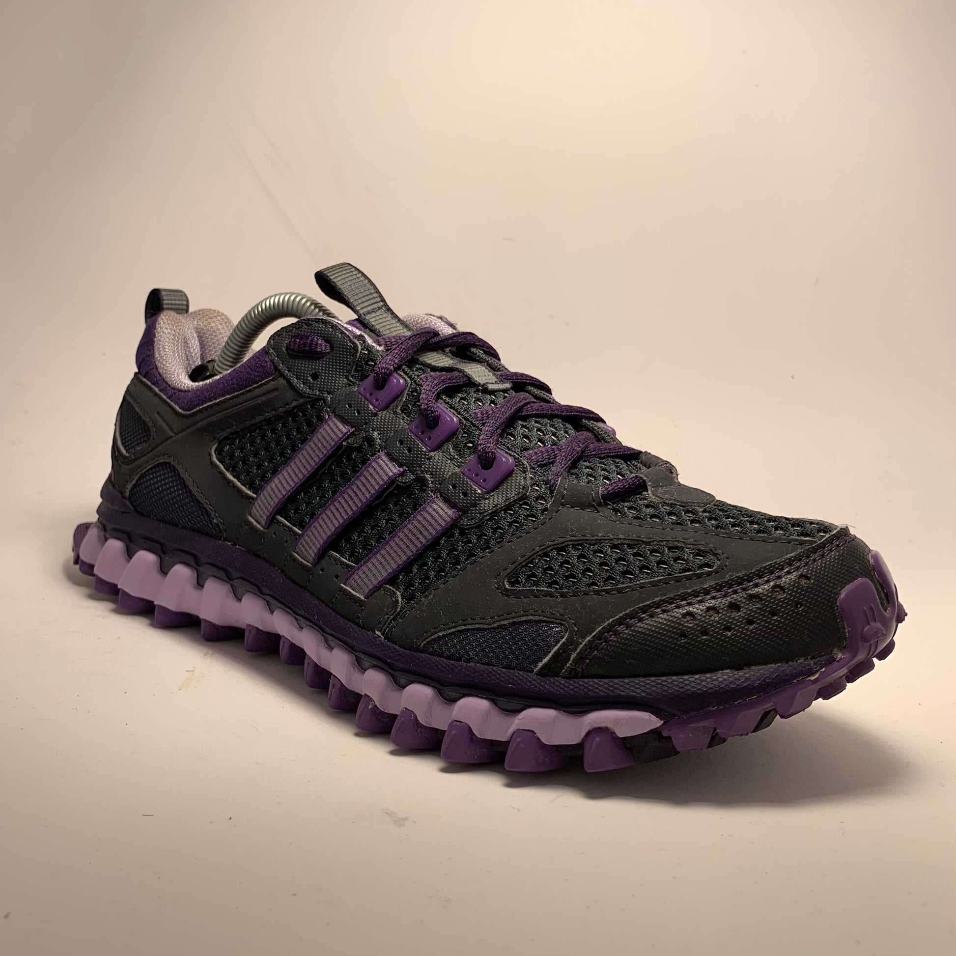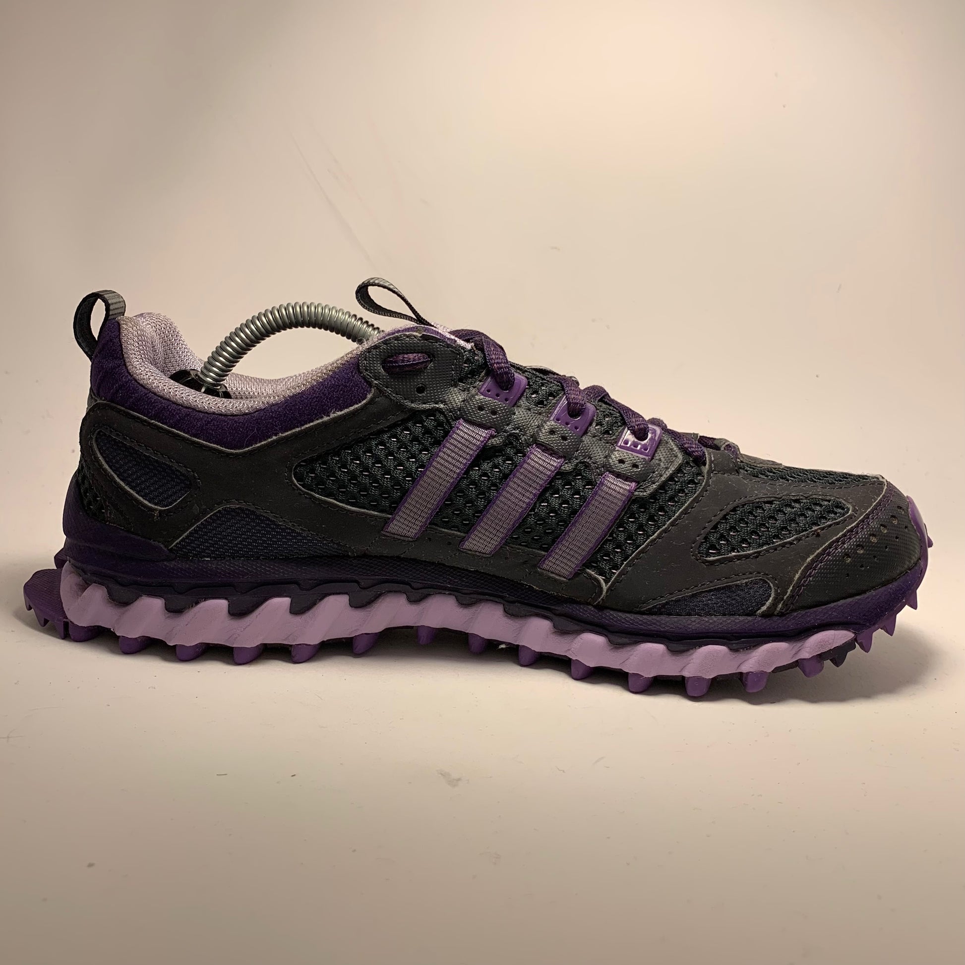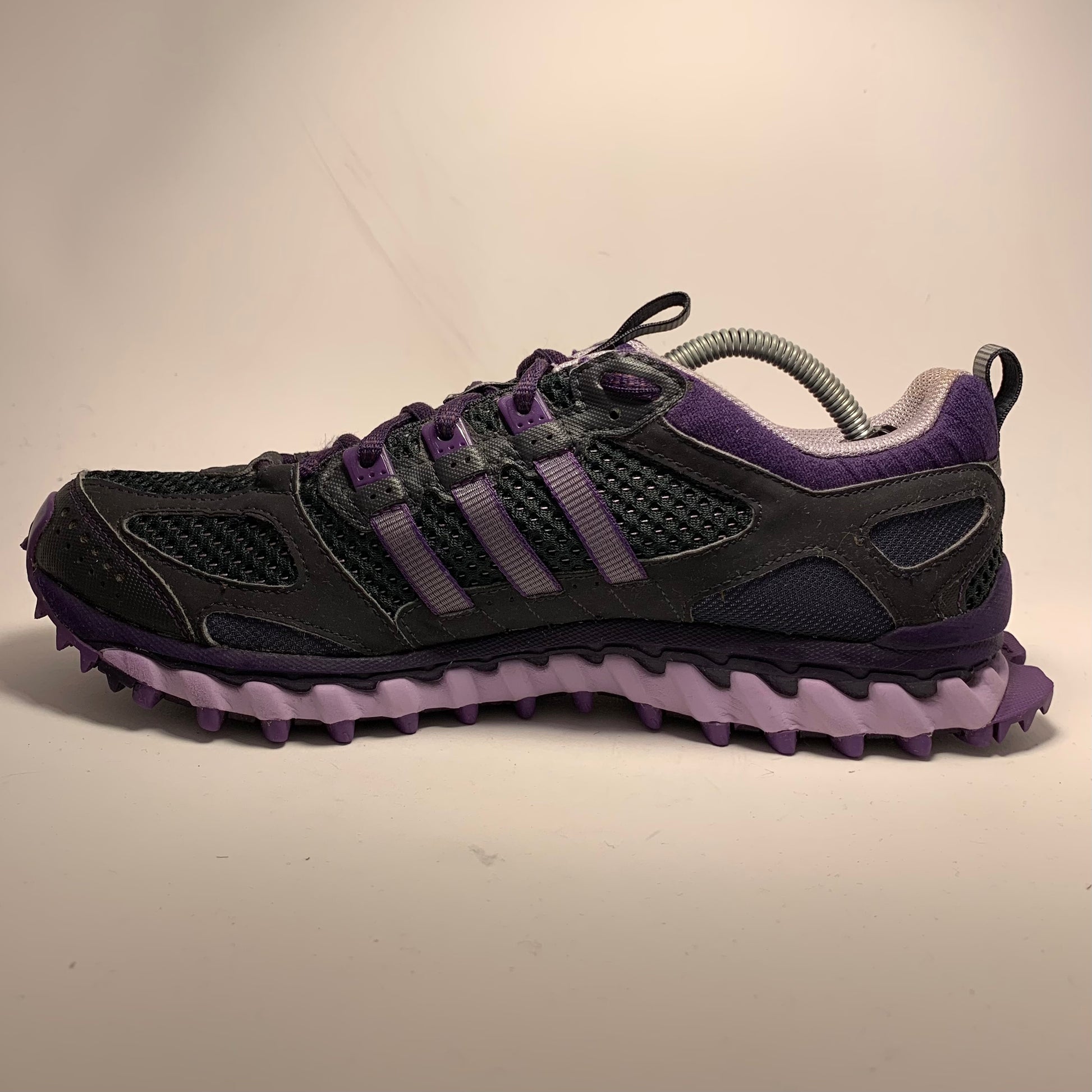Condition is like new. Double layered mesh, black rubberised panels, purple cotton three-striped straps, neoprene embossed sock-liner matching the laces and triple structured sole, and pull-tabs on tongue & heel.
