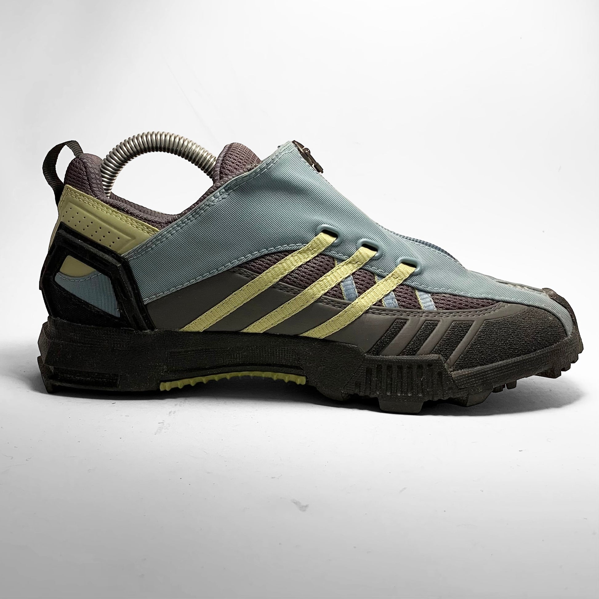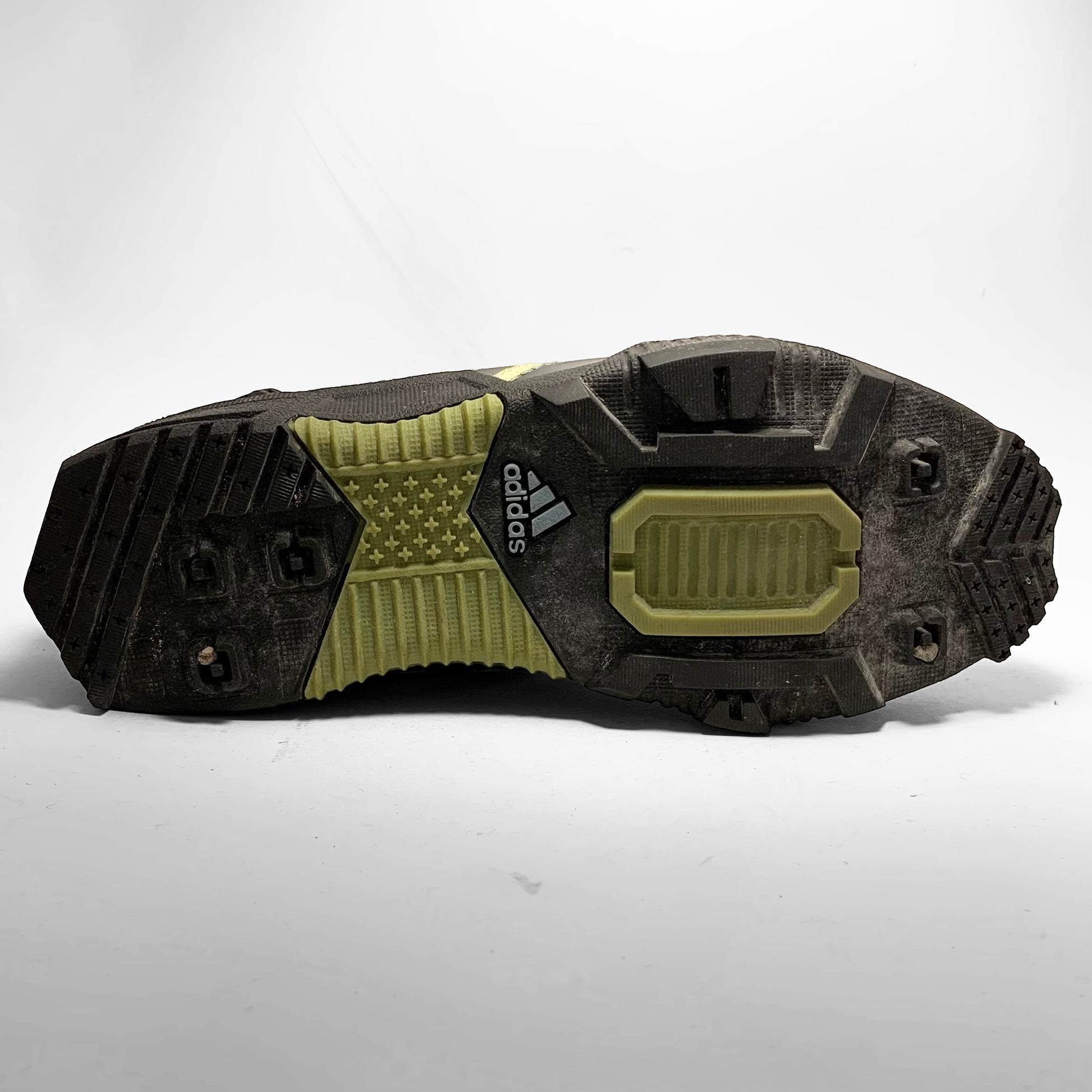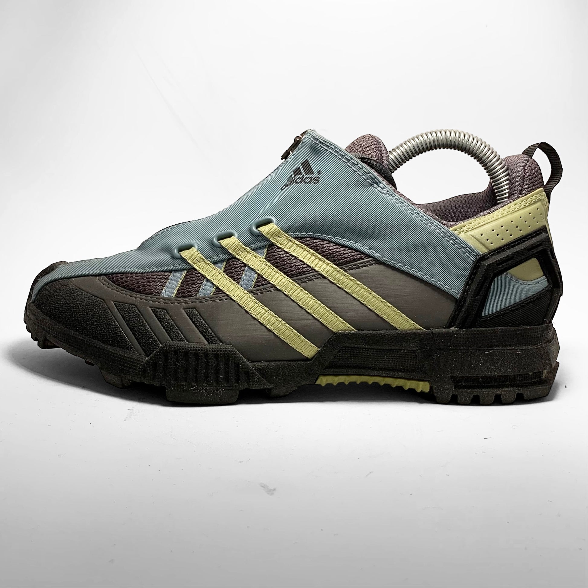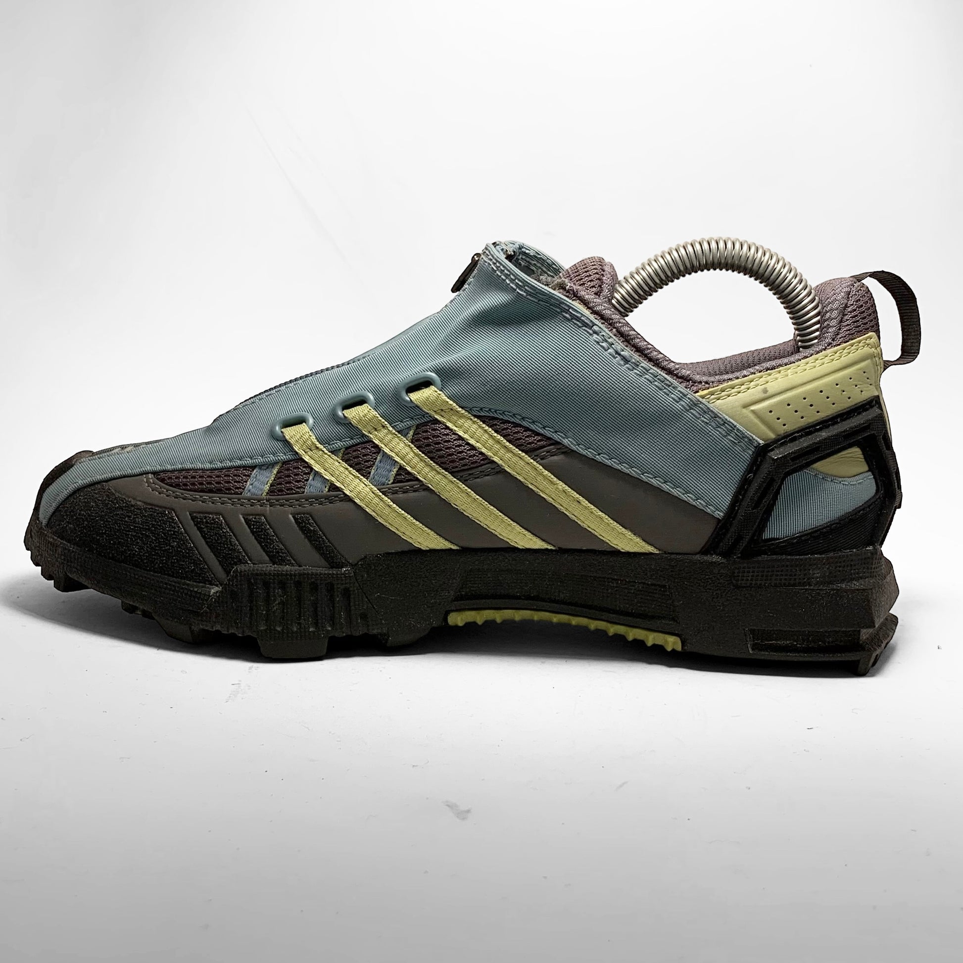 Interesting design on this model with robust panels, rubber treated parts, neoprene cover with zip, cotton wove three-striped yellow straps, mesh base, leather perforated panels and rear cage for stability.