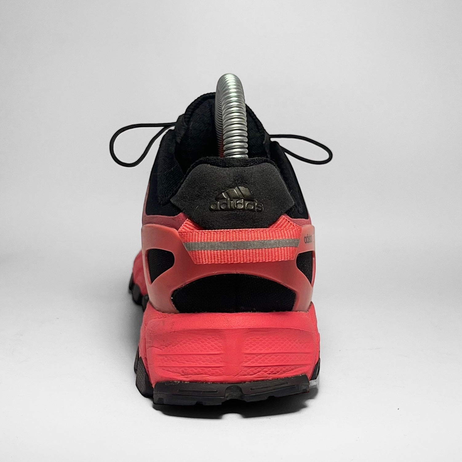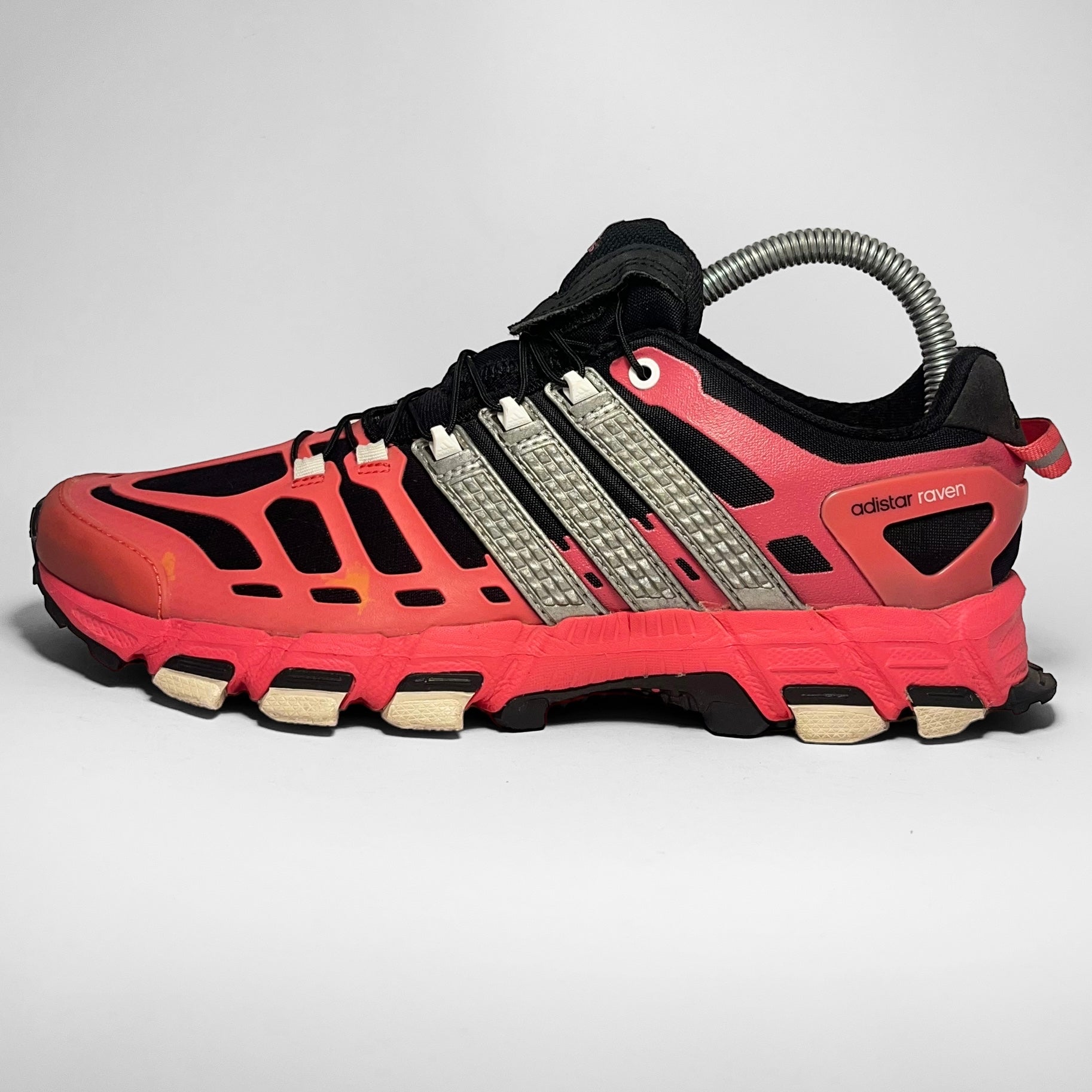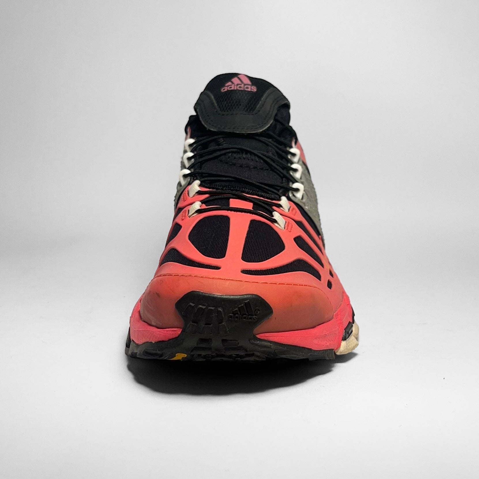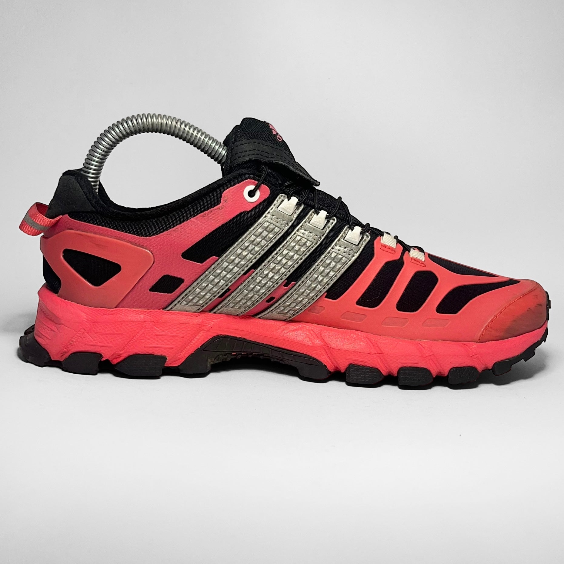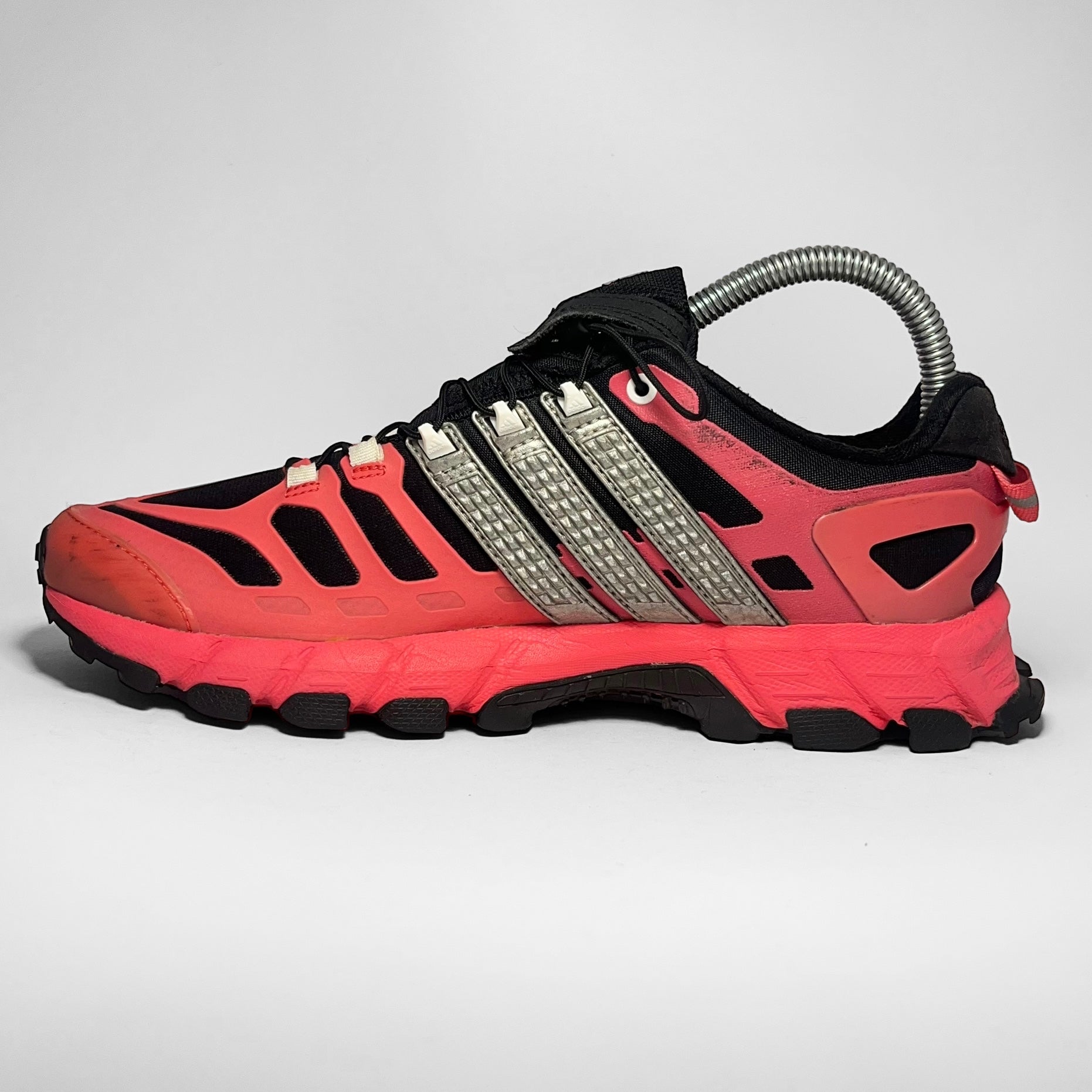 Black base with rubber pink skeleton, silver pattern three stripes with white branded eyelets, pink heel support and rubber mudguard, and lace-pocket with velcro closure for the one-pull lacing system.