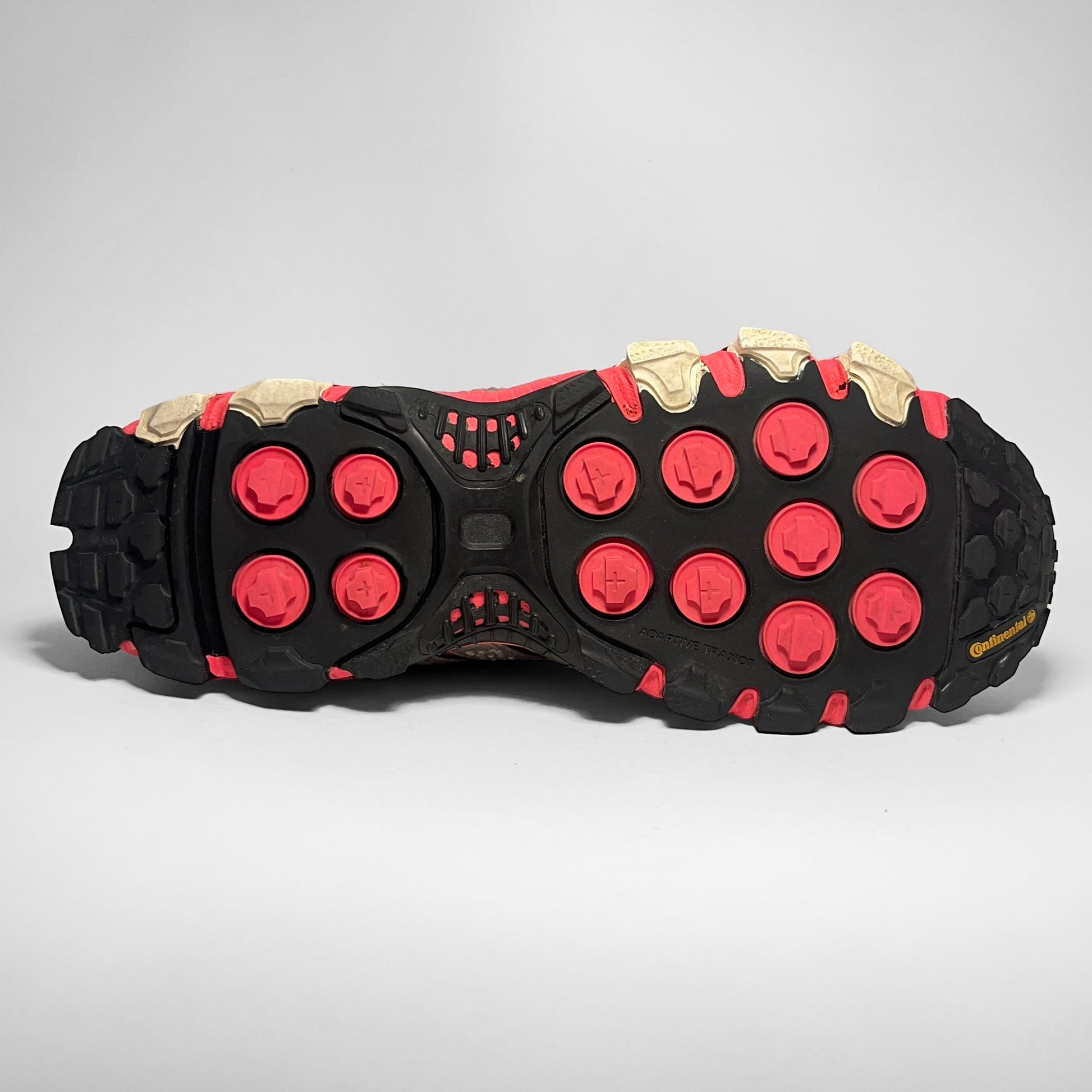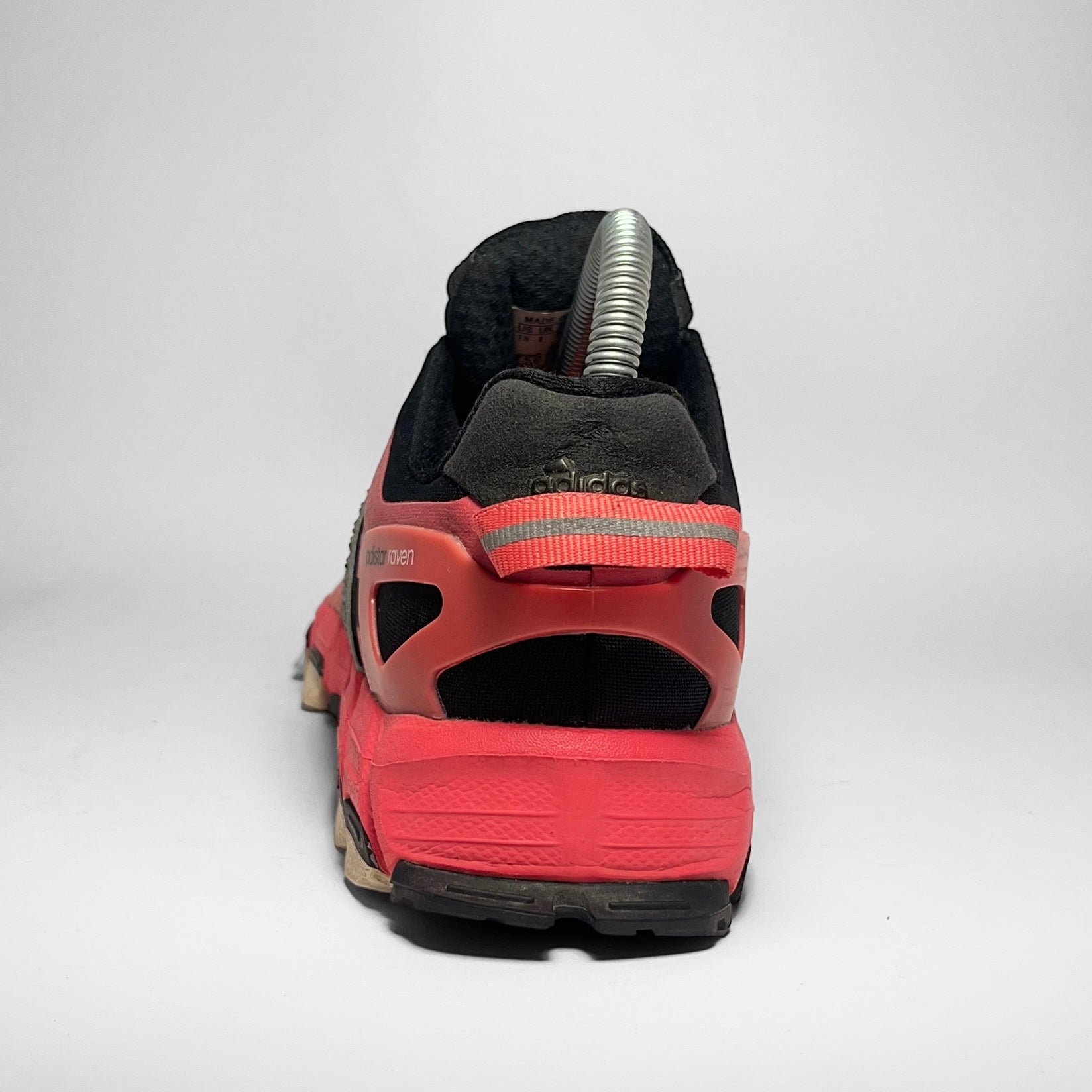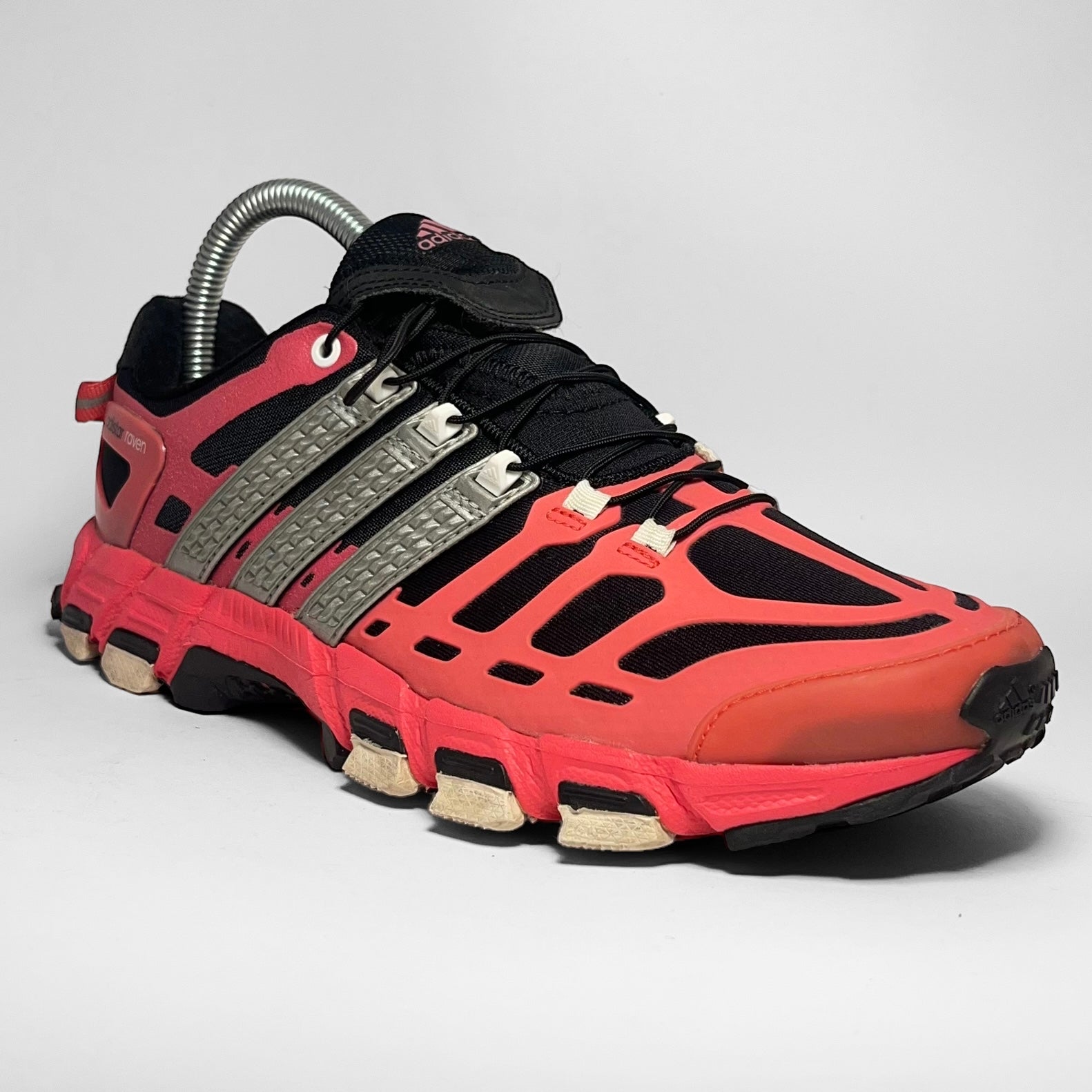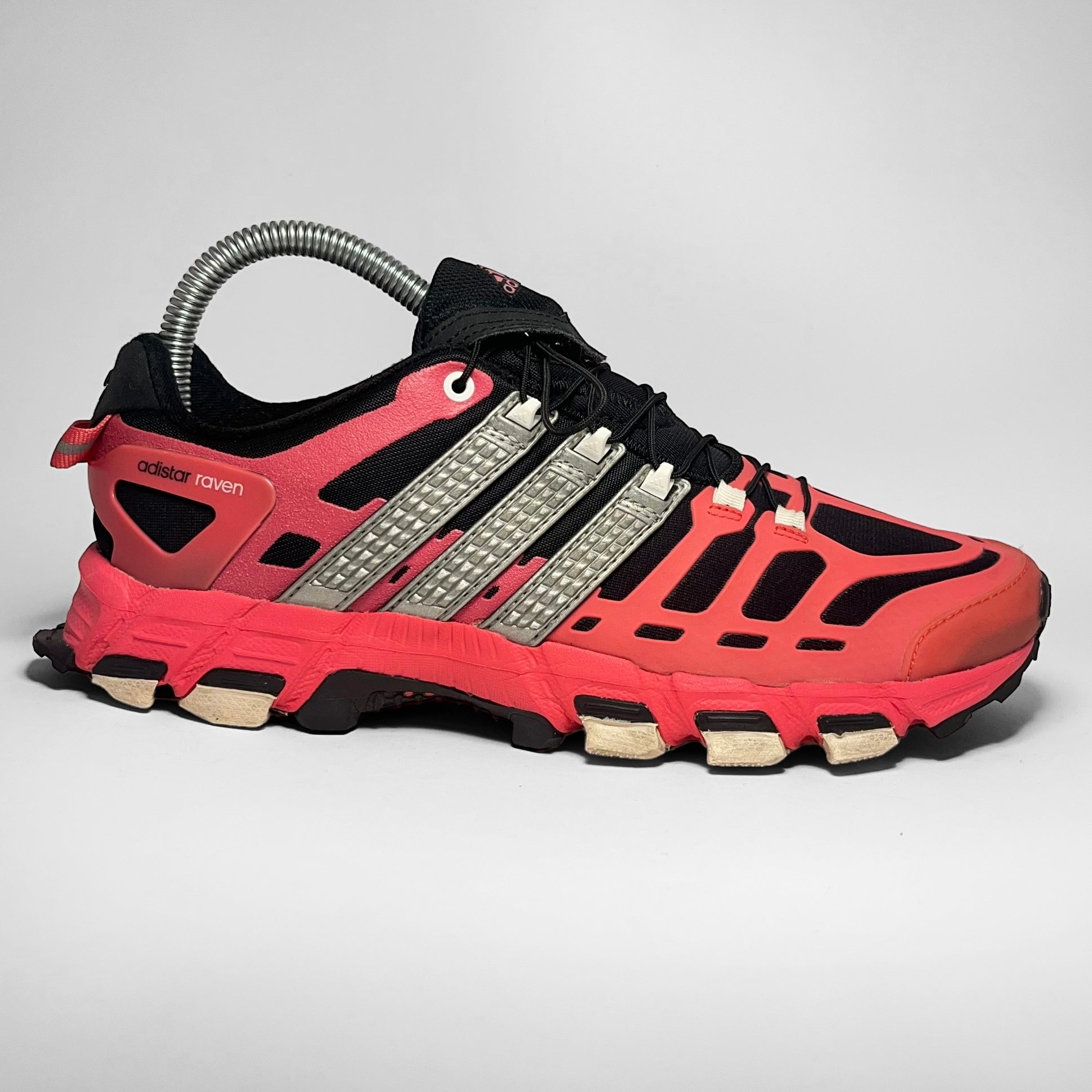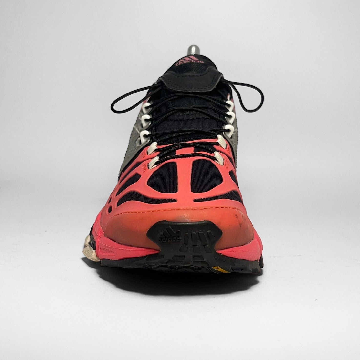Black base with rubber pink skeleton, silver pattern three stripes with white branded eyelets, pink heel support and rubber mudguard, and lace-pocket with velcro closure for the one-pull lacing system.