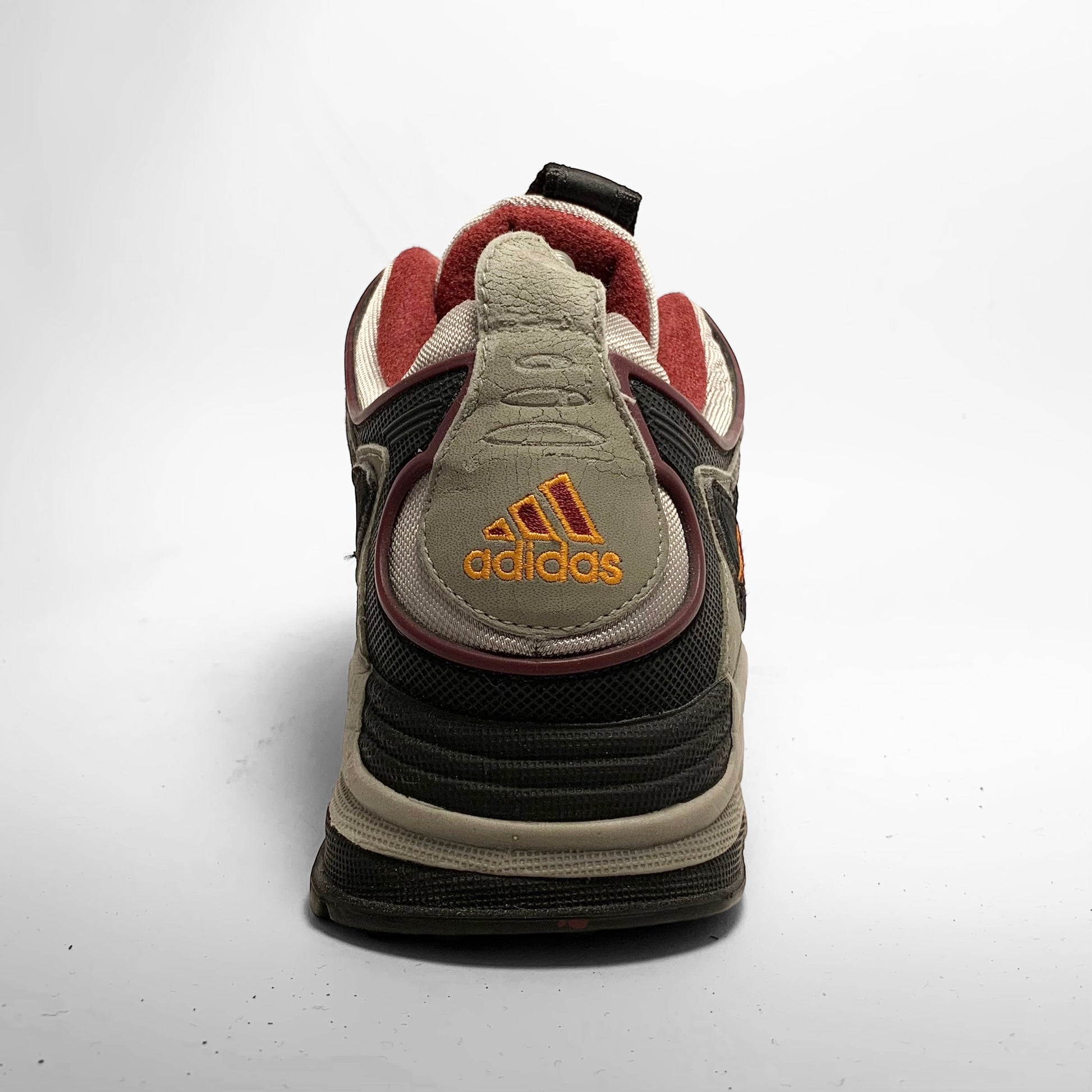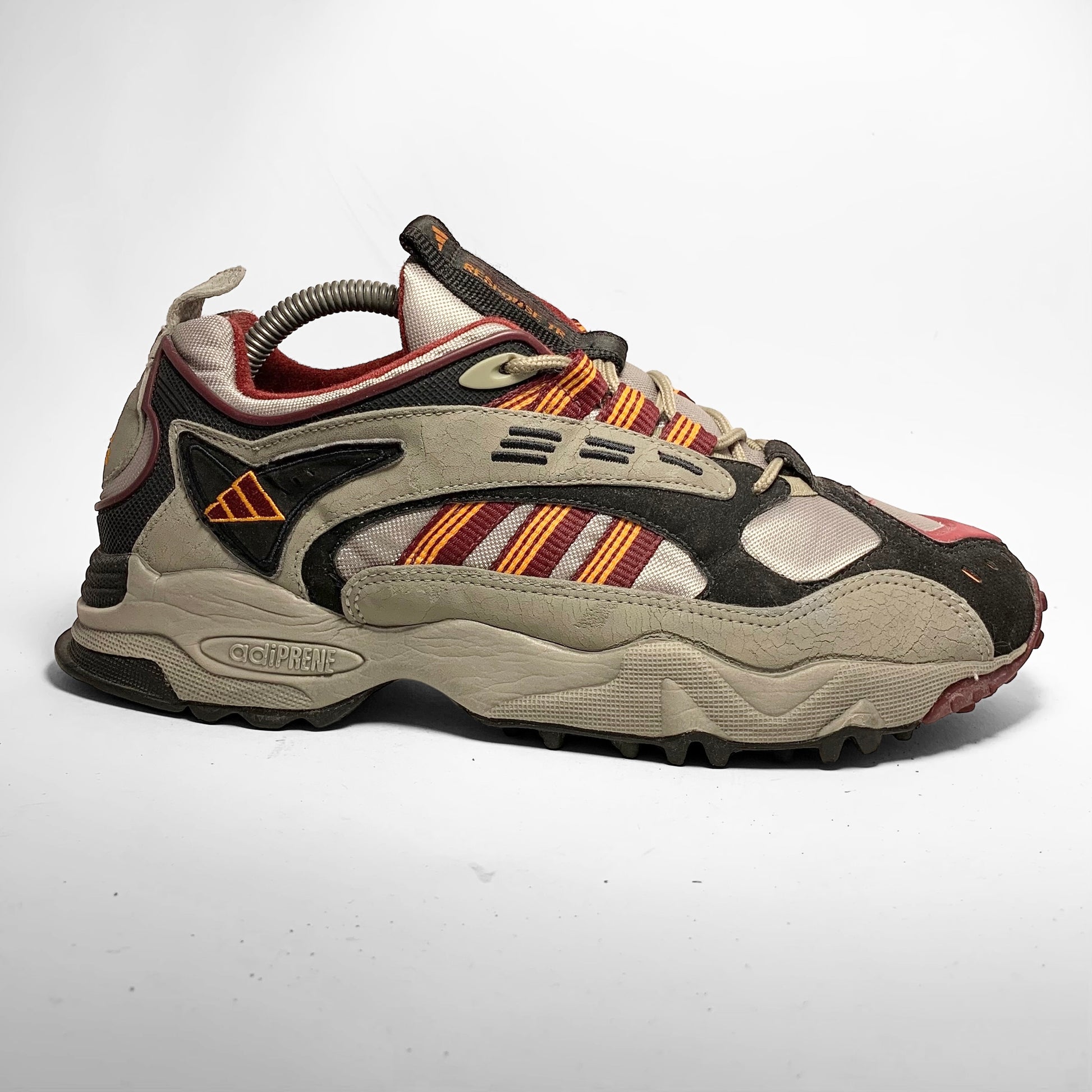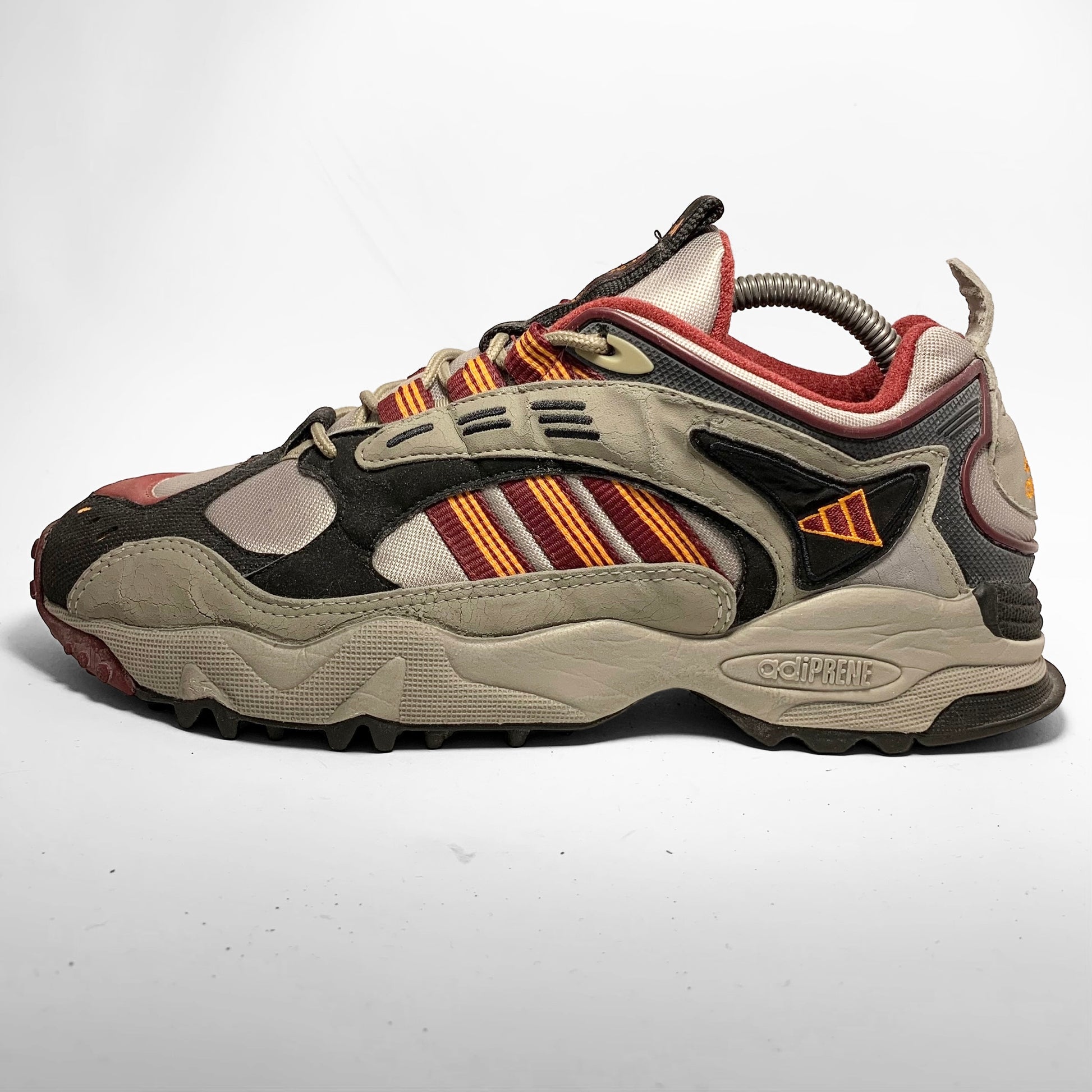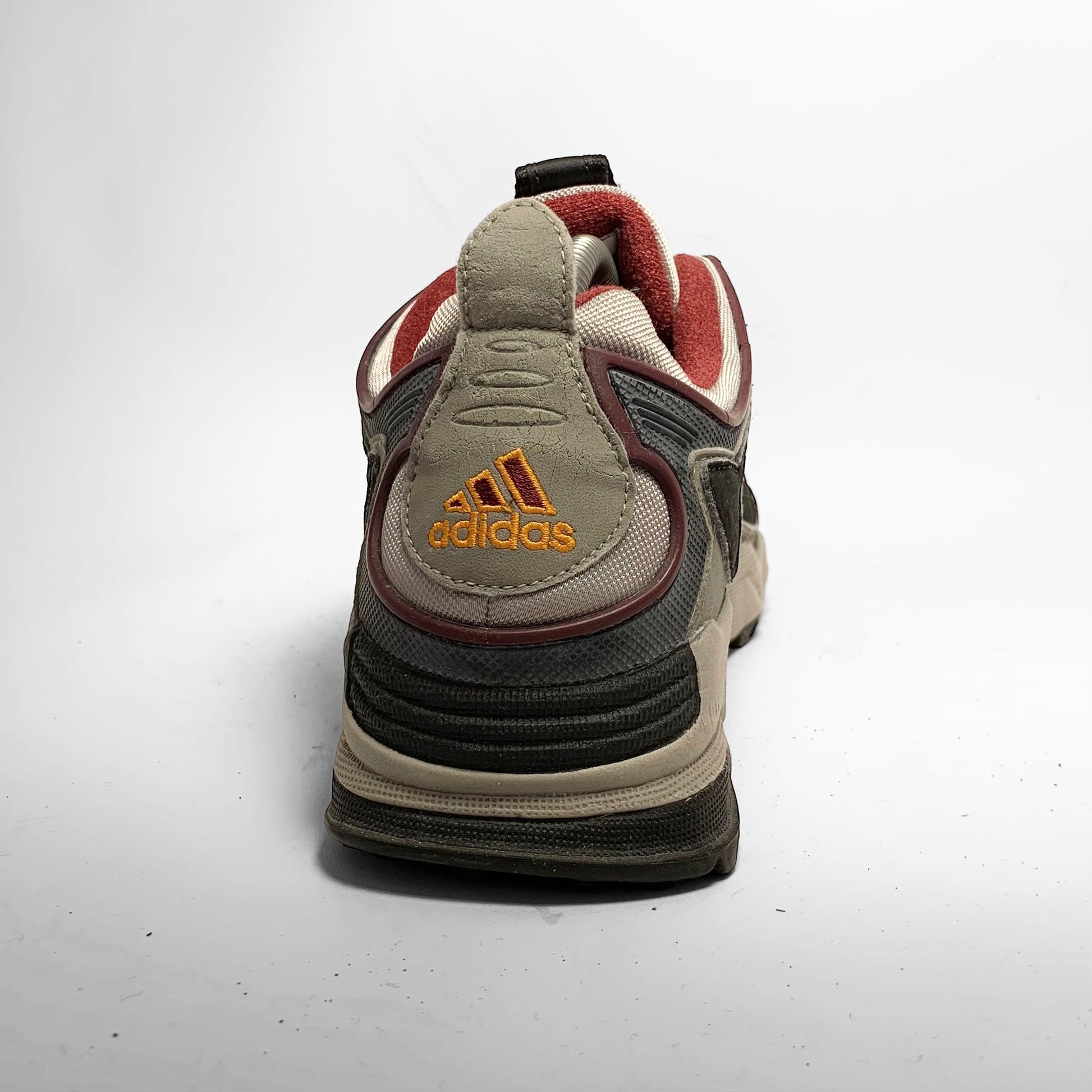 Tonal grey uppers showing their age with similar coloured laces and midsole, navy layered panels with embroidery details & branding matching the three-striped cotton straps running along the sides. Light grey mesh base with burgundy outlines, front part and outsoles complimented with yellow branding & details.