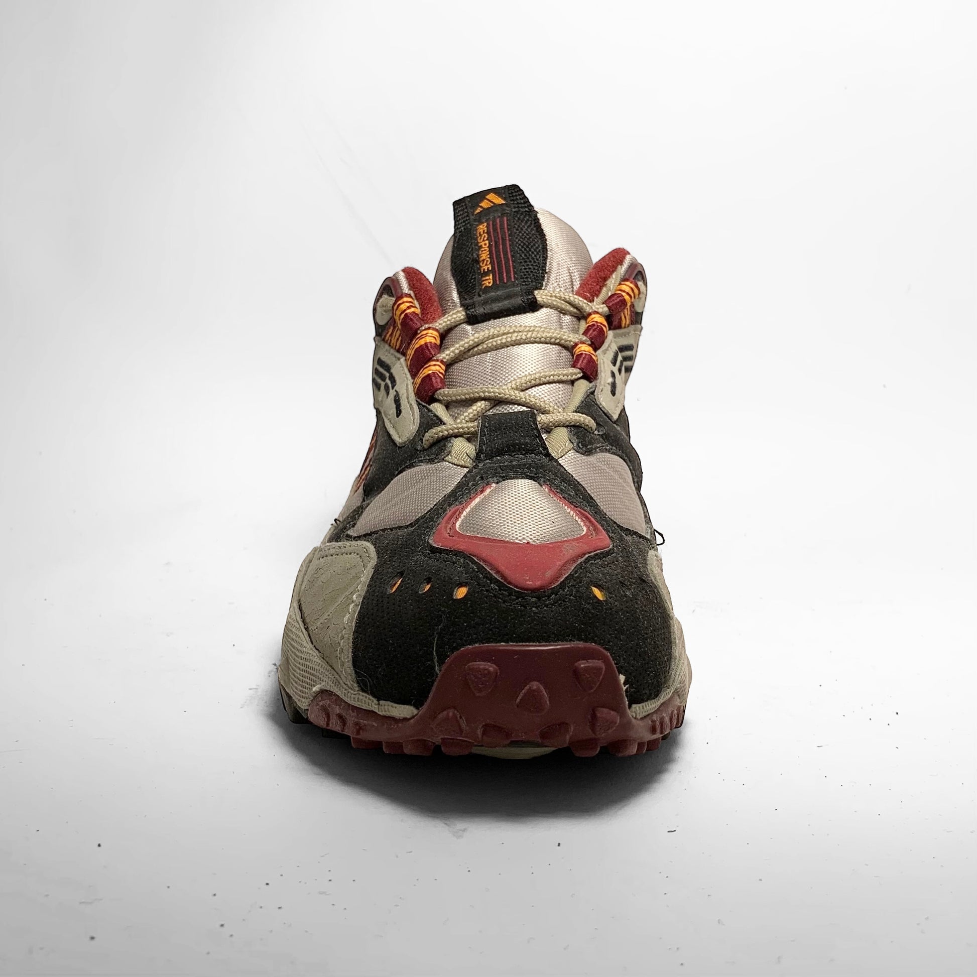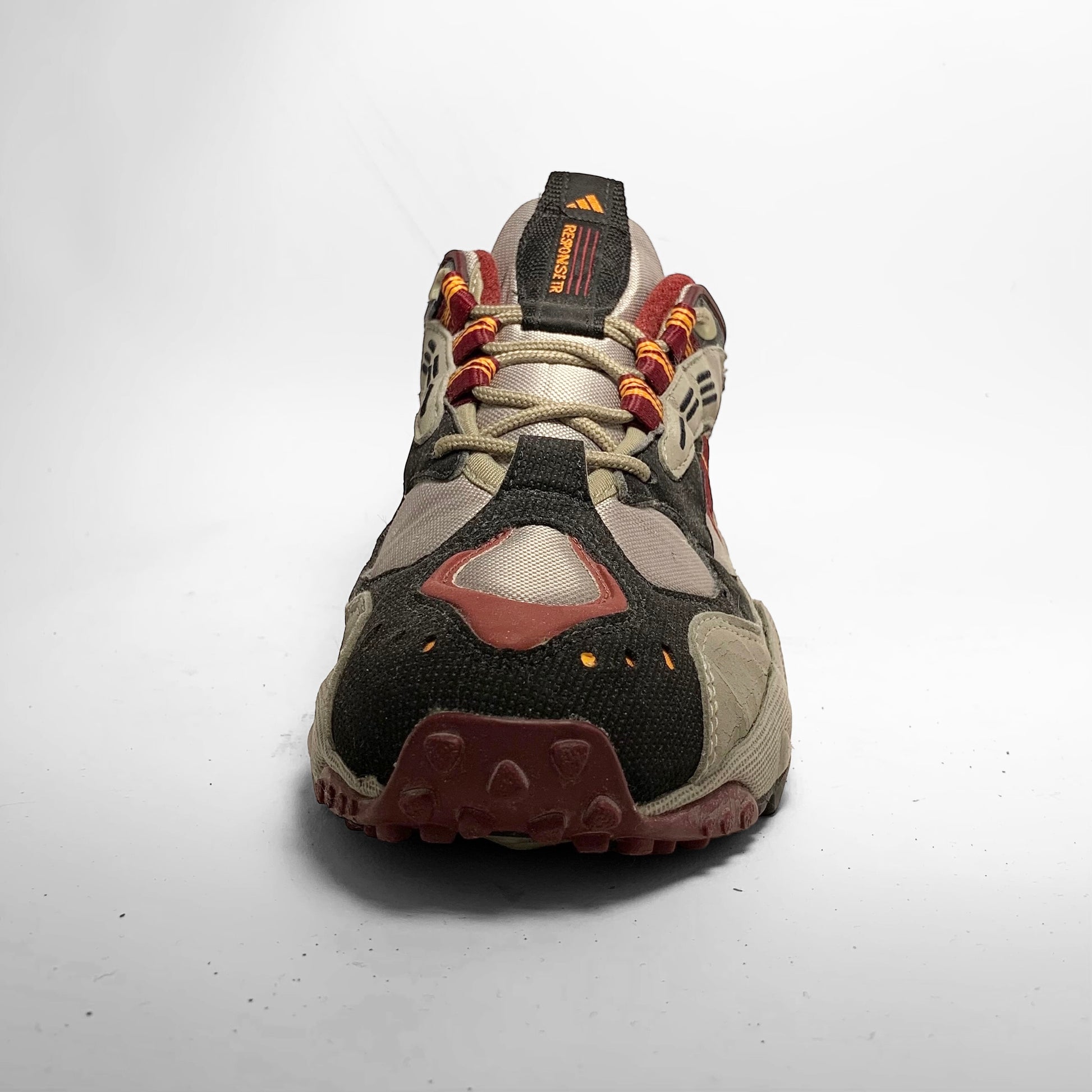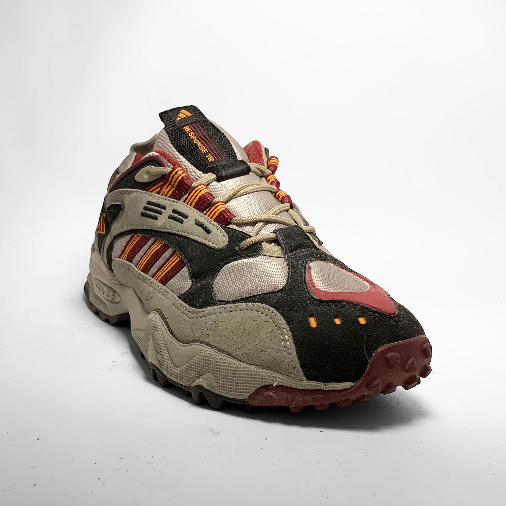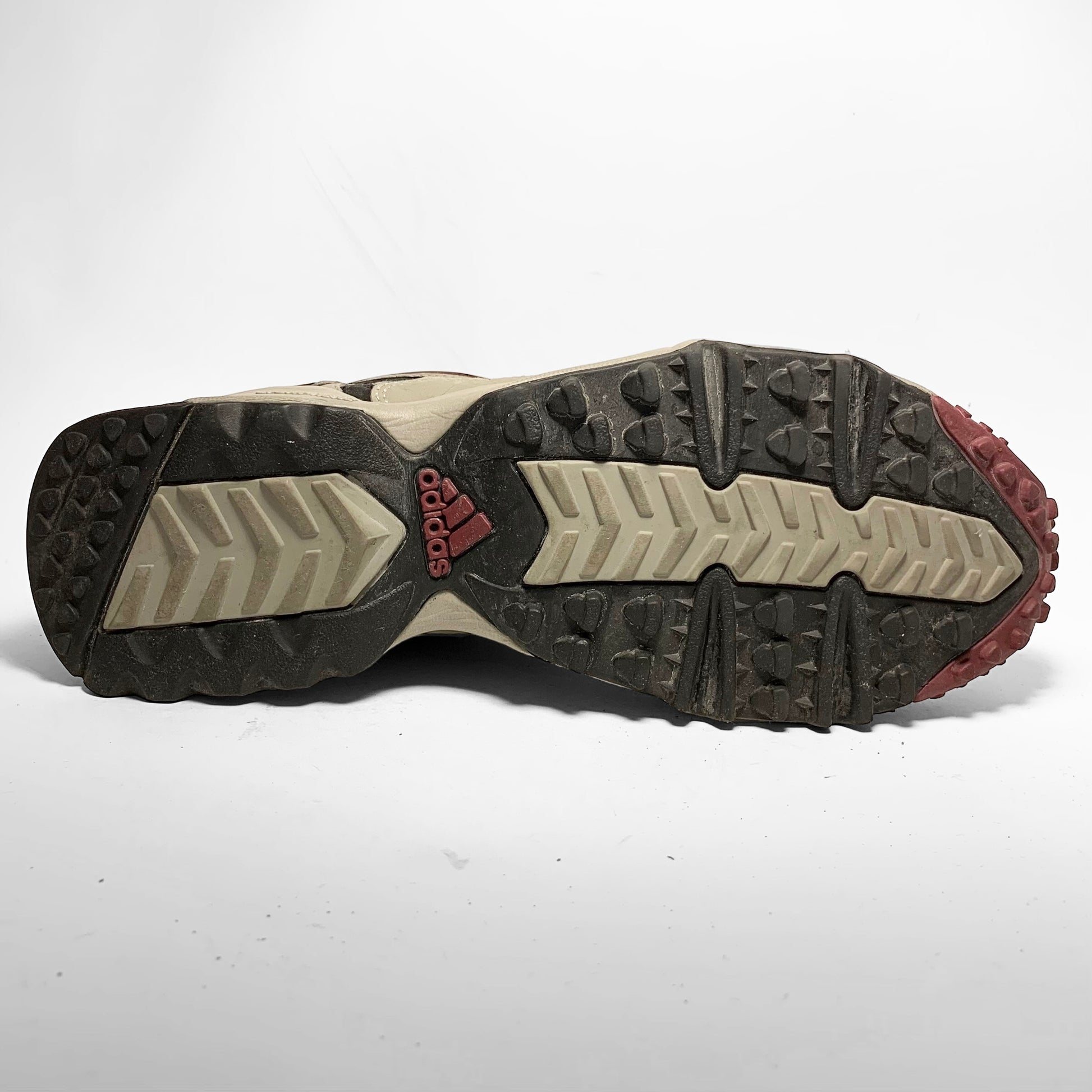 Tonal grey uppers showing their age with similar coloured laces and midsole, navy layered panels with embroidery details & branding matching the three-striped cotton straps running along the sides. Light grey mesh base with burgundy outlines, front part and outsoles complimented with yellow branding & details.