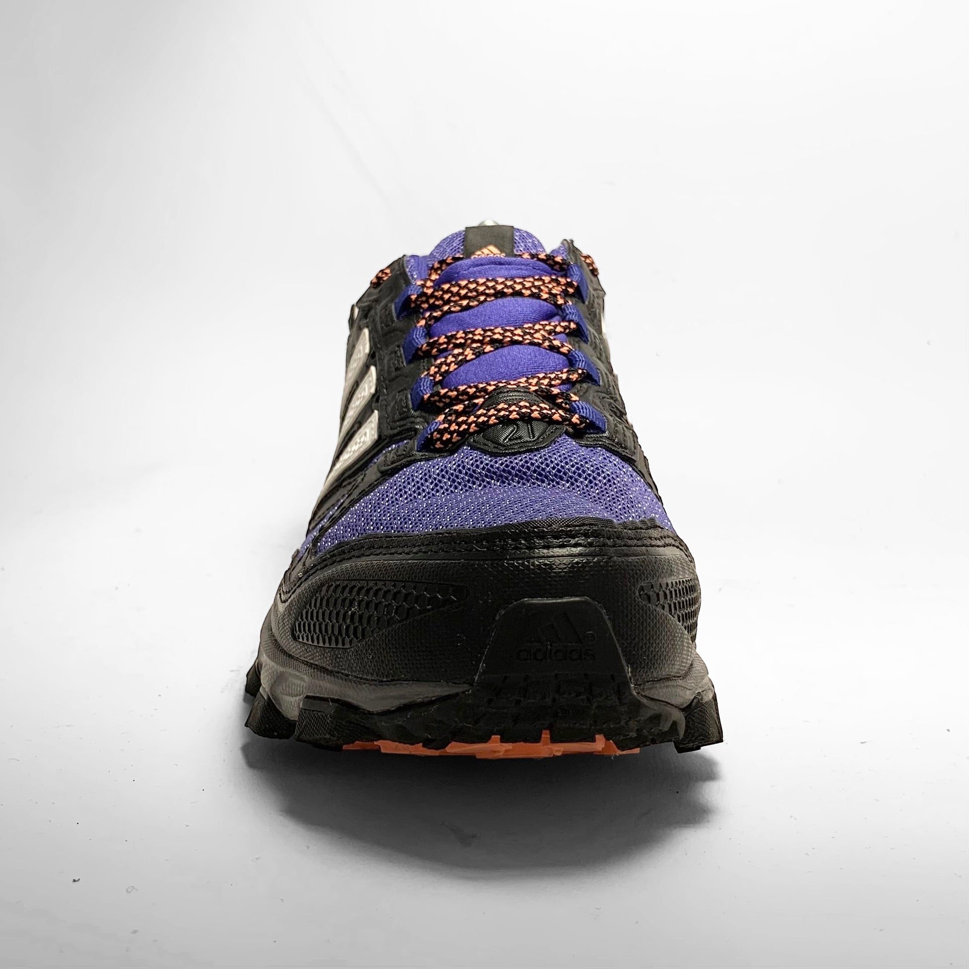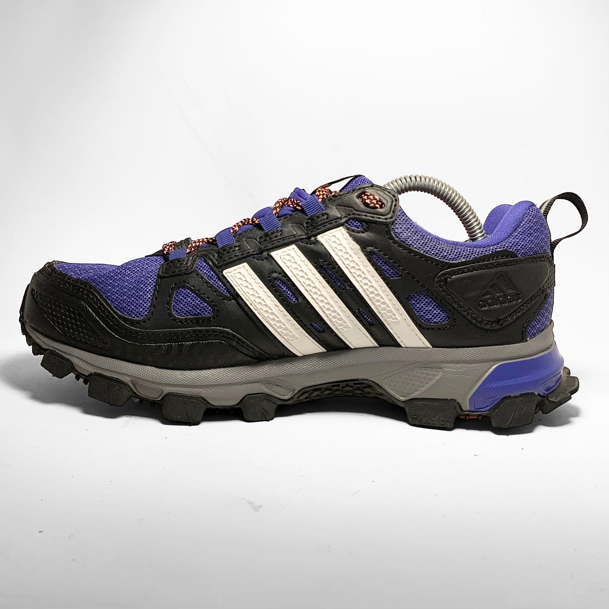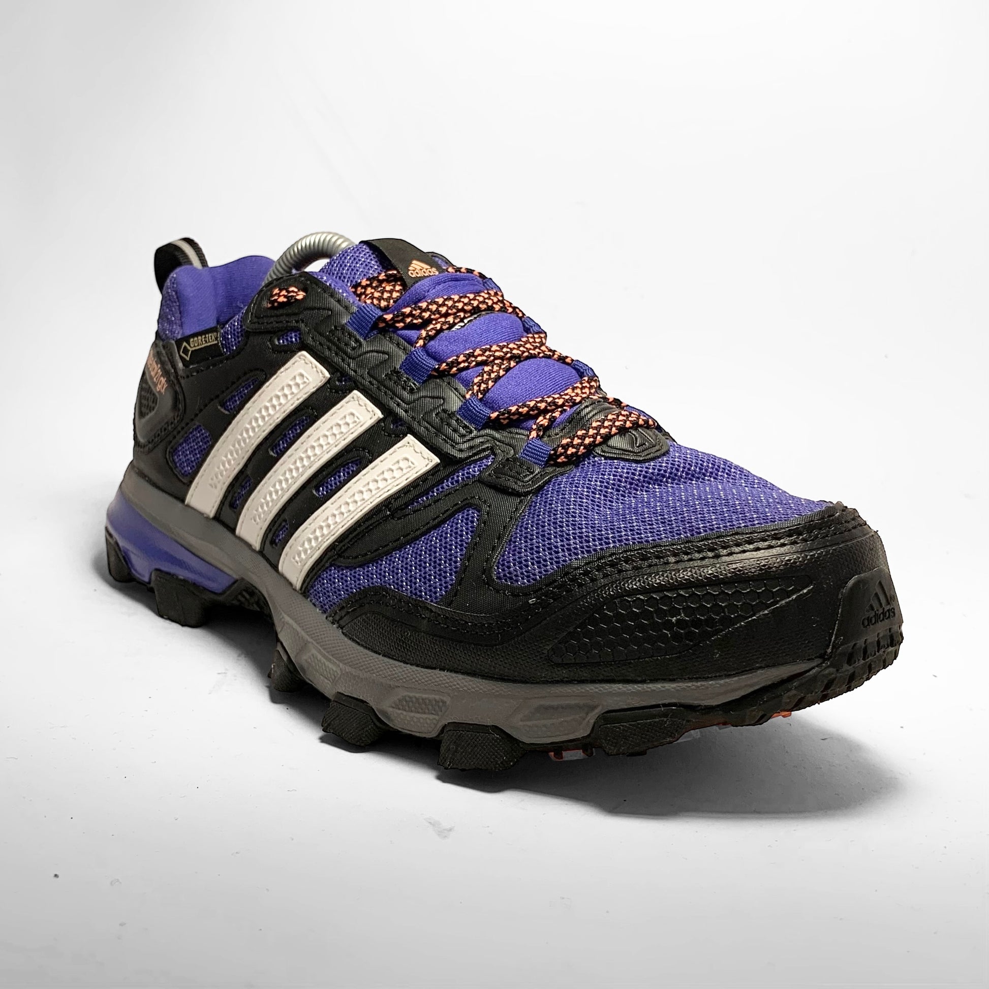 Mutliple layered bright purple mesh base with Gore-Tex material, black leather panelling and detailed rubber mudguard, white rubber detailed three-stripes, neoprene cover for the contrasting orange and black laces which match the script branding on the tongue, side and trail outsole.