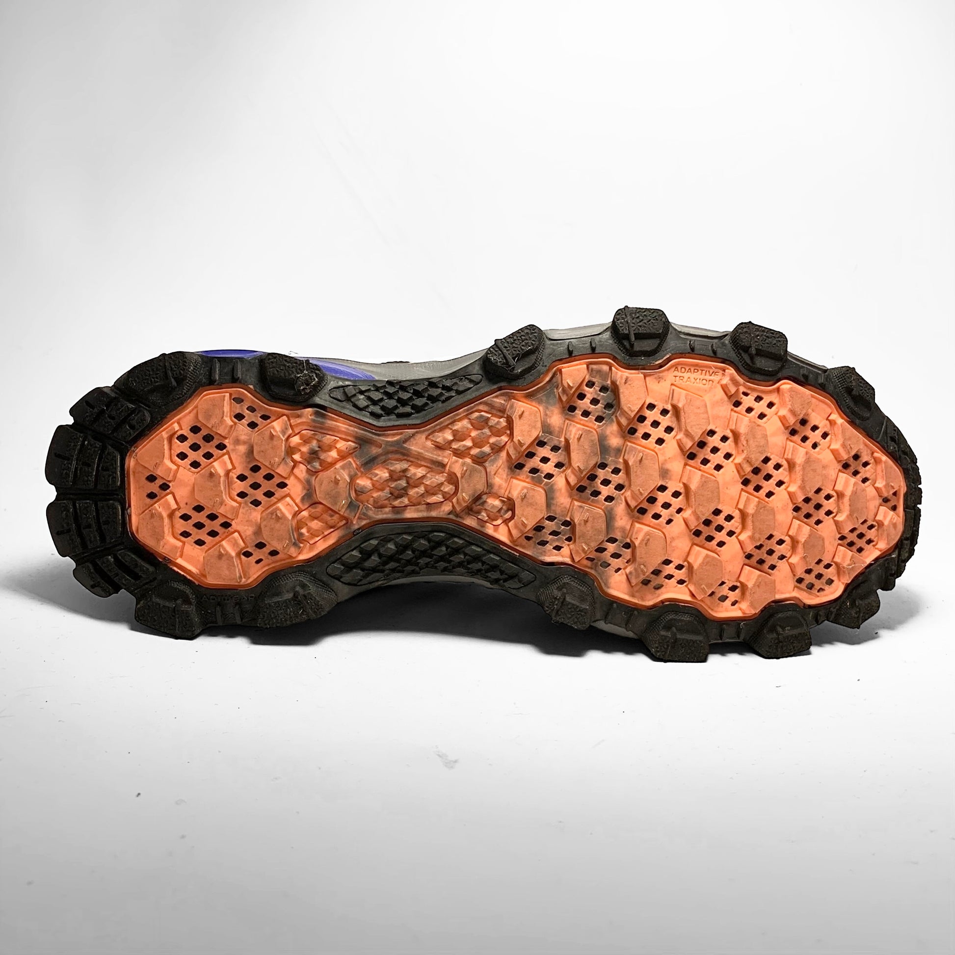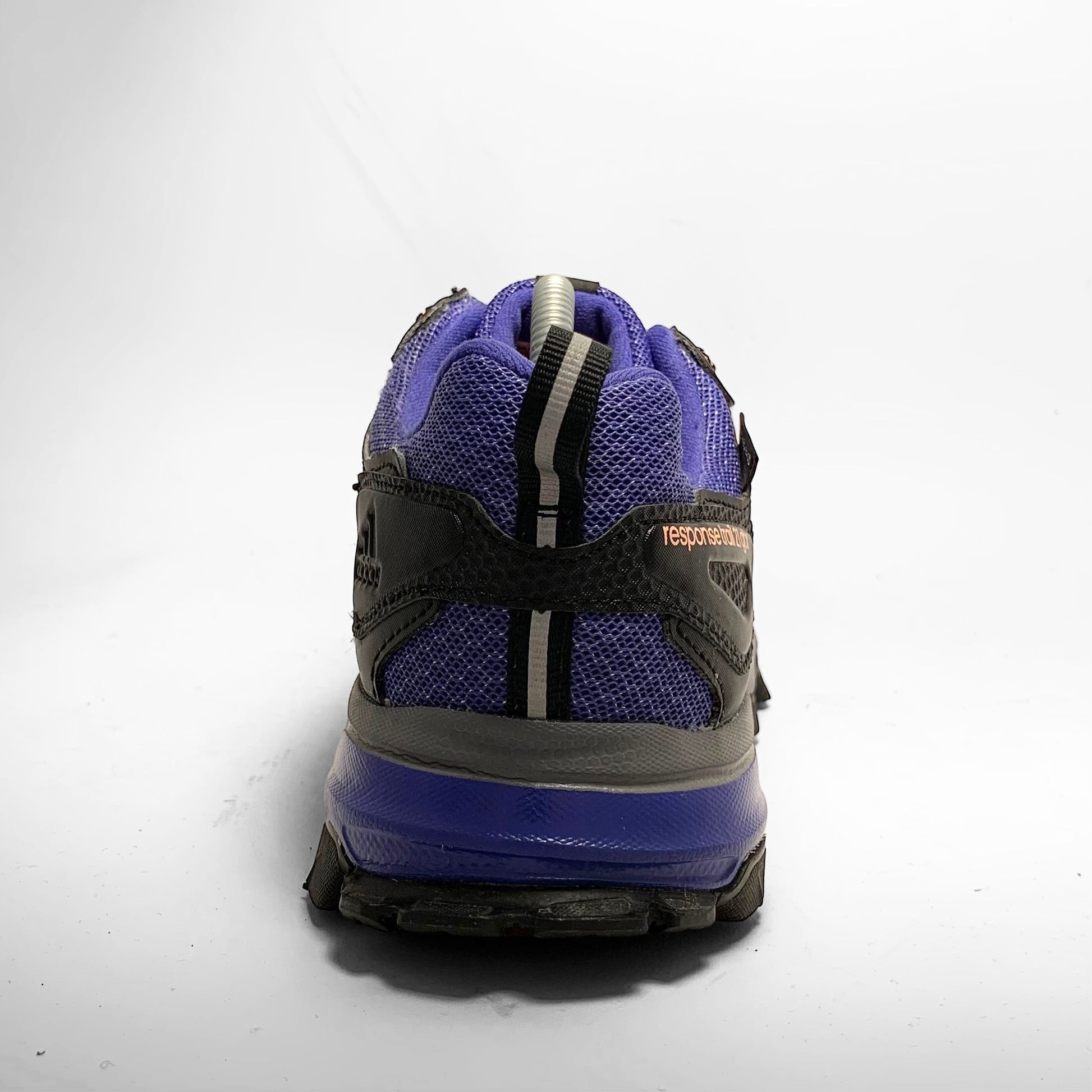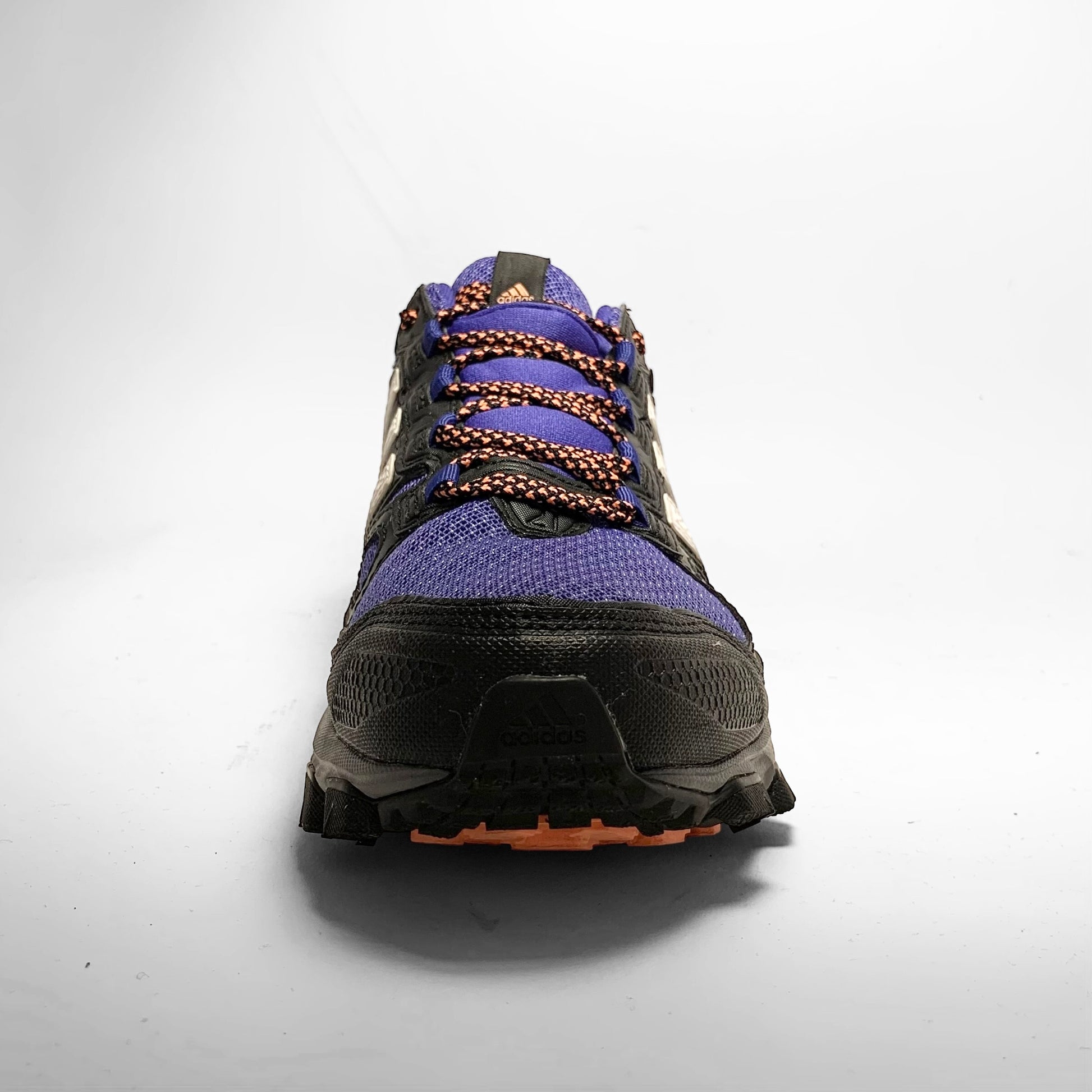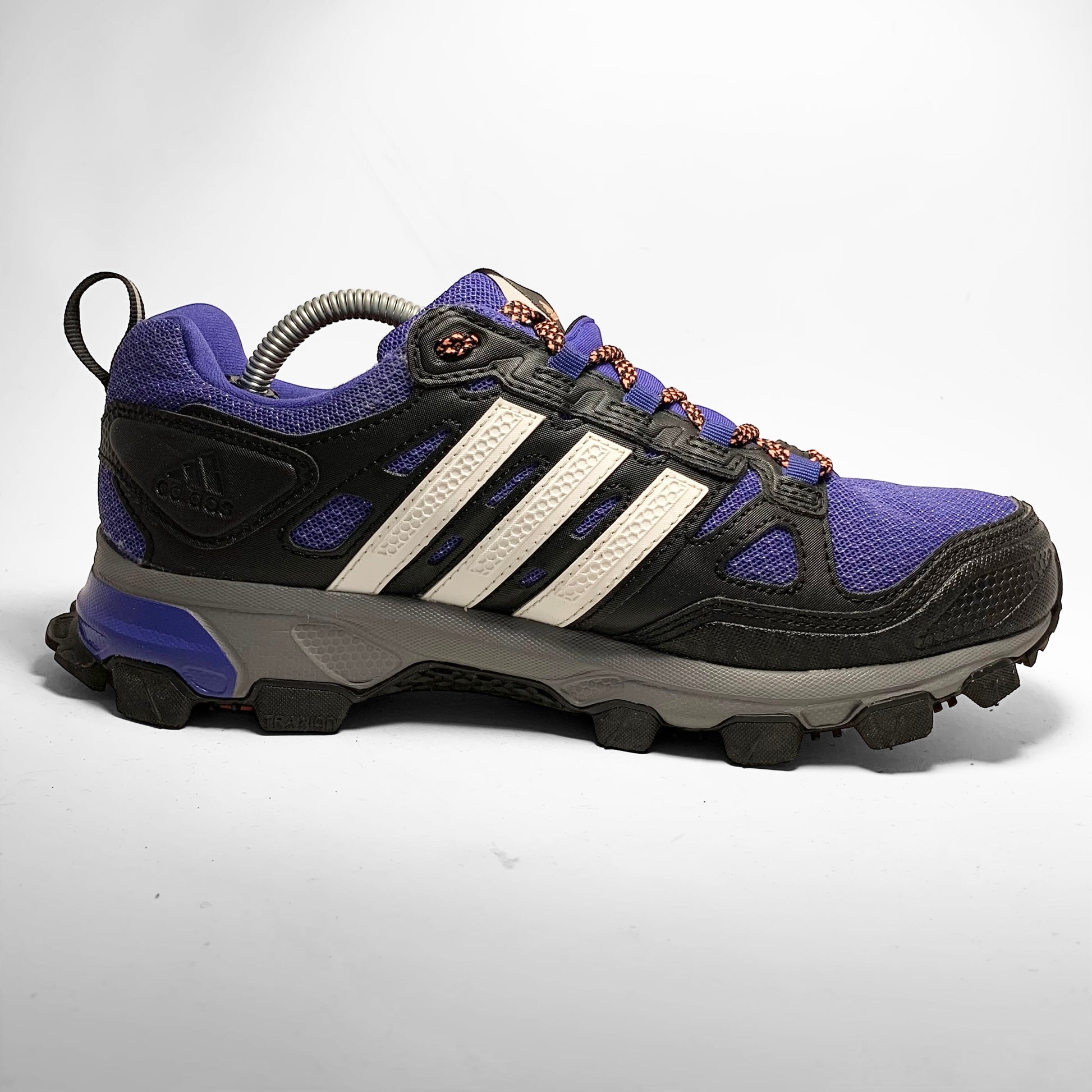 Mutliple layered bright purple mesh base with Gore-Tex material, black leather panelling and detailed rubber mudguard, white rubber detailed three-stripes, neoprene cover for the contrasting orange and black laces which match the script branding on the tongue, side and trail outsole.