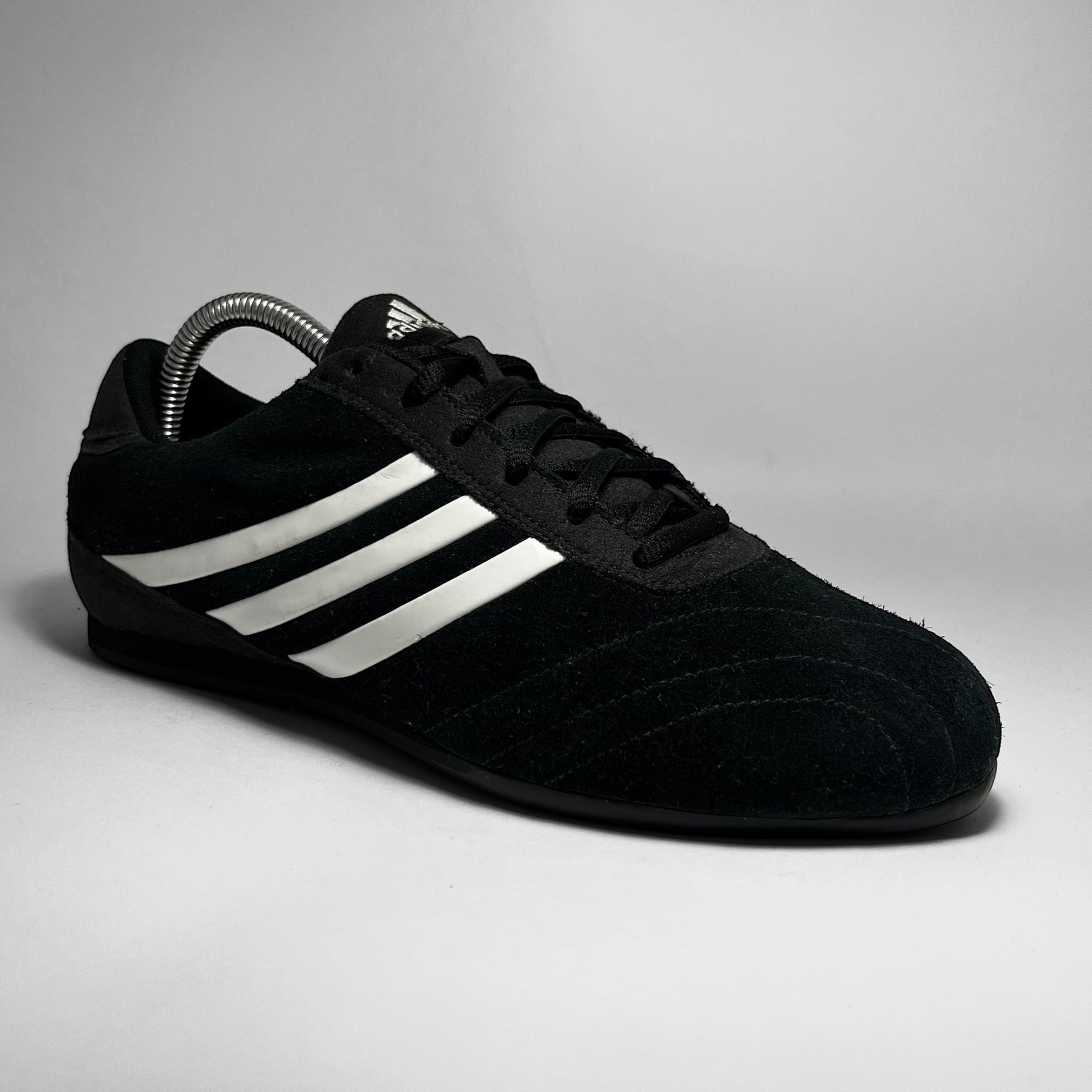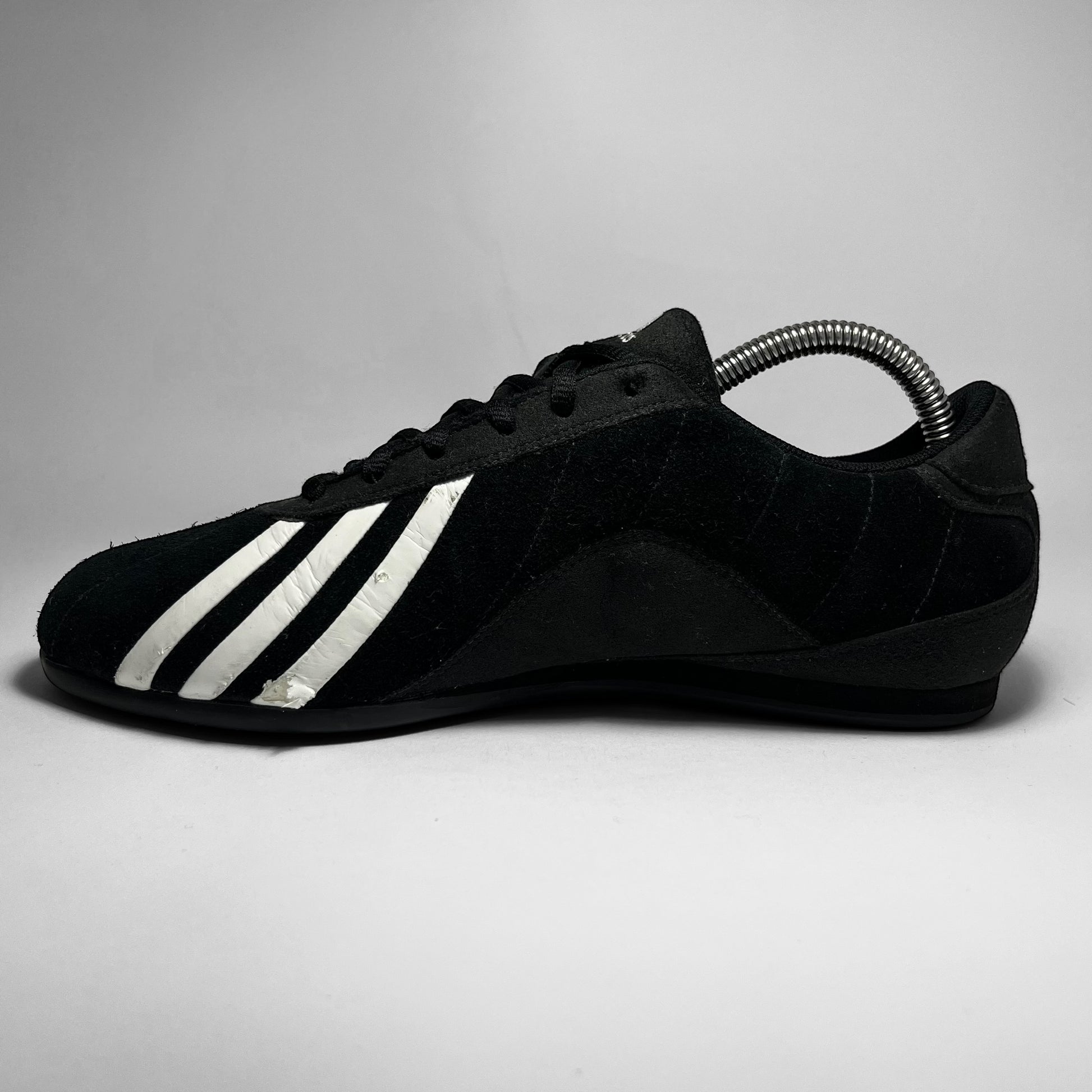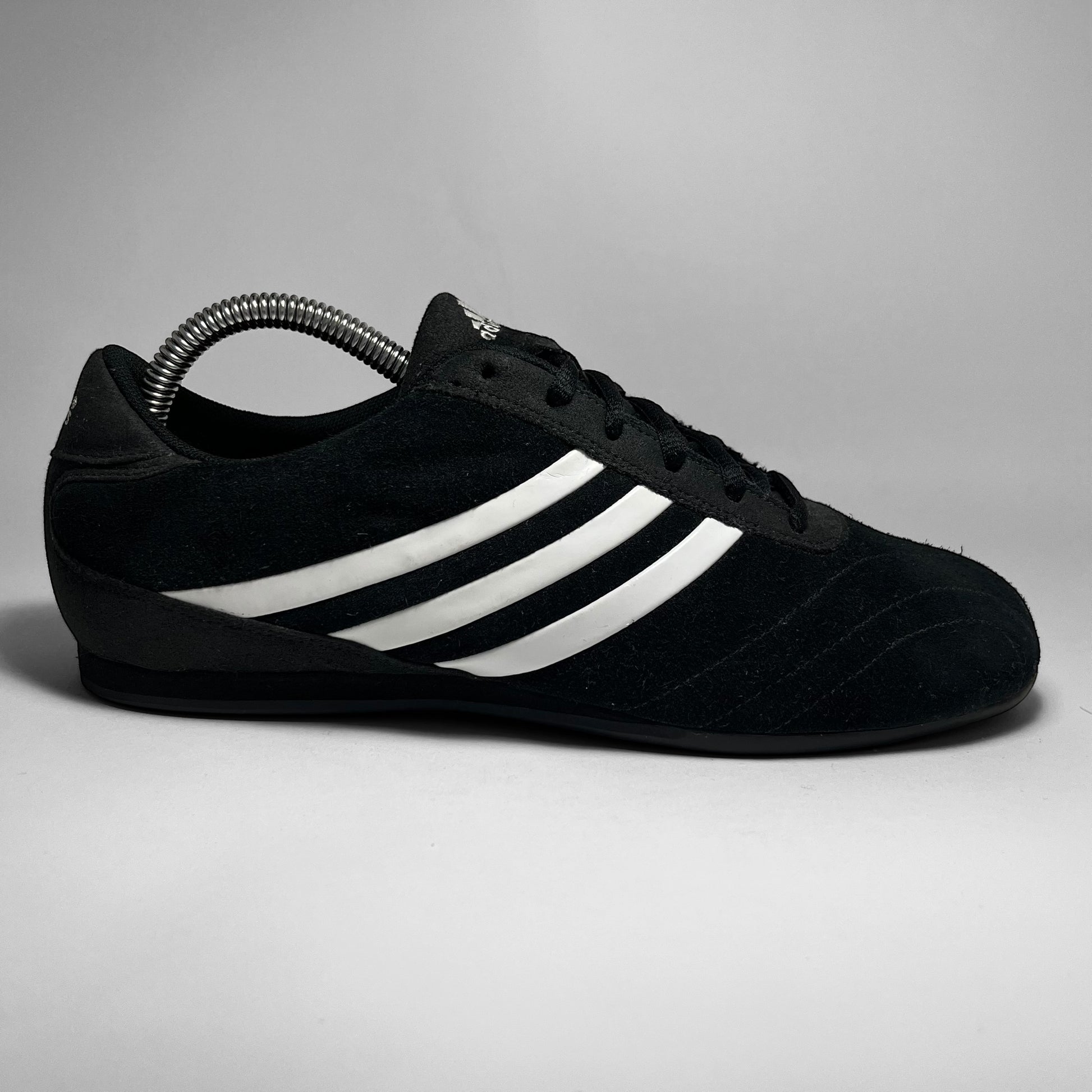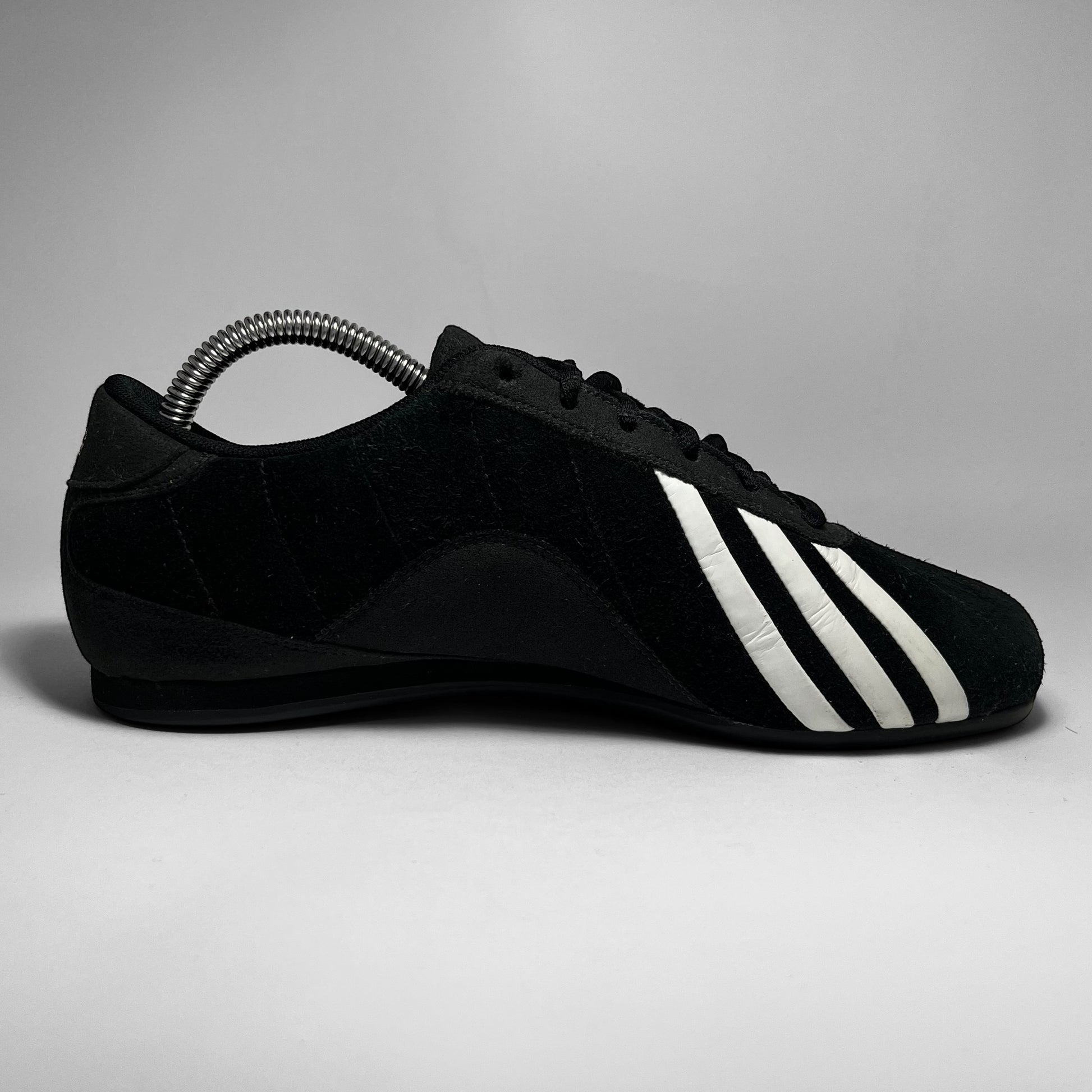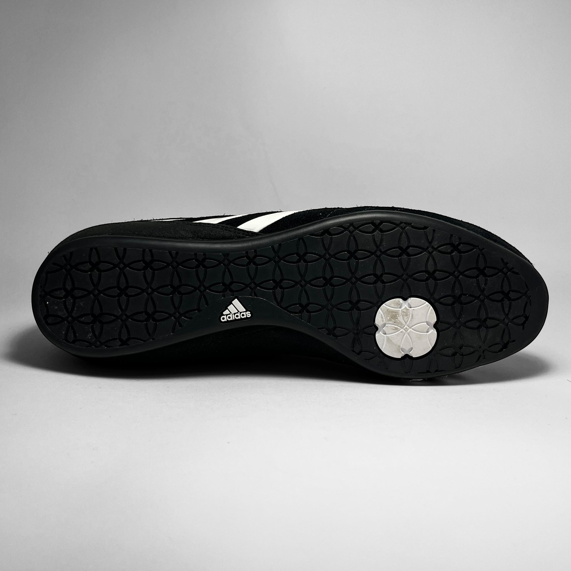 Super nice pair, instant classic. Suede uppers with stitching pattern on the uppers matching the three stripe branding which kinda wraps around the upper, two-tone black panels, embroidered branding and flower of life-like outsole pattern.