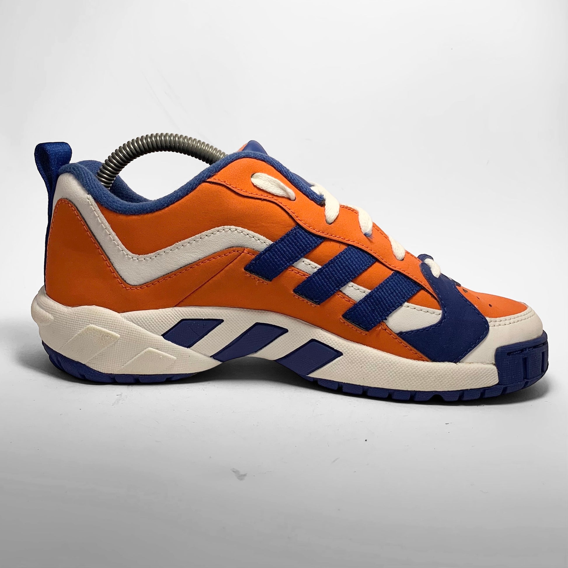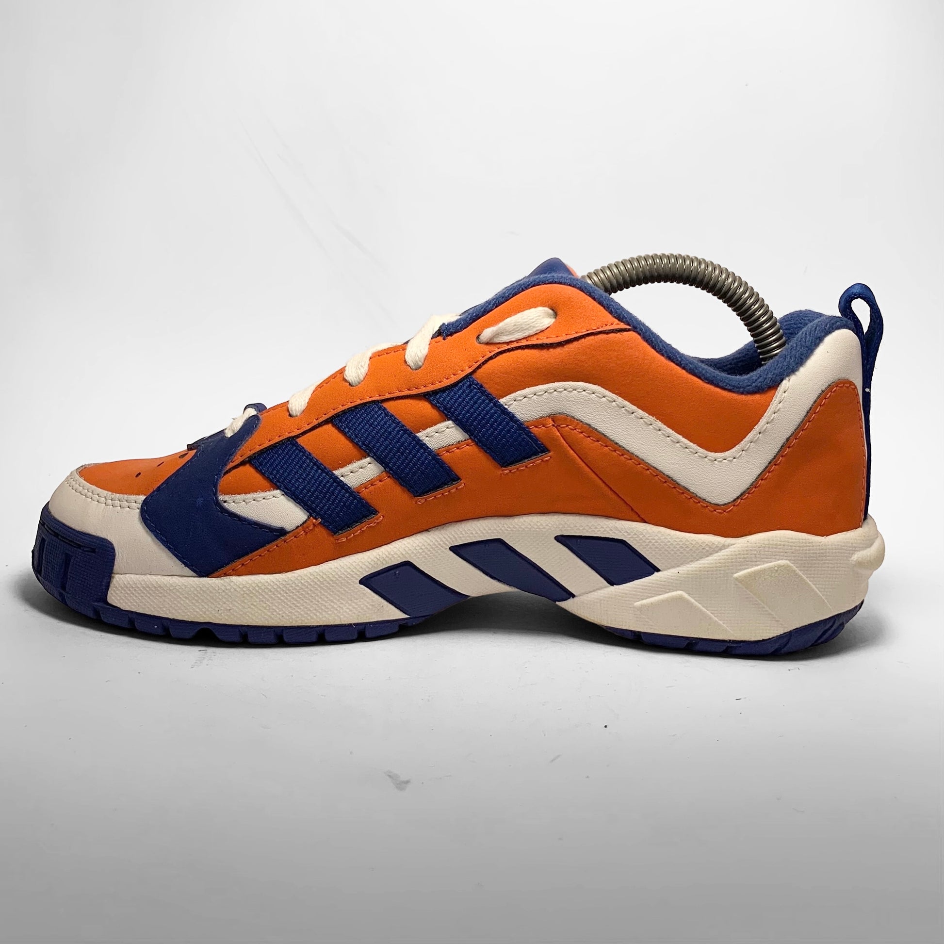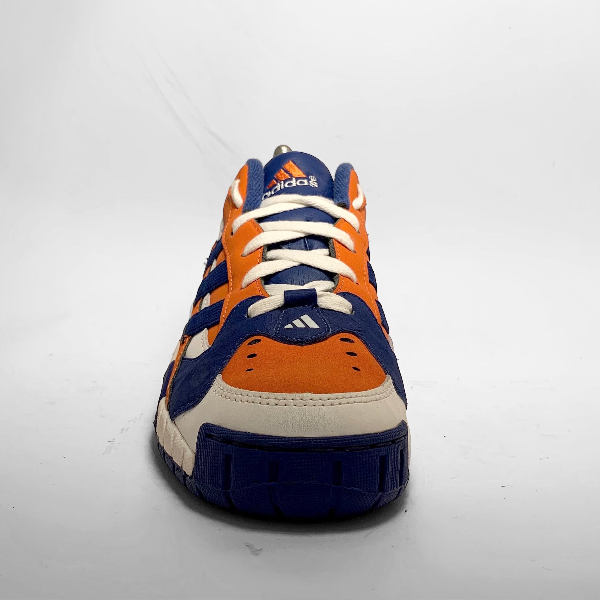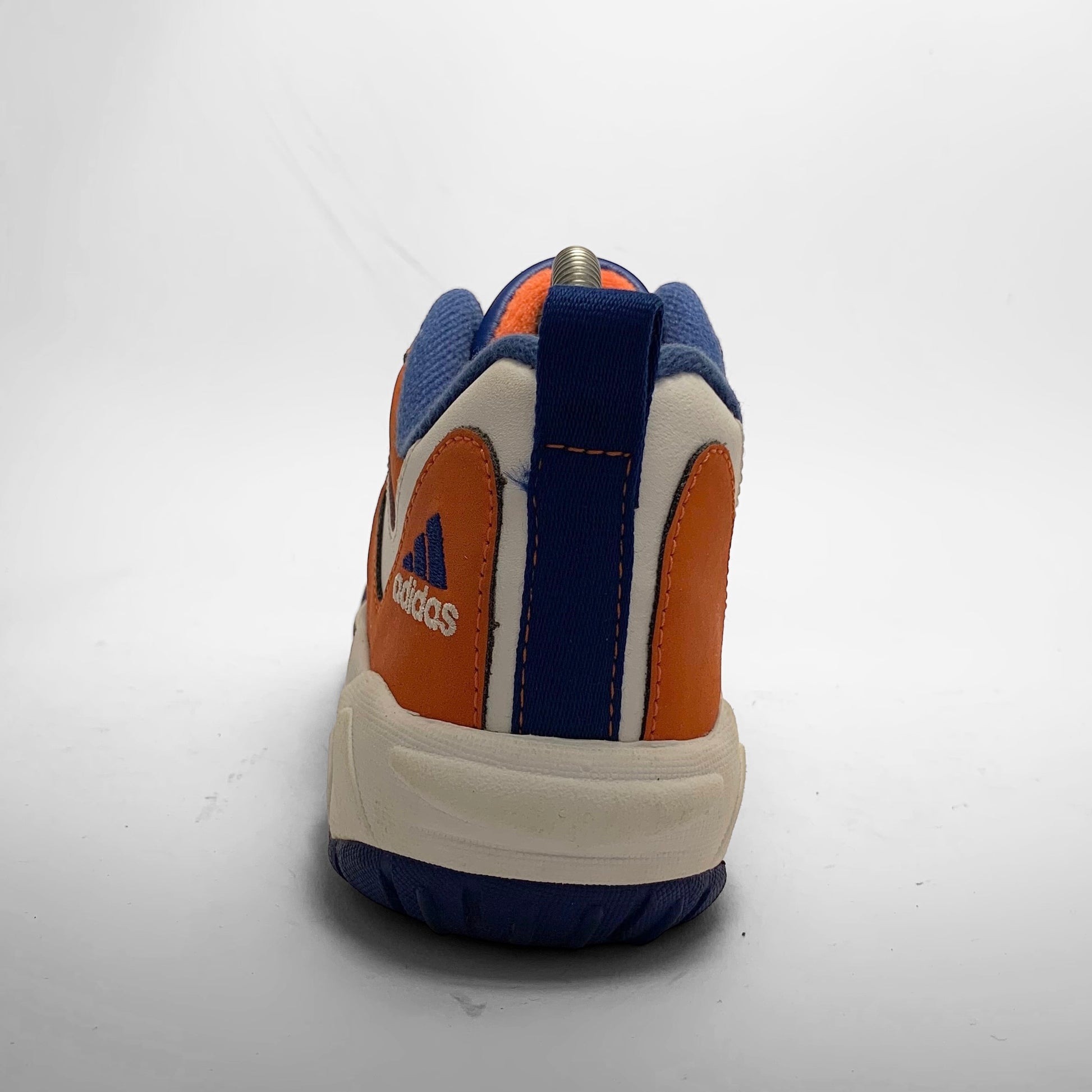 Orange and white leather panelling with contrasting blue leather and suede panels, three-striped straps along the sides flowing into the mid-sole structure matching the sock-liner, outsole, heeltab and branding.