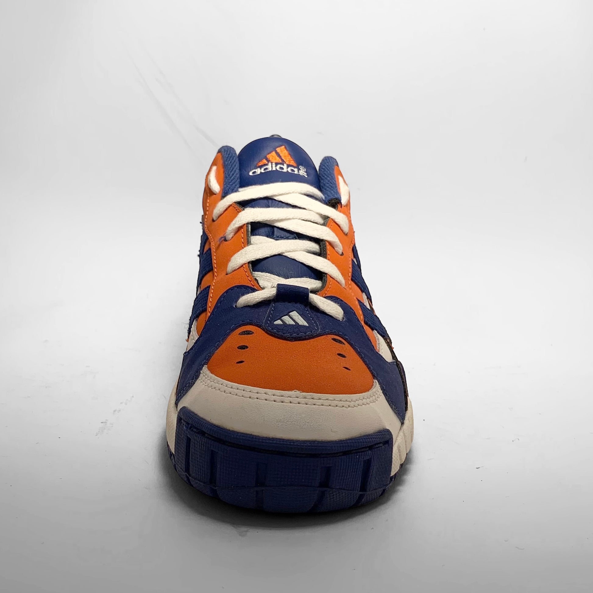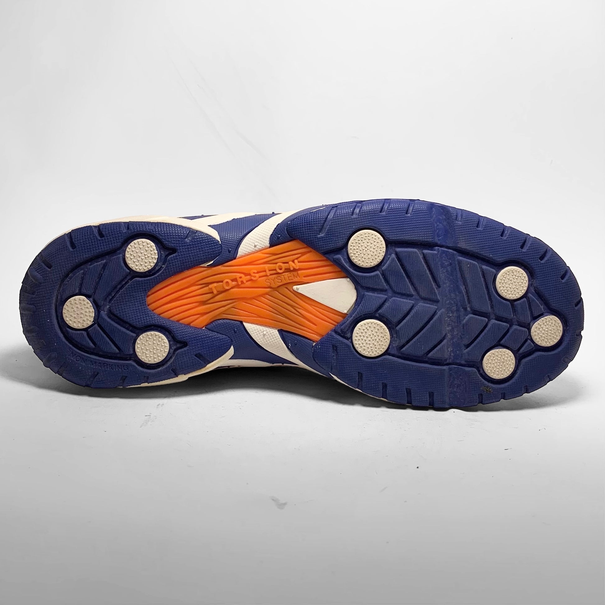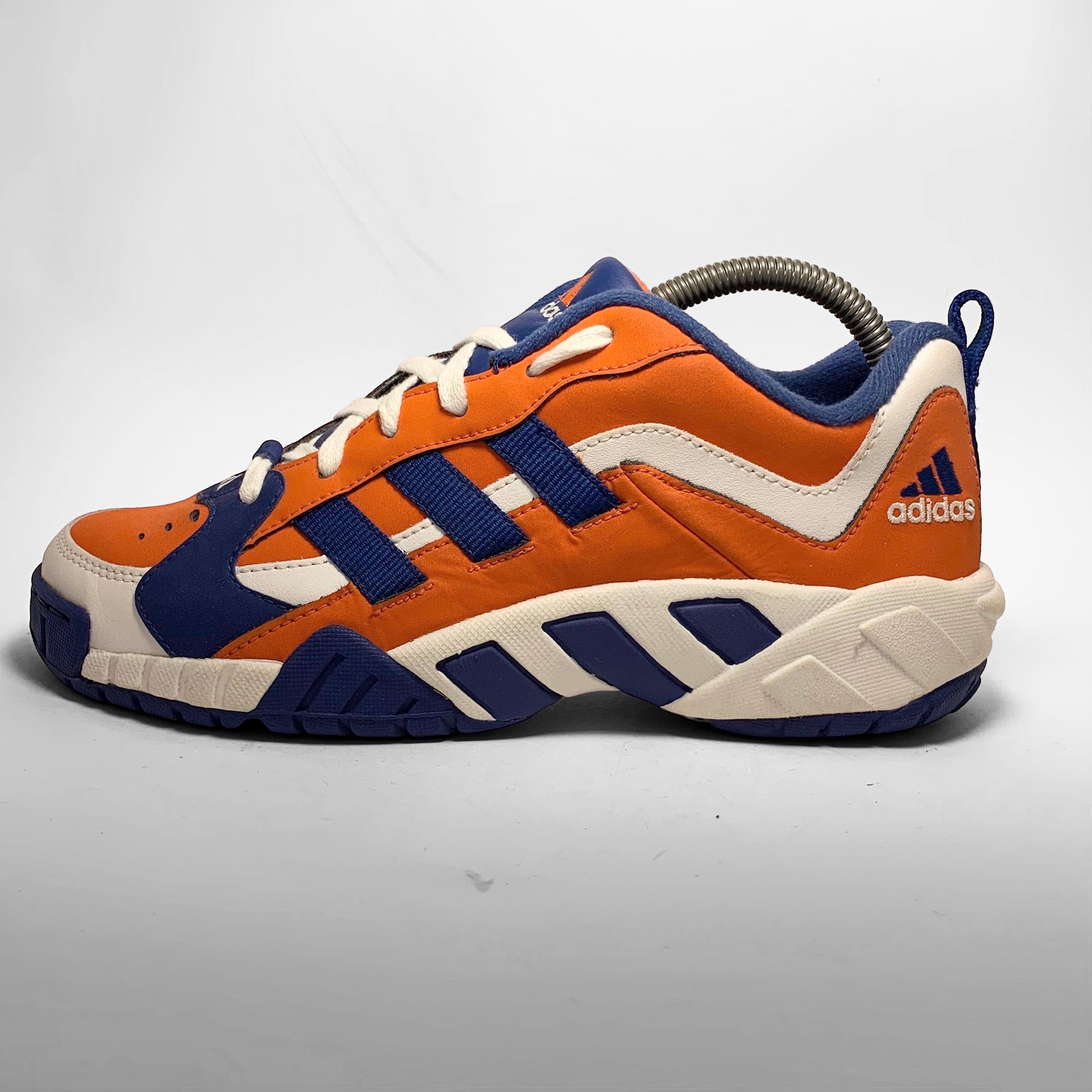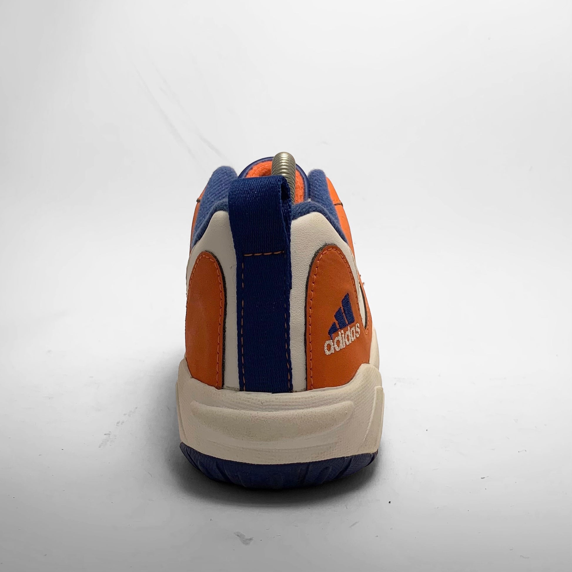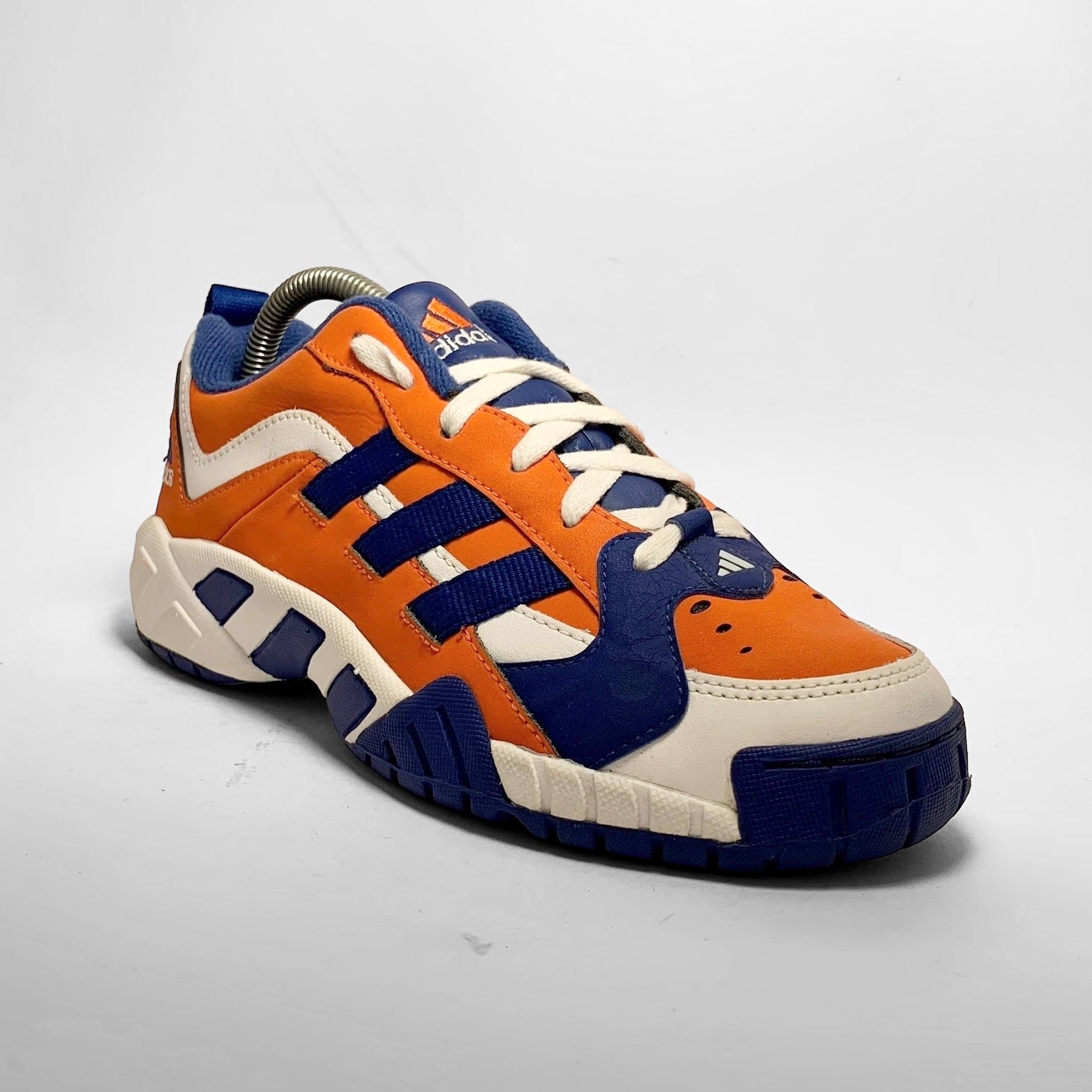 Orange and white leather panelling with contrasting blue leather and suede panels, three-striped straps along the sides flowing into the mid-sole structure matching the sock-liner, outsole, heeltab and branding.