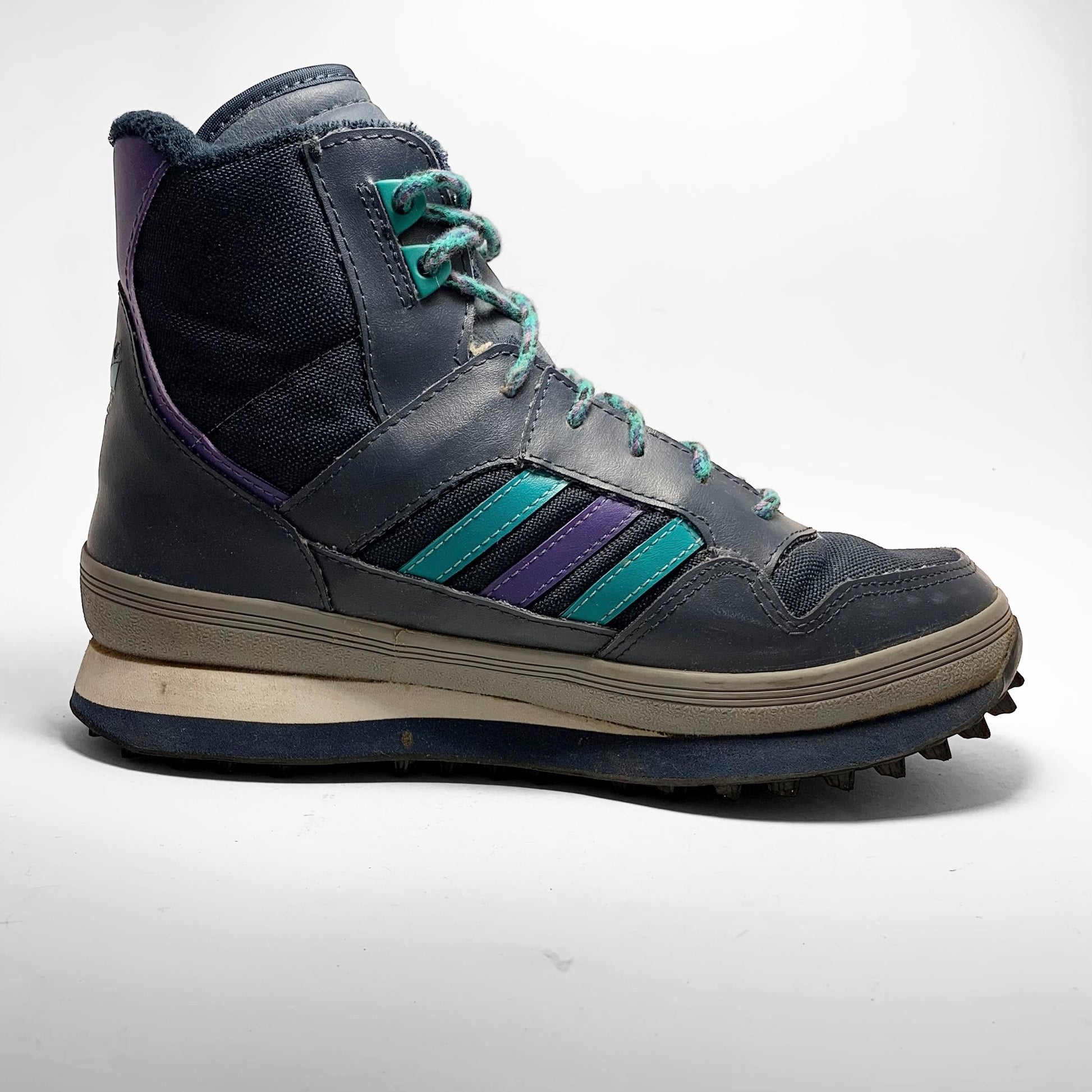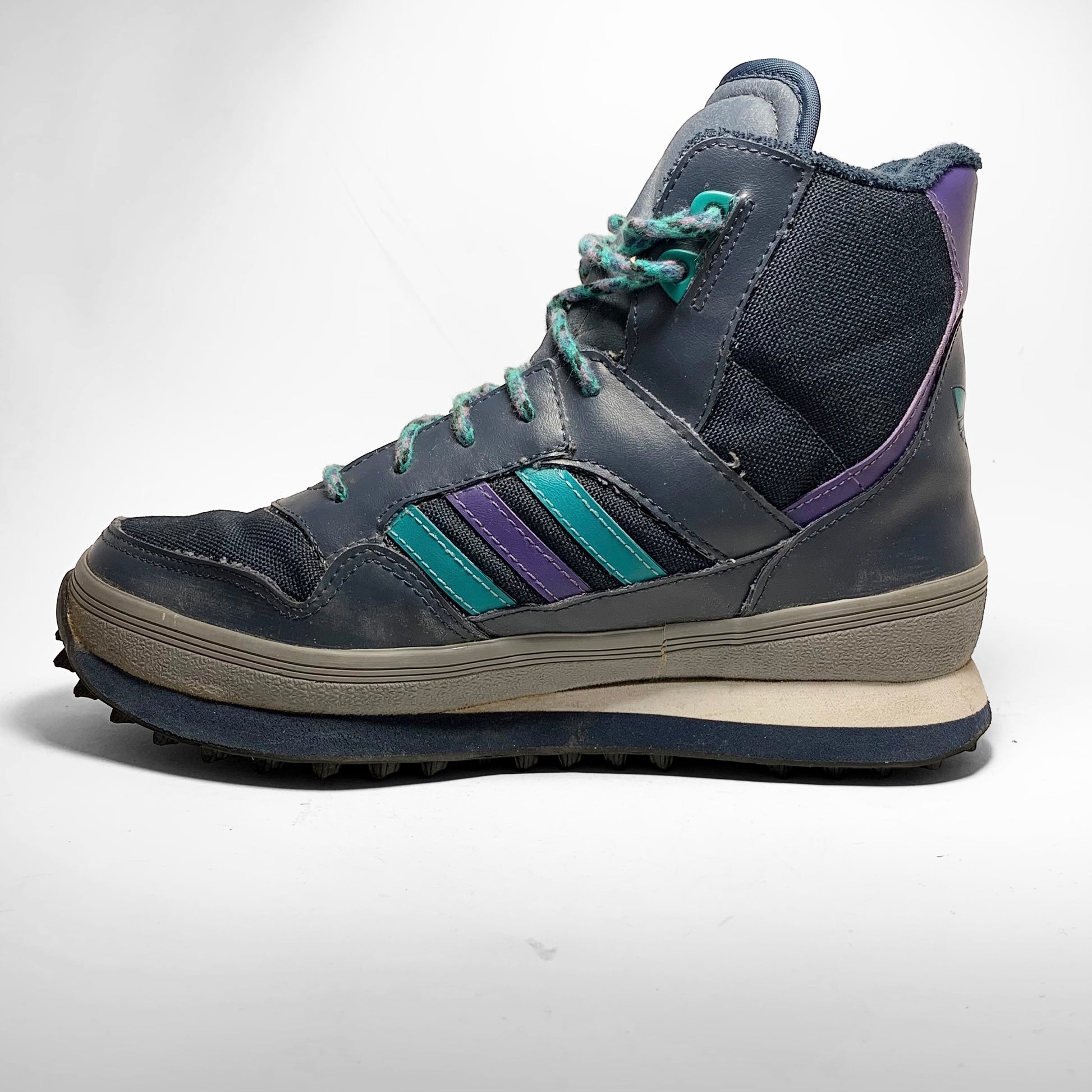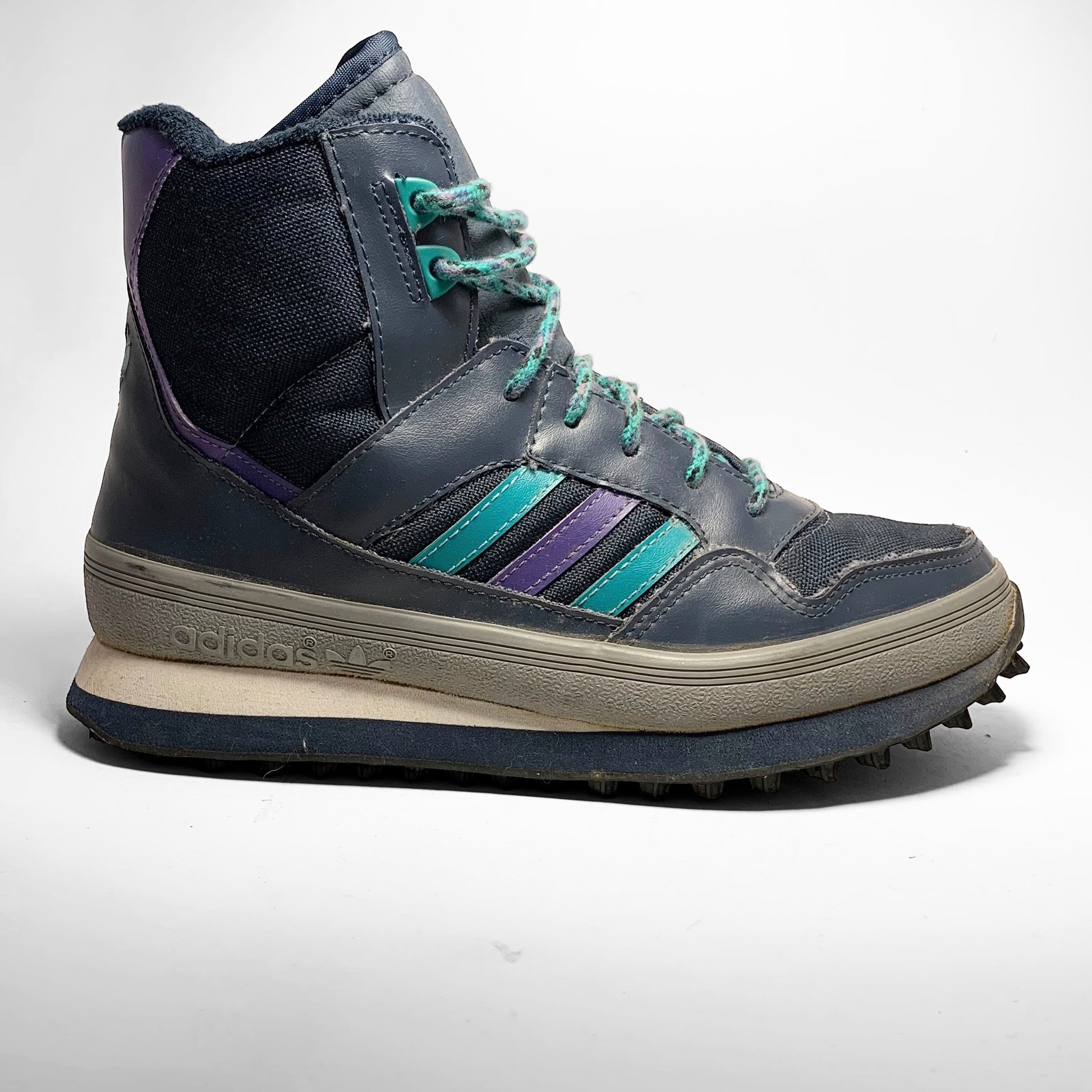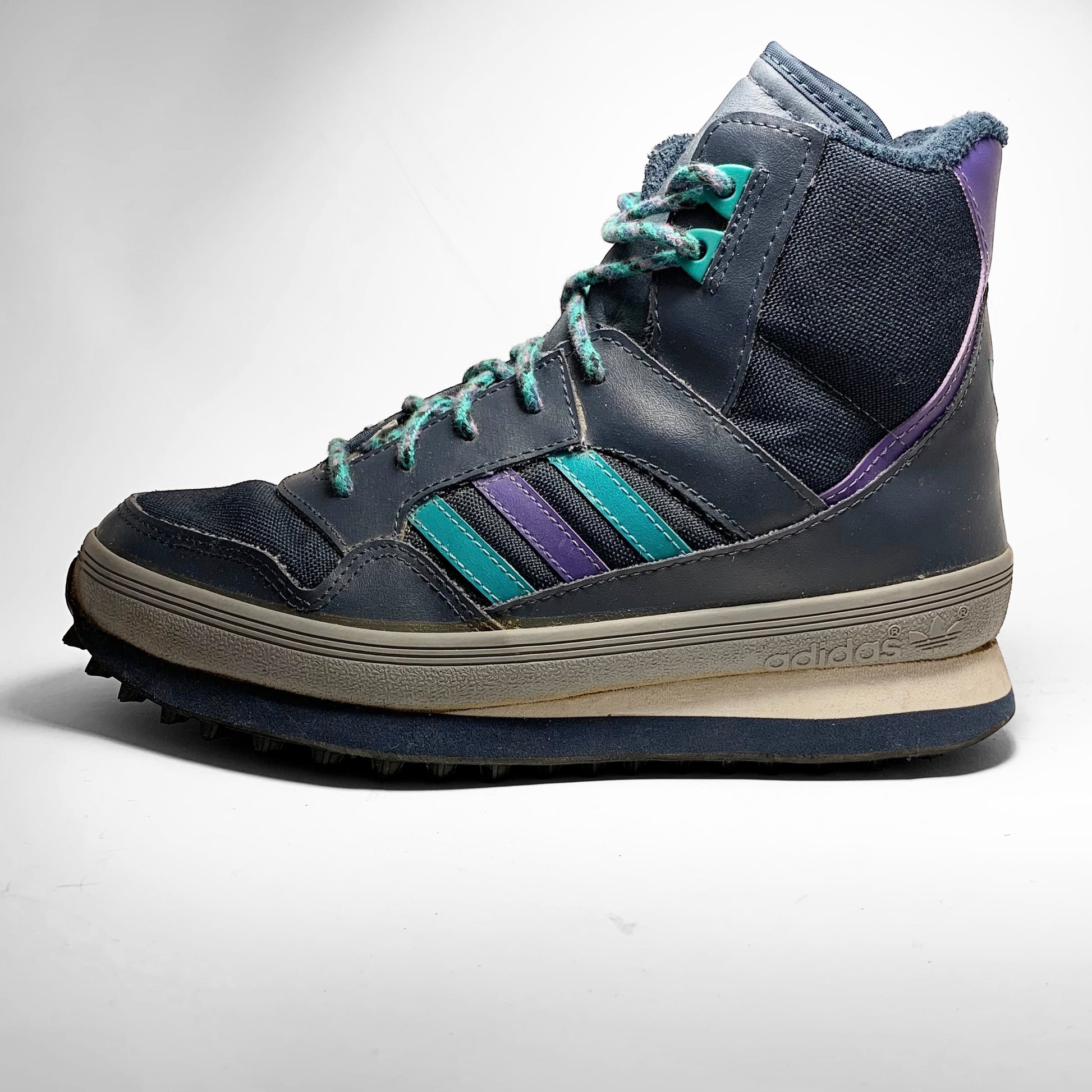 Navy canvas base, leather panels with aqua and purple contrasting three-stripes matching laces and heel-panel including branding, grey rubber mudguard, trail bubble outsole and fur-fleece lining to keep your feet warm.