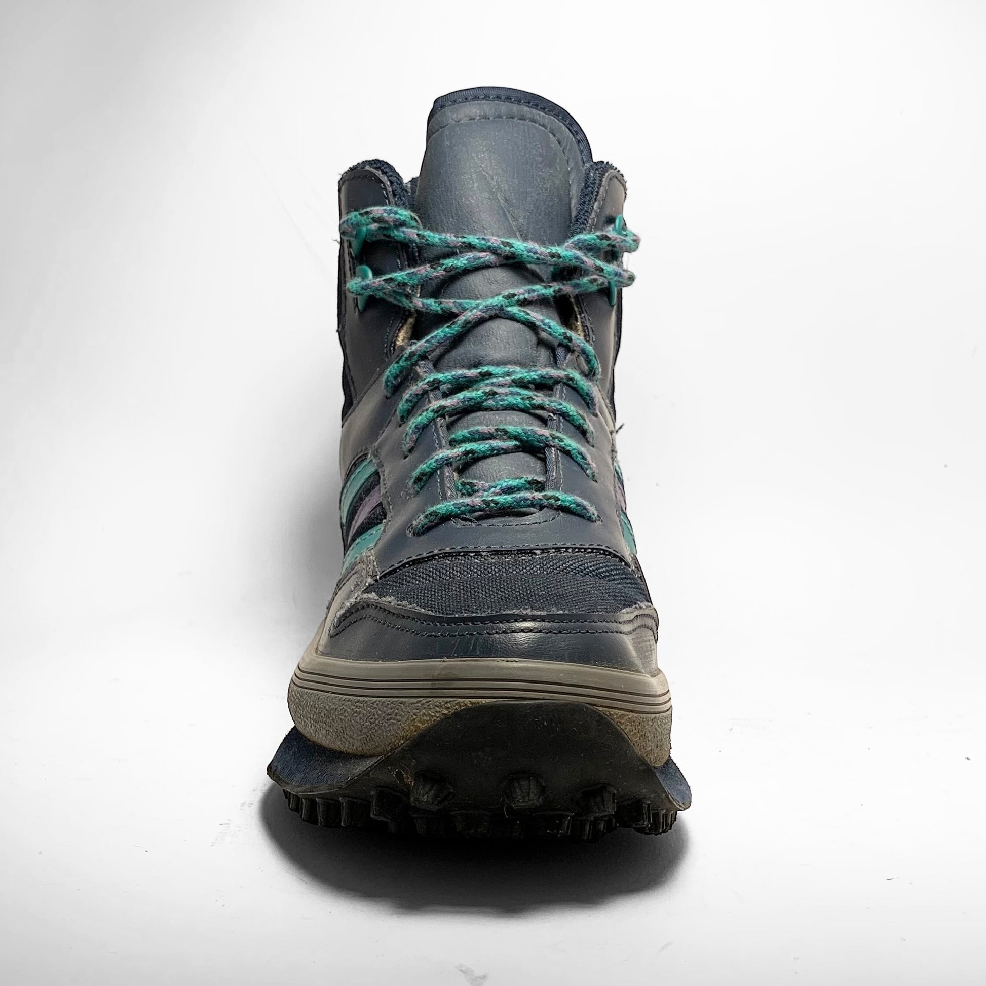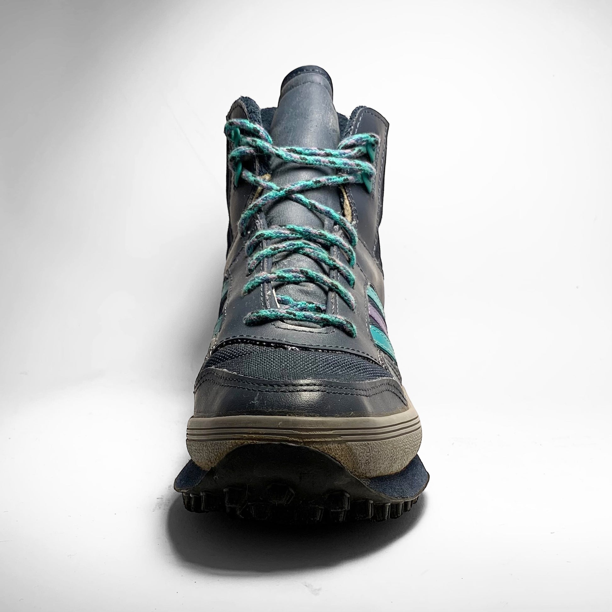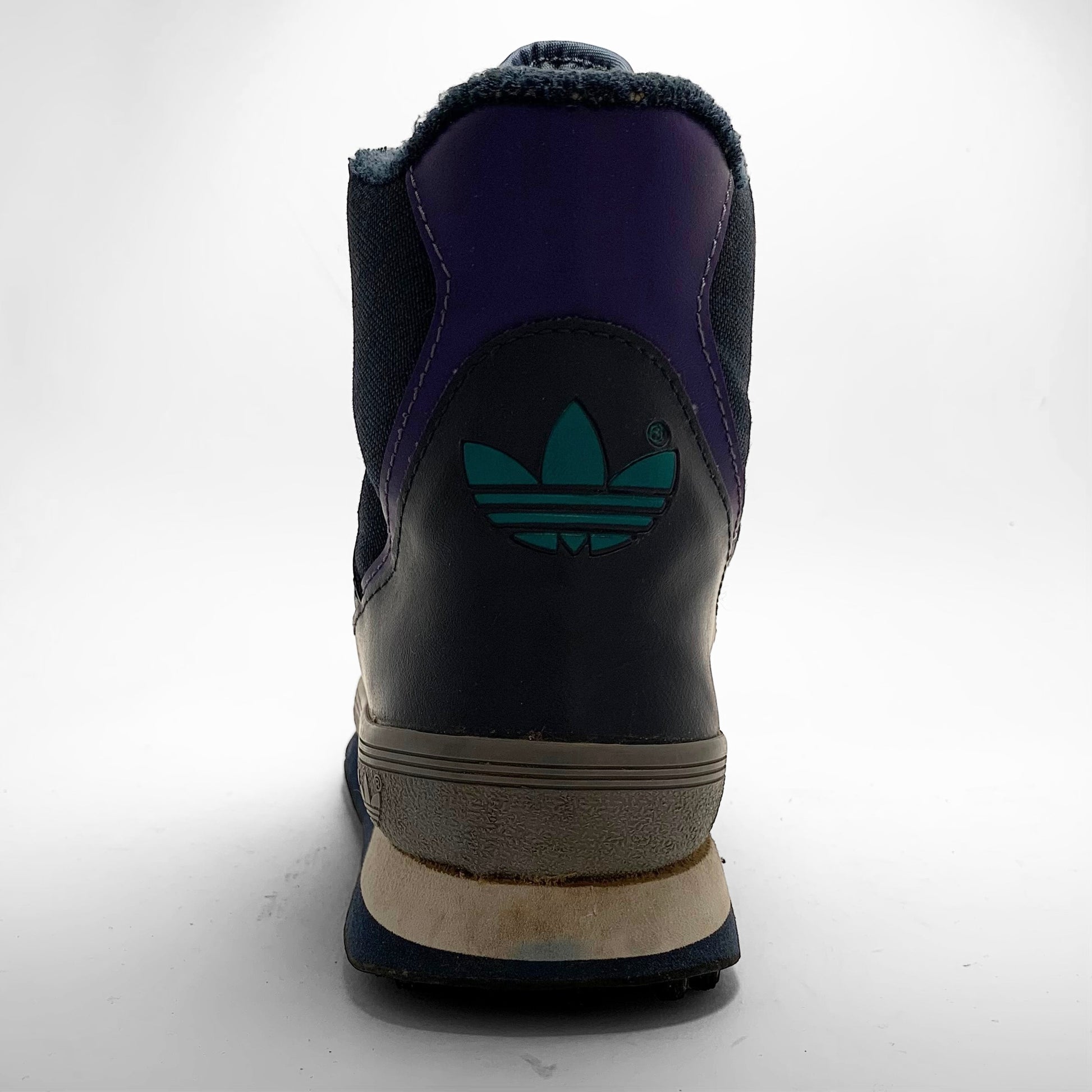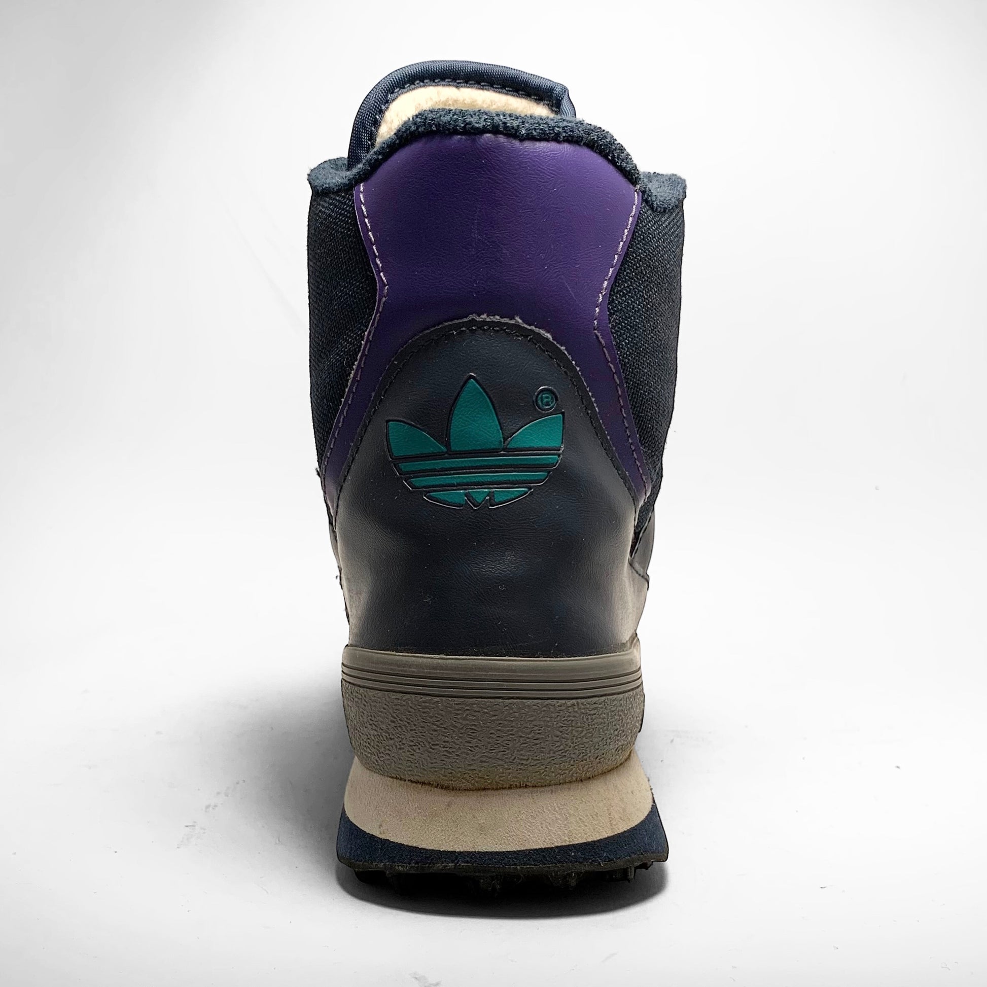 Navy canvas base, leather panels with aqua and purple contrasting three-stripes matching laces and heel-panel including branding, grey rubber mudguard, trail bubble outsole and fur-fleece lining to keep your feet warm.