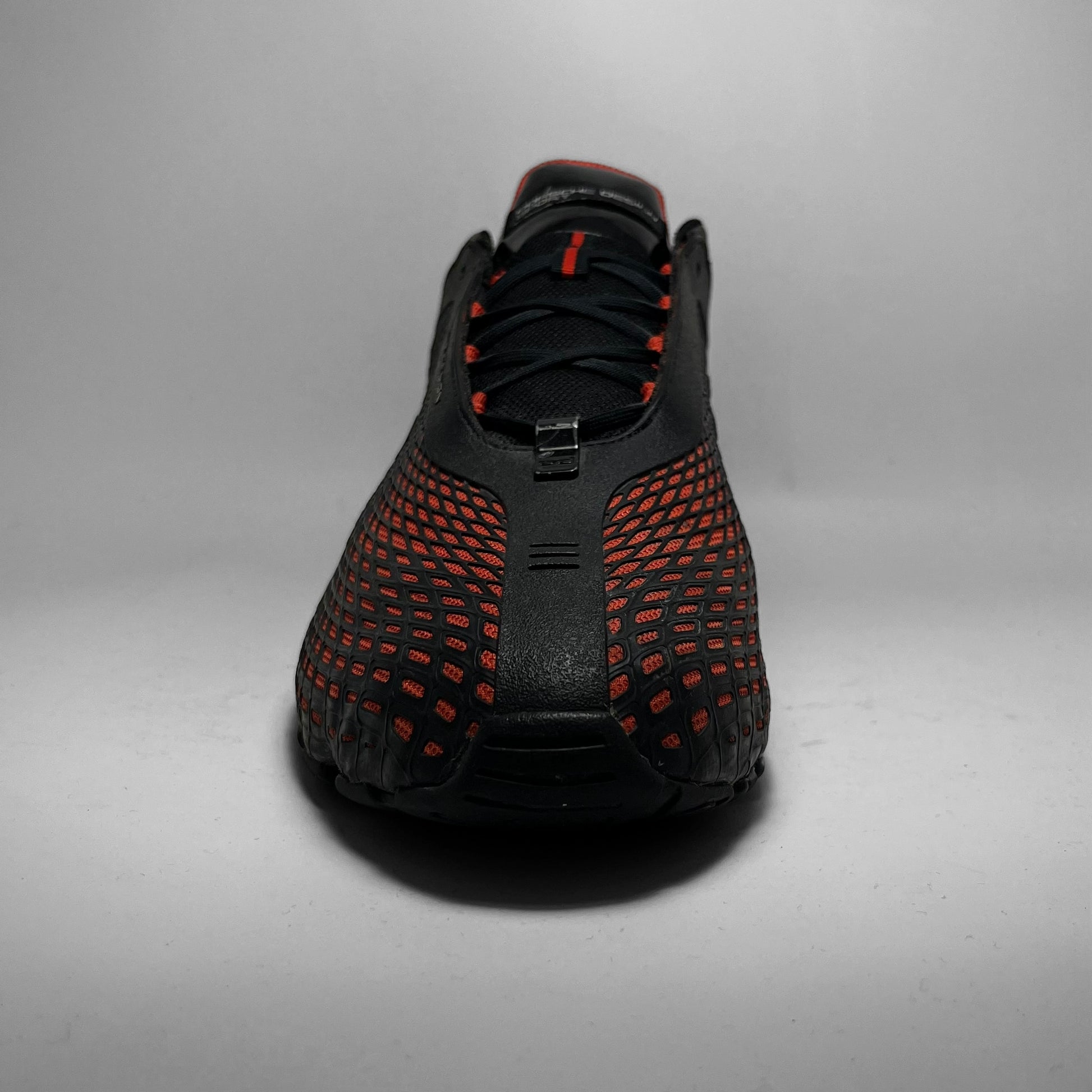 Aerodynamic Mesh Upper, containing of a sleek black and orange grid mesh overlay offering exceptional breathability, while the synthetic leather panels add durability and support. An anatomically designed cushioning, securing the lace-up system and a reinforced heel