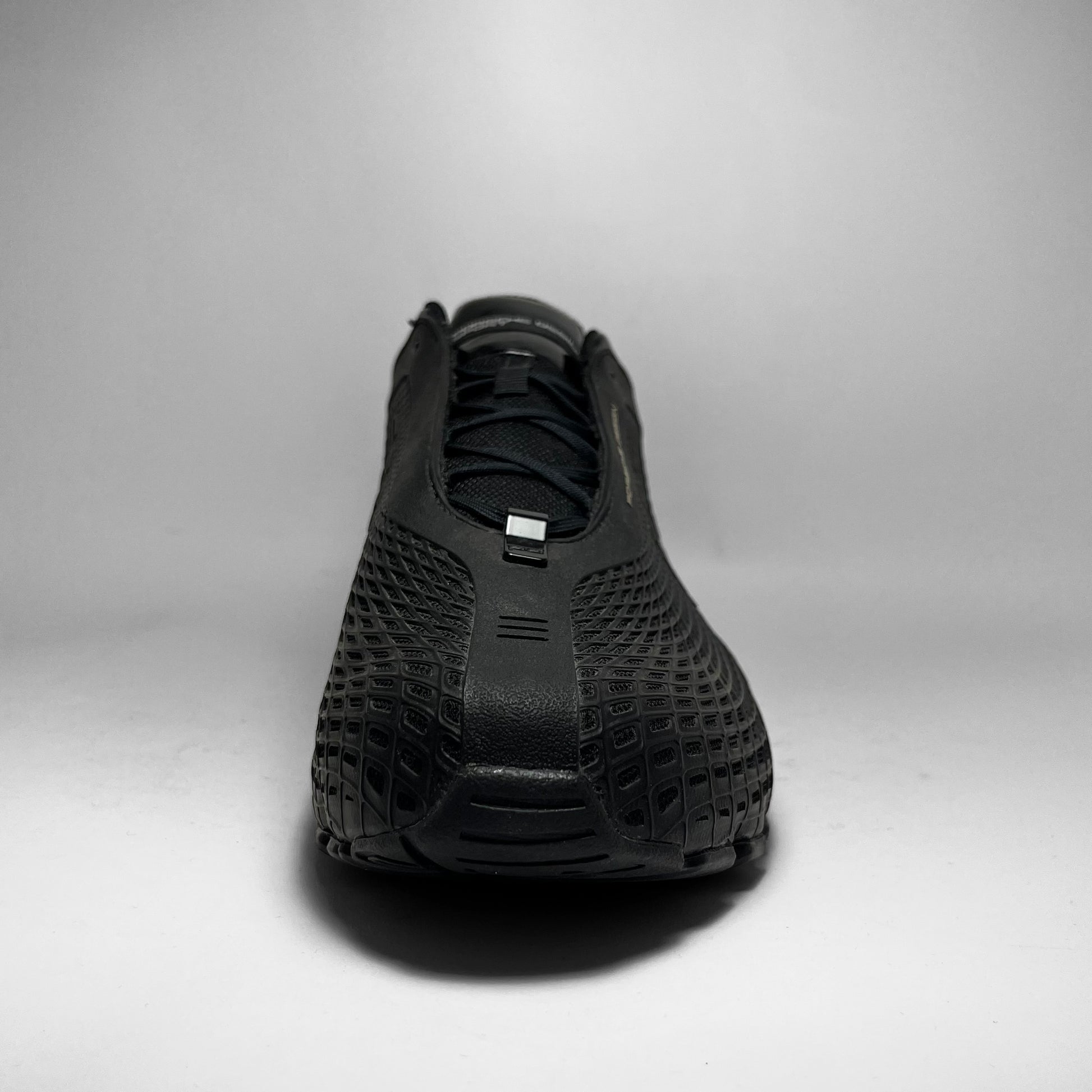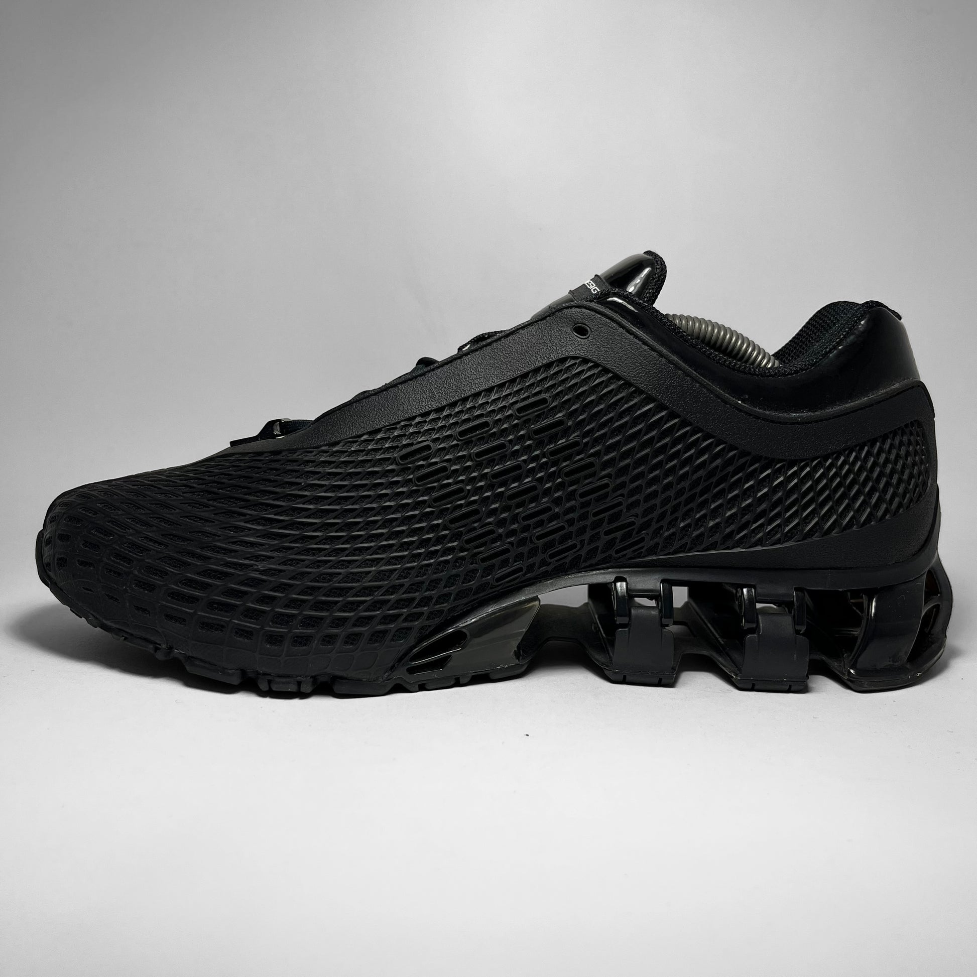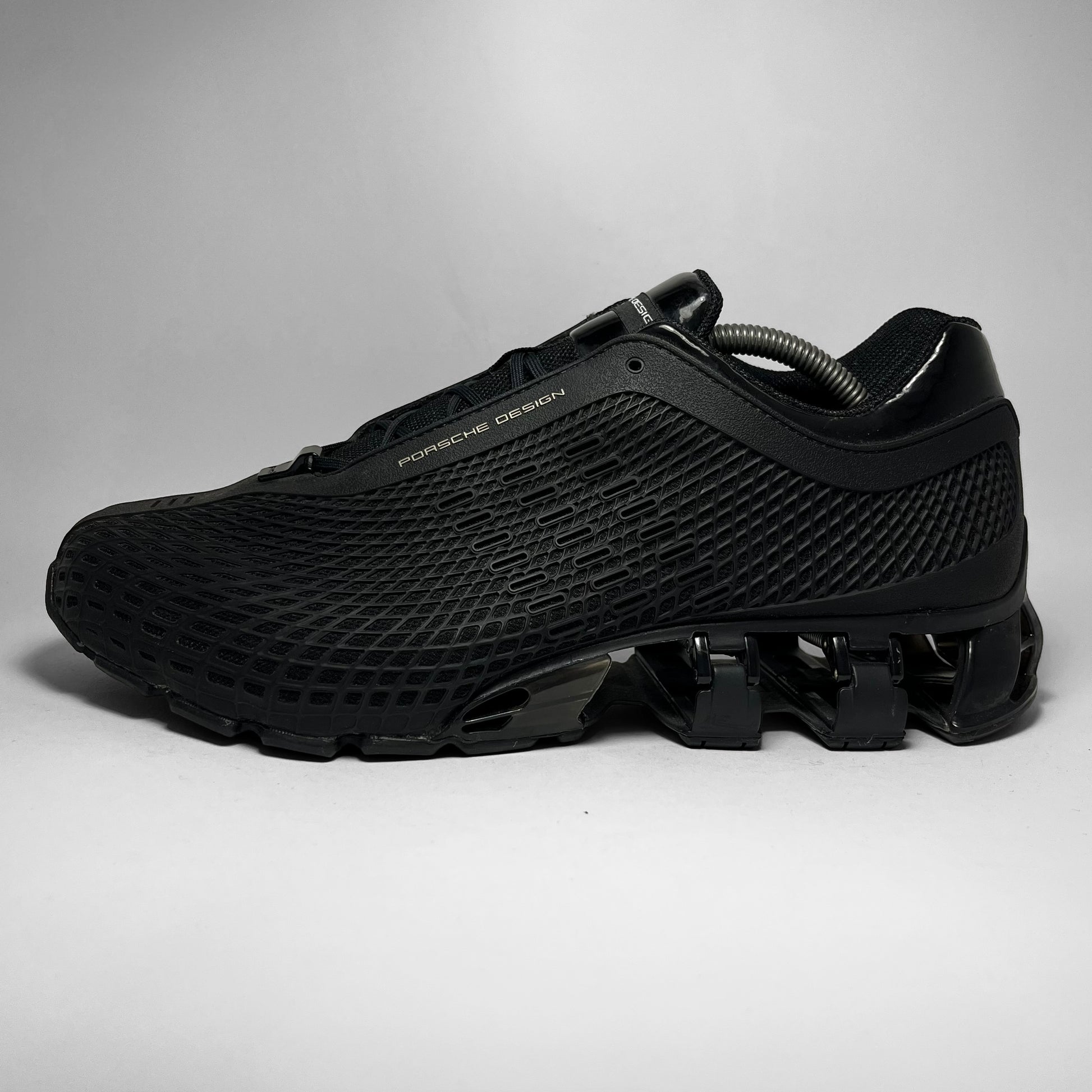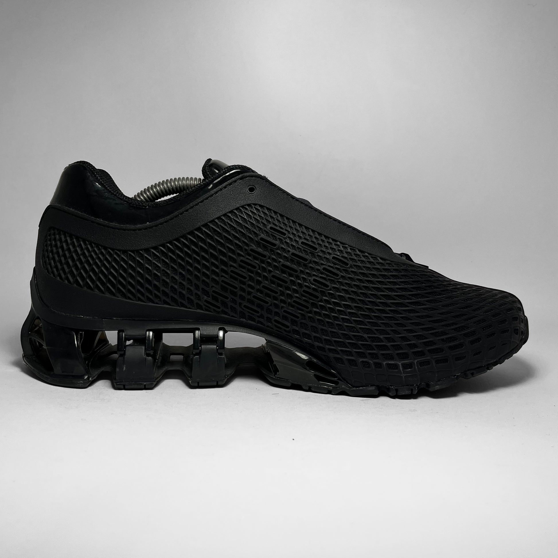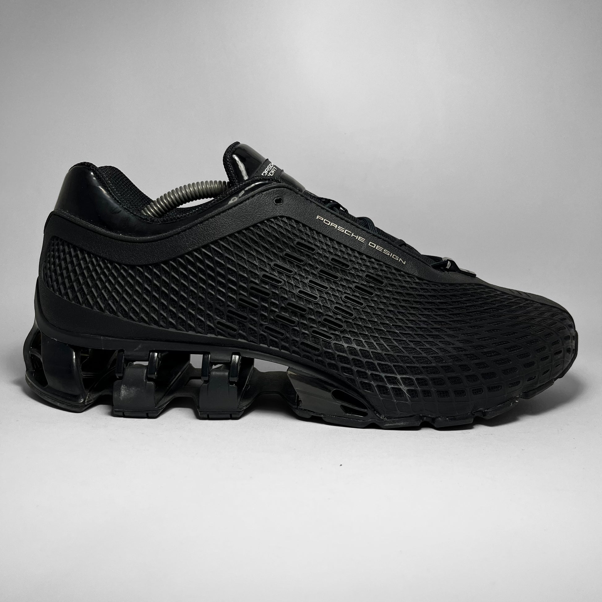 A sleek fusion of automotive-inspired design and performance engineering, featuring a seamless black mesh upper with aerodynamic paneling and tonal Porsche Design branding. The sculpted Bounce:S midsole incorporates visible mechanical springs for responsive cushioning and forward propulsion.