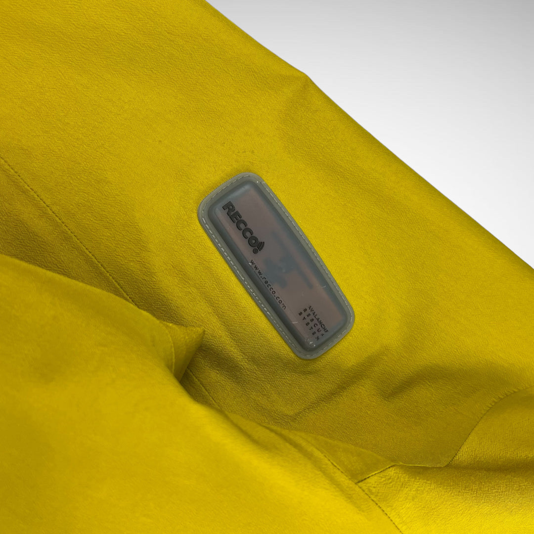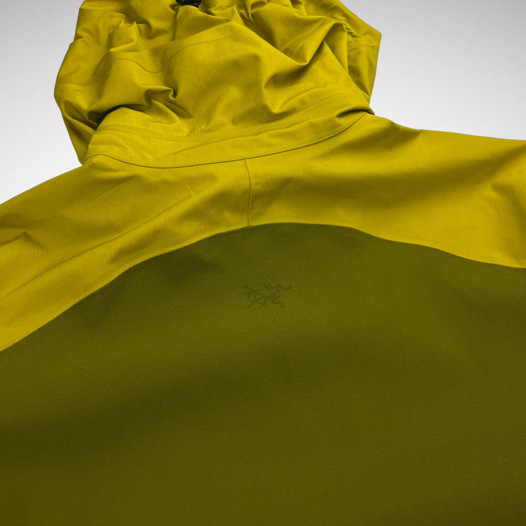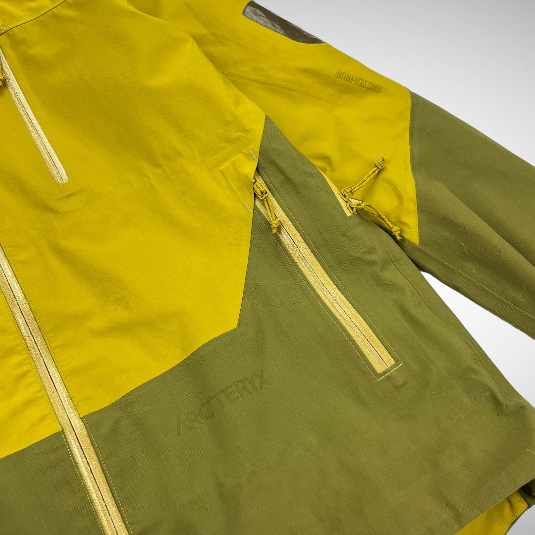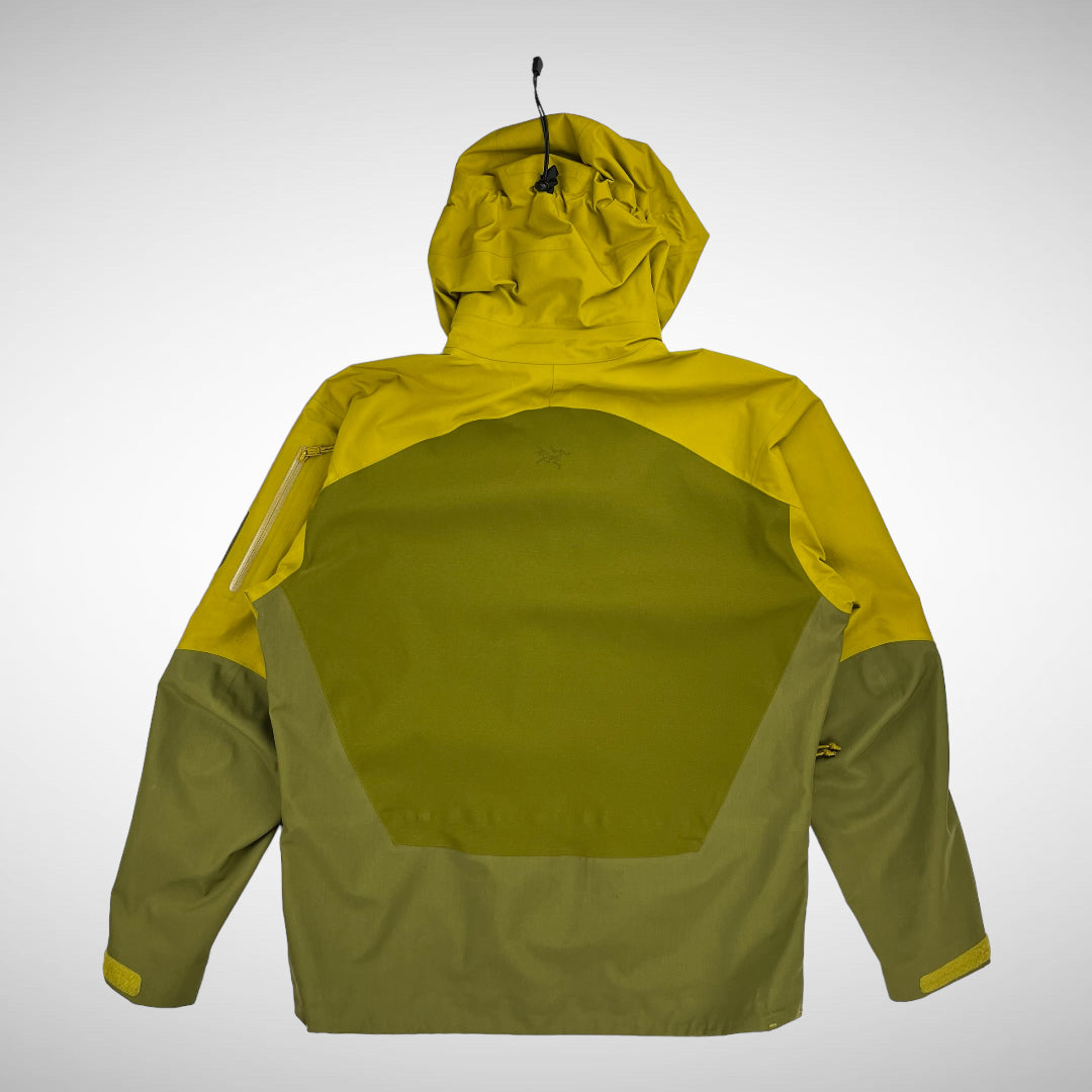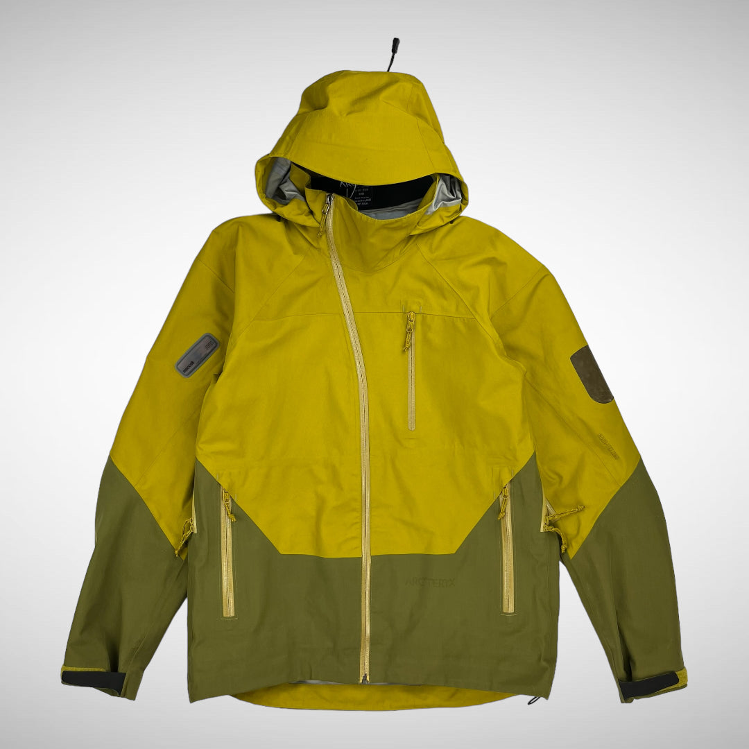 Two-toned Sidewinder with Gore-Tex XCR print on upper left-sleeve and zip-pocket with transparent panel, Recco on the right upper-sleeve, Arc’Teryx script print on lower left body, three front zip compartments, arm-pit zip-vents, logo on upper-back and adjustable hood, cuffs and hem.