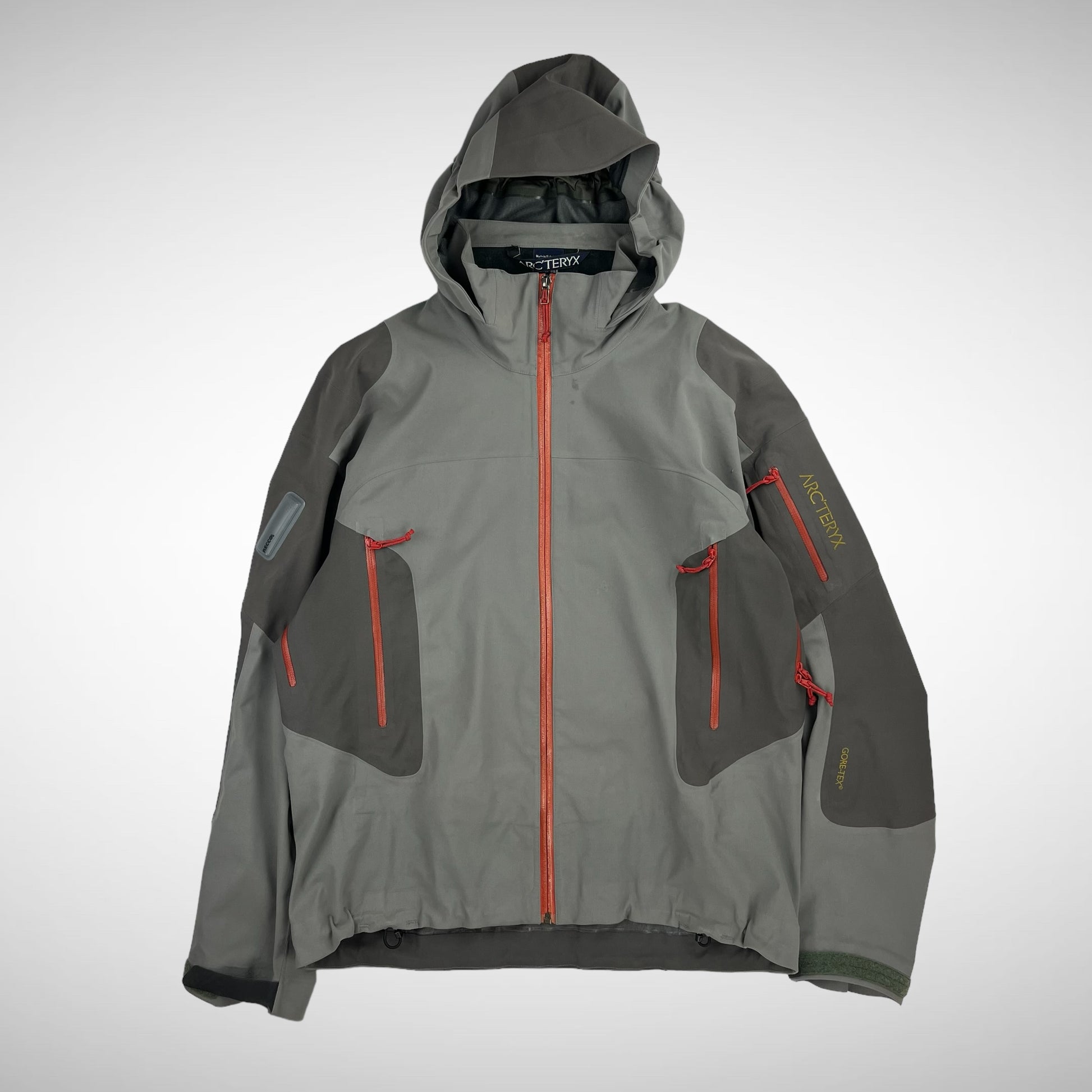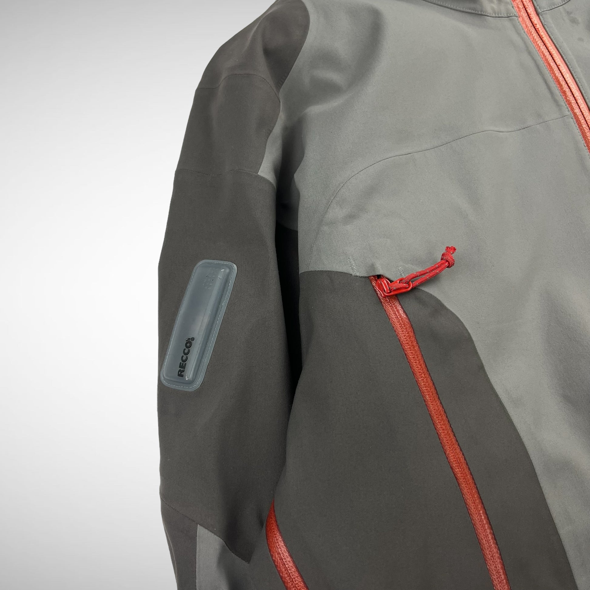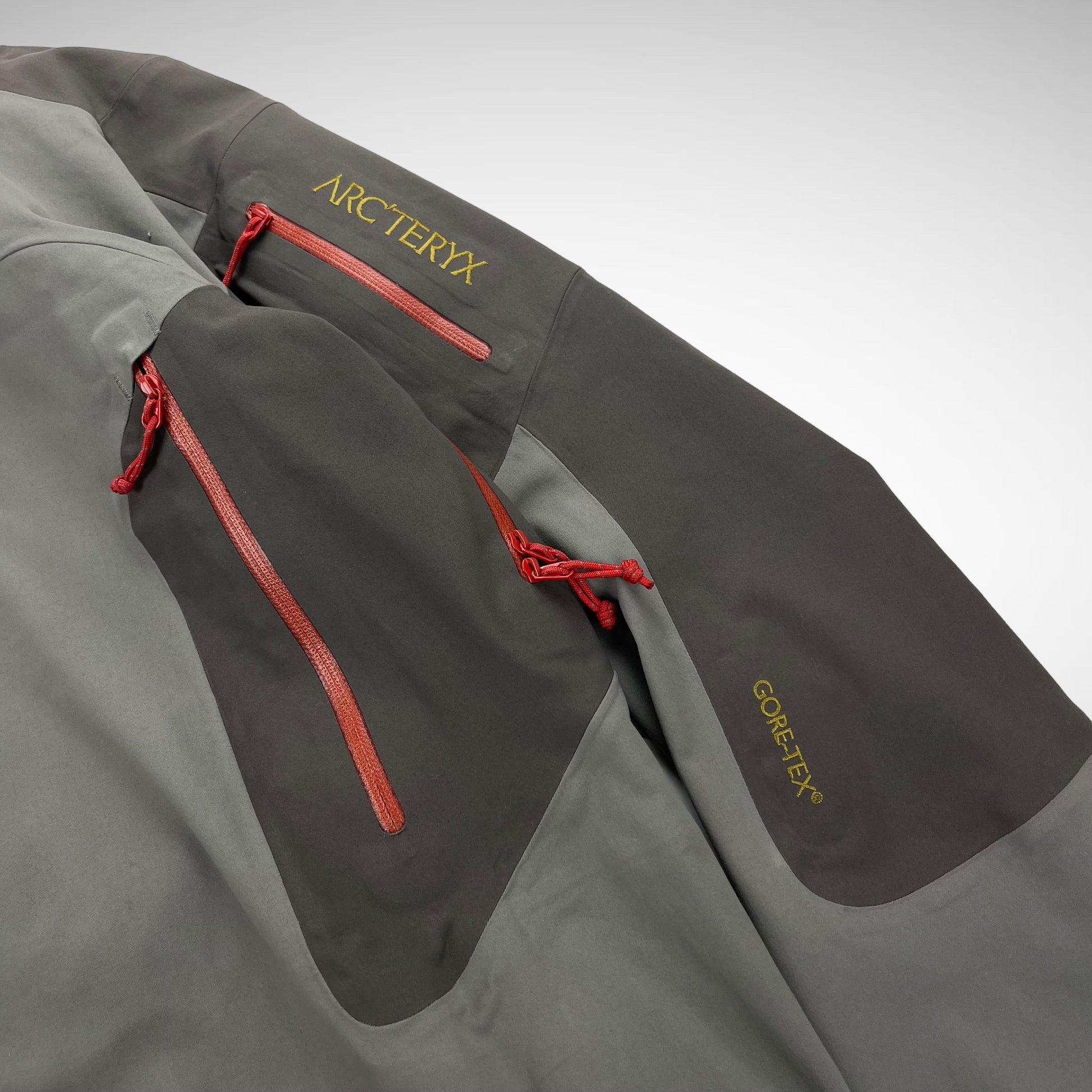 Waterproof GTX panelled jacket in ‘Gunmetal’ colour-way being two tones of grey with orange waterproof zip-pockets on lower body, upper arm and arm-pit vents, yellow embroidery branding on left arm (Arc’Teryx and GTX script) and lower back logo, RECCO system included.