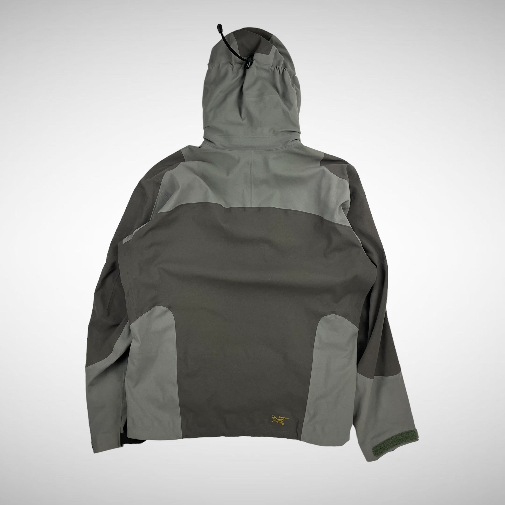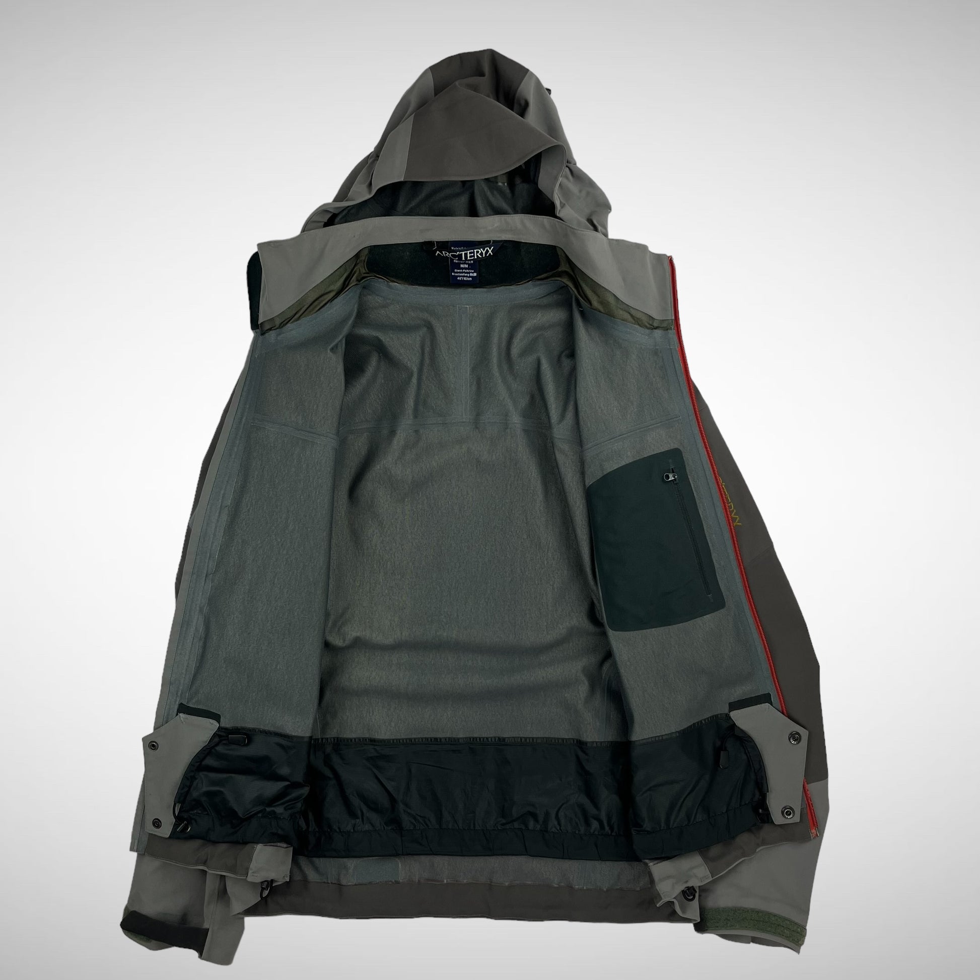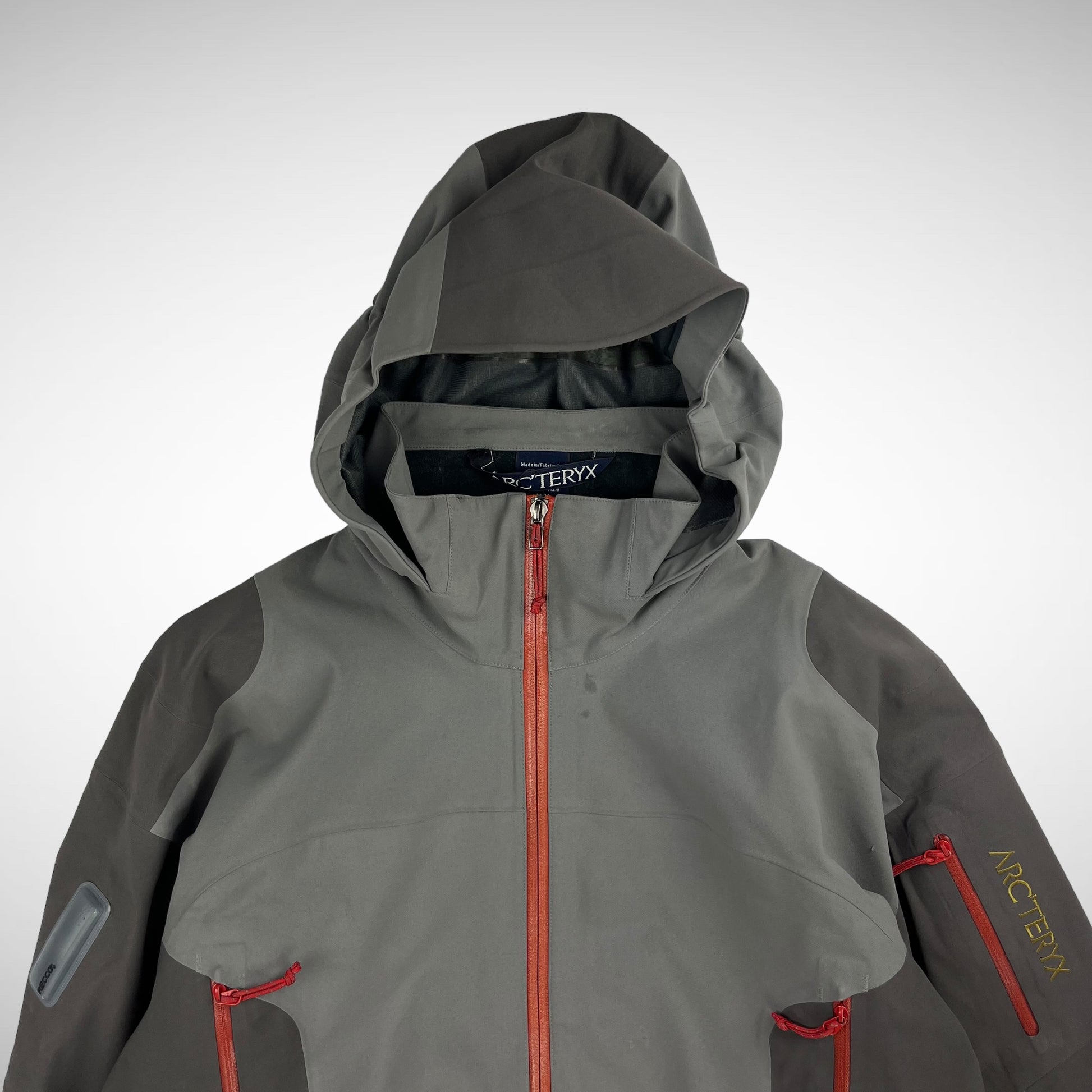 Waterproof GTX panelled jacket in ‘Gunmetal’ colour-way being two tones of grey with orange waterproof zip-pockets on lower body, upper arm and arm-pit vents, yellow embroidery branding on left arm (Arc’Teryx and GTX script) and lower back logo, RECCO system included.