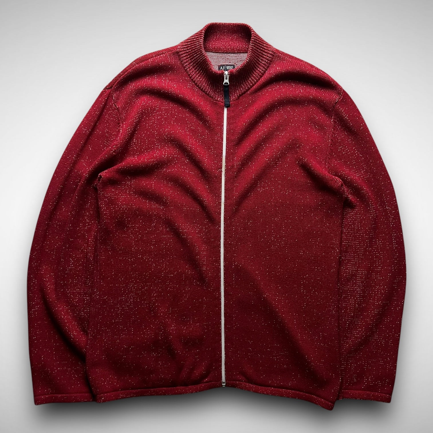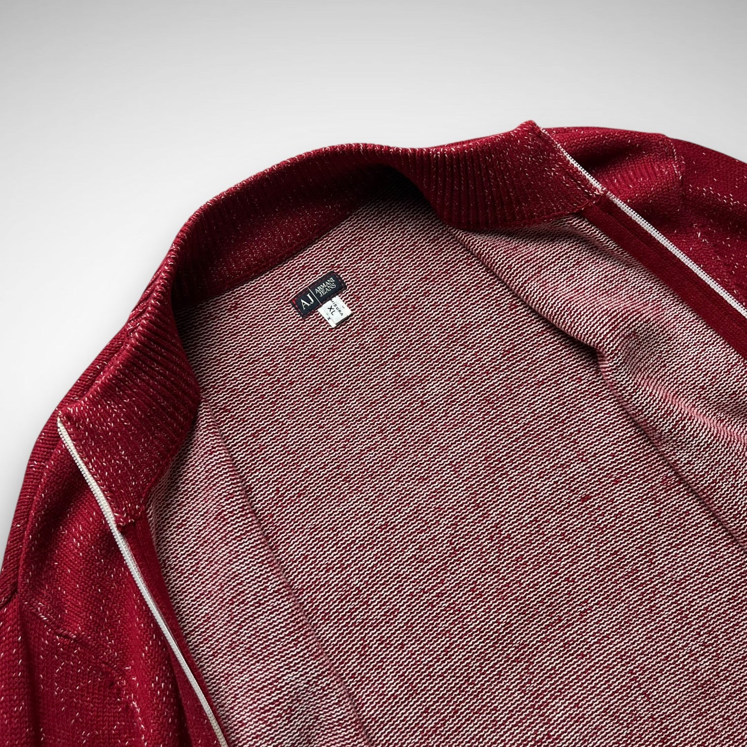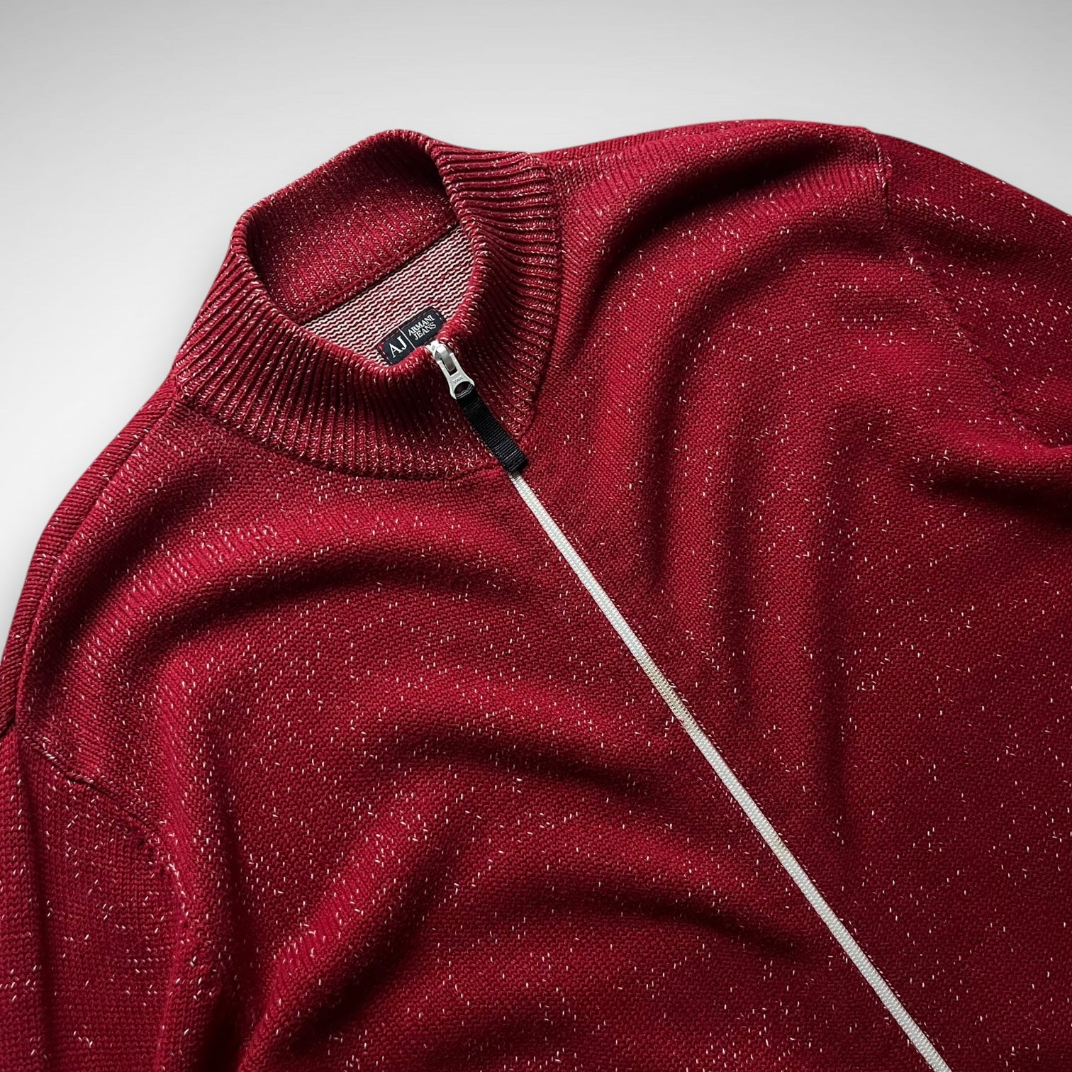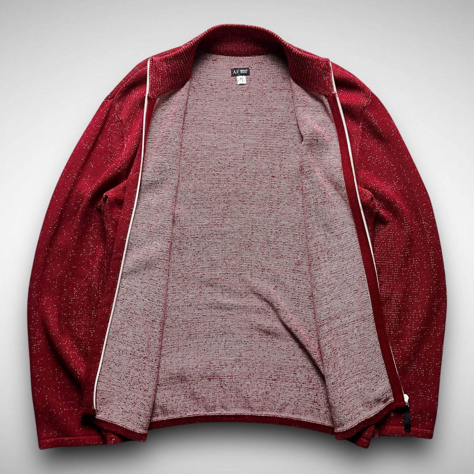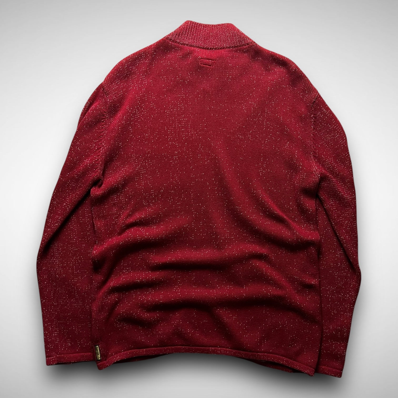 Gorgeous knit in dark red with white detailing throughout creating a digital camo pattern, white zip with branded pull and ribbed collar.