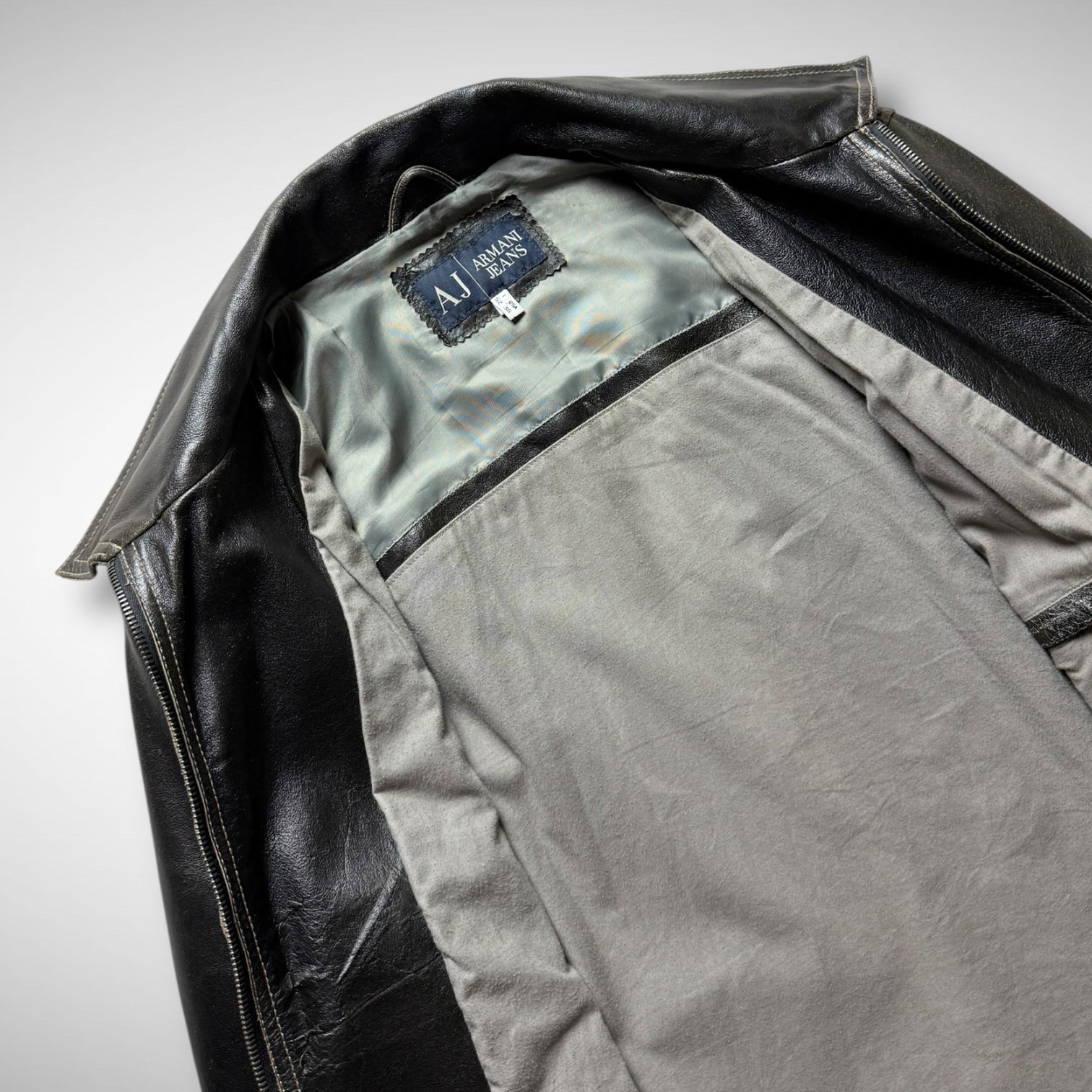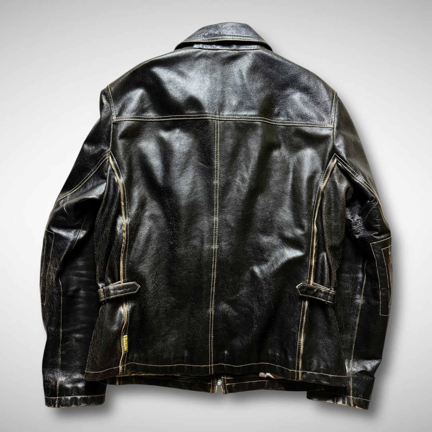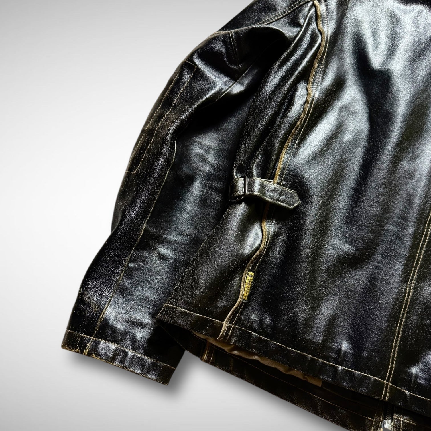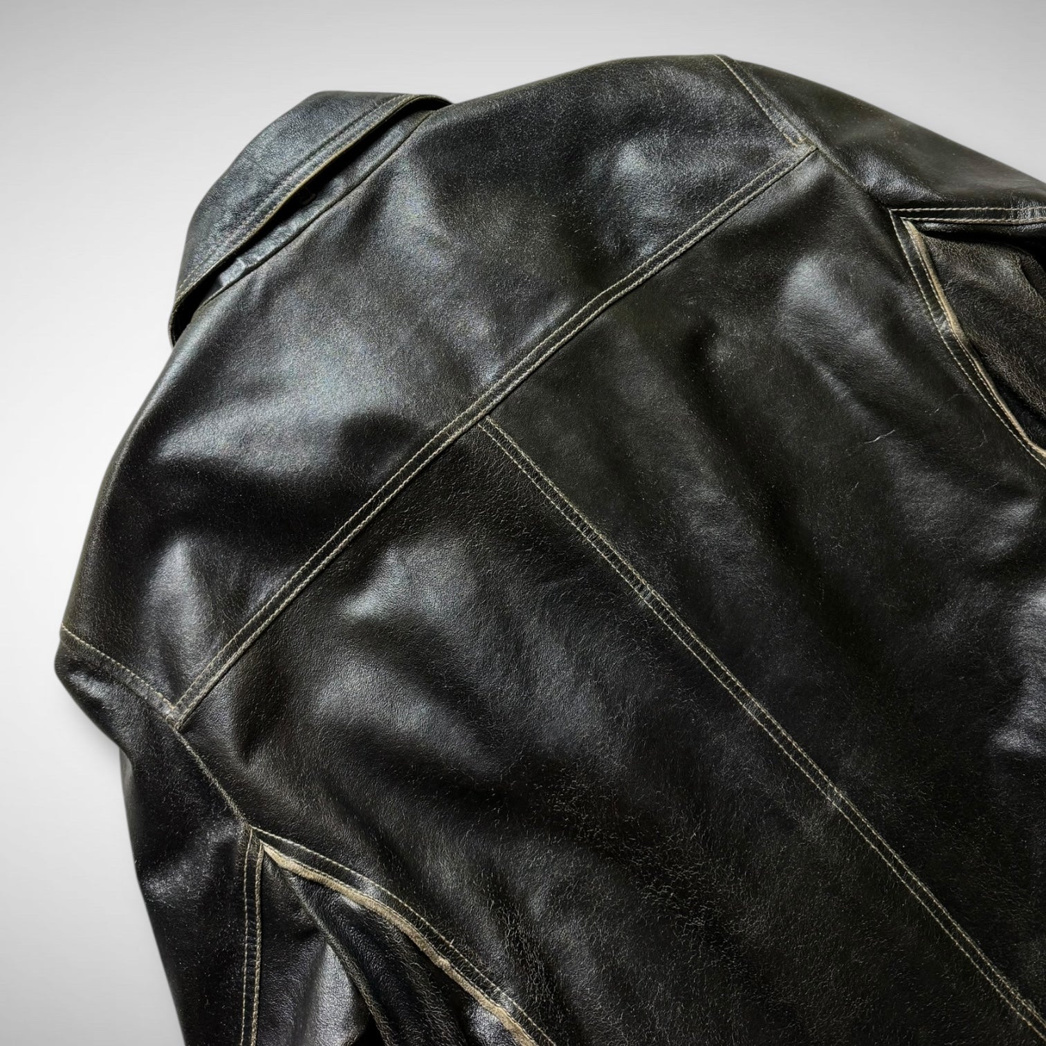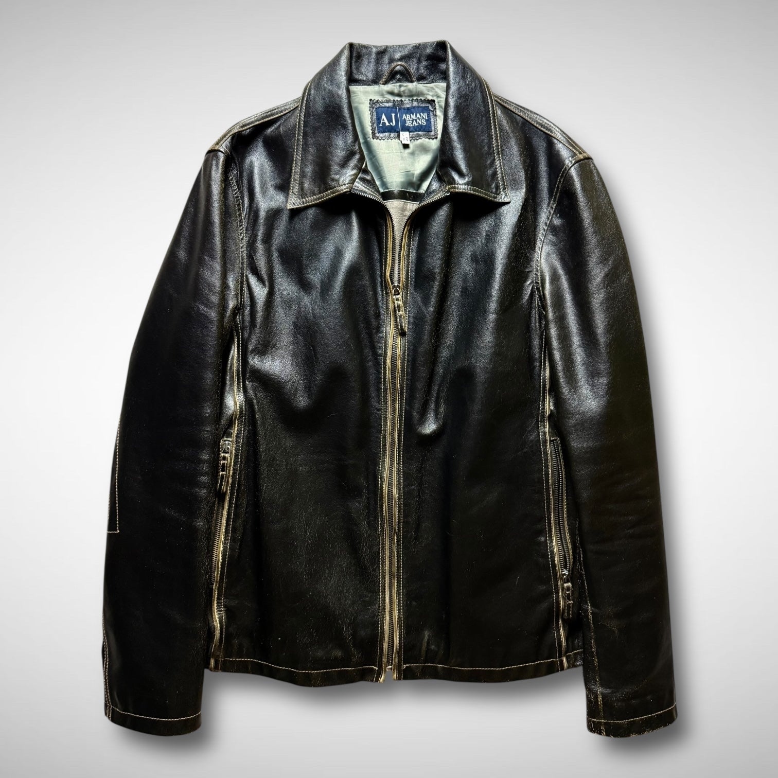 A classic black leather jacket with full zip closure, bold contrast stitching, and reinforced elbow panels. Features include dual vertical zip pockets, adjustable side straps, and a smooth fabric lining.