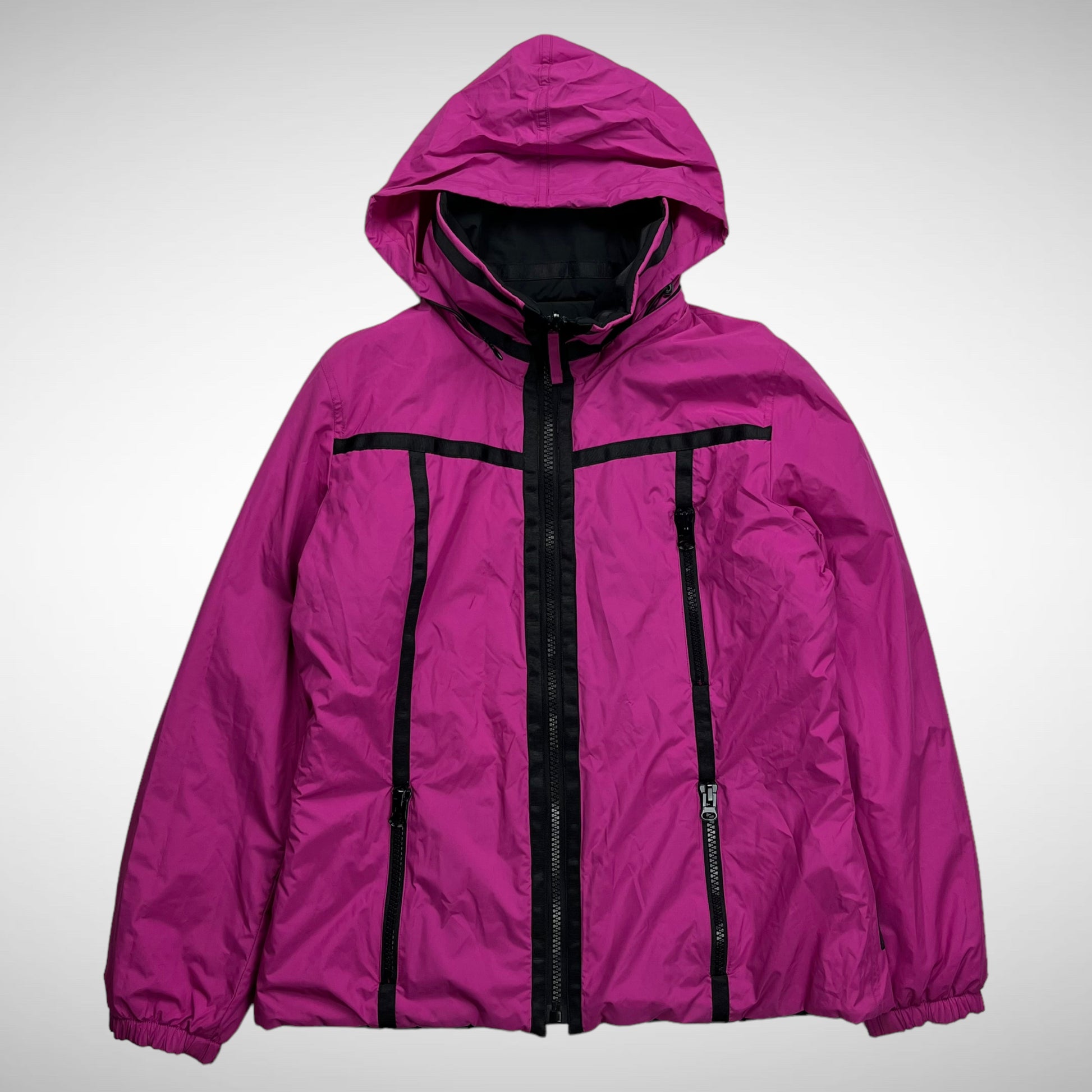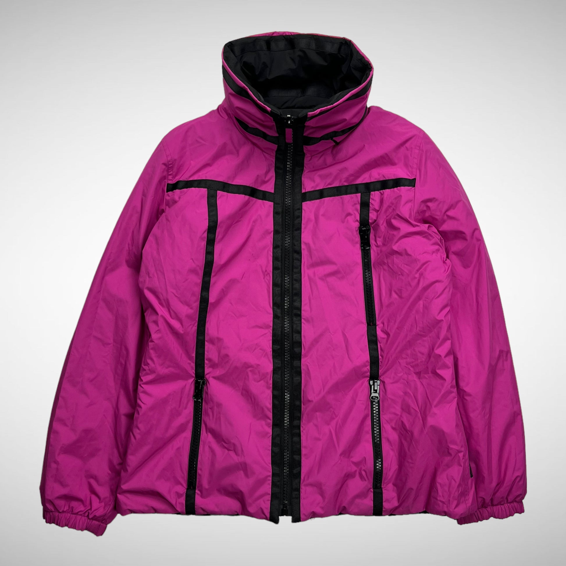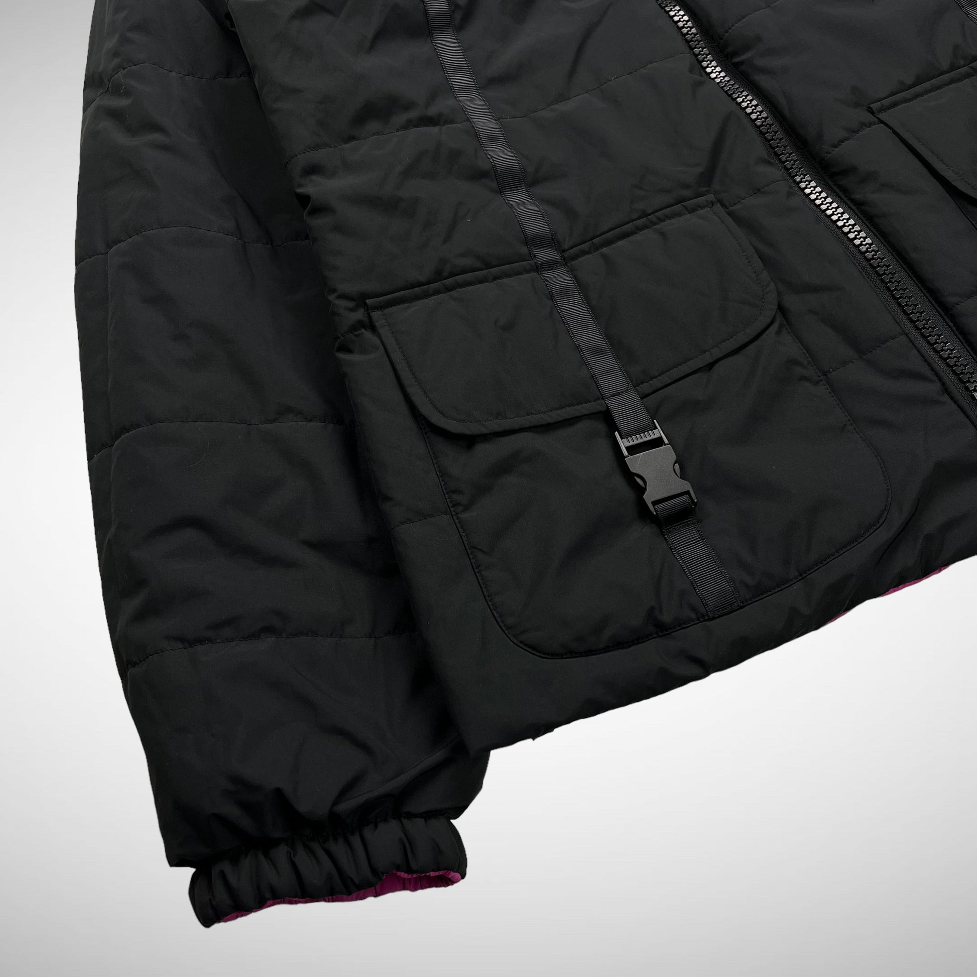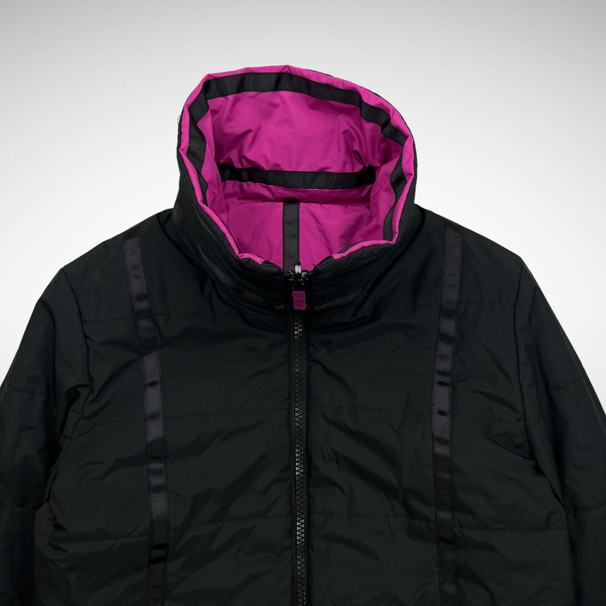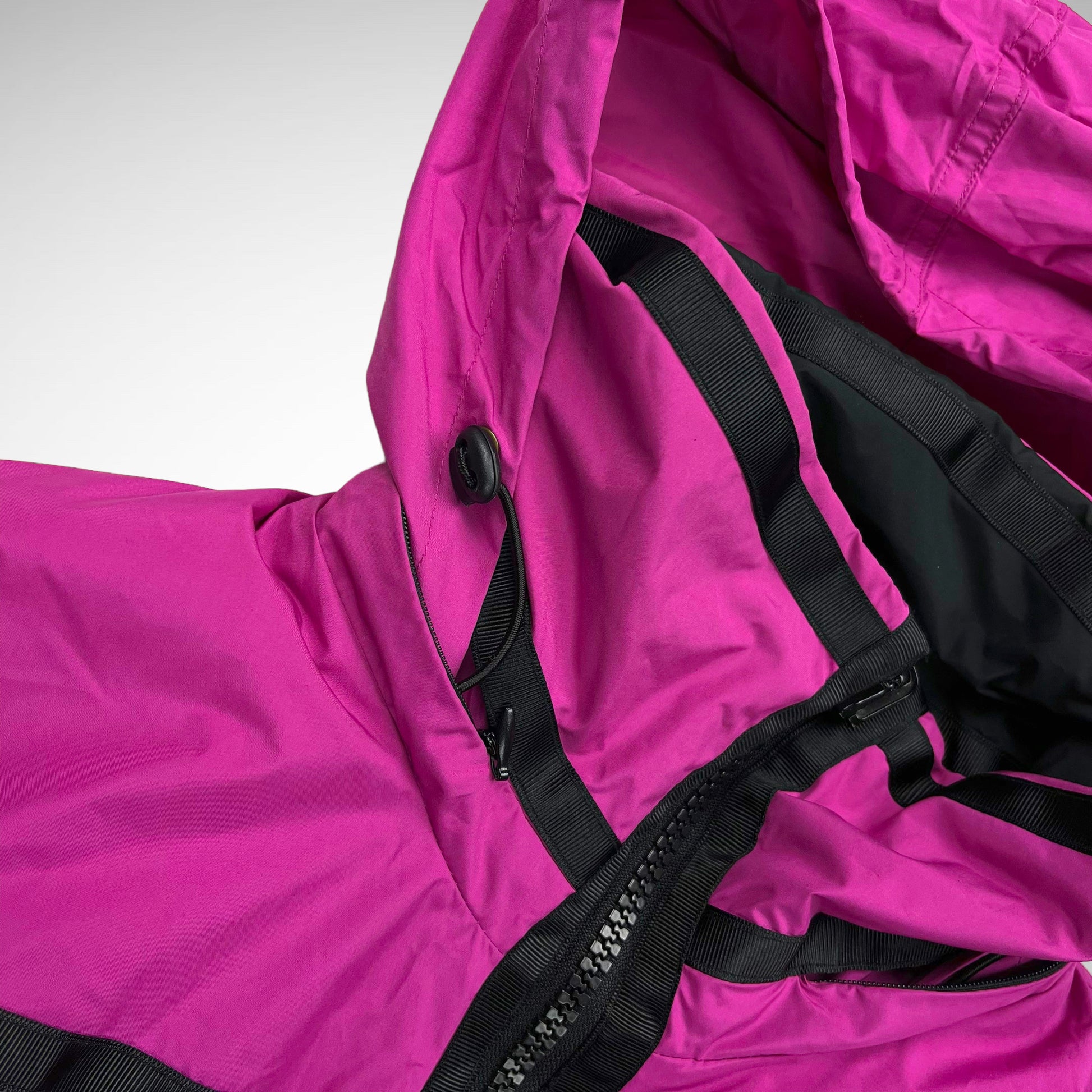 Reversible technical jacket in fuchsia and black featuring triple-vertical zip pockets on the fuchsia side, cotton woven strips and hidden-zip adjustable hood, belted pockets on the black side, and branded tags on both lower sides.