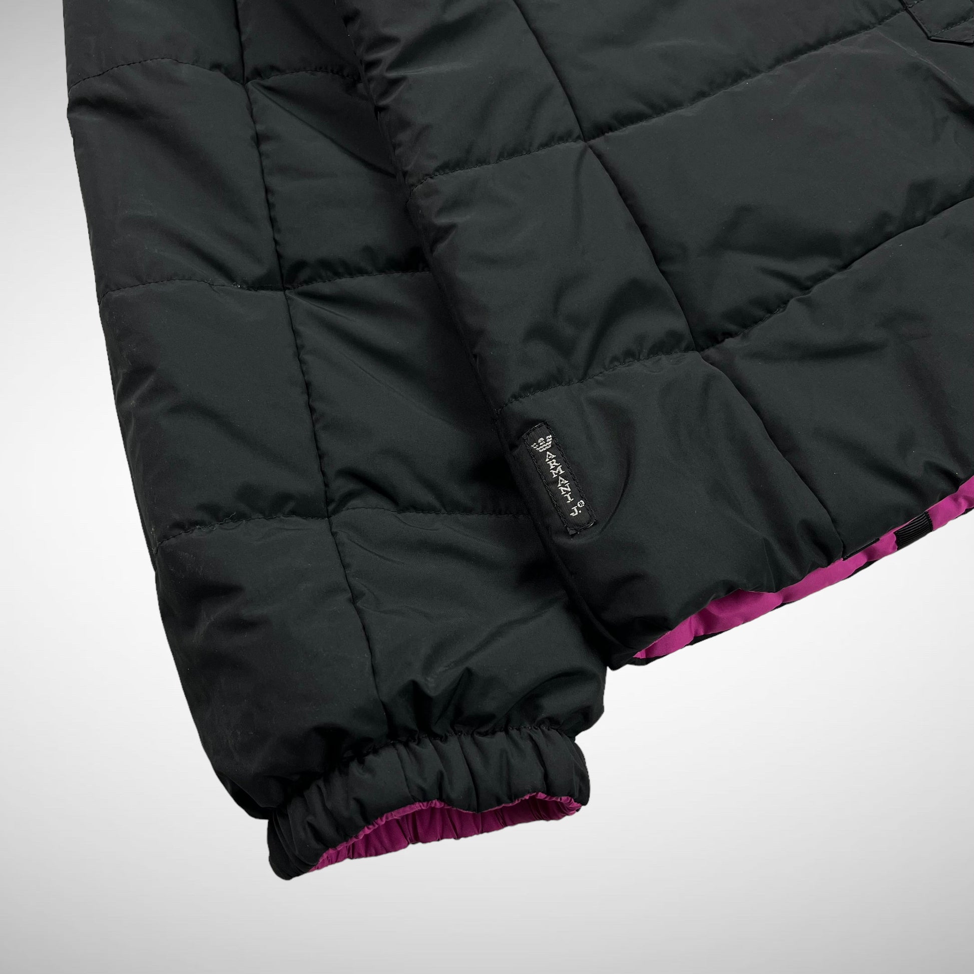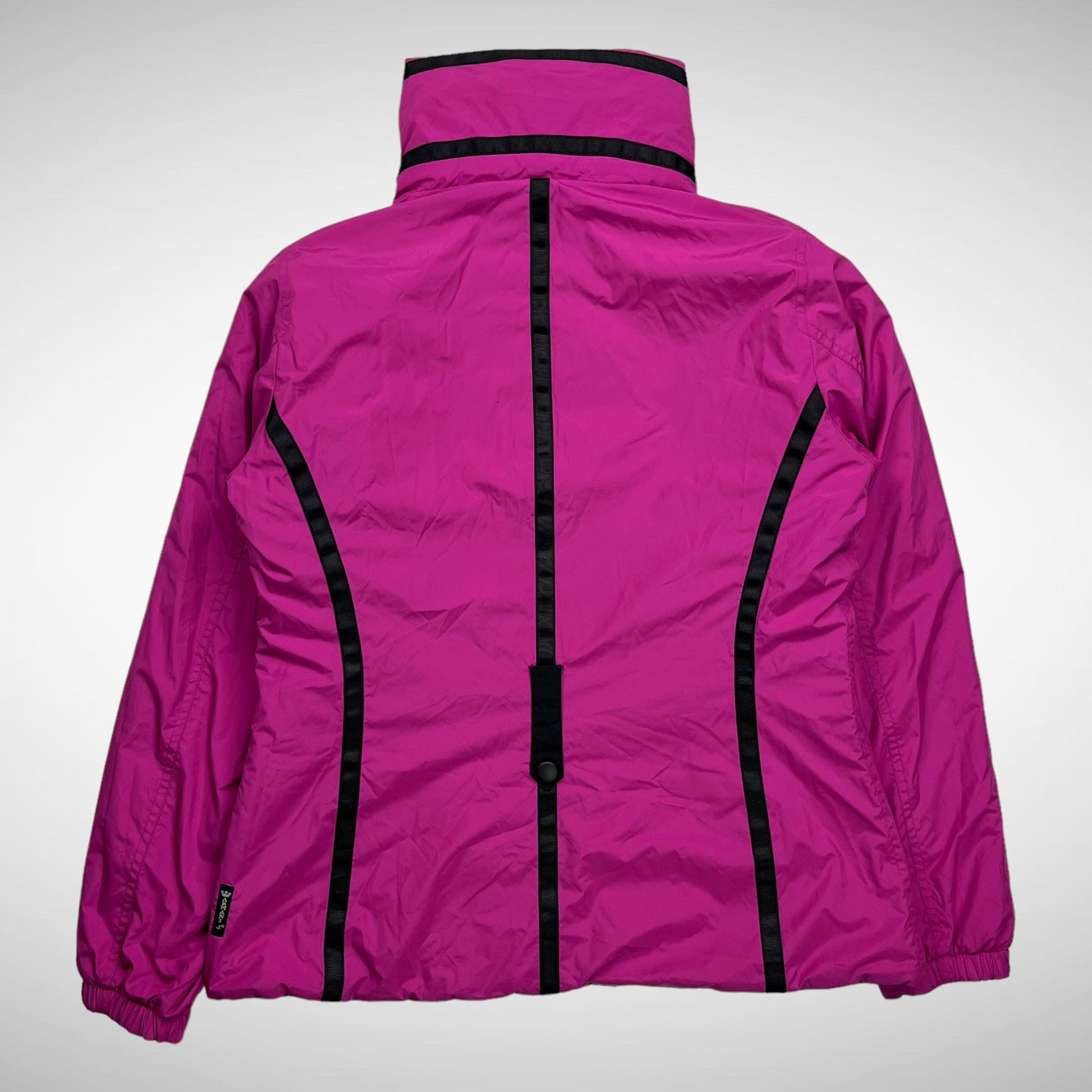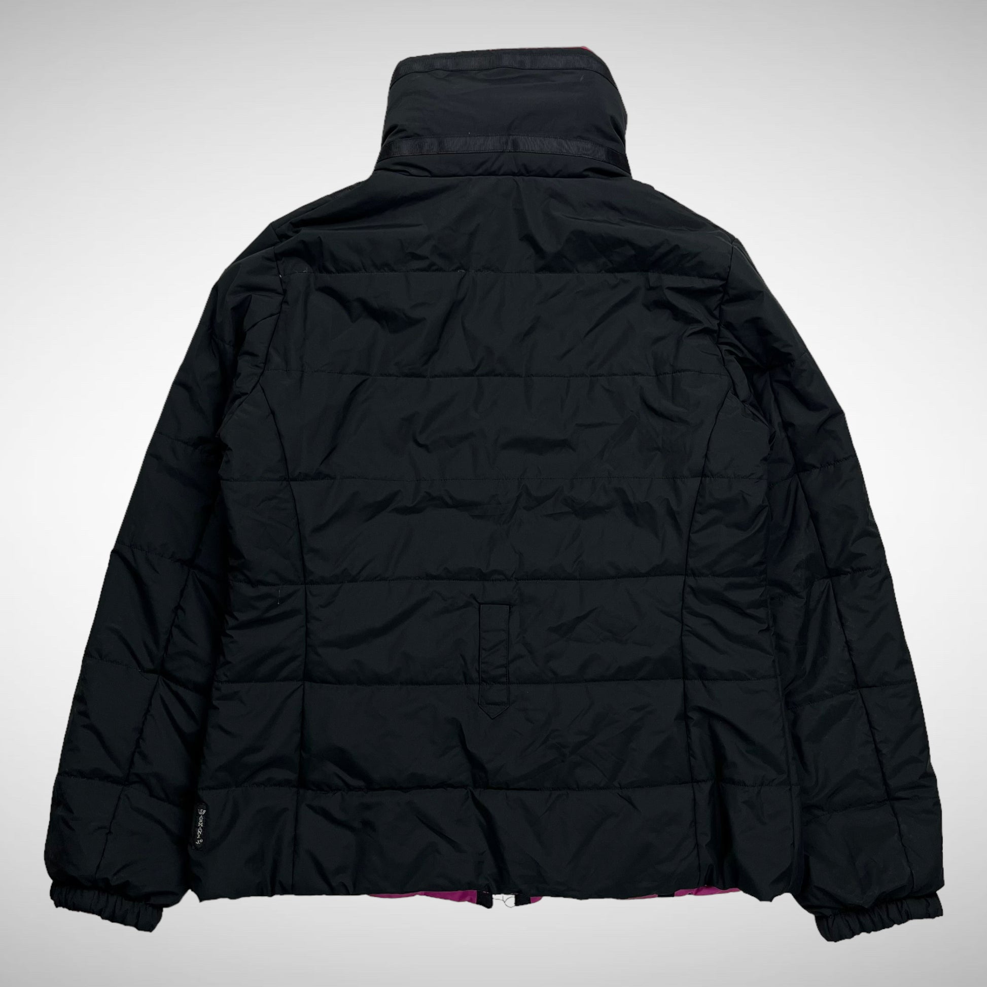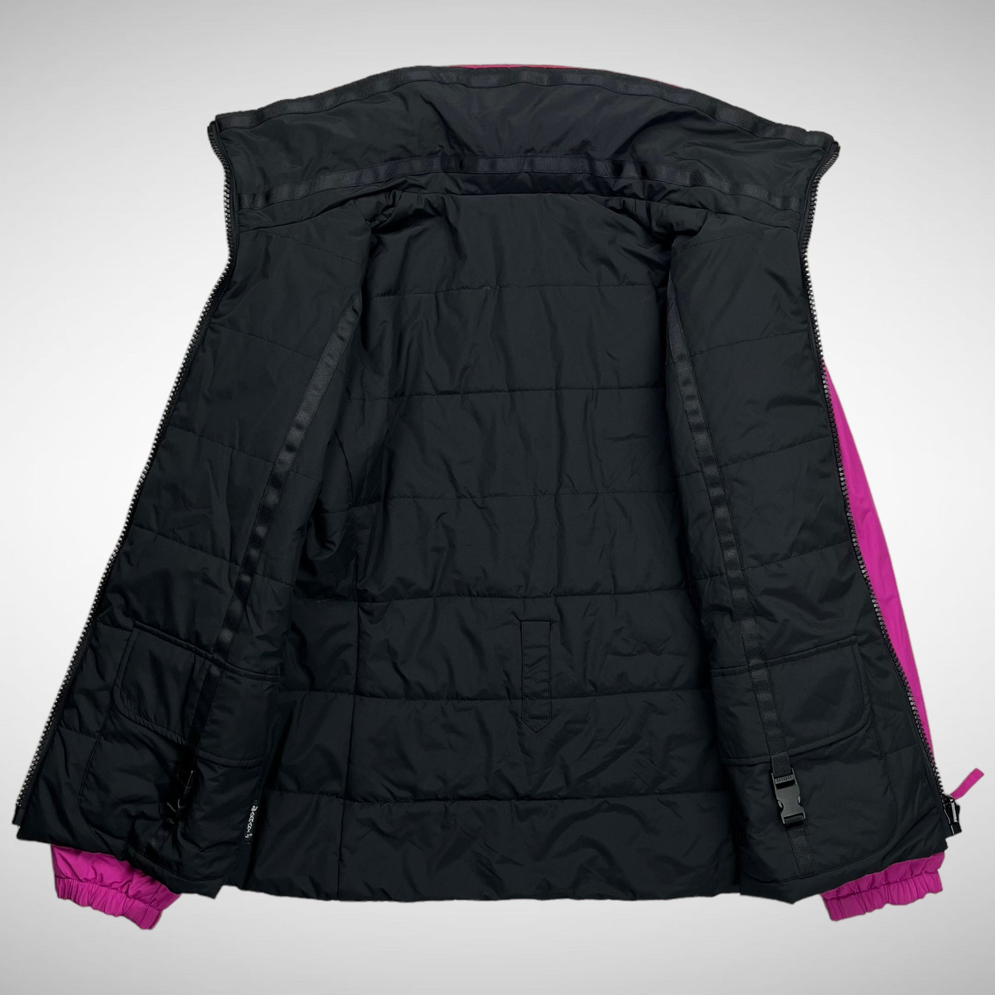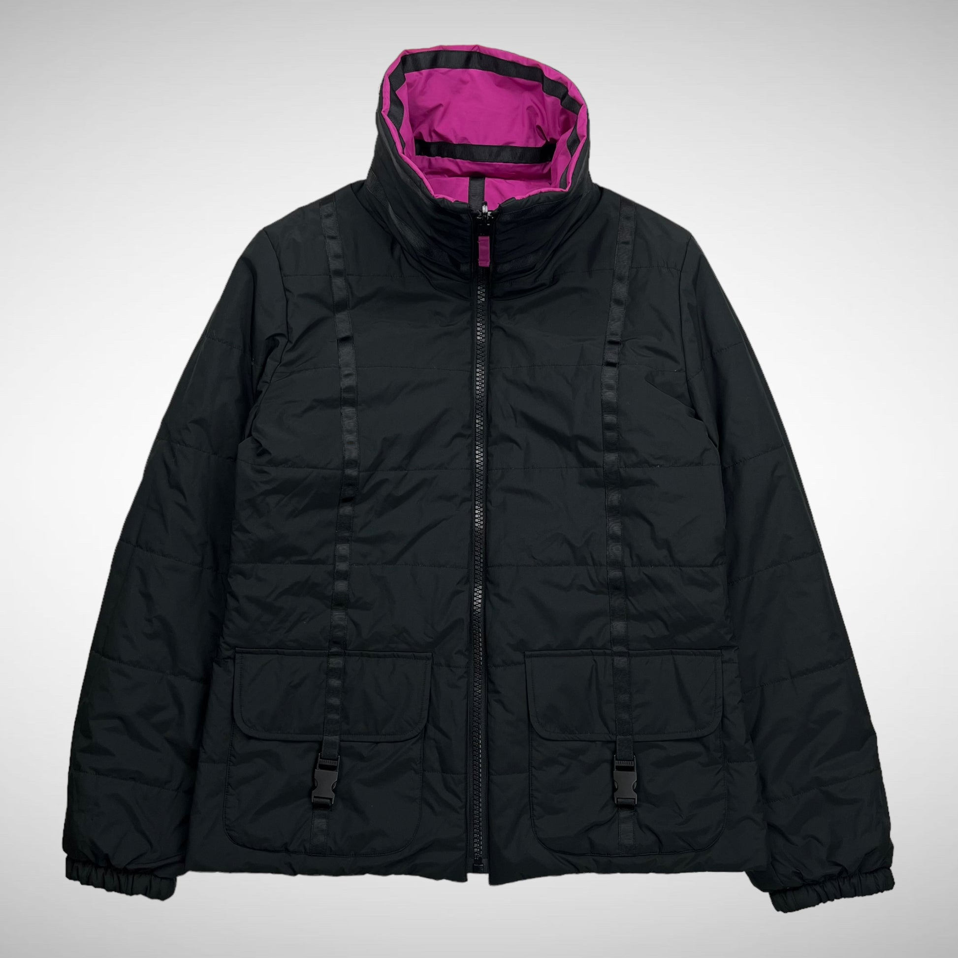 Reversible technical jacket in fuchsia and black featuring triple-vertical zip pockets on the fuchsia side, cotton woven strips and hidden-zip adjustable hood, belted pockets on the black side, and branded tags on both lower sides.