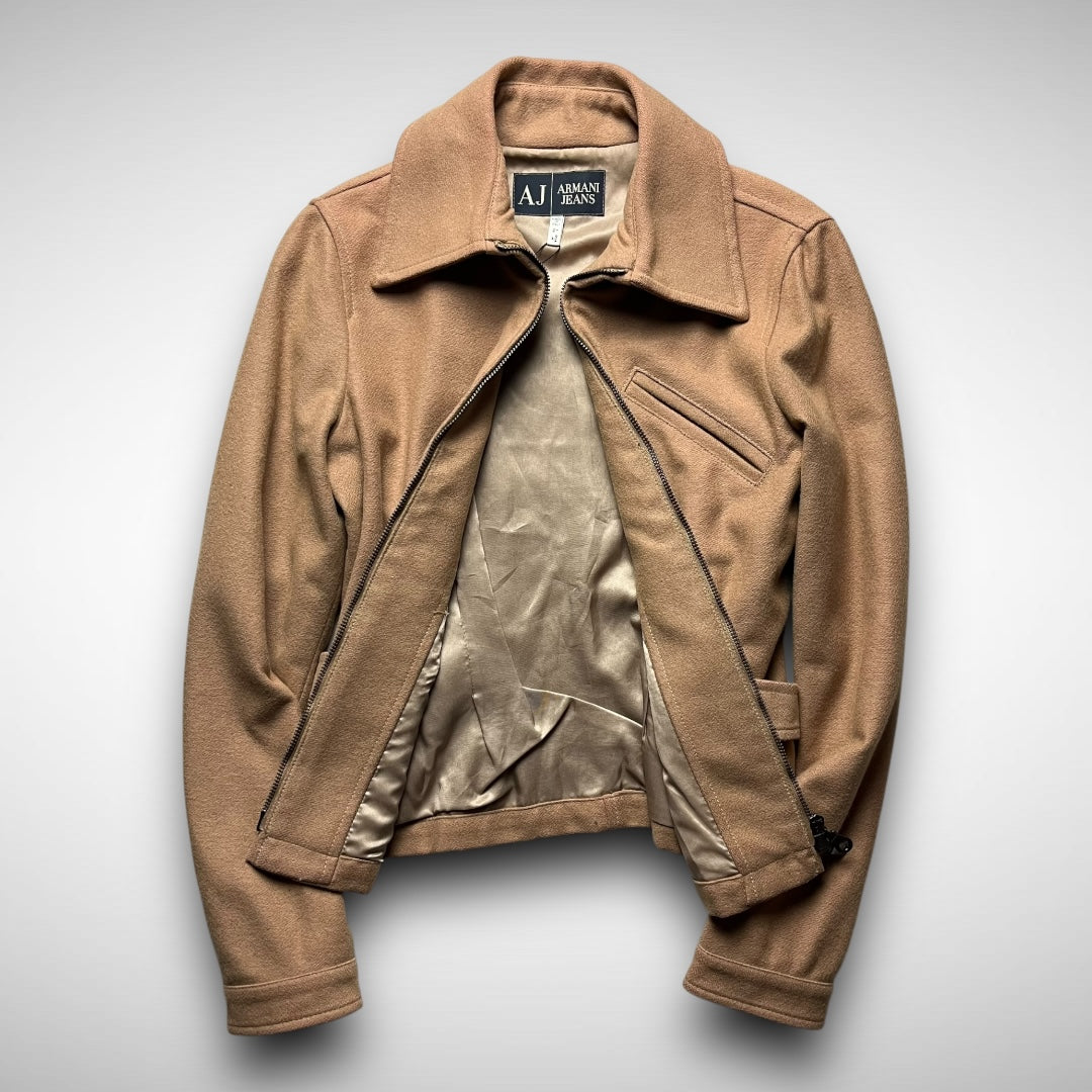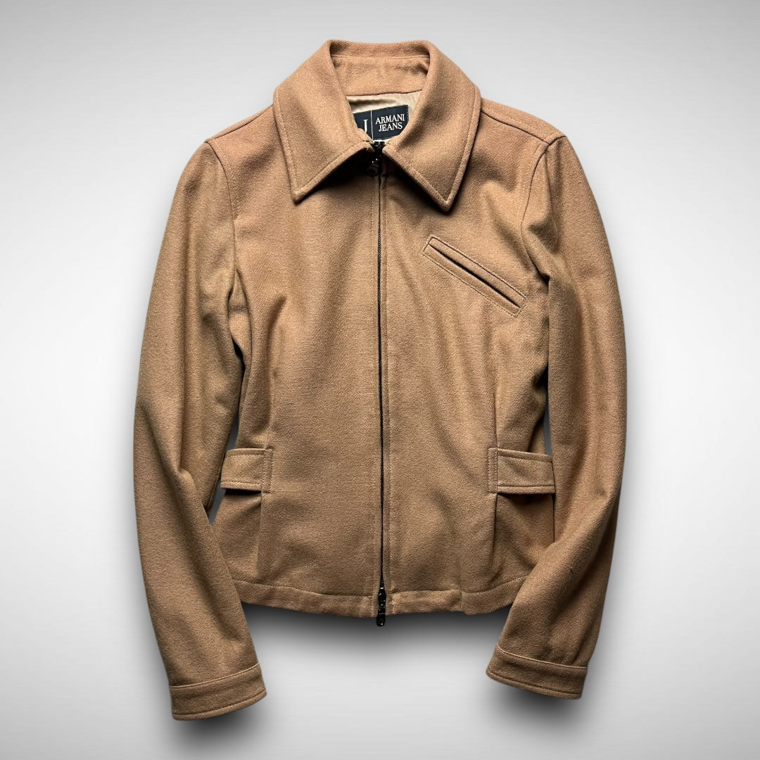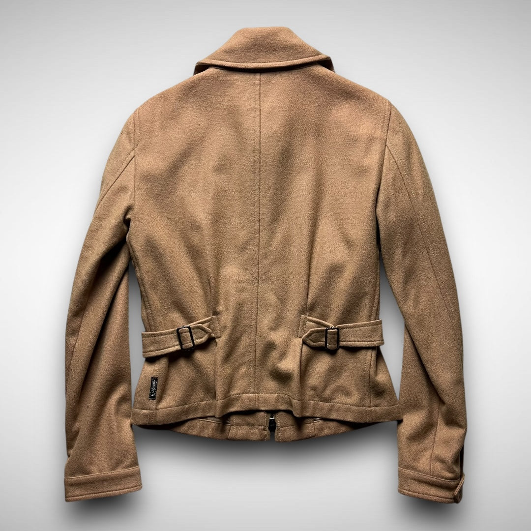 Made in Italy from high quality wool in pink/peach colour, fold down collar, Lampo zip-closure, angled chest zip pocket, adjustable belts on the sides and branded tag on the lower left-back.