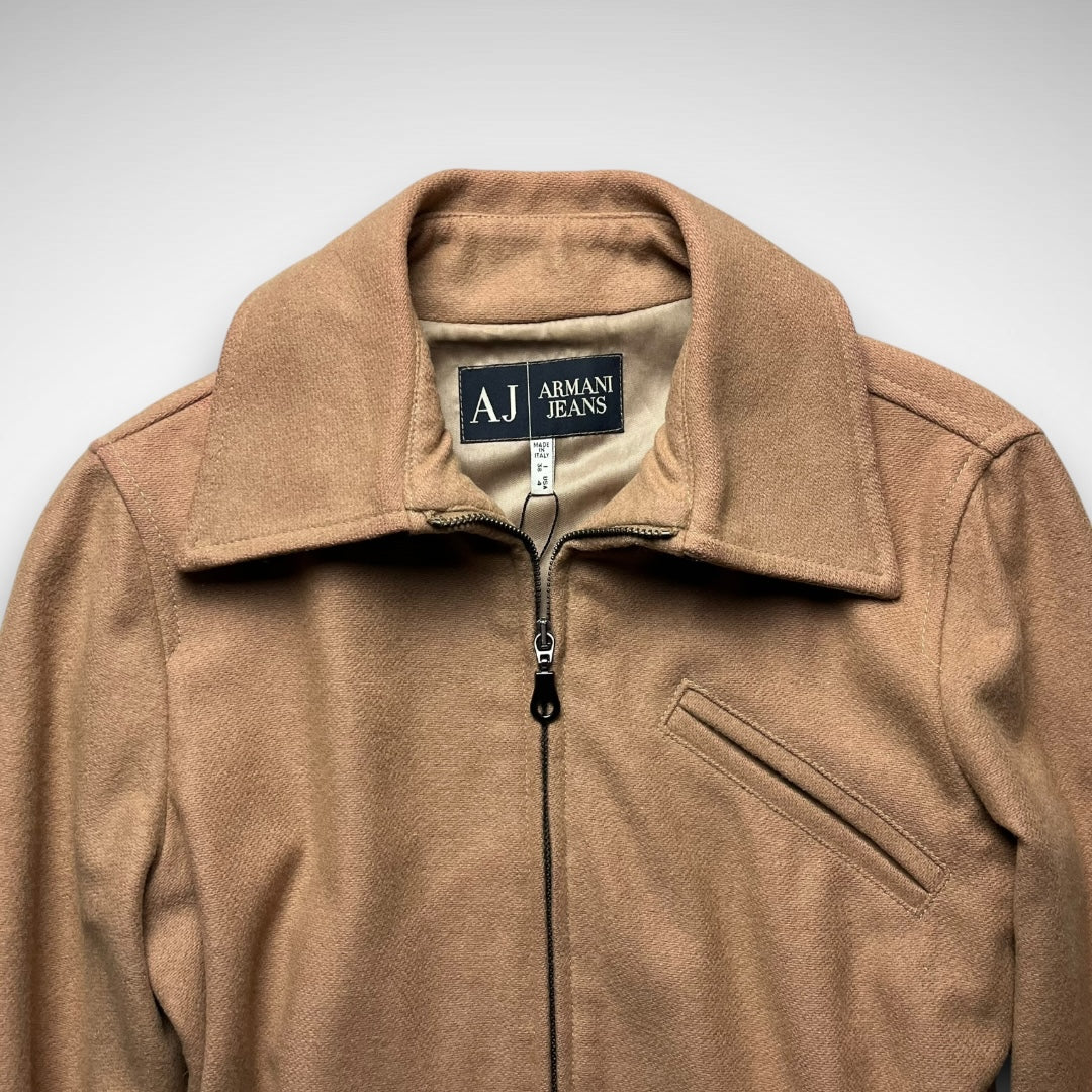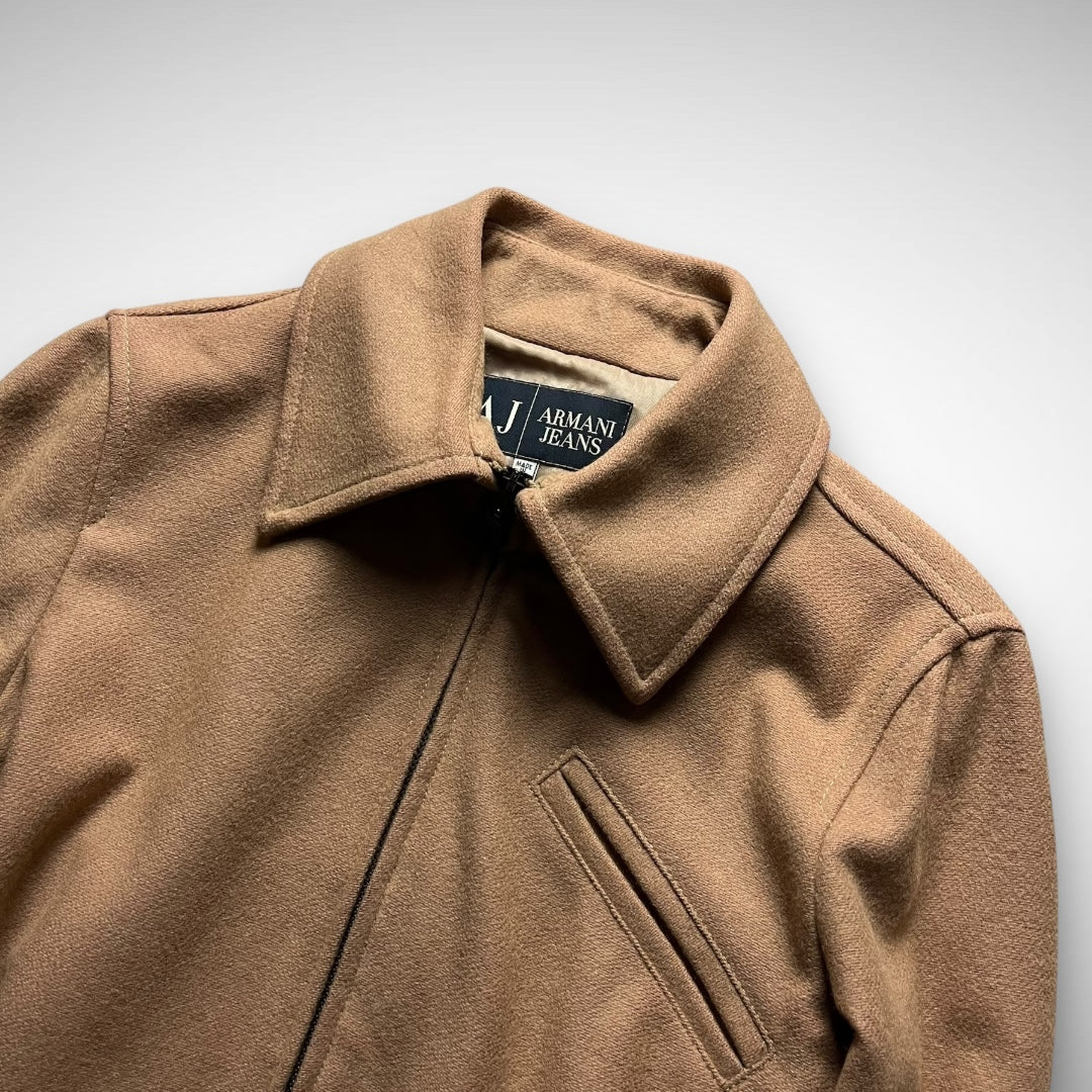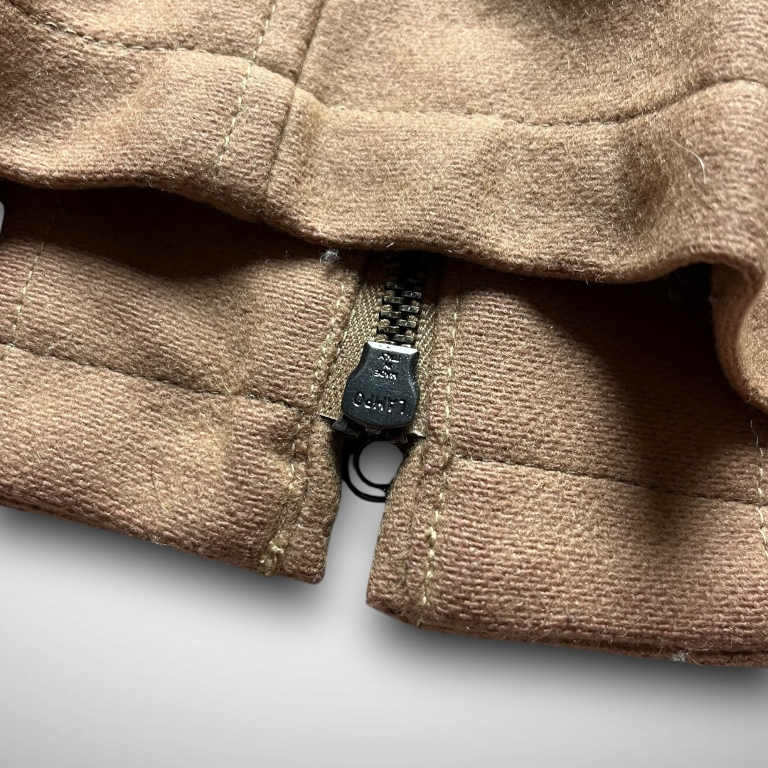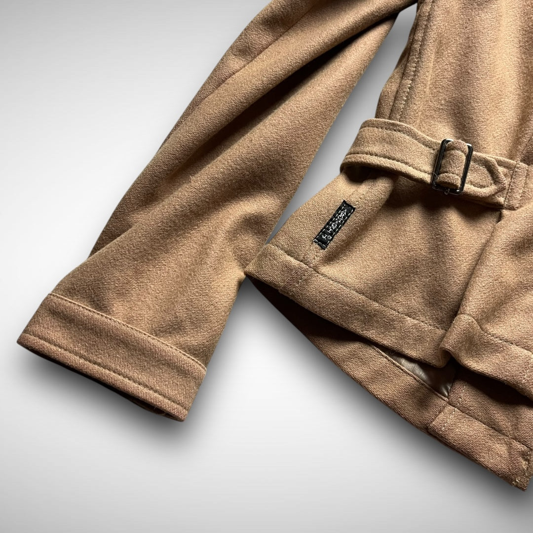 Made in Italy from high quality wool in pink/peach colour, fold down collar, Lampo zip-closure, angled chest zip pocket, adjustable belts on the sides and branded tag on the lower left-back.