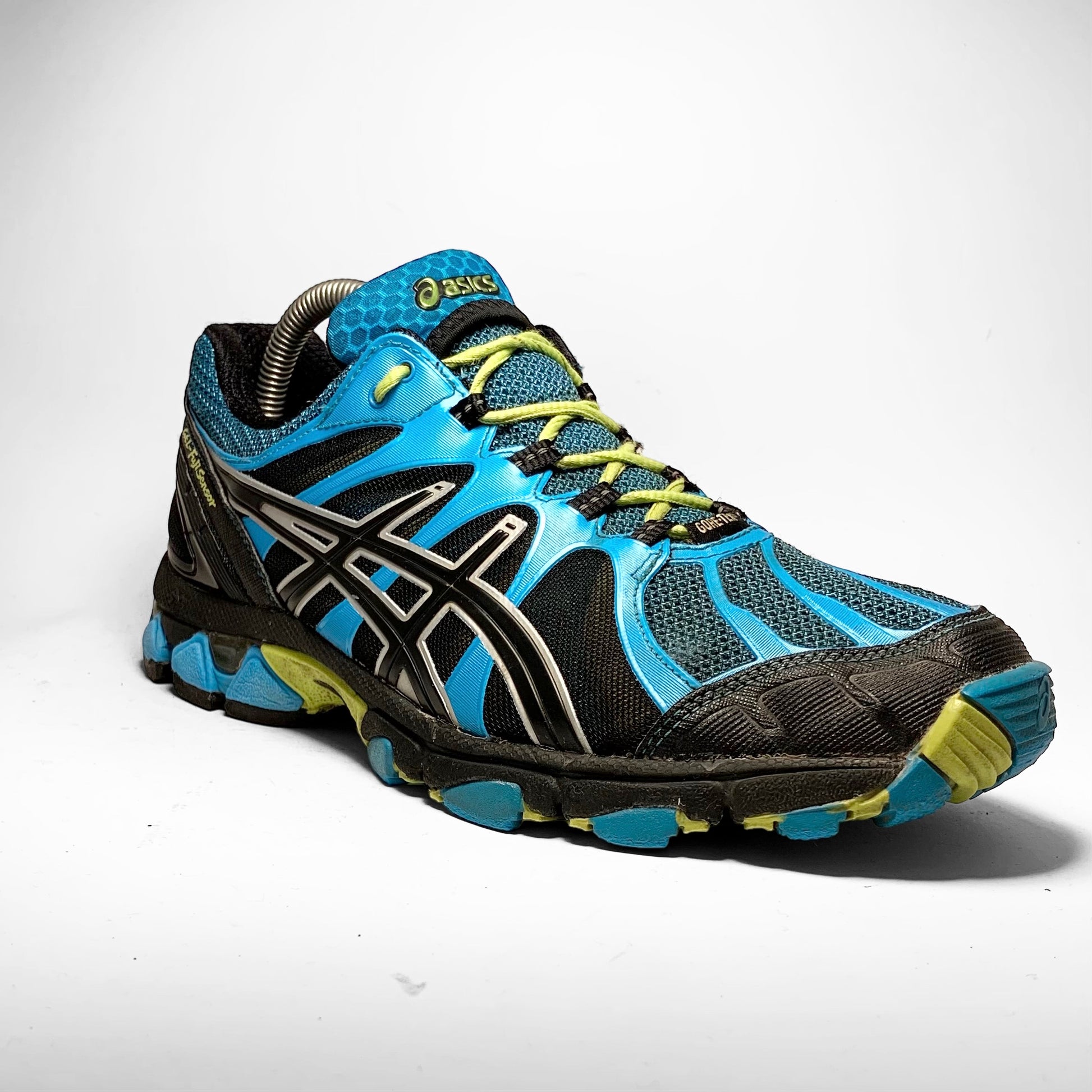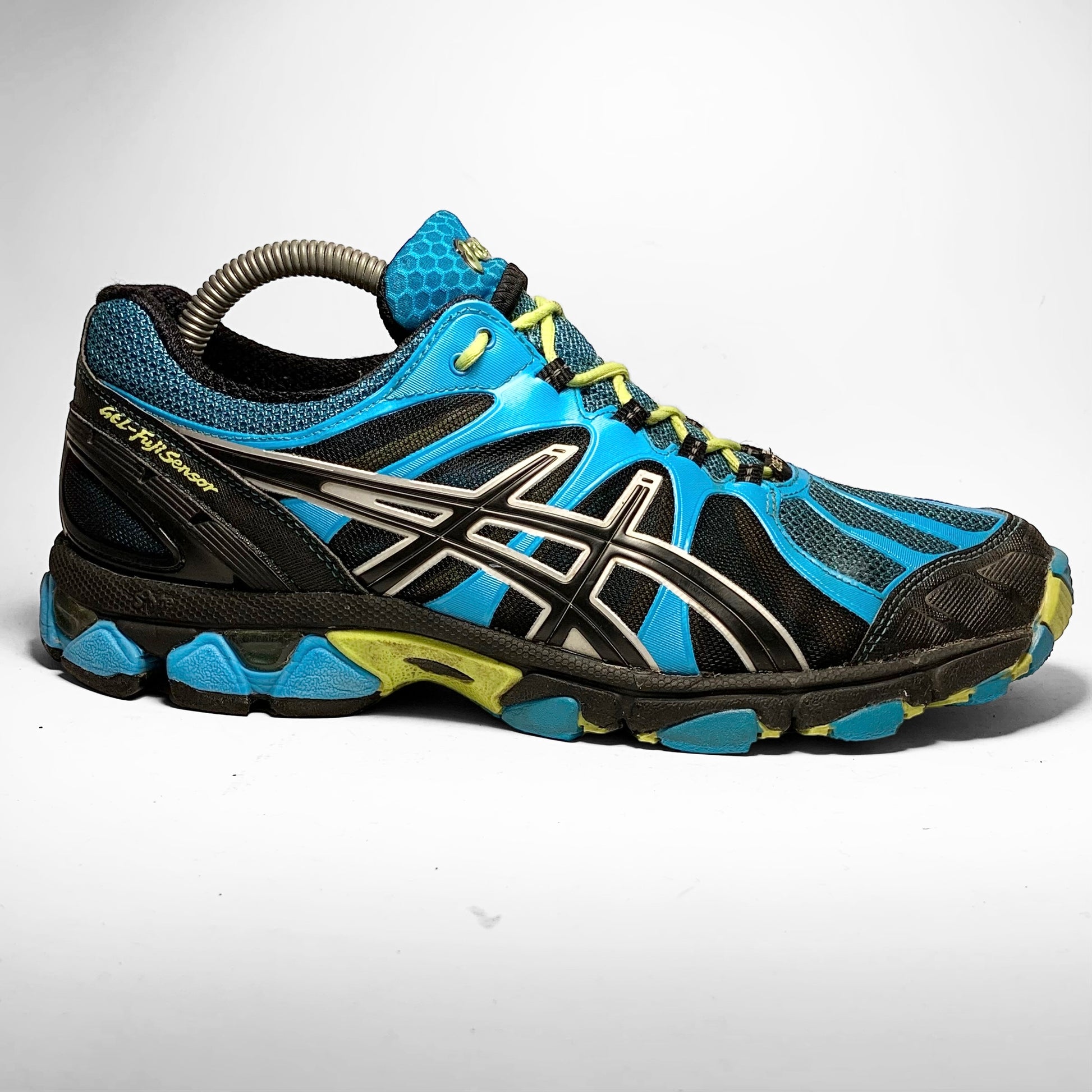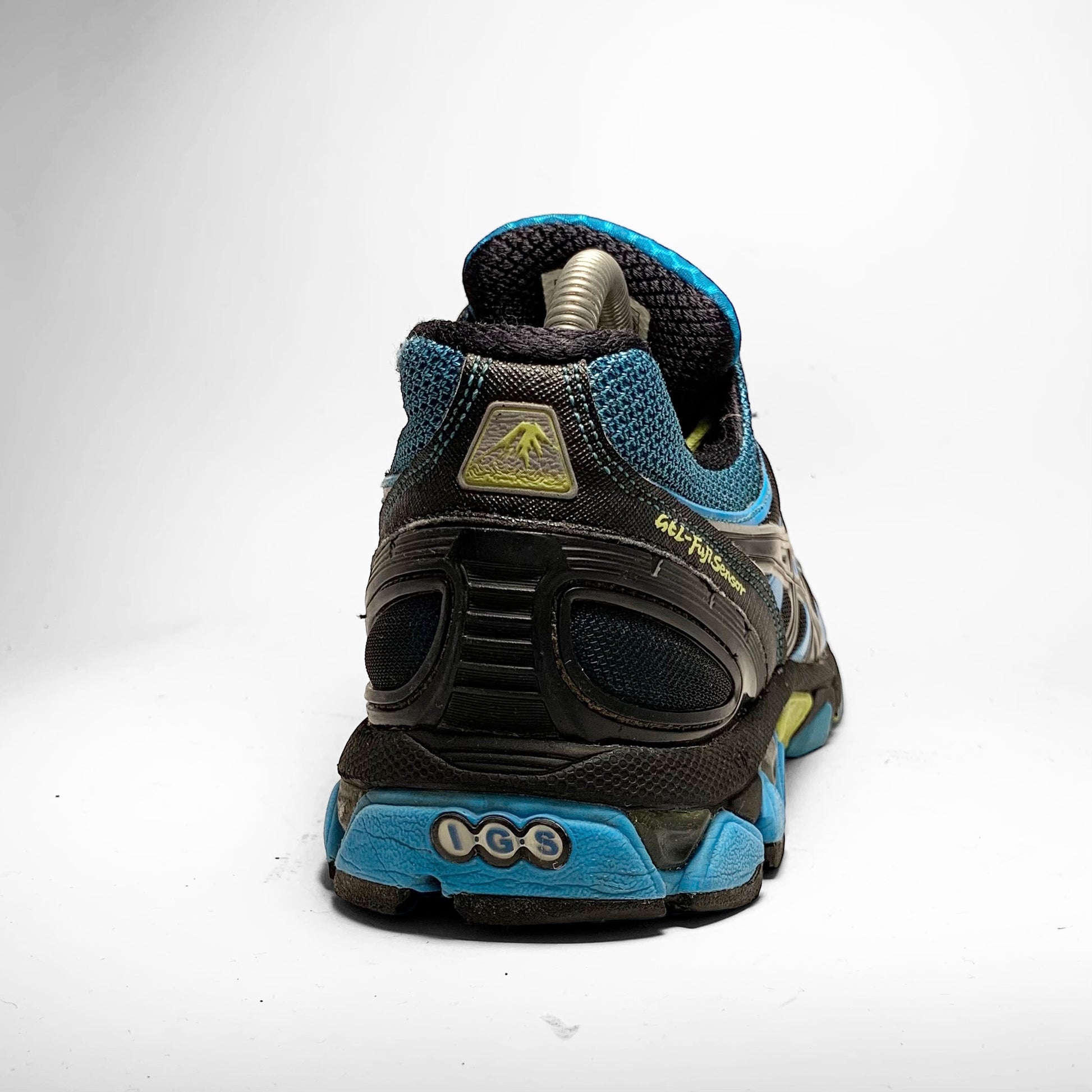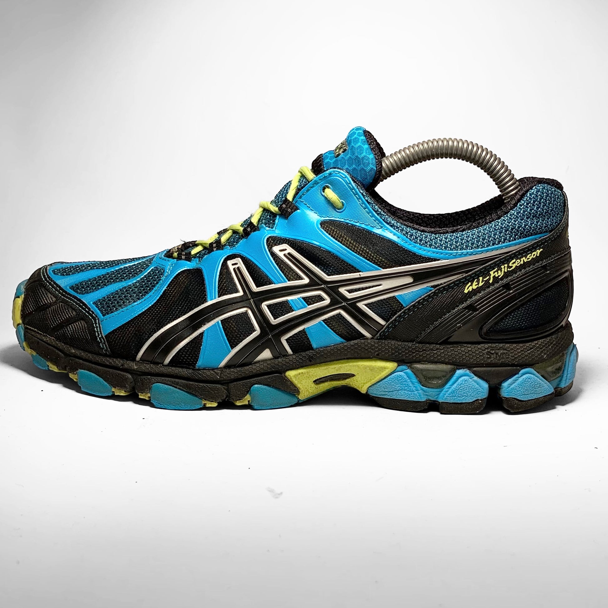 Unique design featuring double layered mesh with rubber detailed metallic blue veins throughout, silver outlined ASICS logo and bright green hints such as laces, logo on tongue, trail outsole, Gel-Fuji Sensor script and Mt. Fuji on the back heelpart.