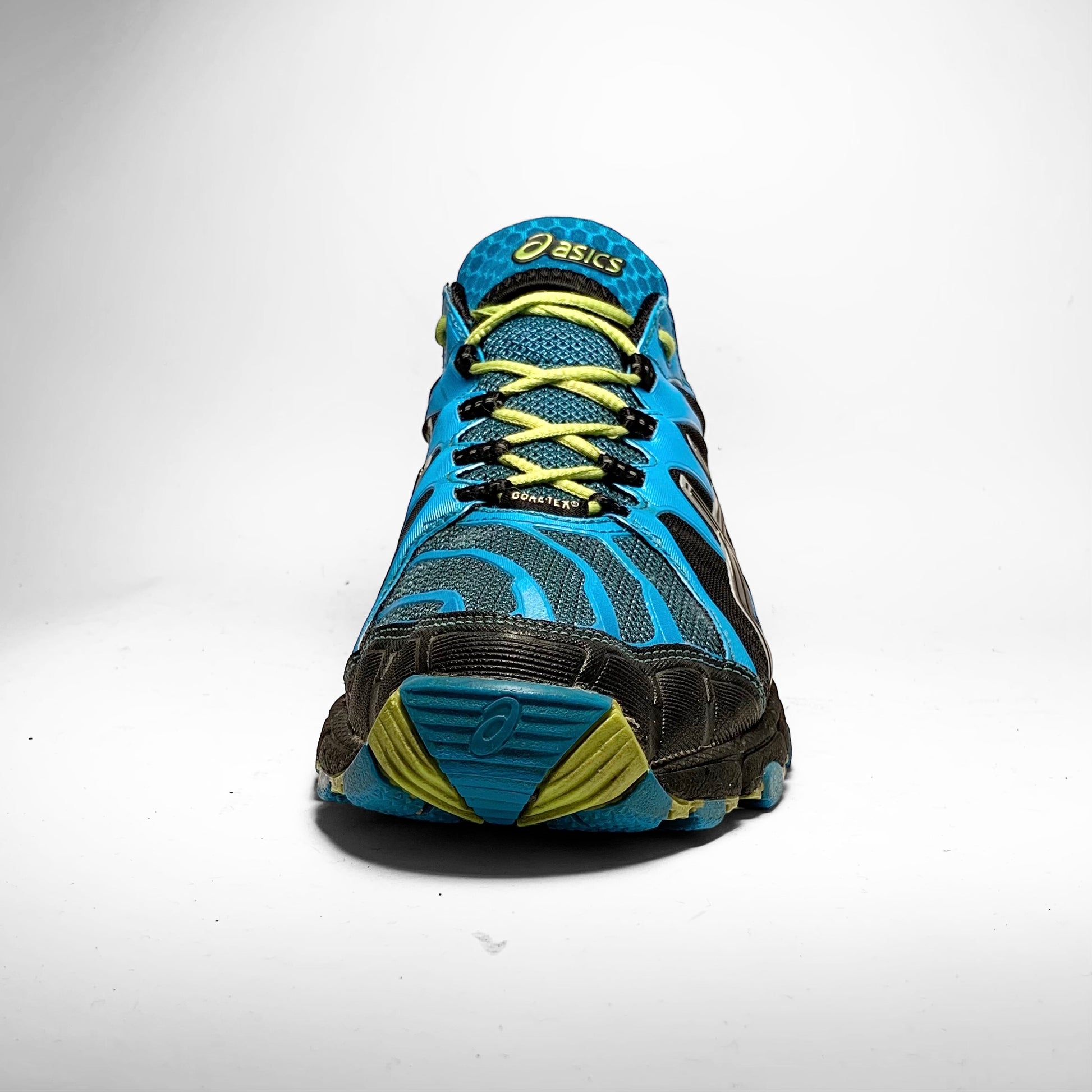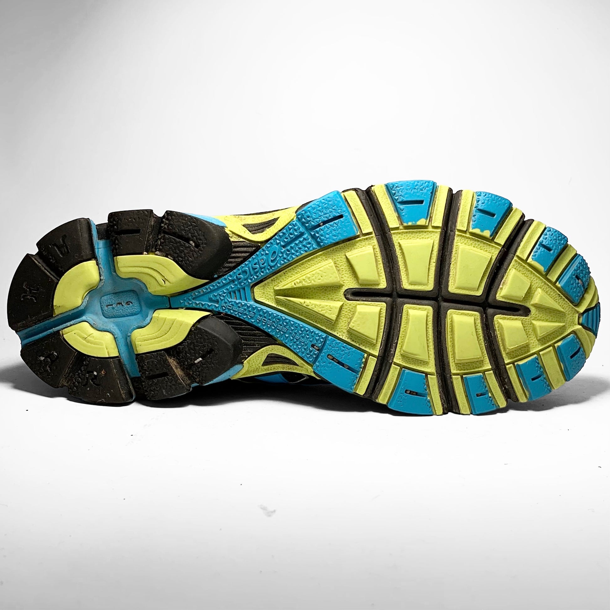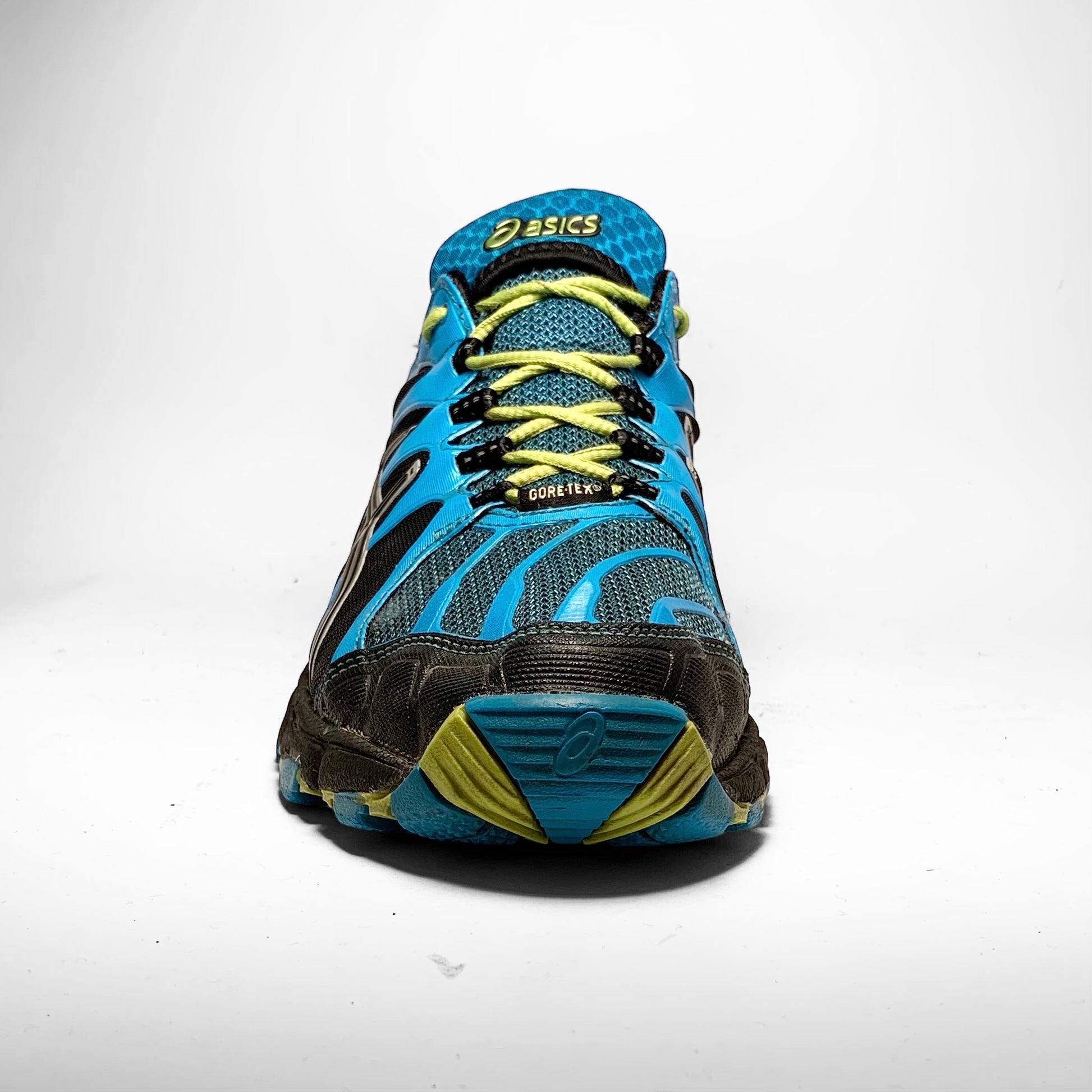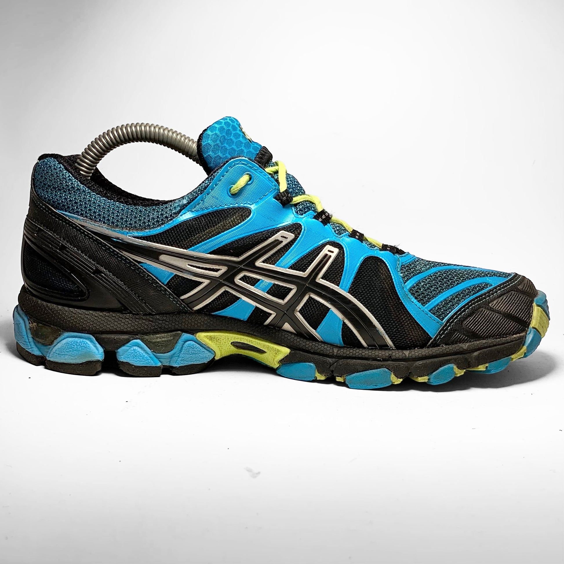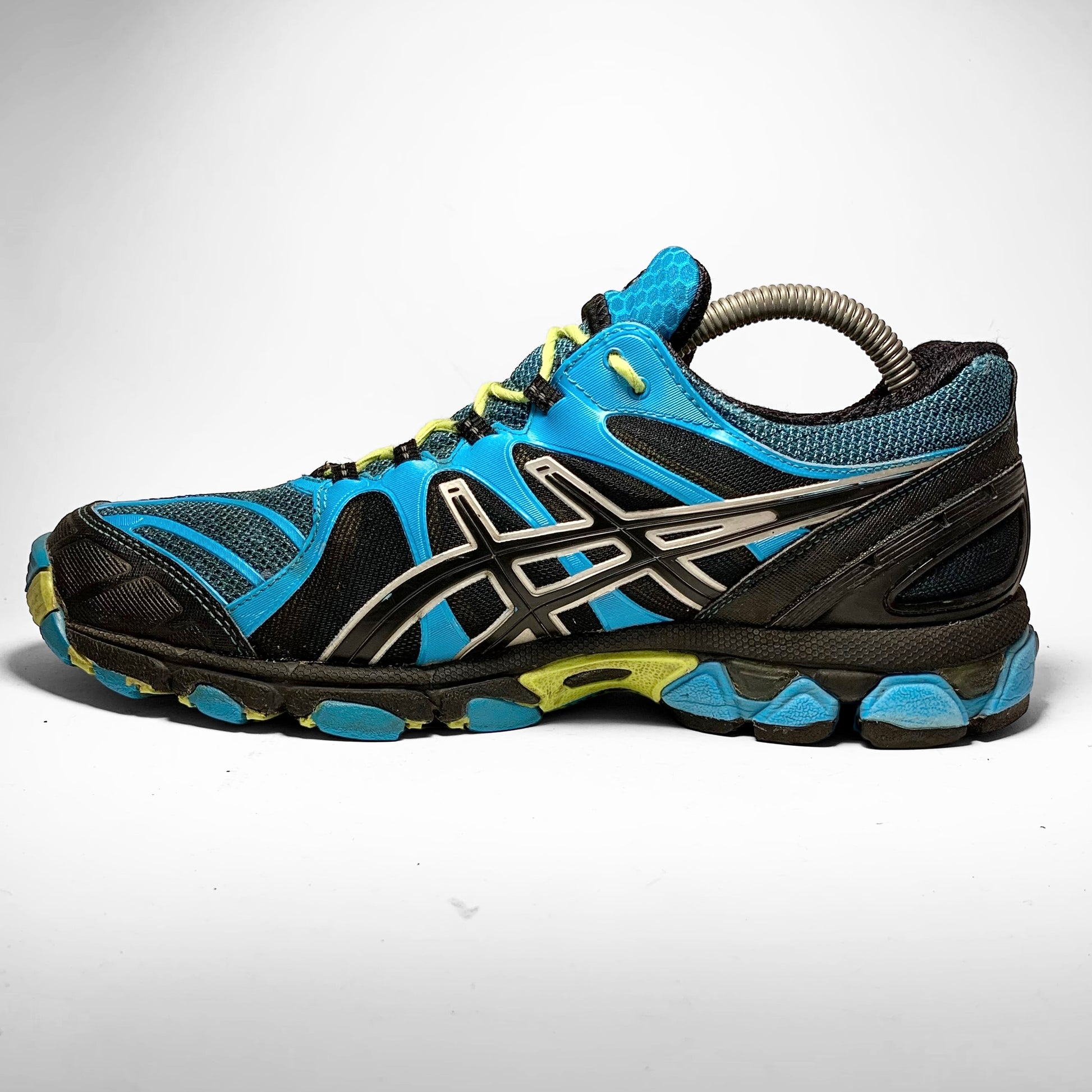 Unique design featuring double layered mesh with rubber detailed metallic blue veins throughout, silver outlined ASICS logo and bright green hints such as laces, logo on tongue, trail outsole, Gel-Fuji Sensor script and Mt. Fuji on the back heelpart.