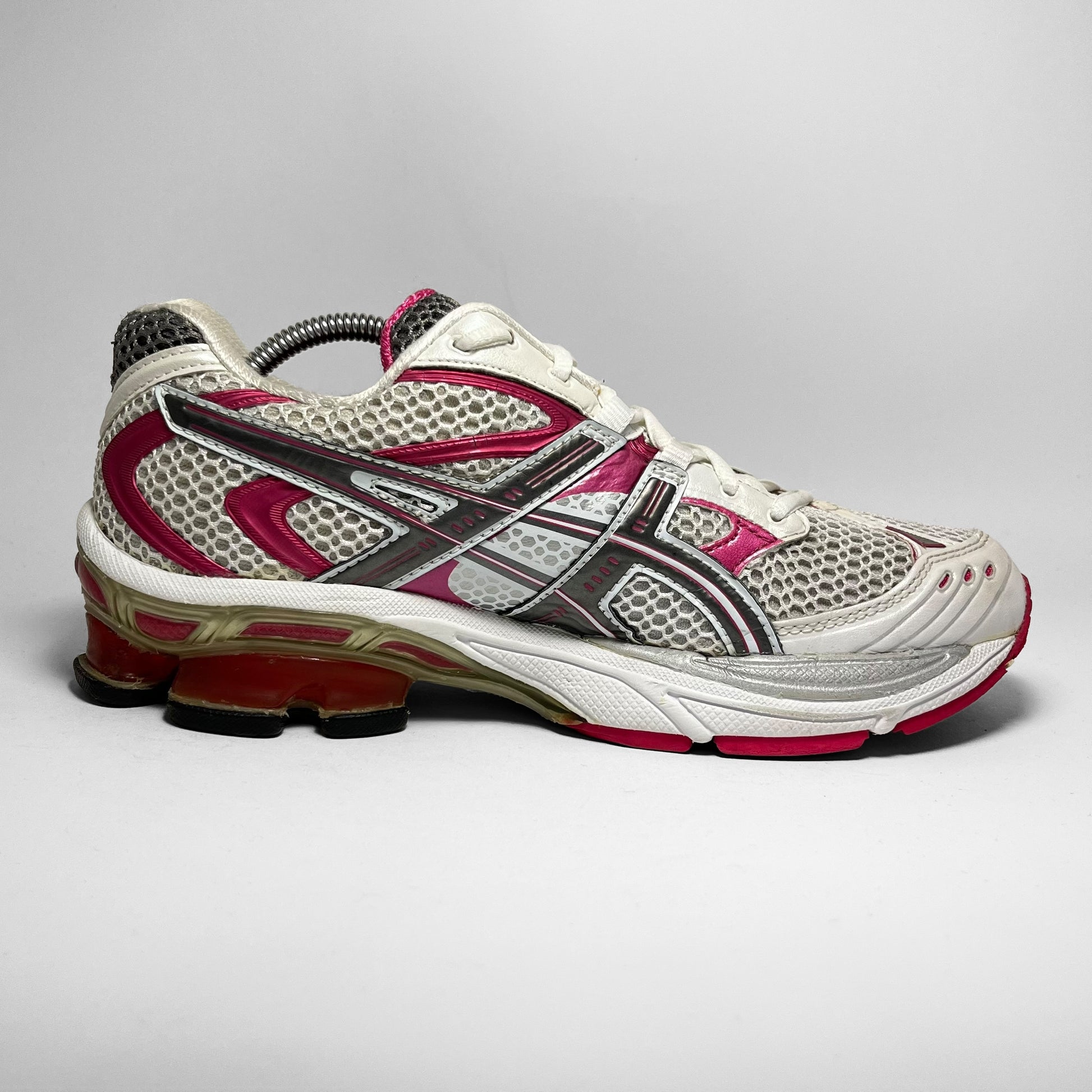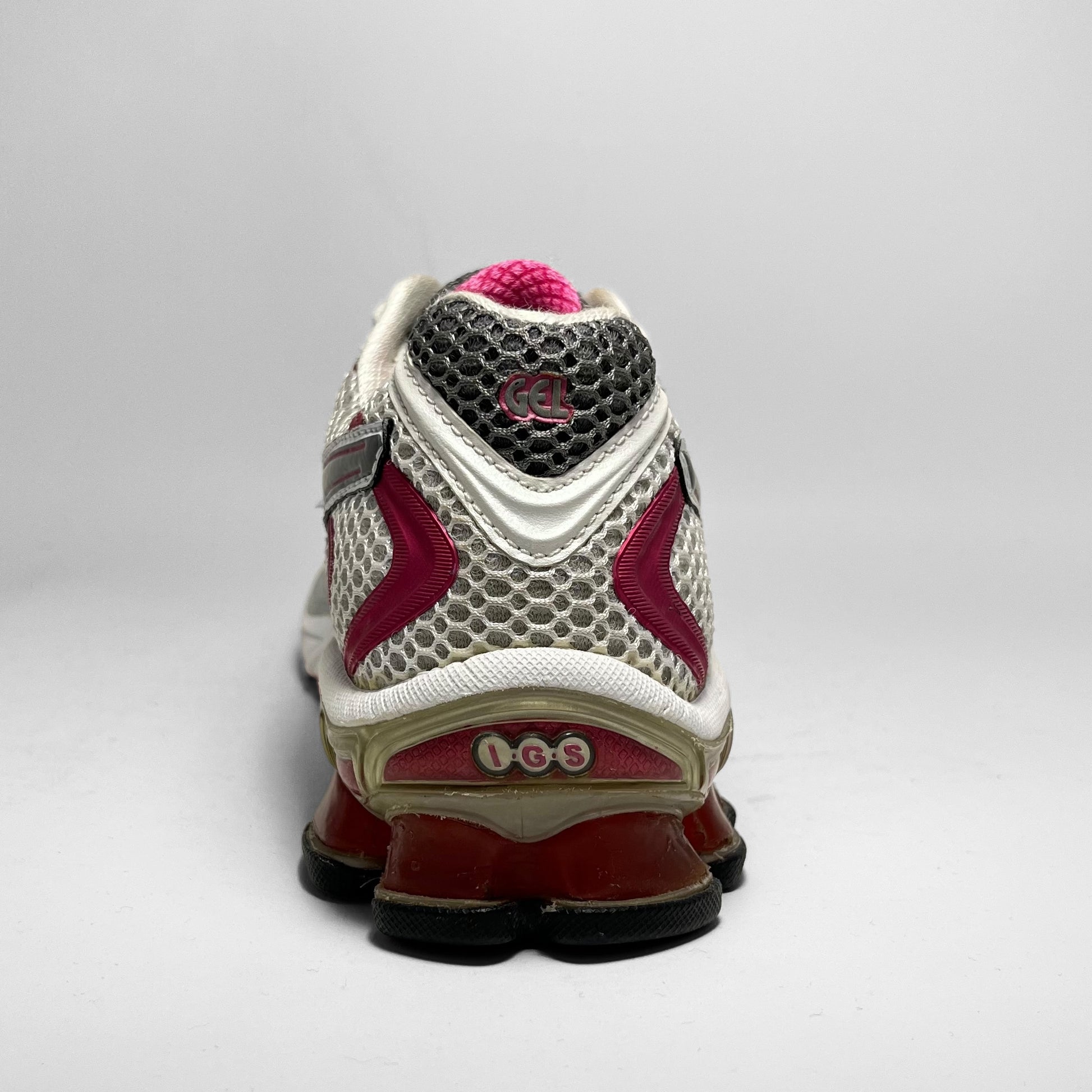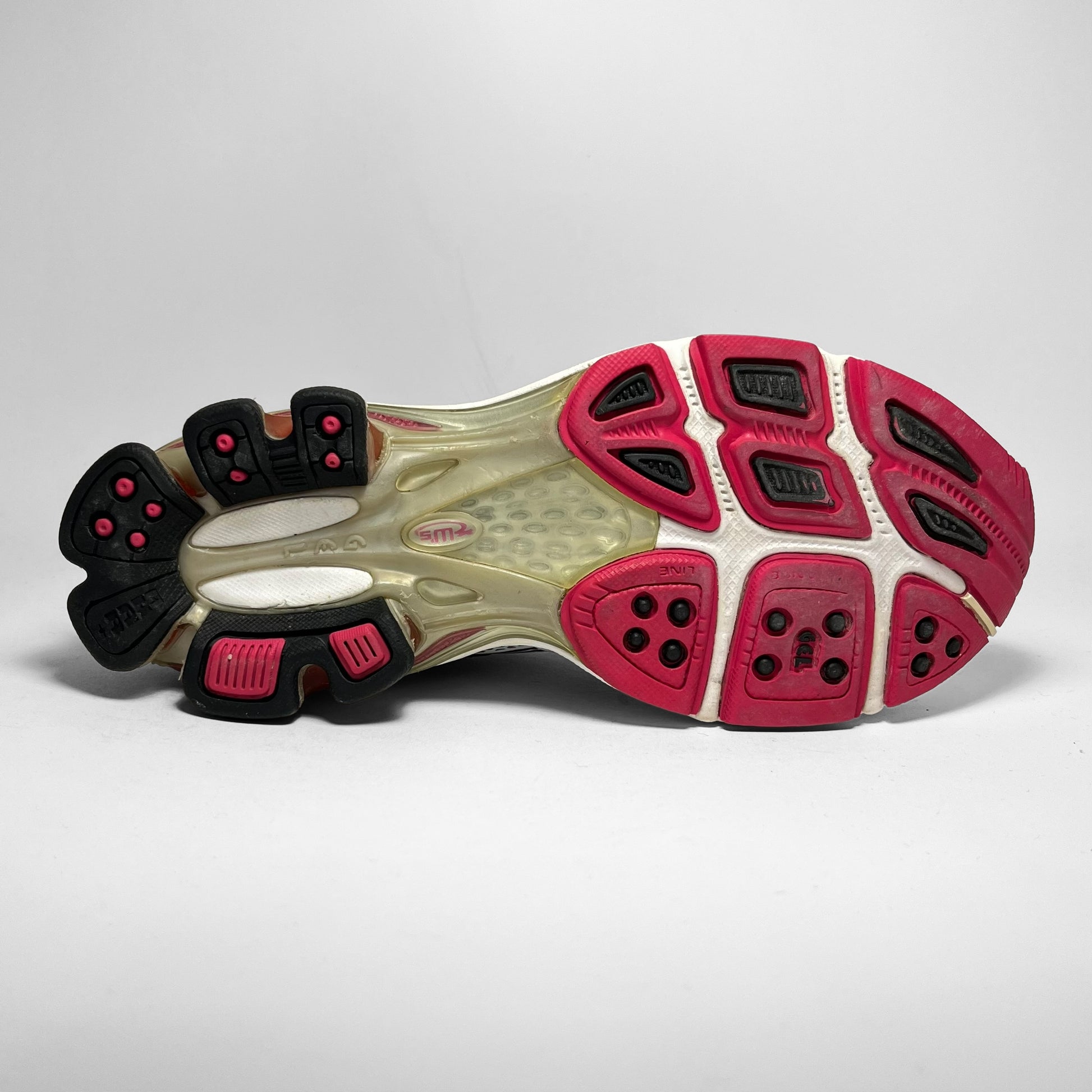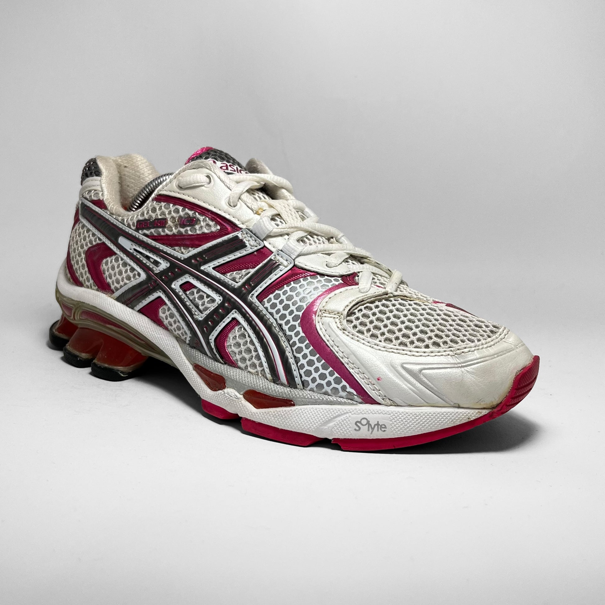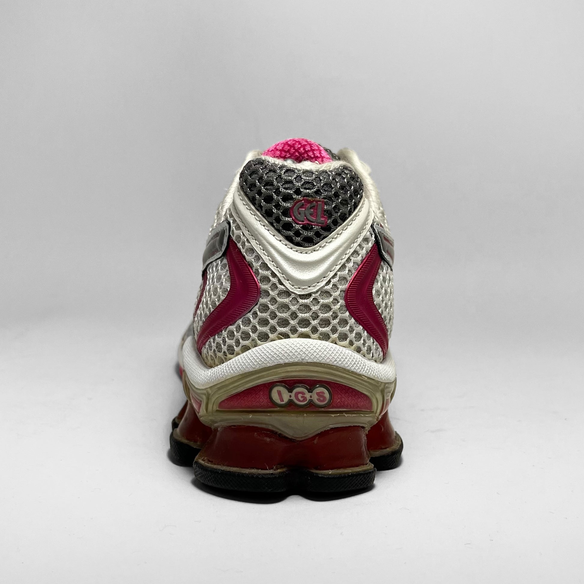 White mesh base layered with patent white and metallic leather panels throughout, engraved details and printed branding.