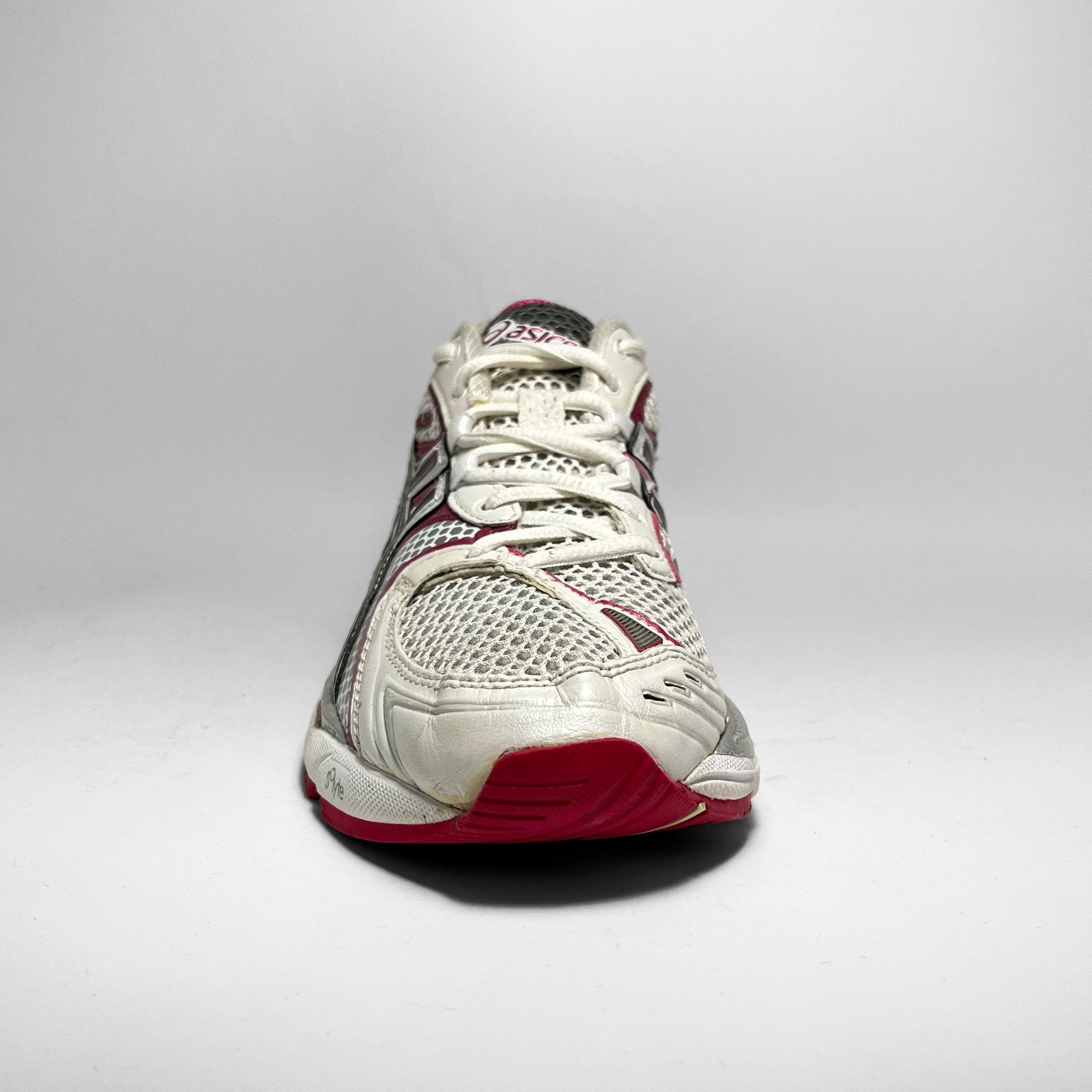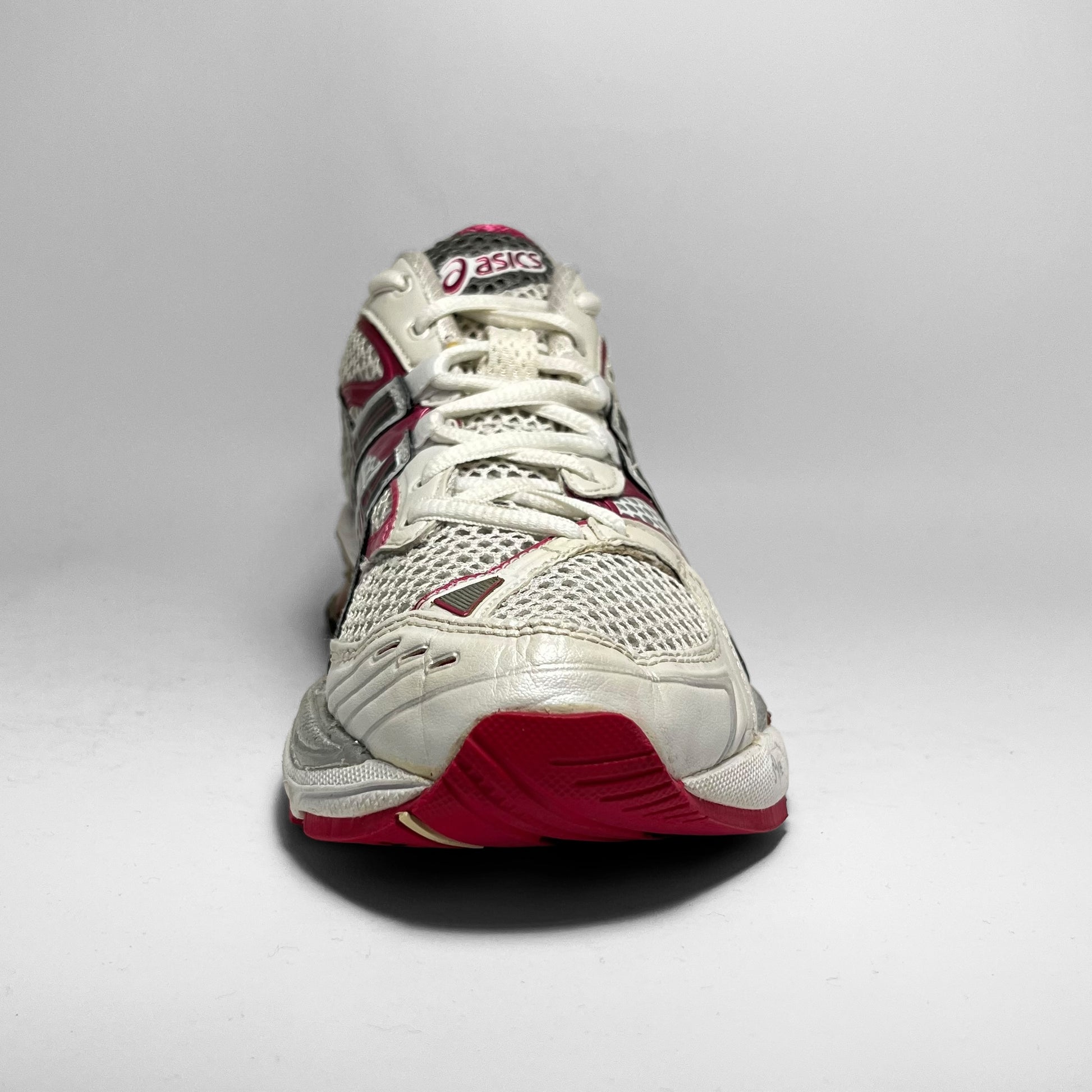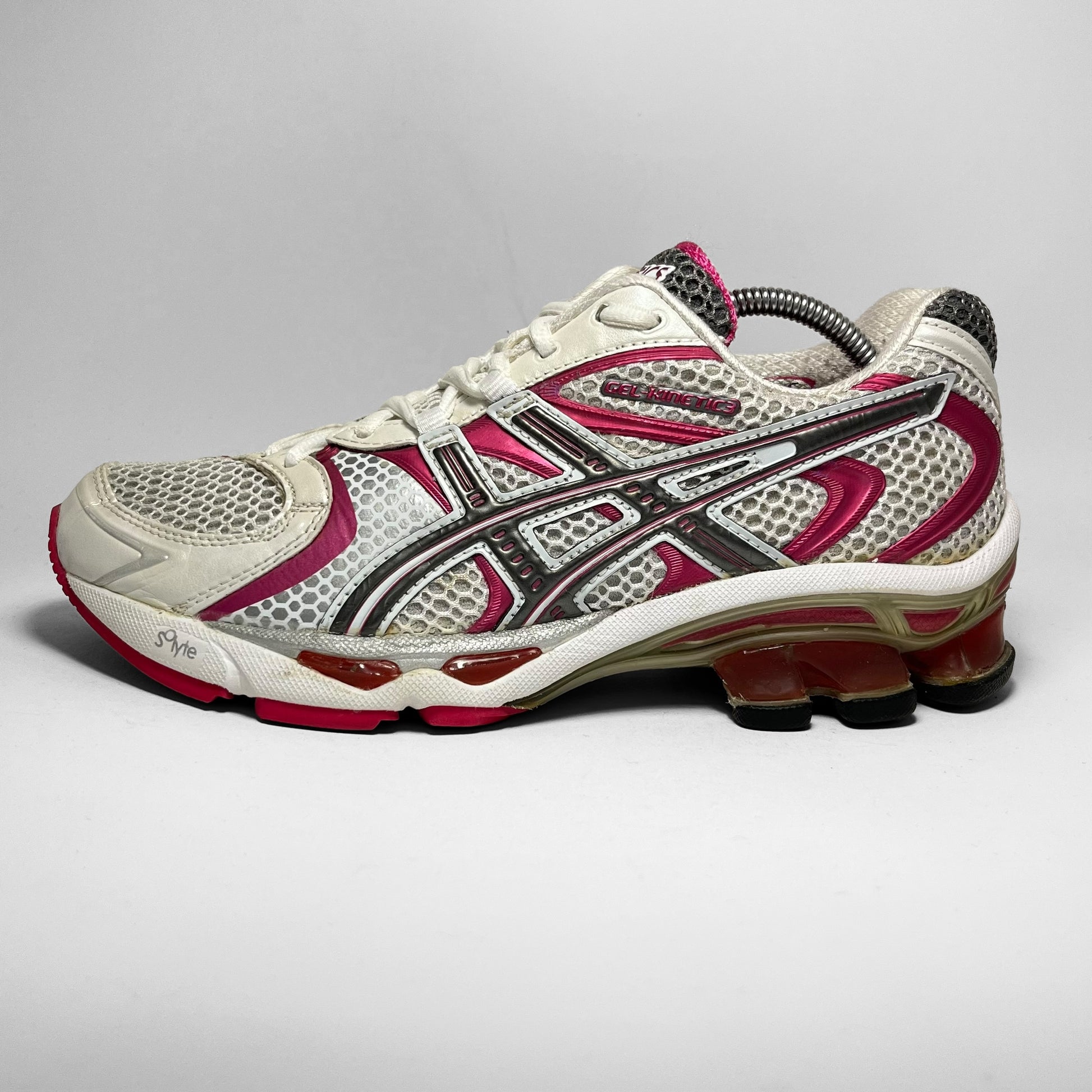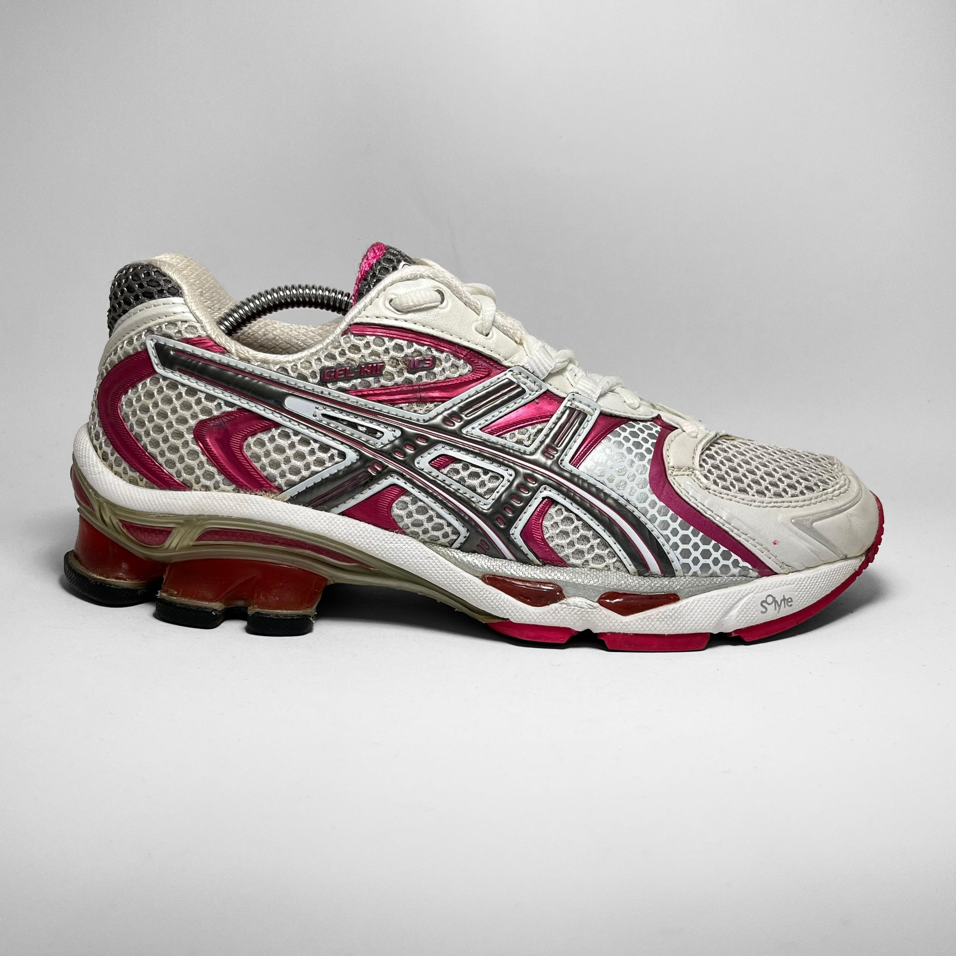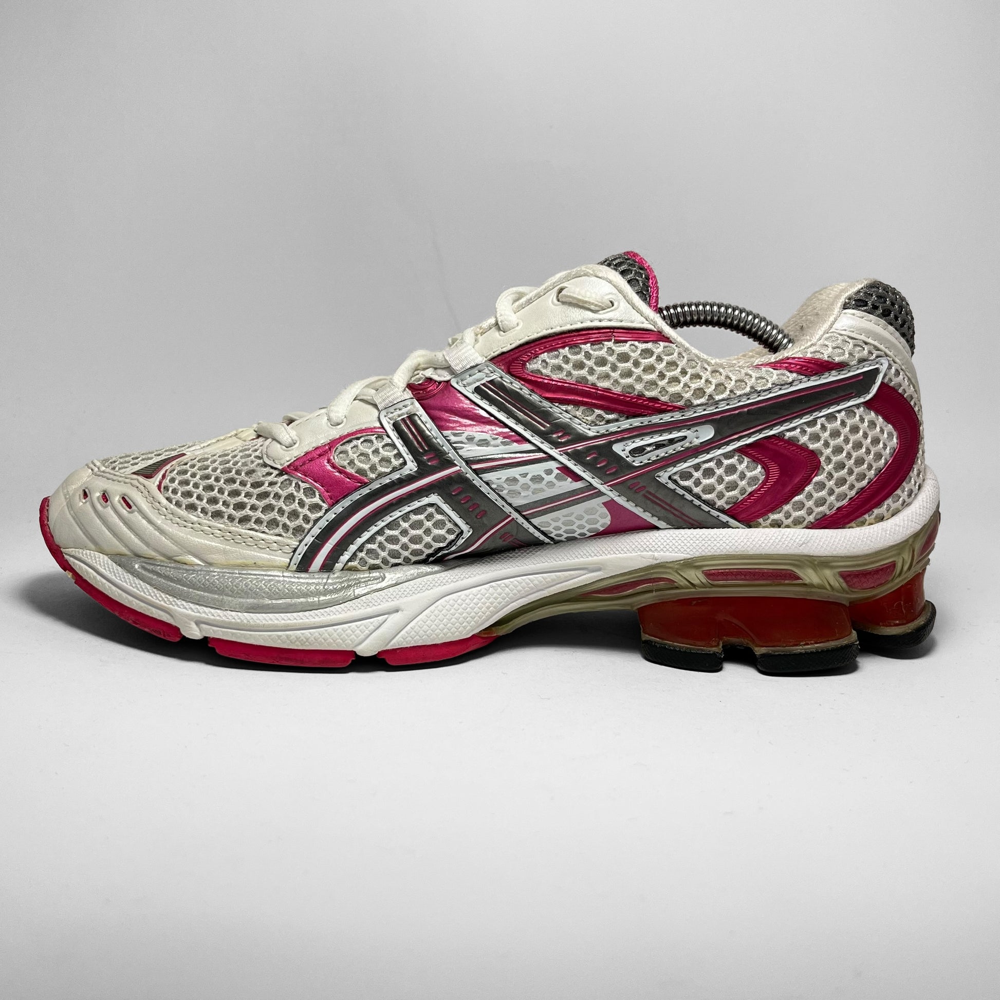 White mesh base layered with patent white and metallic leather panels throughout, engraved details and printed branding.