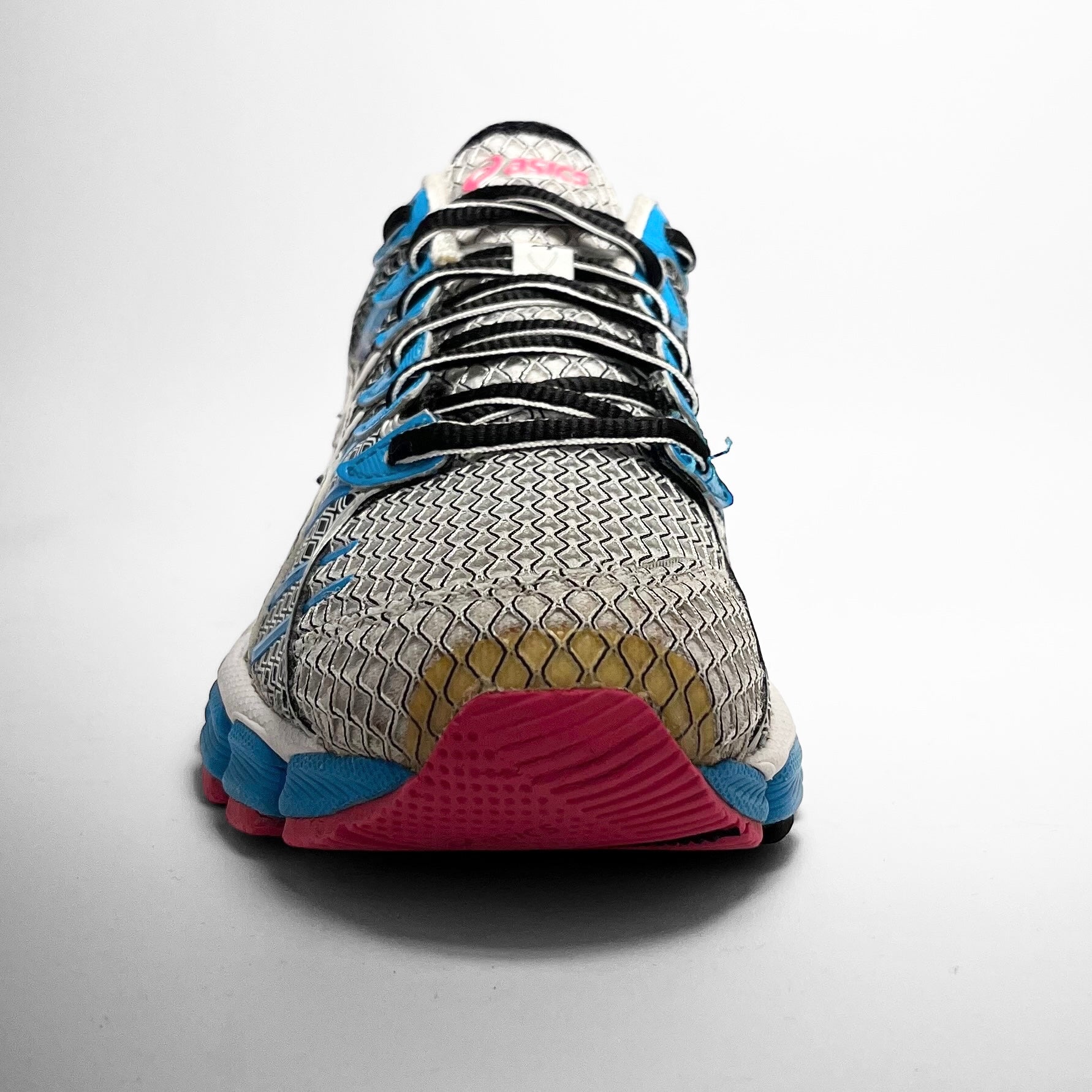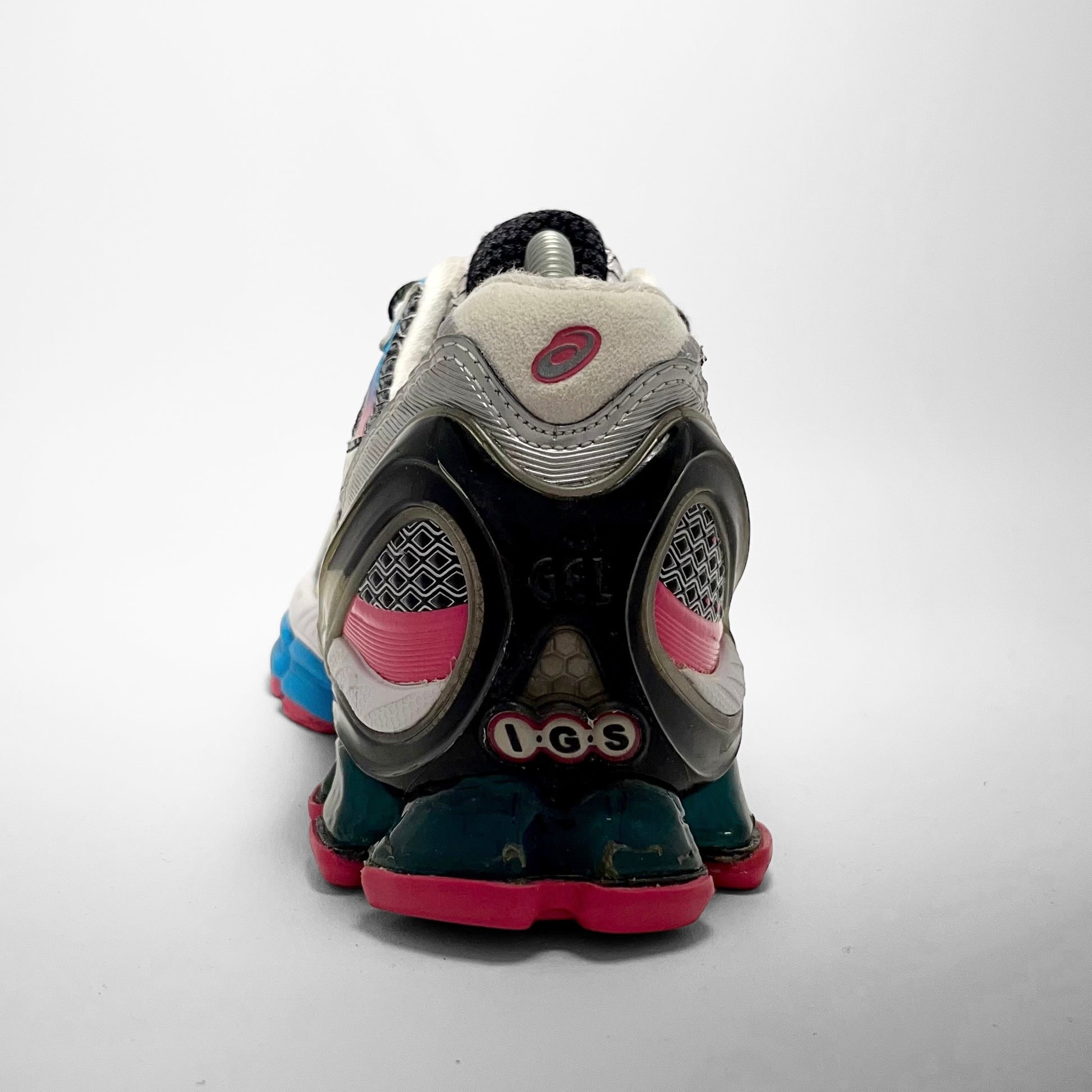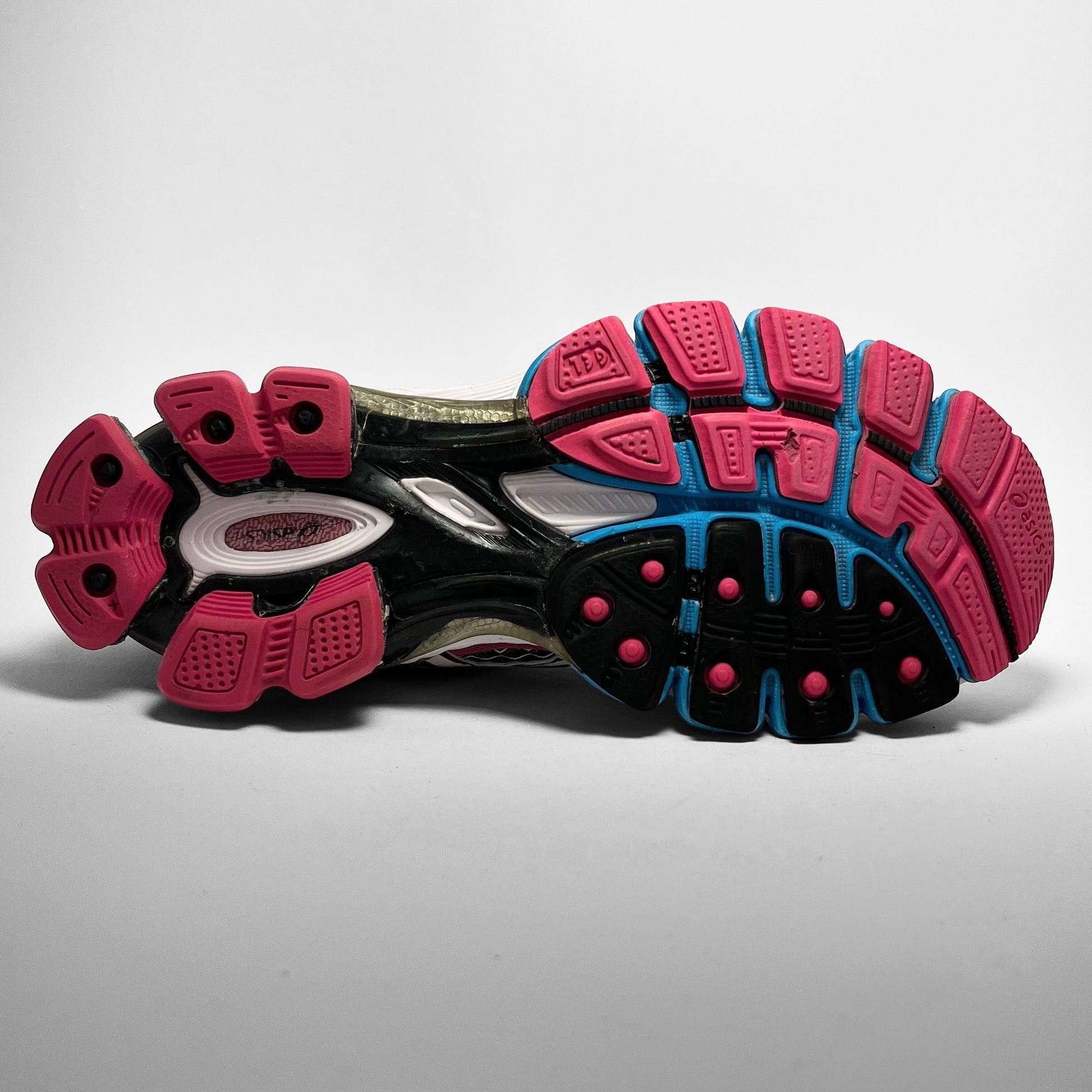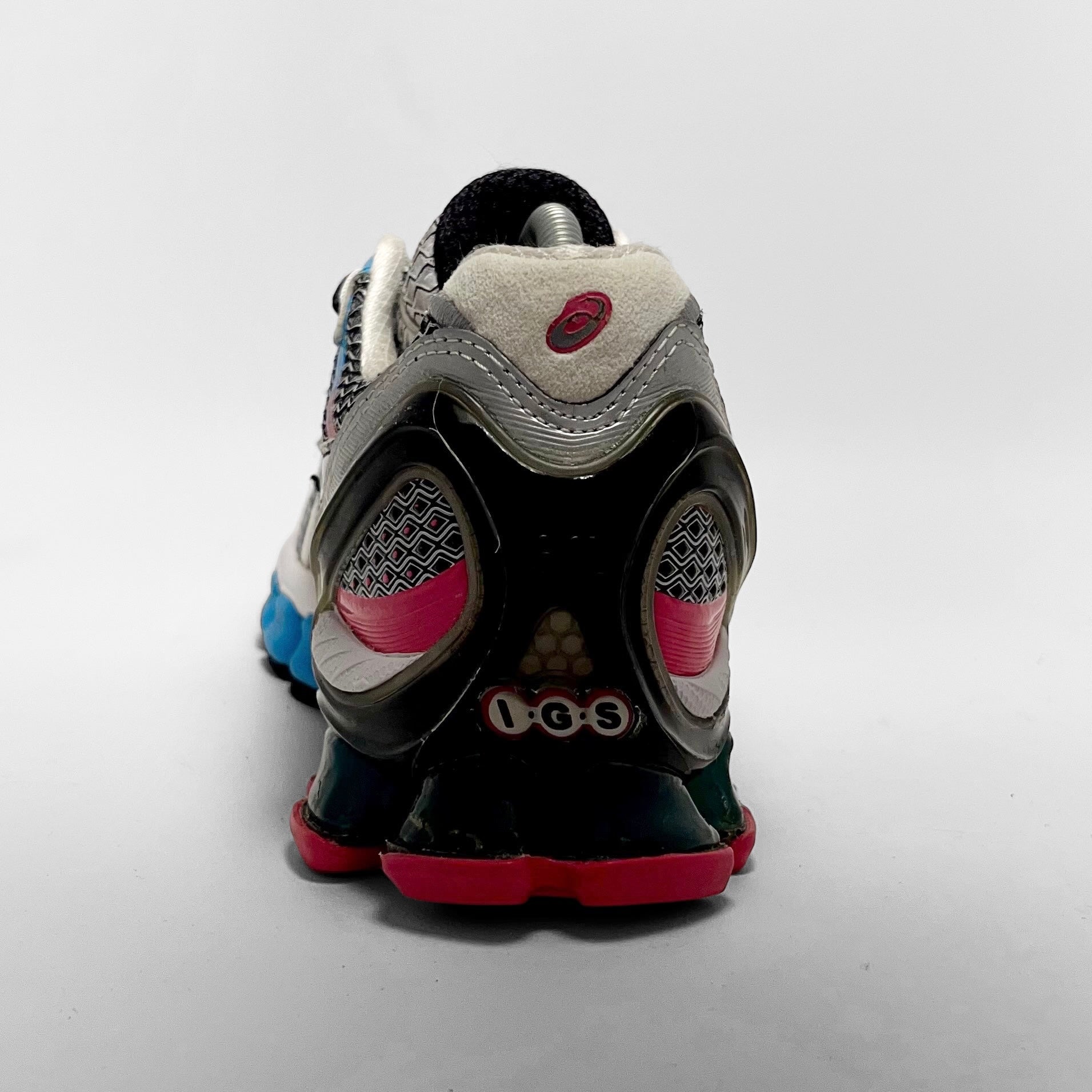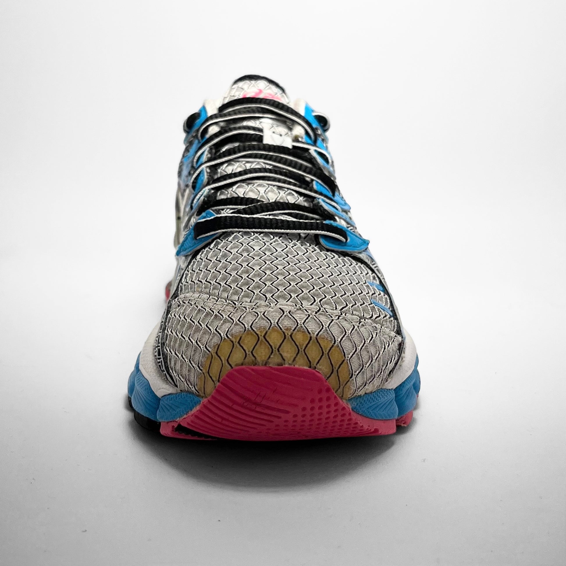 Various patterns and reverse colour schemes of mesh on the upper combined with blue electric detailed leather eyelets matching the front mid-sole, pink and blue fading veins on the sides matching the pink outsole, branding on tongue, heel and rear-chassis.