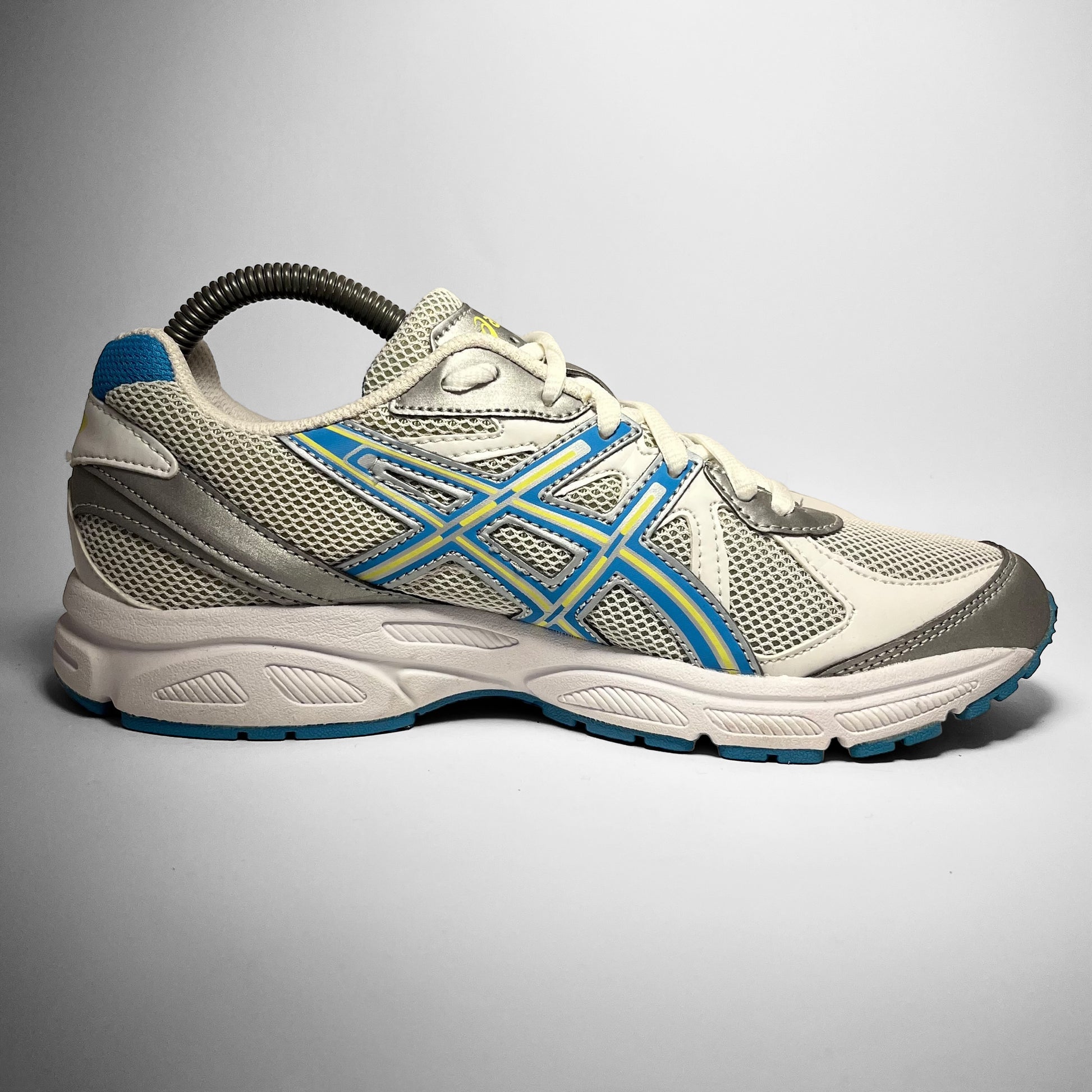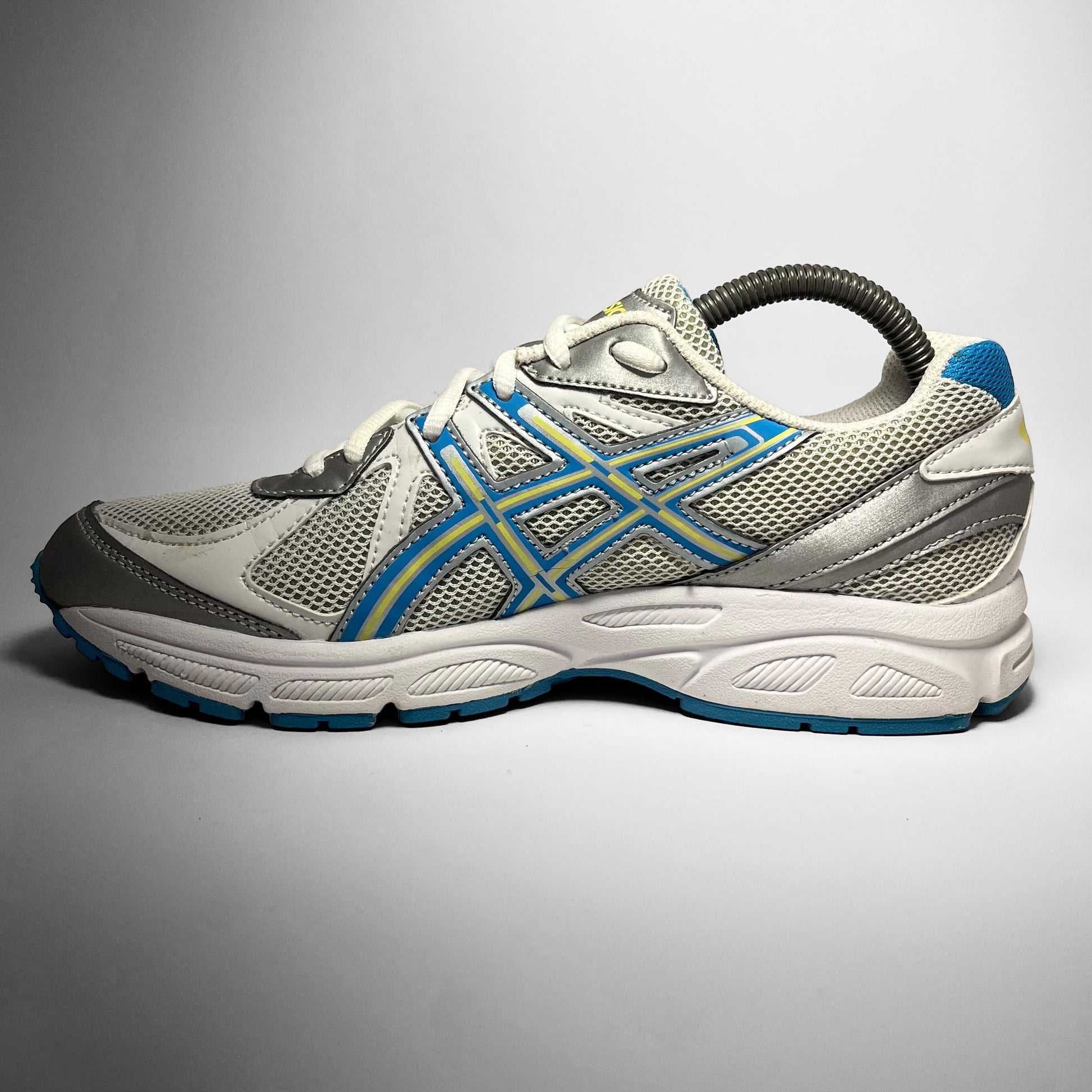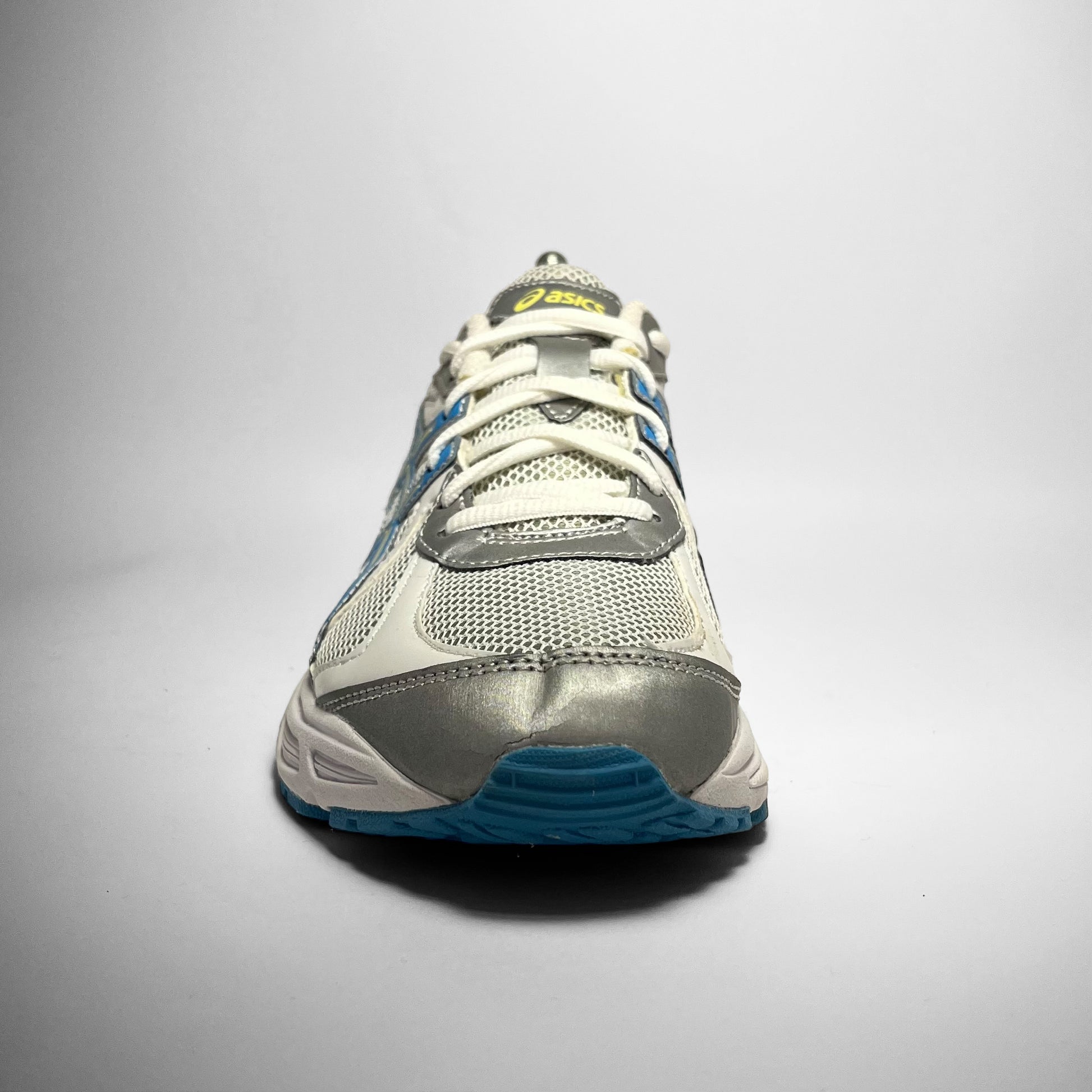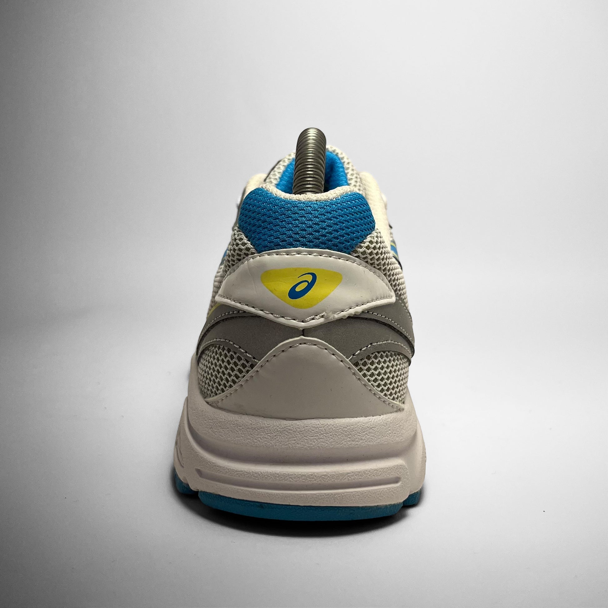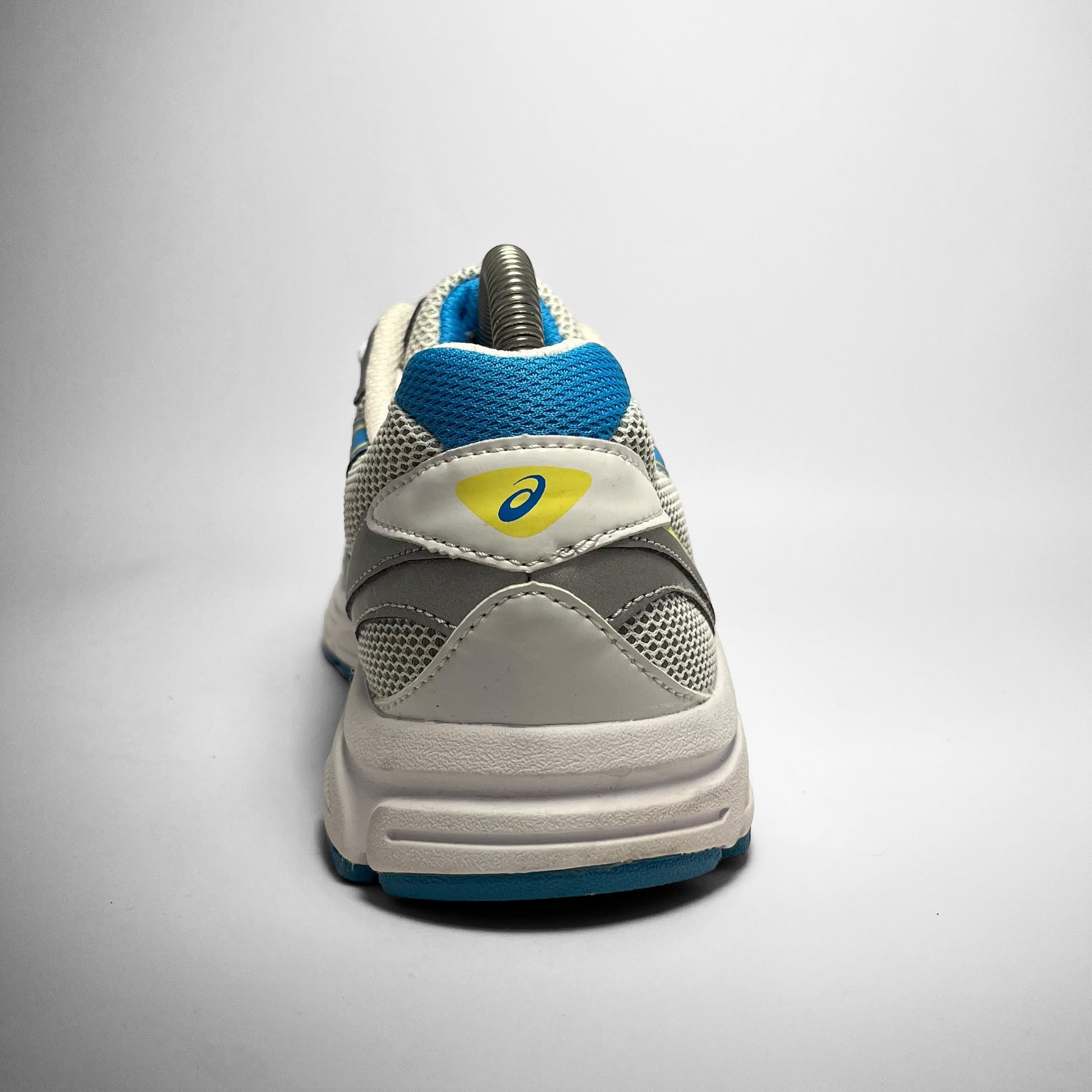 Mesh upper with white and silver leather panels throughout, yellow and blue embossing details on the ASICS logo and script on the sides, including branding on tongue.