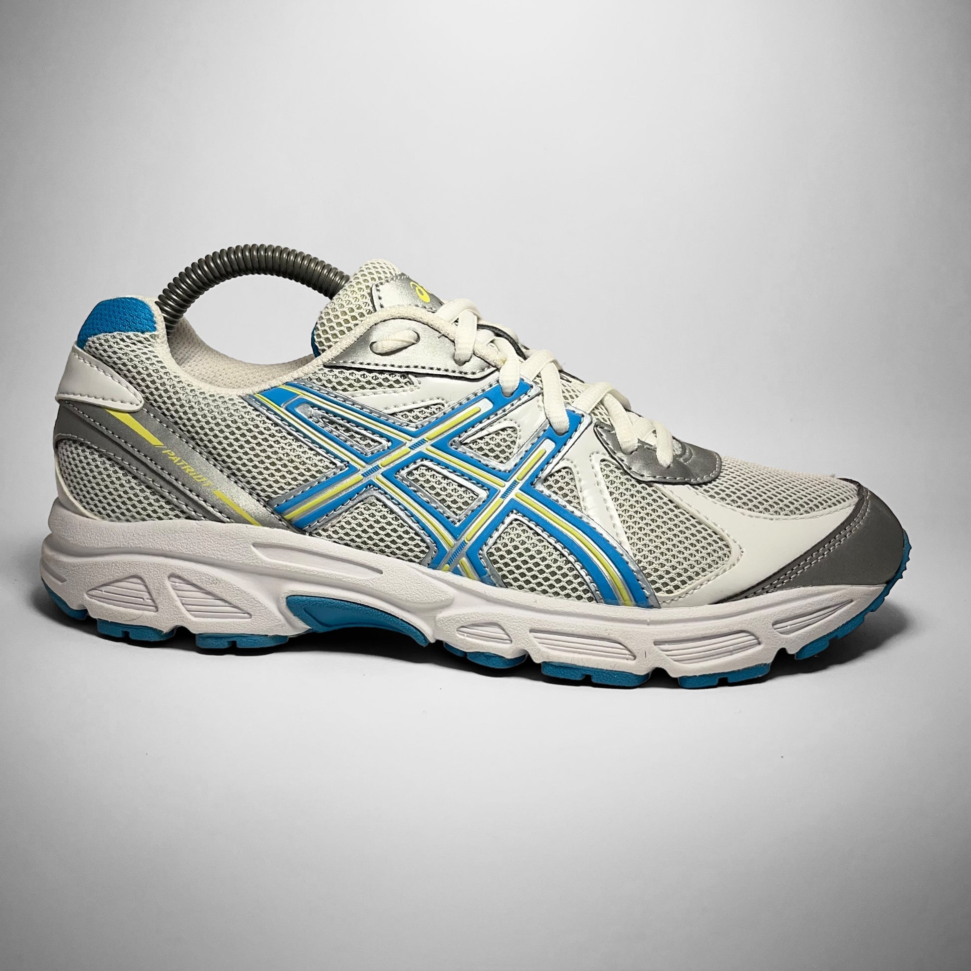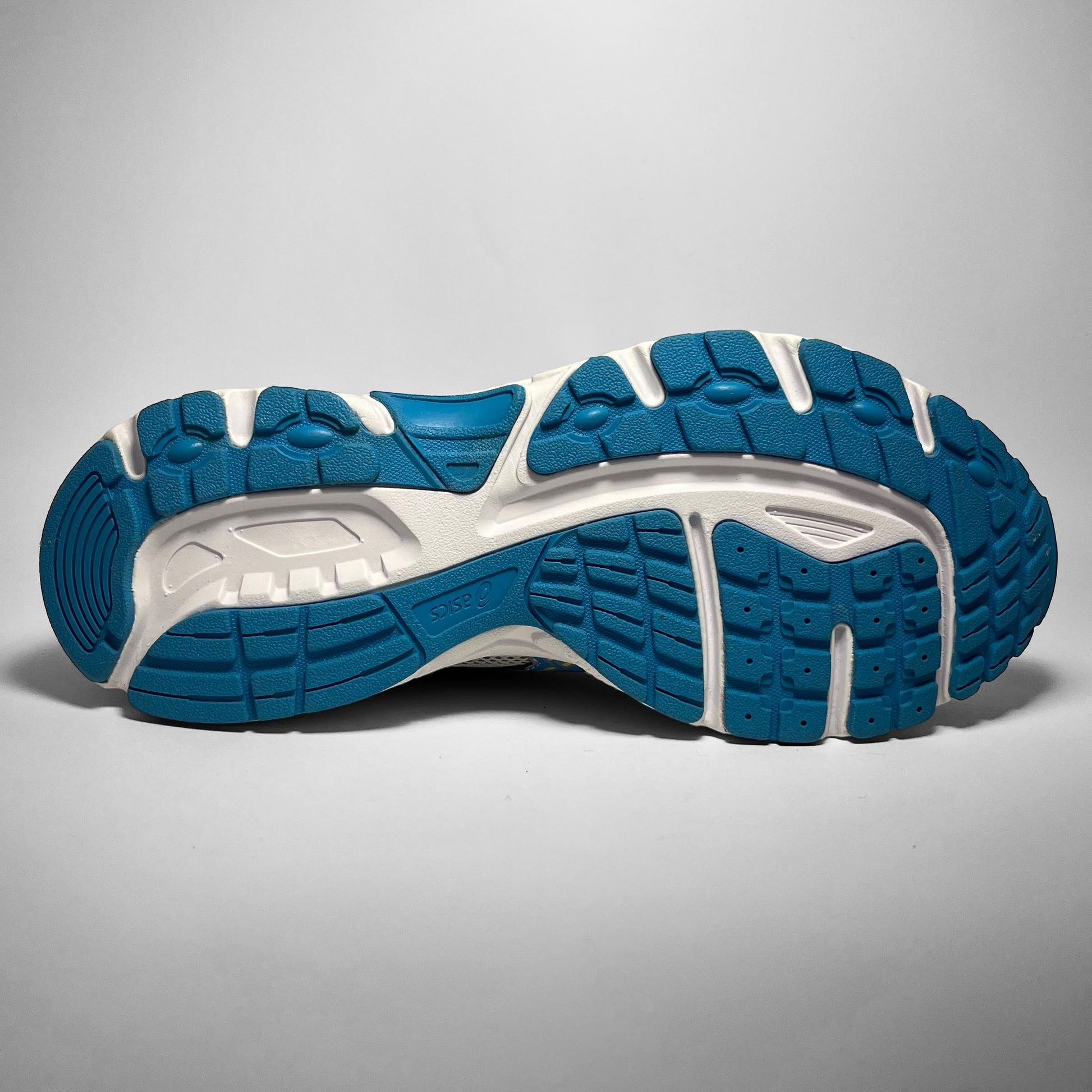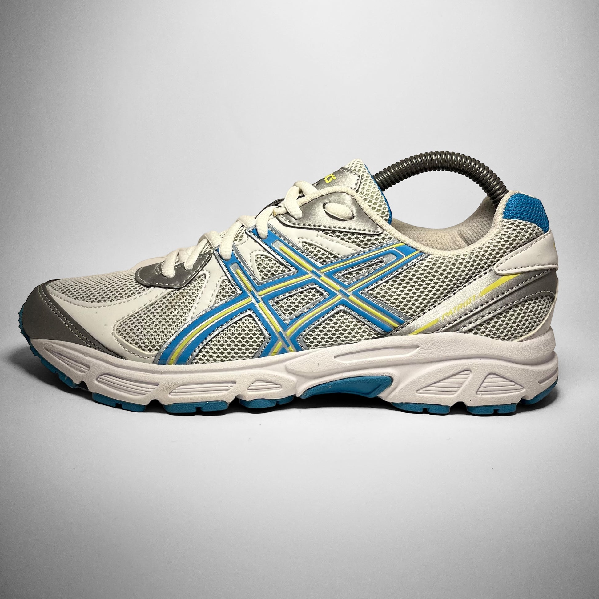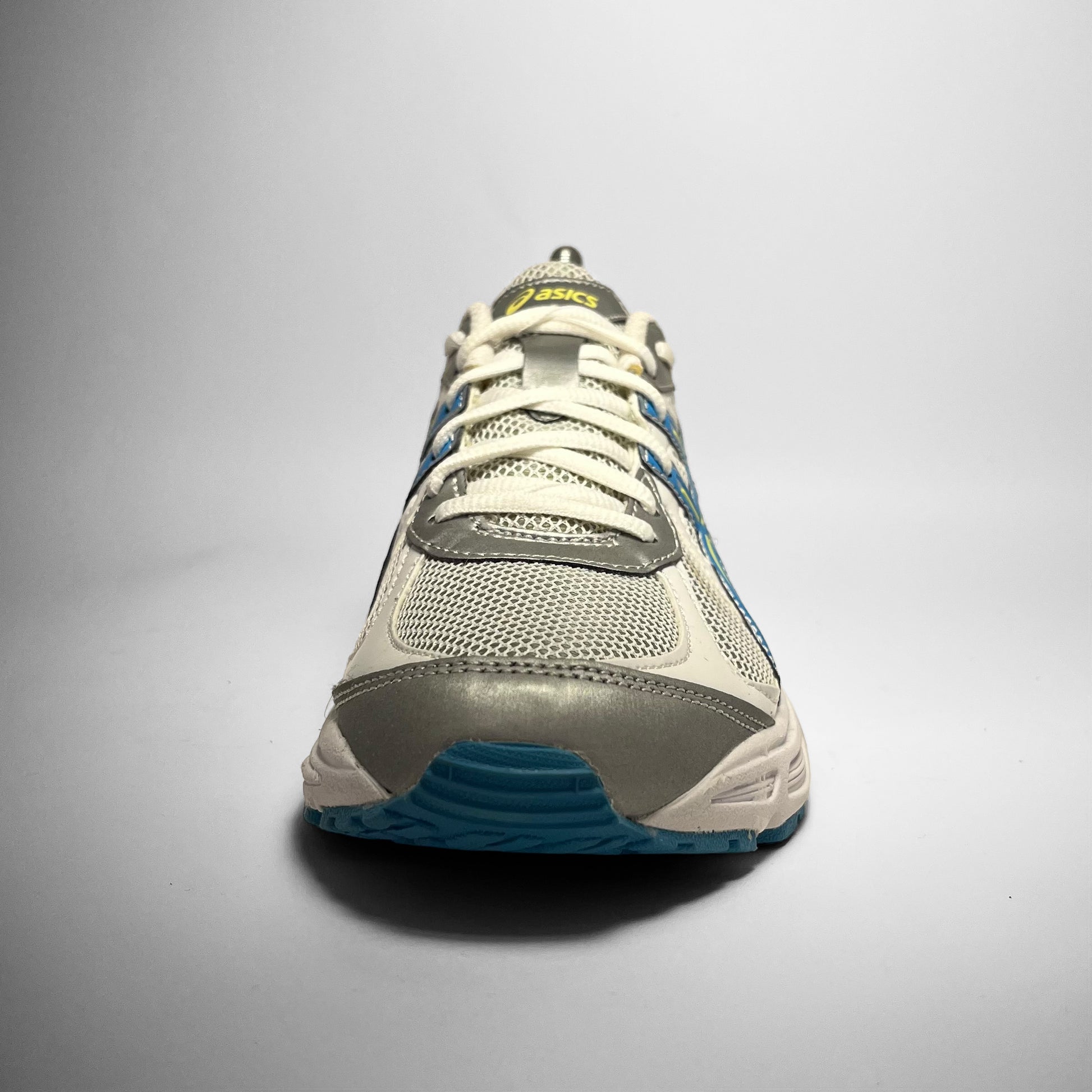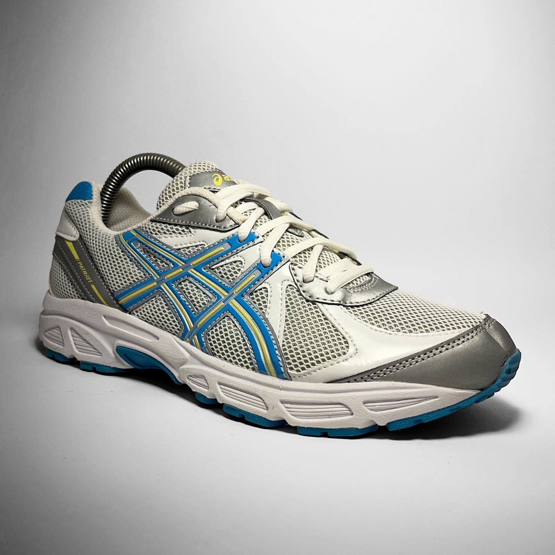 Mesh upper with white and silver leather panels throughout, yellow and blue embossing details on the ASICS logo and script on the sides, including branding on tongue.