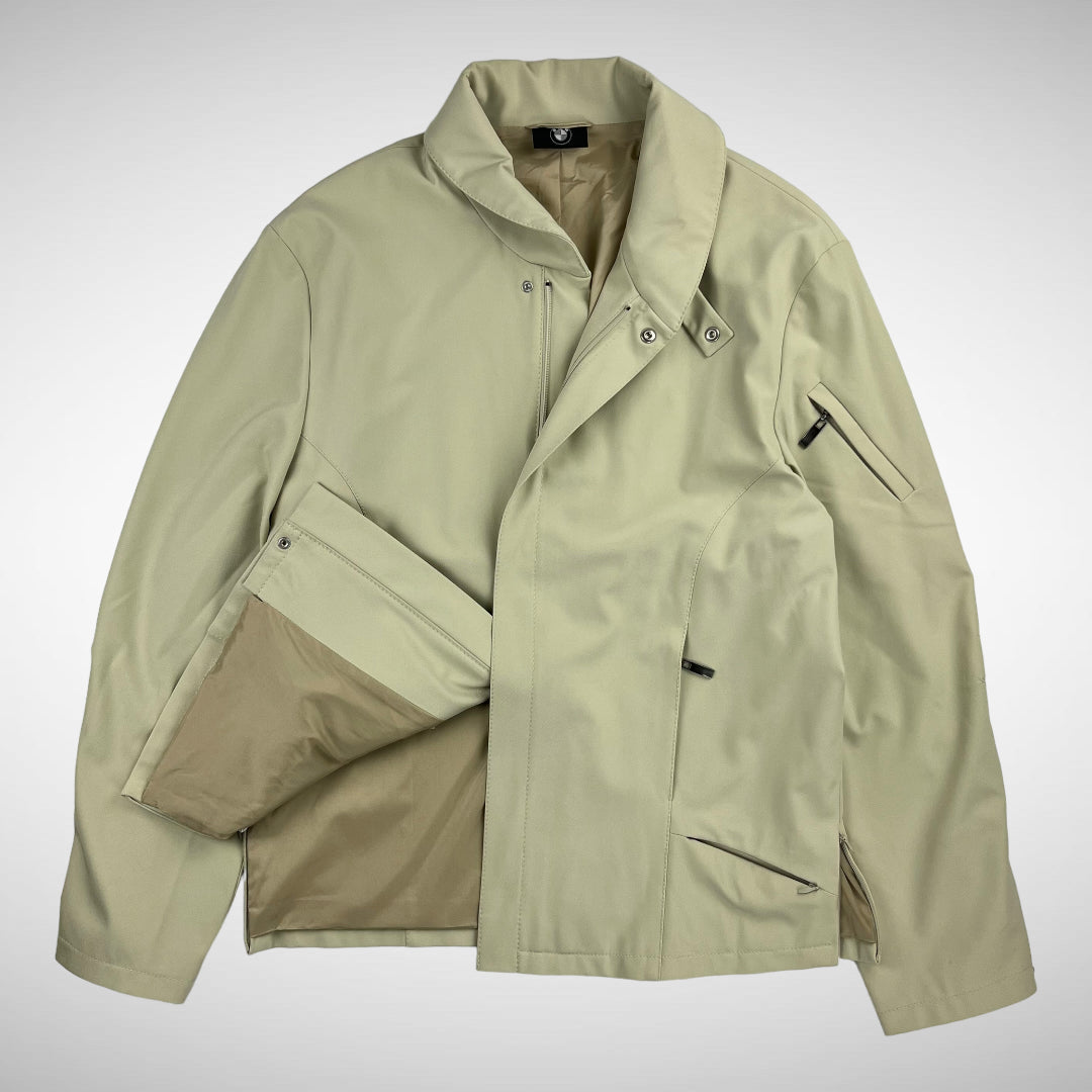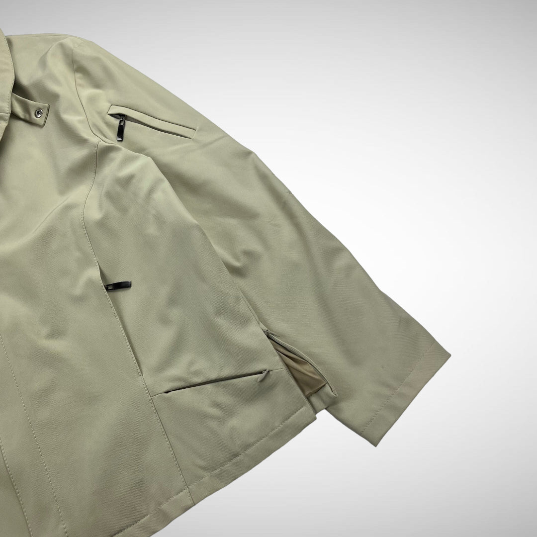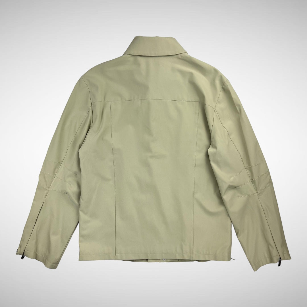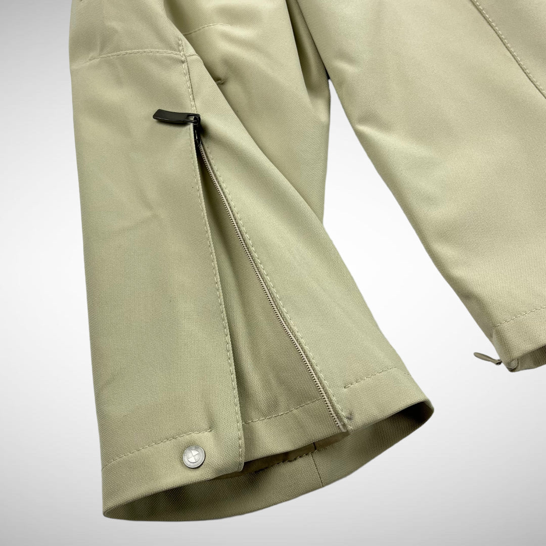 High quality and robust woven nylon outer blended with stretchable spandex featuring four technical hidden zip compartments, additional upper arm pocket, two-way zip closure, hidden zip on sides to expand and adjust fit around hem, dual stash pockets on the inside, folded collar with additional press-button and zip expandable cuffs.
