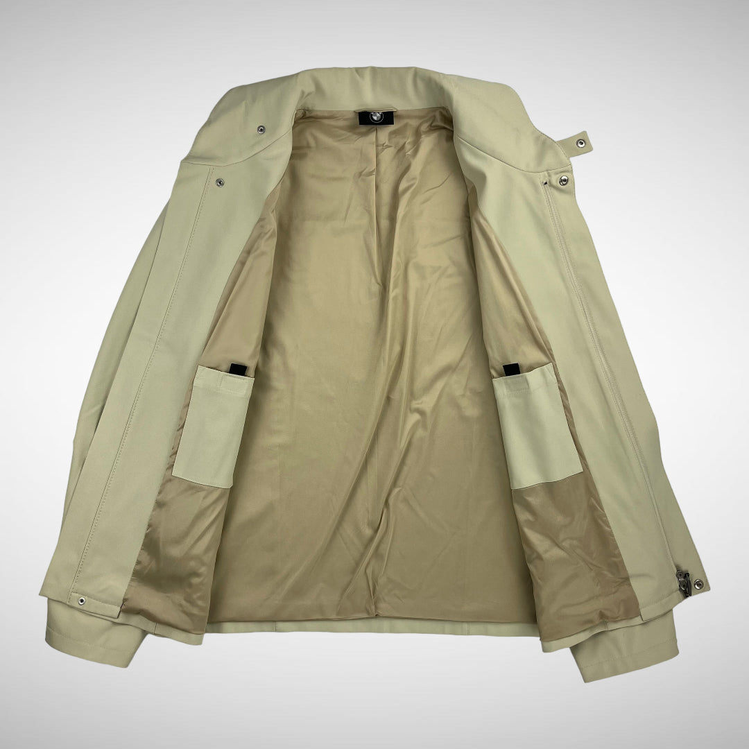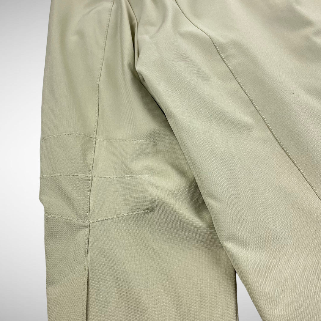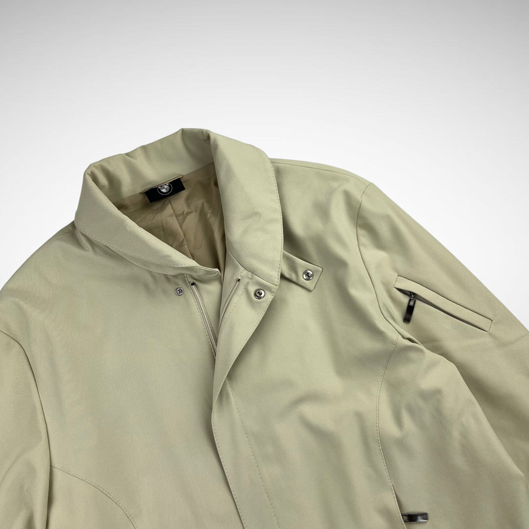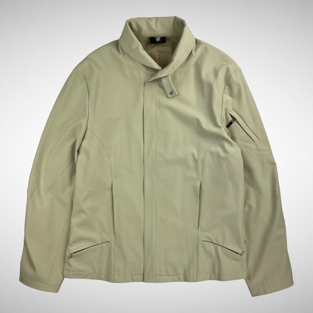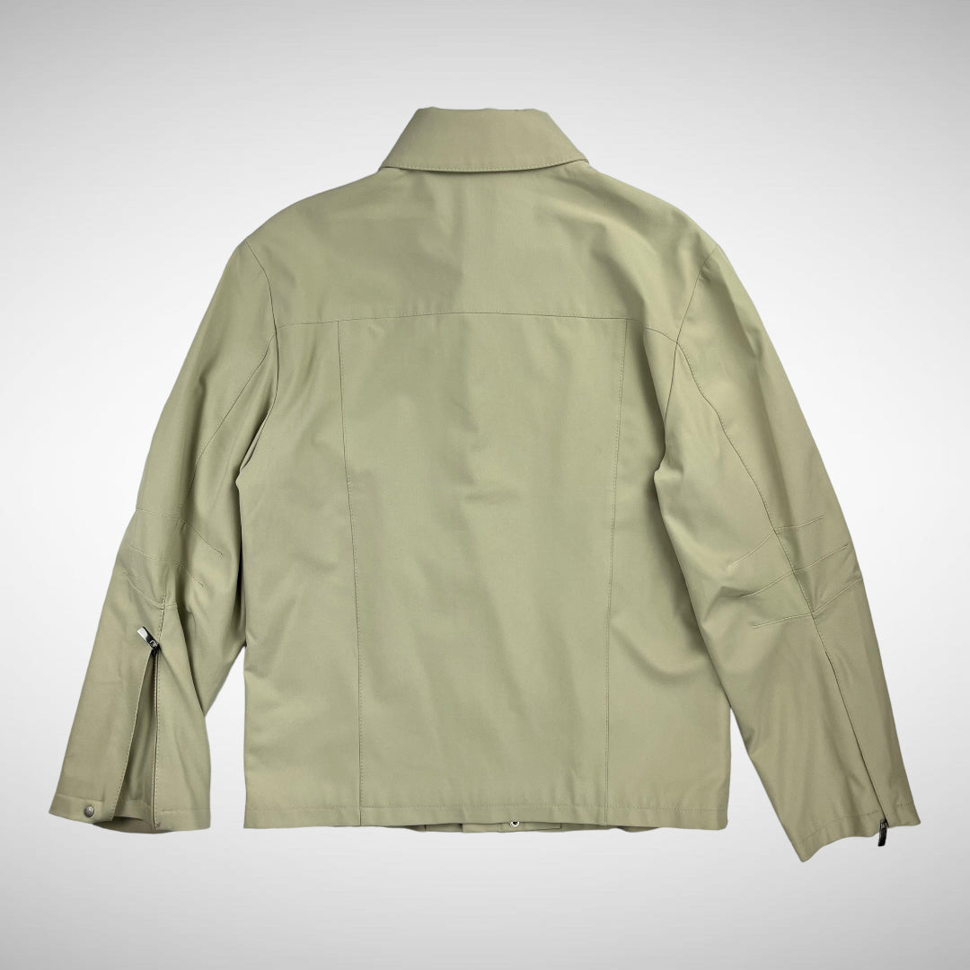 High quality and robust woven nylon outer blended with stretchable spandex featuring four technical hidden zip compartments, additional upper arm pocket, two-way zip closure, hidden zip on sides to expand and adjust fit around hem, dual stash pockets on the inside, folded collar with additional press-button and zip expandable cuffs.