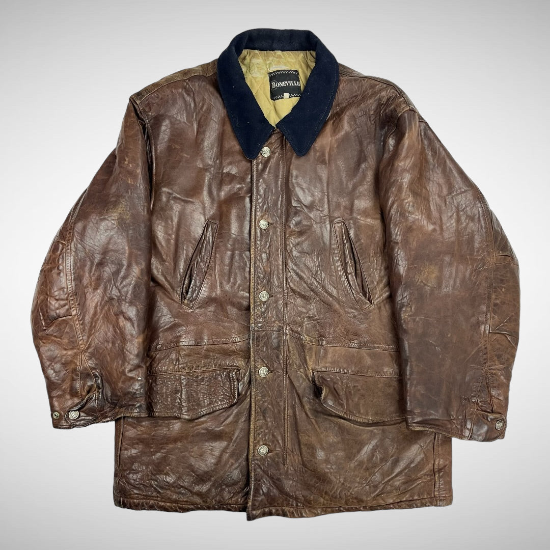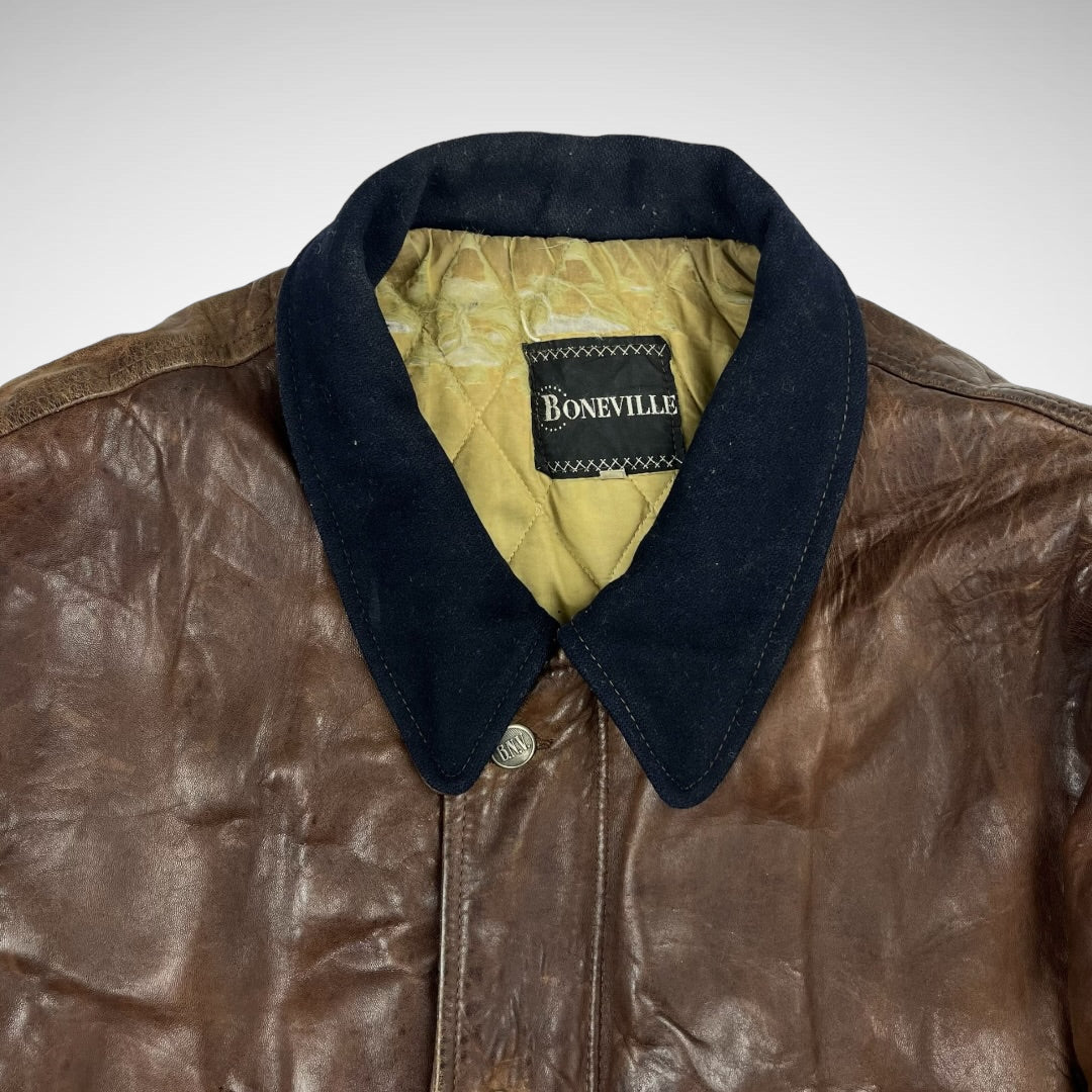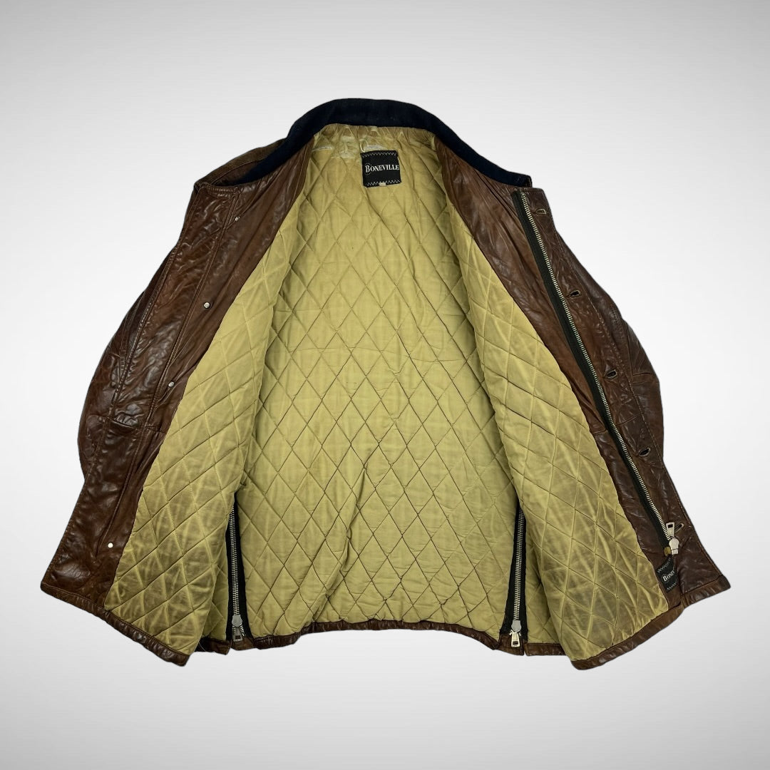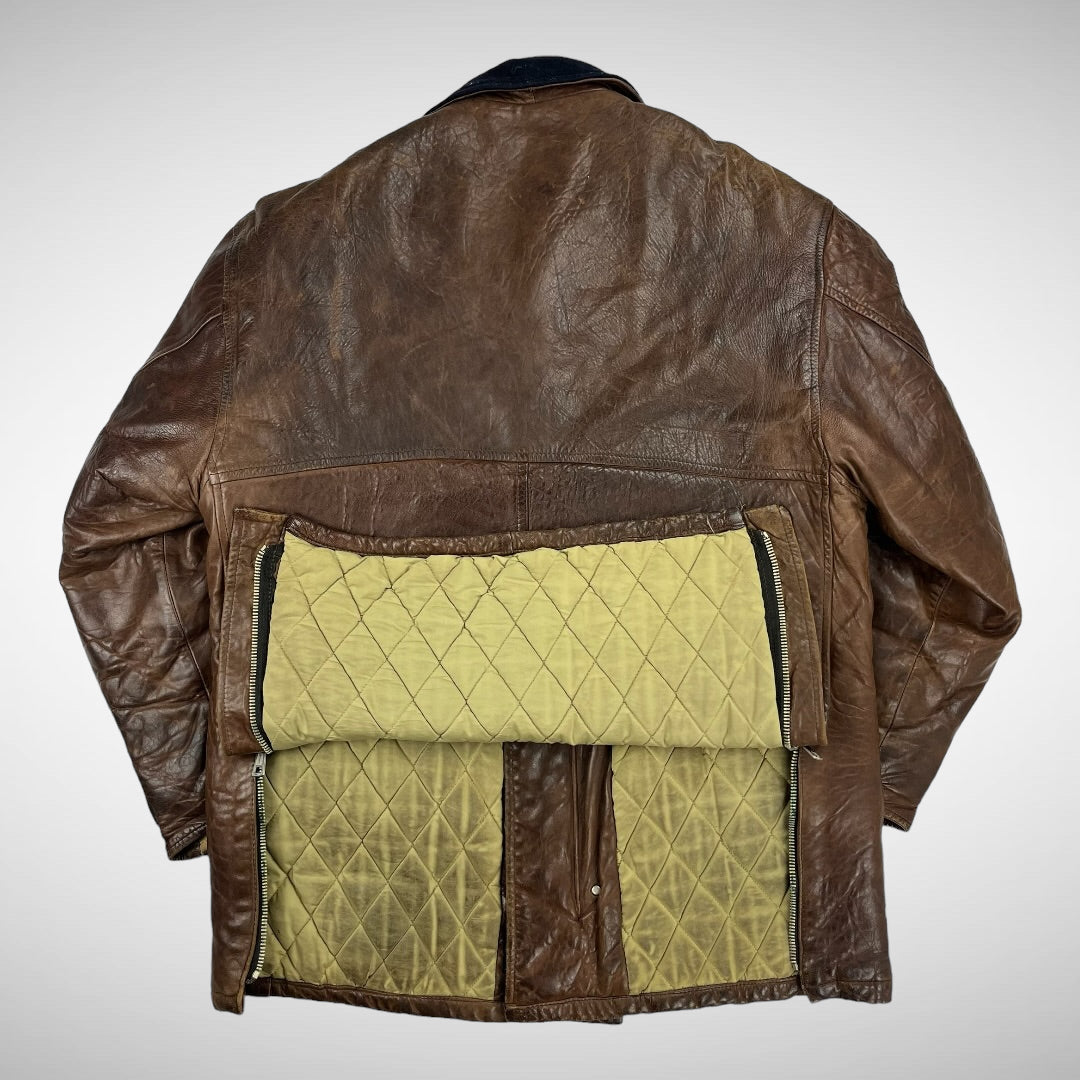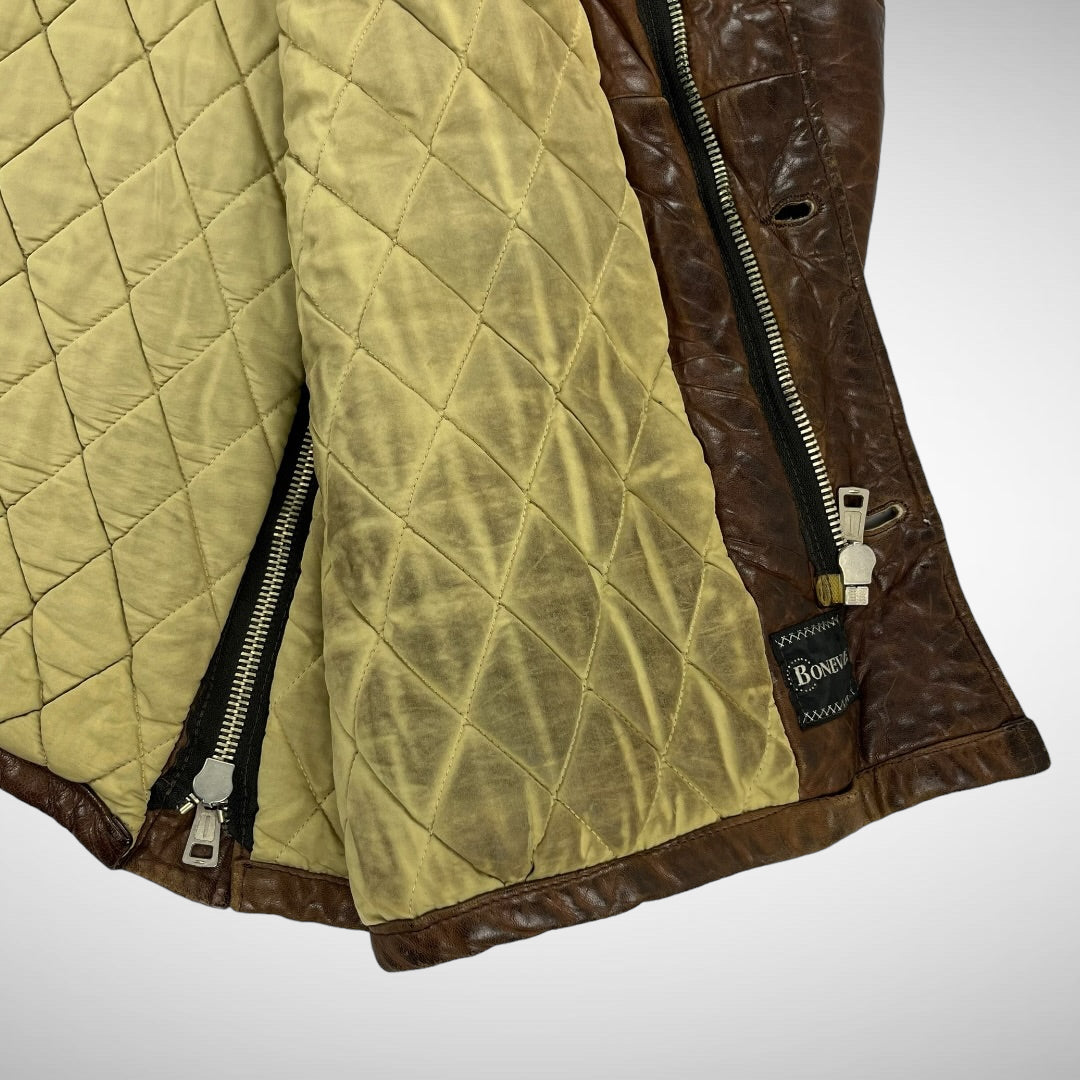 Brown leather outer with quilted lining, double slide-entry pockets and double flap-pockets, zip-up closure assisted with branded BNV buttons, fleece collar and button adjustable cuffs and finally double-zip at the back for probably ventilation and style.