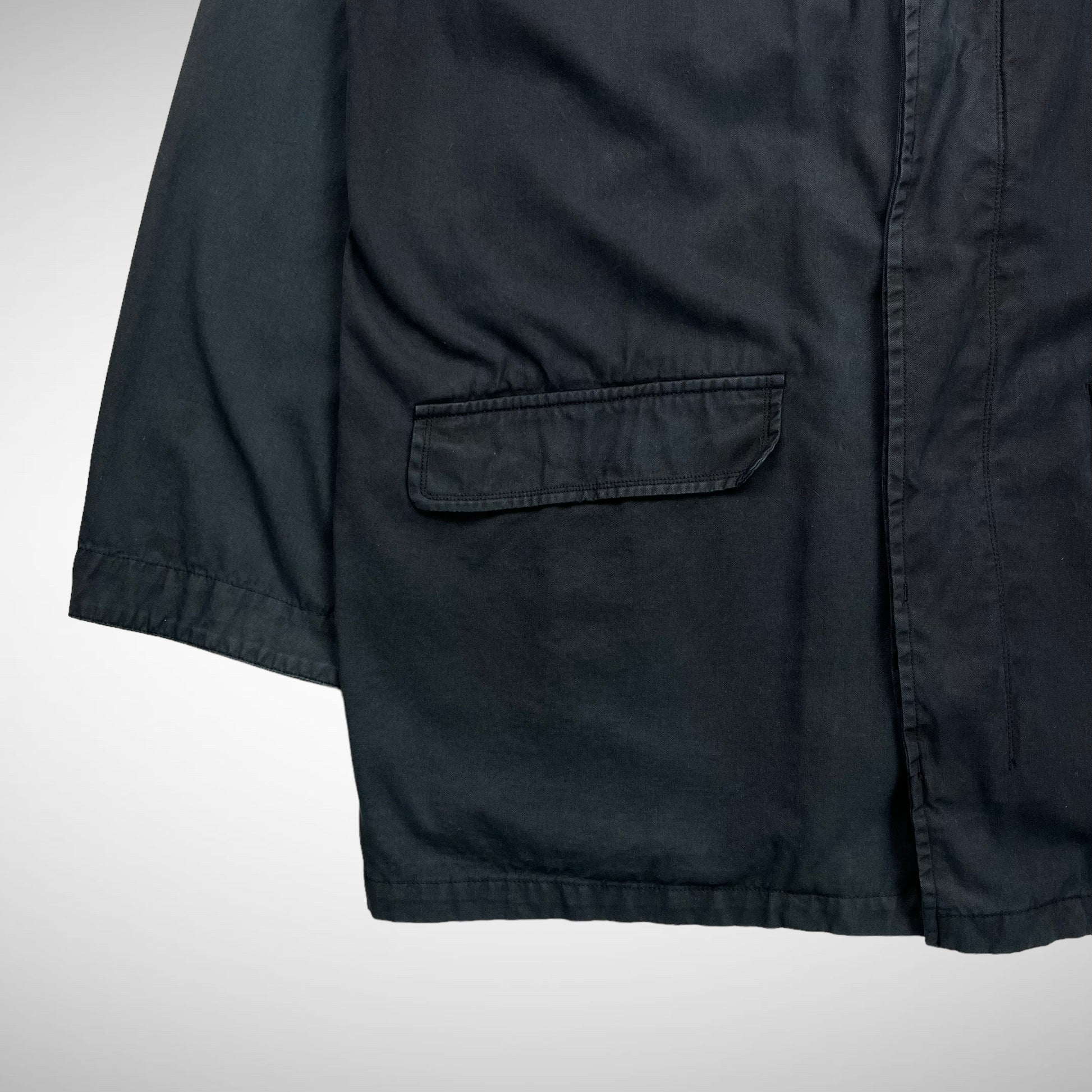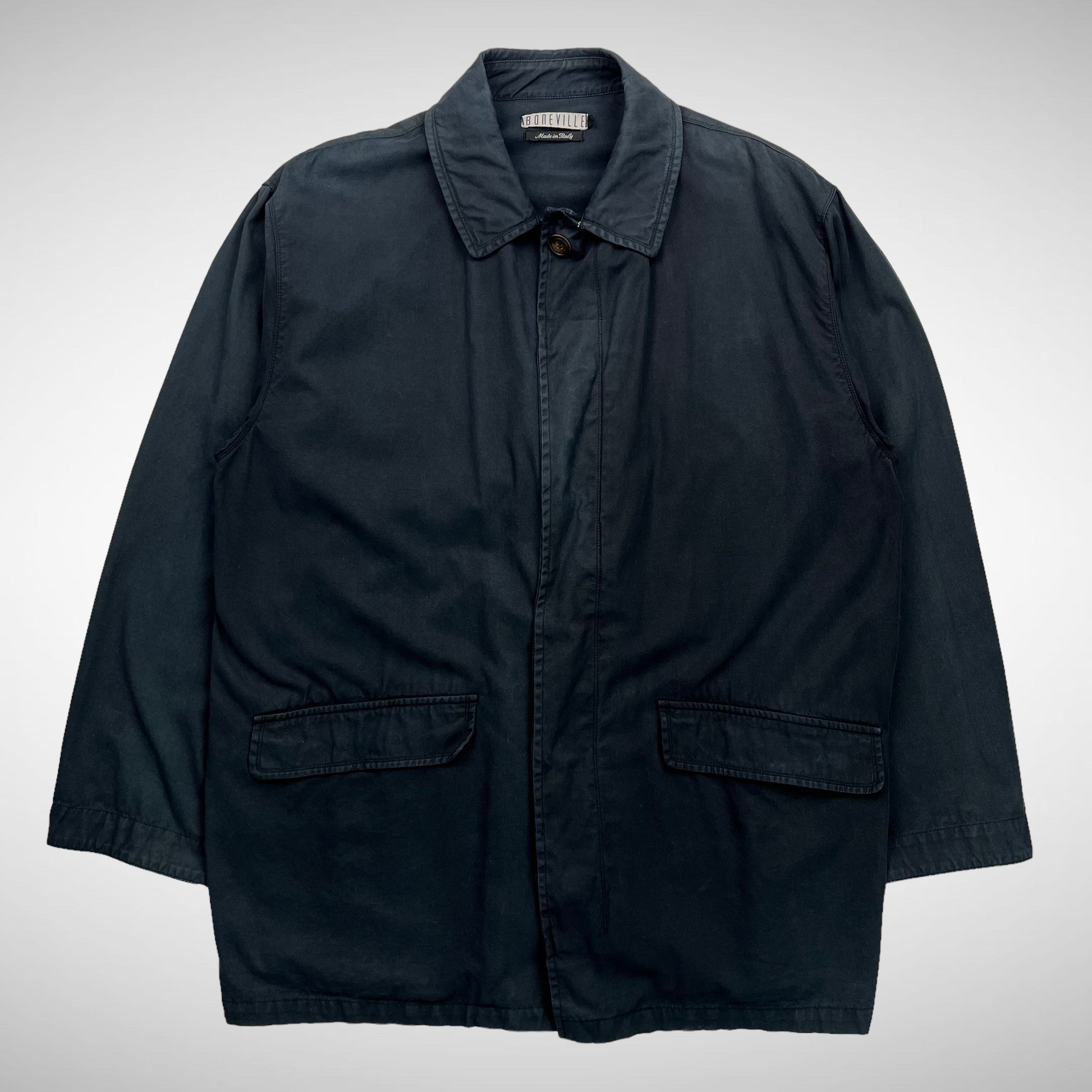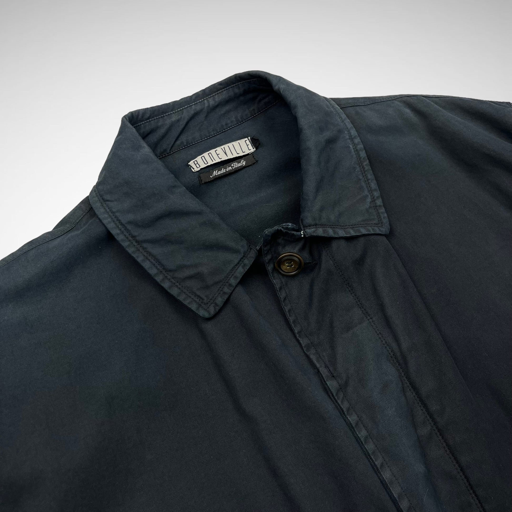 Spalmatura coated coat with hidden button-up closure except the top-one, fold down collar and double flap compartments.