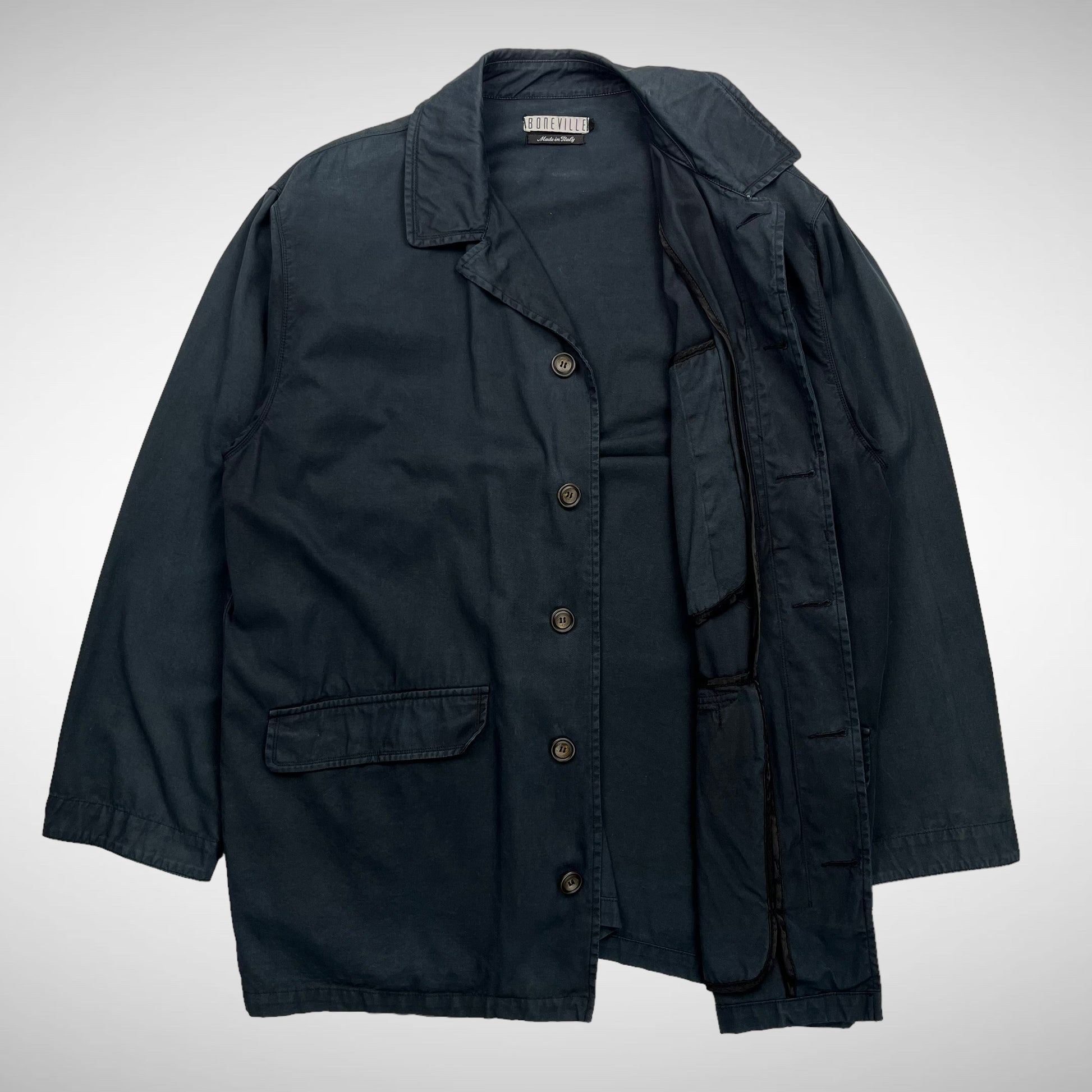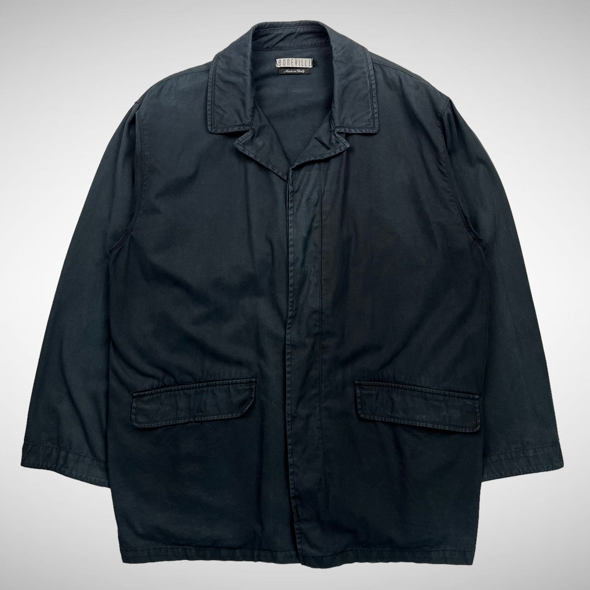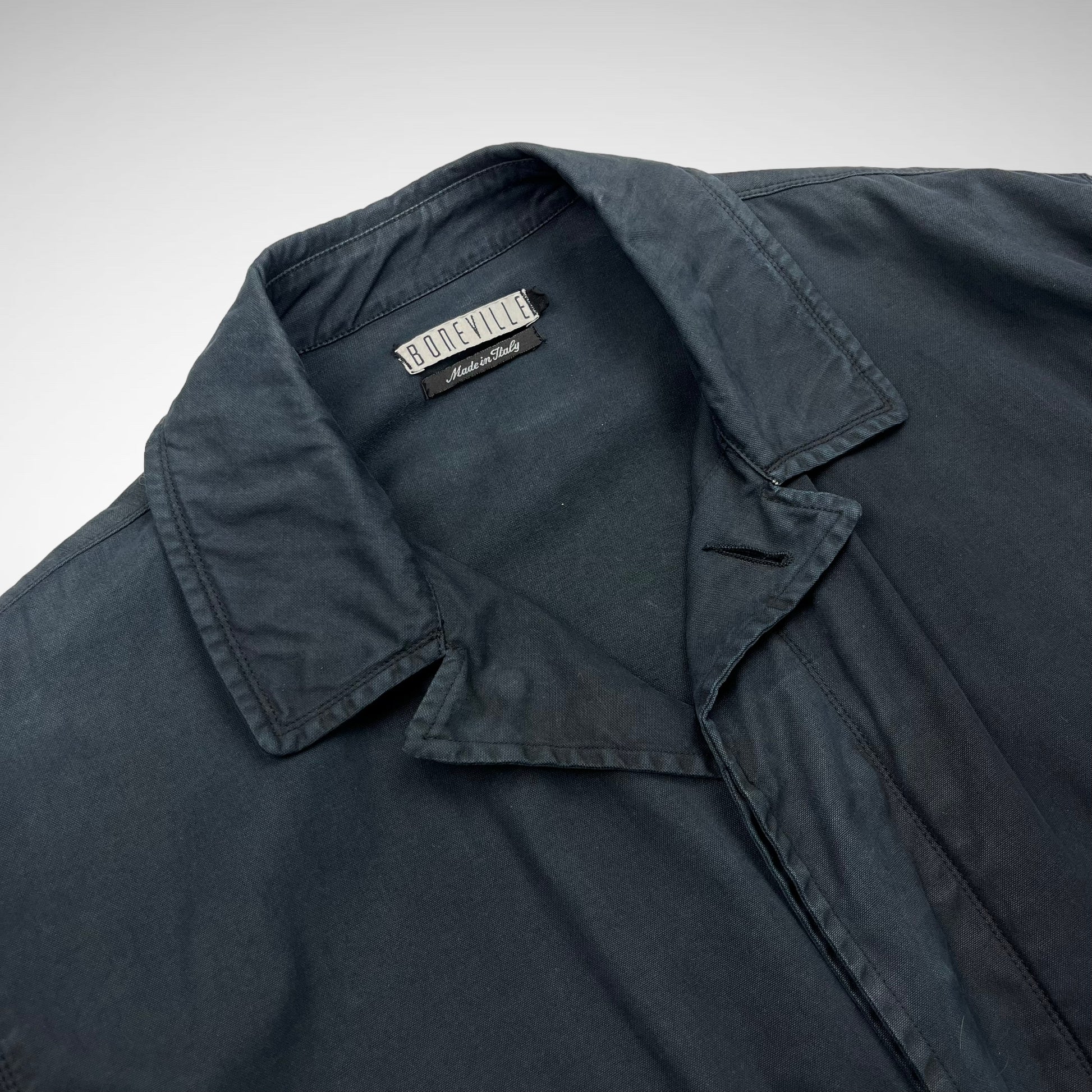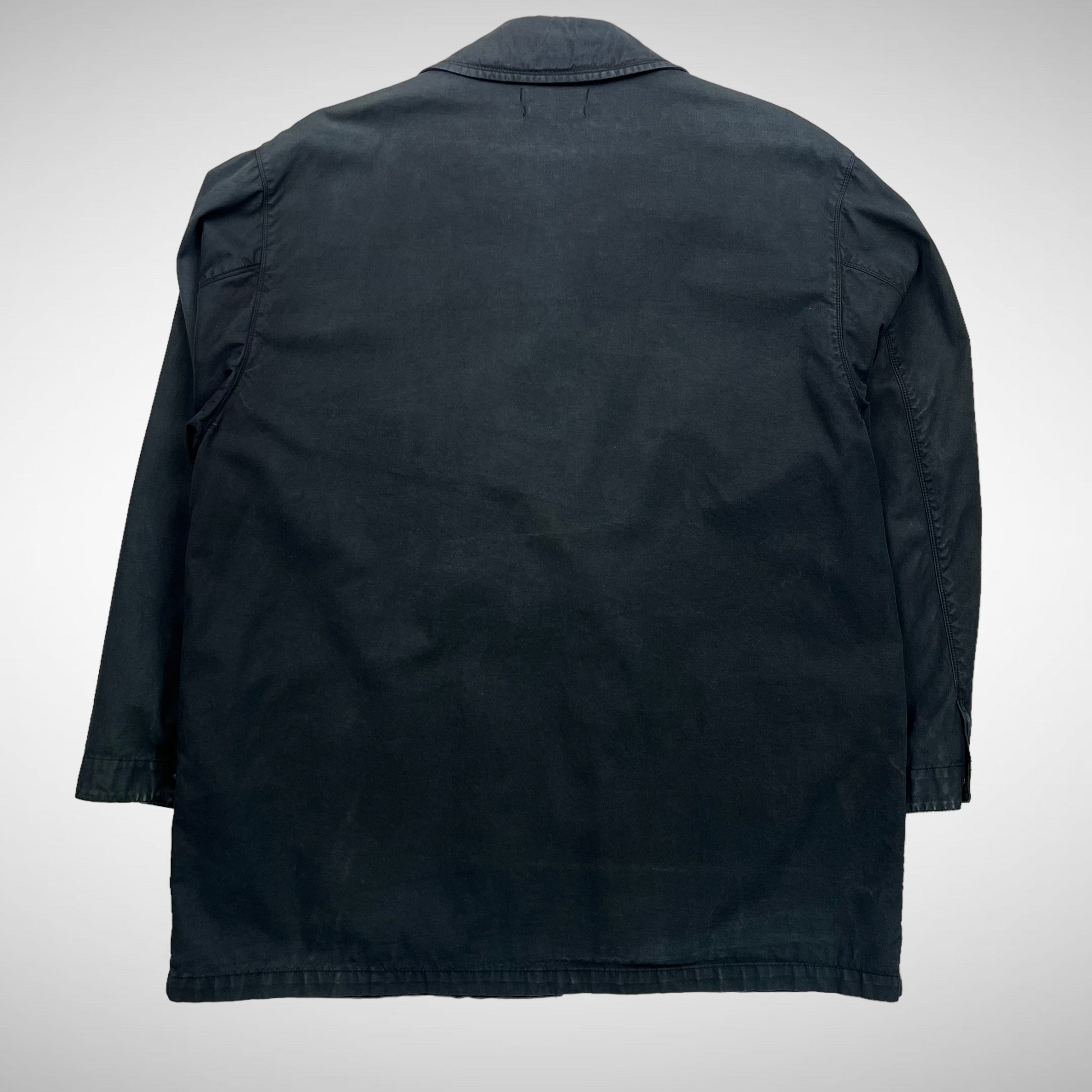 Spalmatura coated coat with hidden button-up closure except the top-one, fold down collar and double flap compartments.