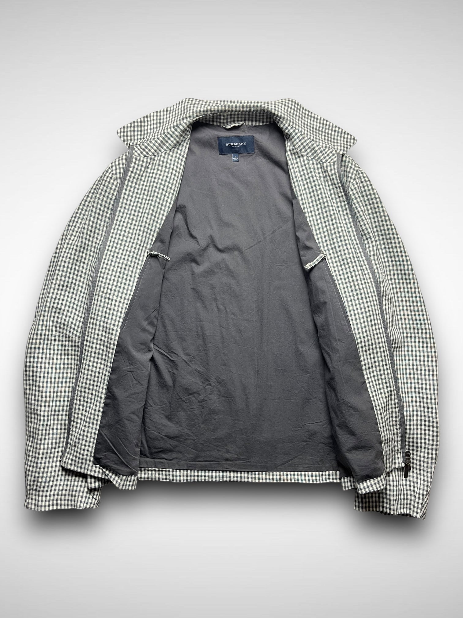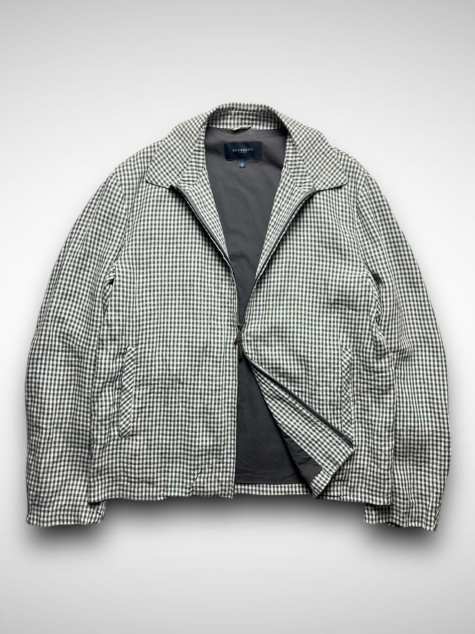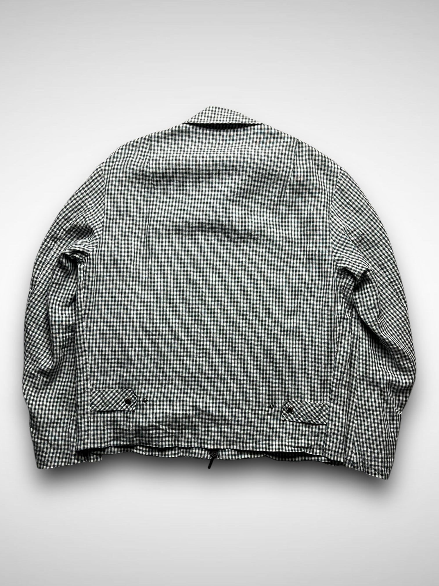 Featuring a crisp black-and-white gingham check pattern on lightweight cotton. Two-way zip, angled welt pockets, a soft grey cotton lining, and adjustable buttoned waist tabs at the back. Made in Italy.