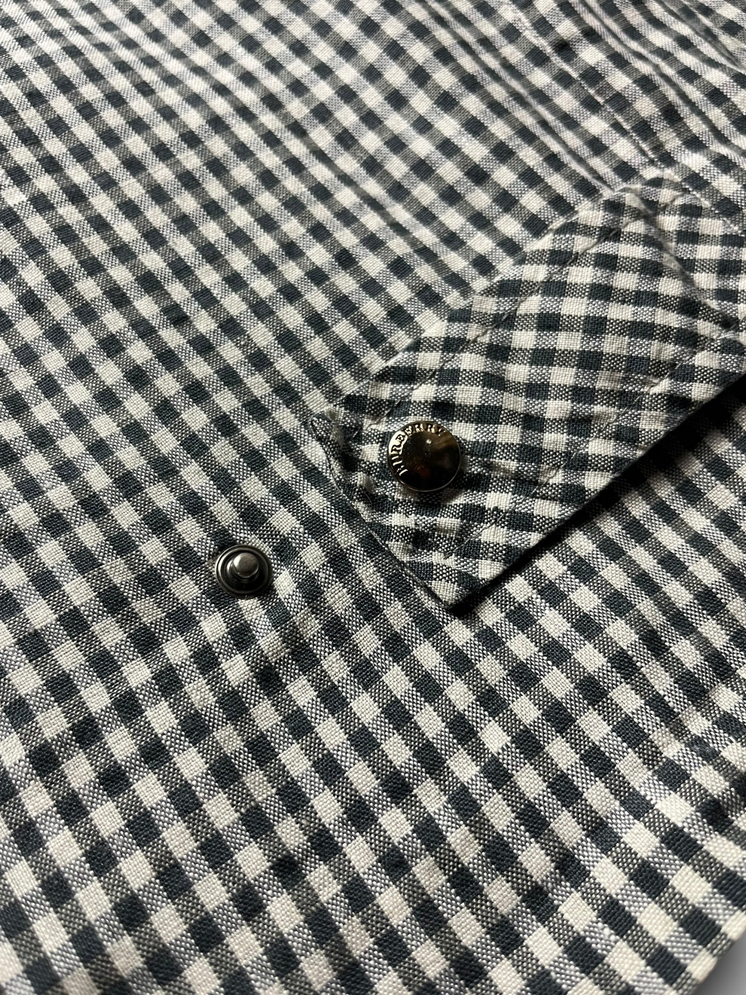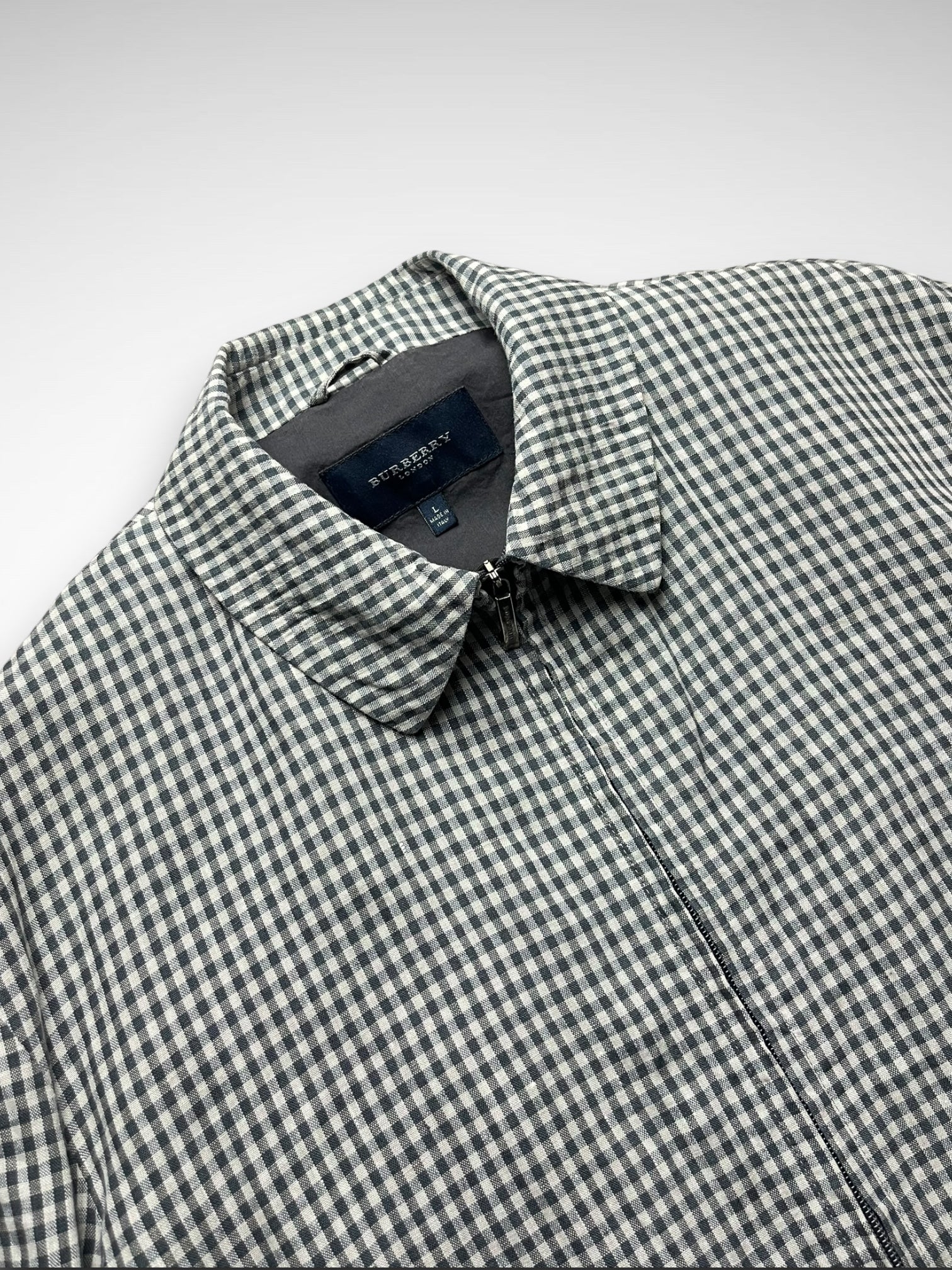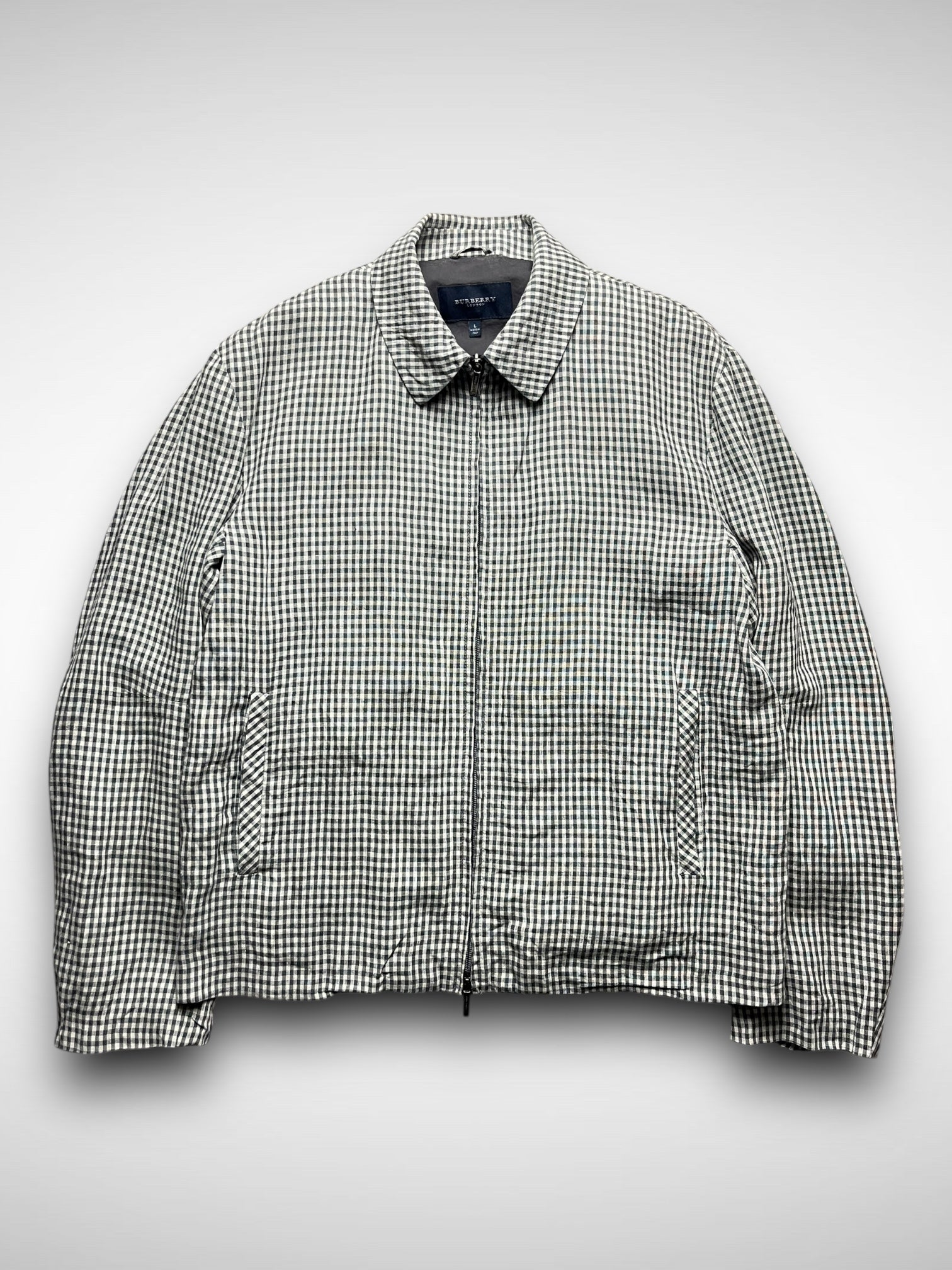 Featuring a crisp black-and-white gingham check pattern on lightweight cotton. Two-way zip, angled welt pockets, a soft grey cotton lining, and adjustable buttoned waist tabs at the back. Made in Italy.