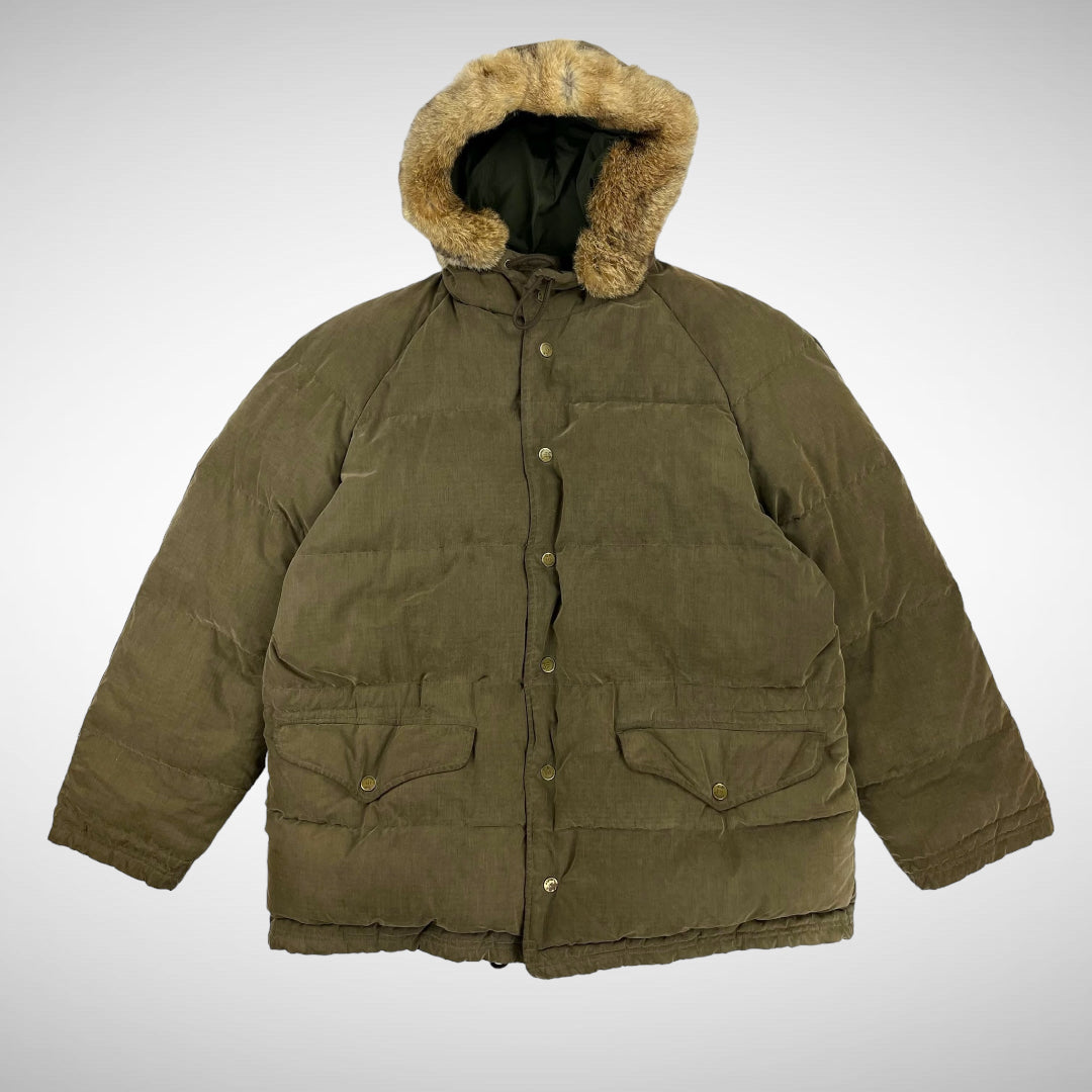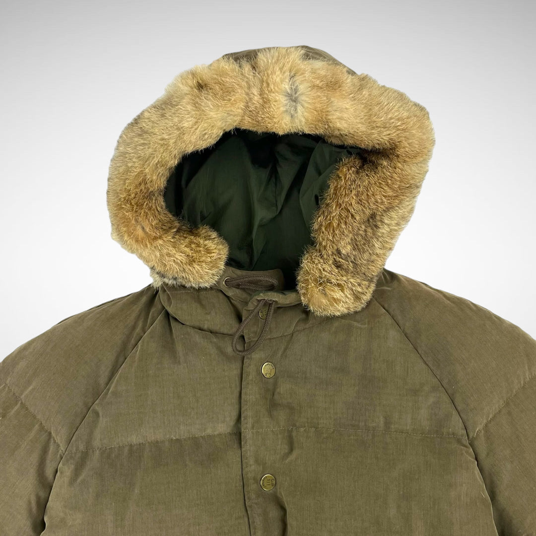 This jacket features detailed 991 metal buttons closure, 2 front and 1 inner pocket, adjustable drawstrings for waist and fur hood which is removable, and heavy down fill.