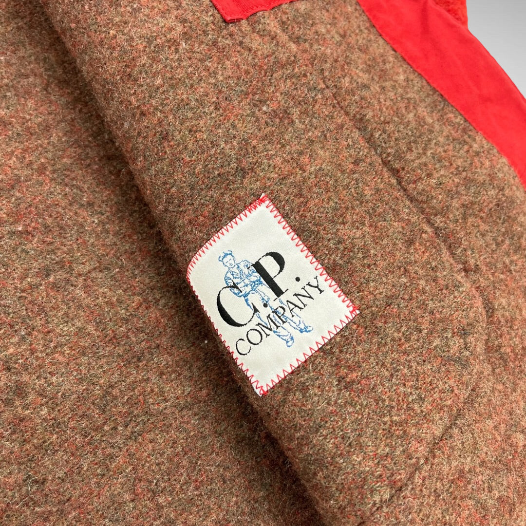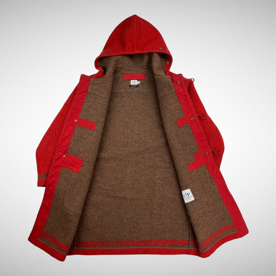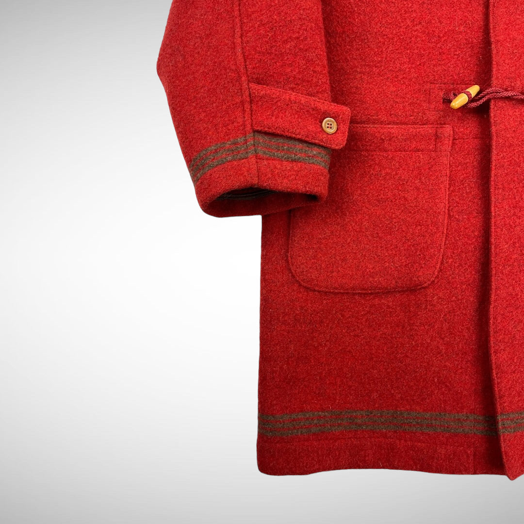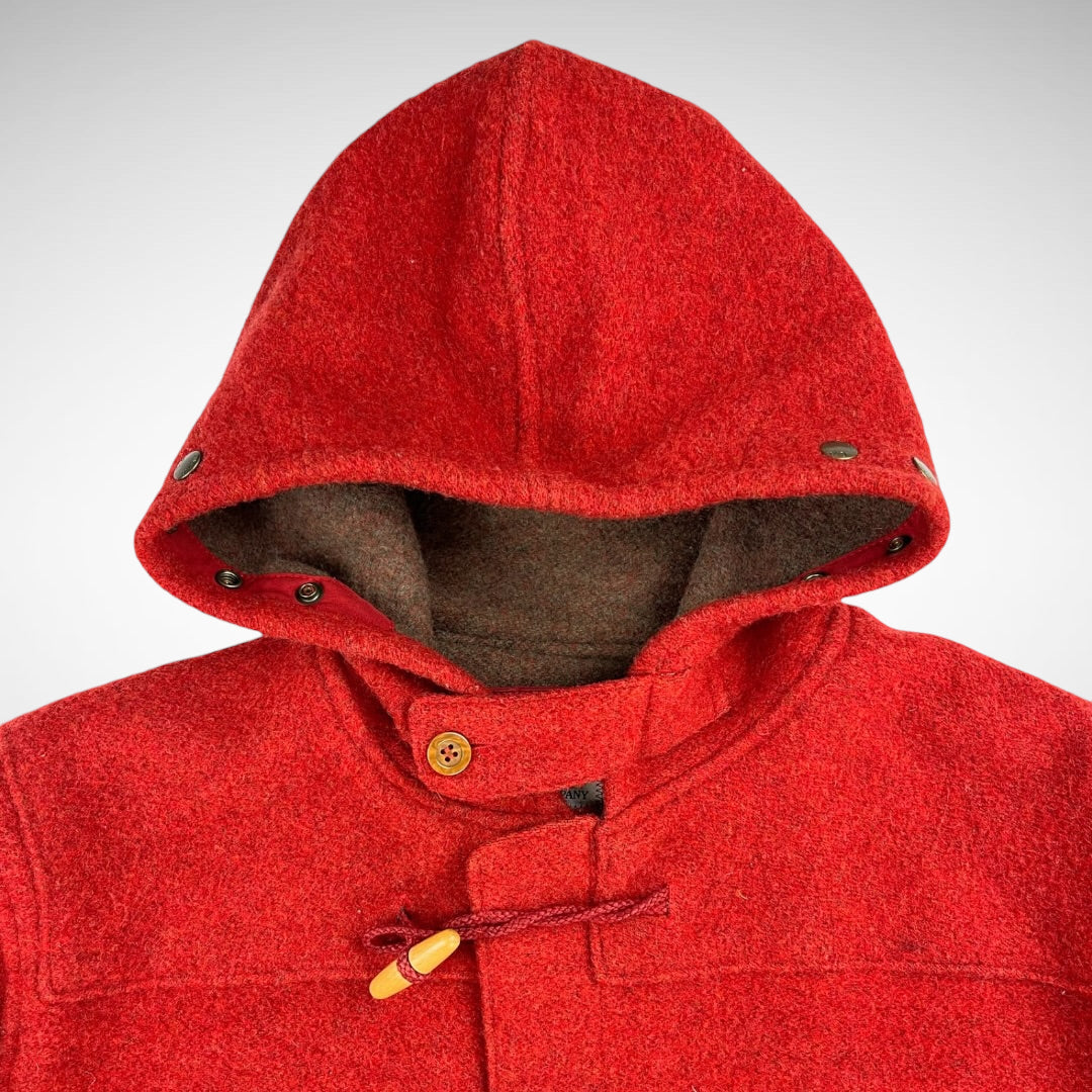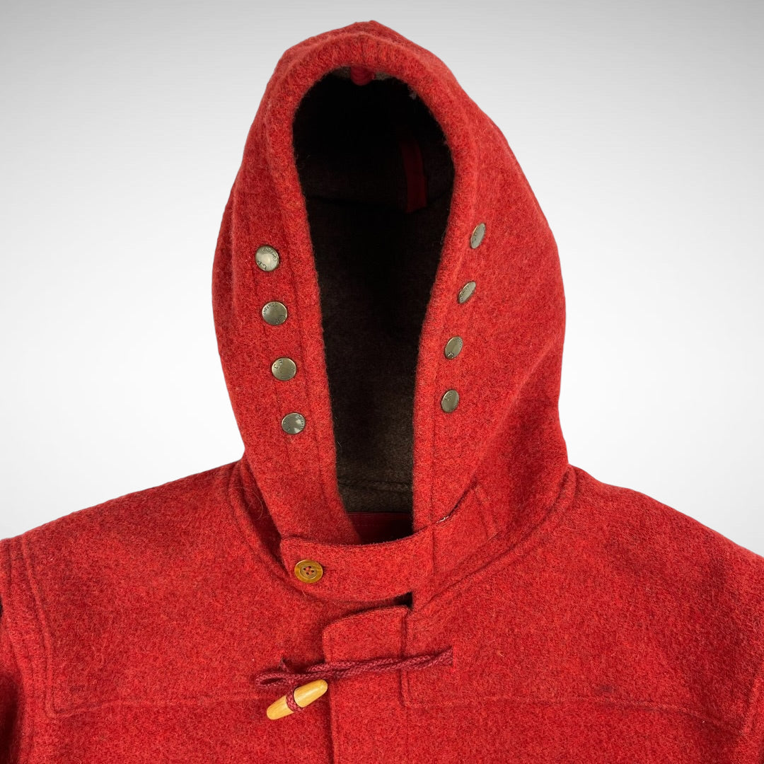 Red wool duffelcoat with double entry pockets on the front,quad-button adjustable hood, adjustable cuffs and collar, and details around waist and wrists.