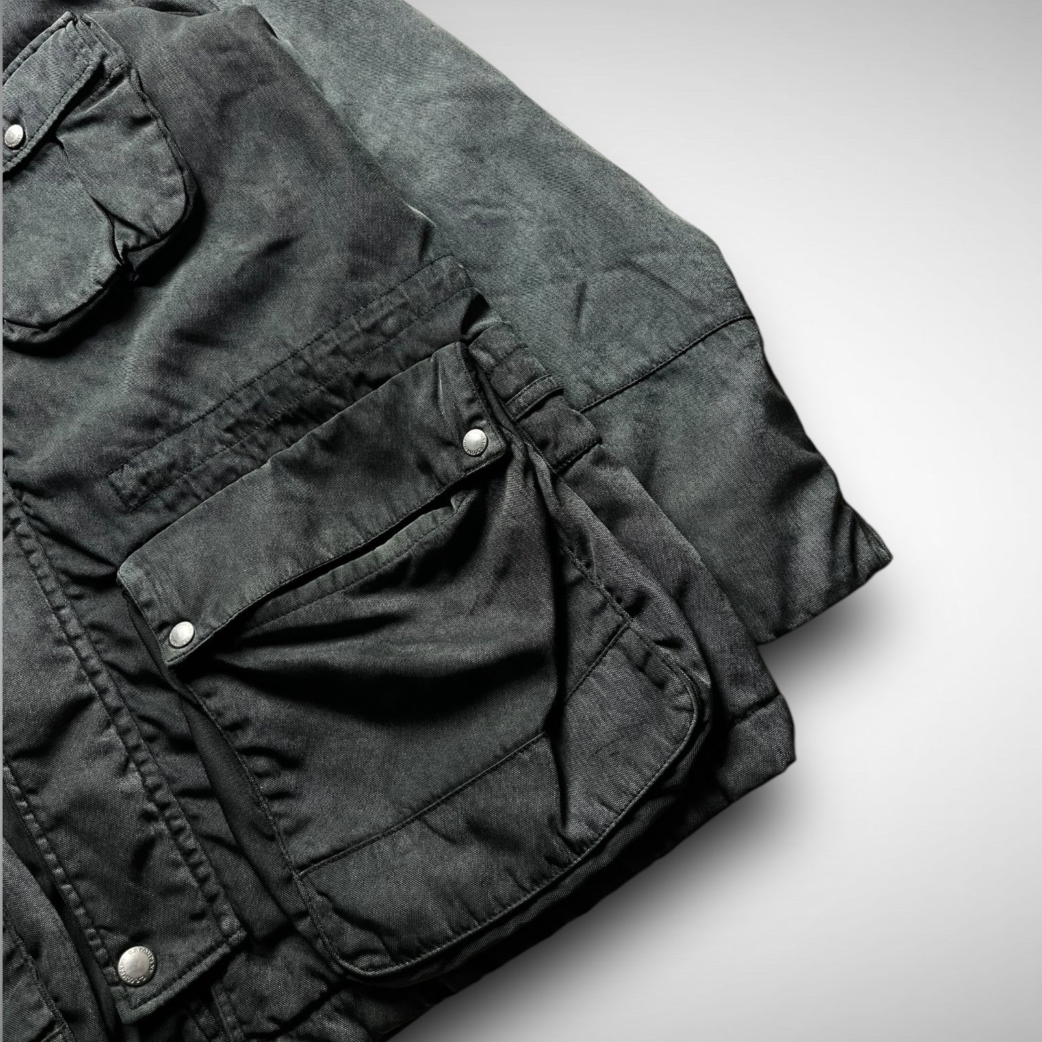 Black frost dyed with an ocean green shimmer sporting a Mille Miglia adjustable goggled hood, 3 flap press-button pockets on the front and a zip-compartment on the inside, adjustable hem and waist, and padded lining.
