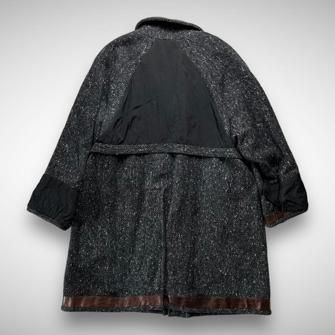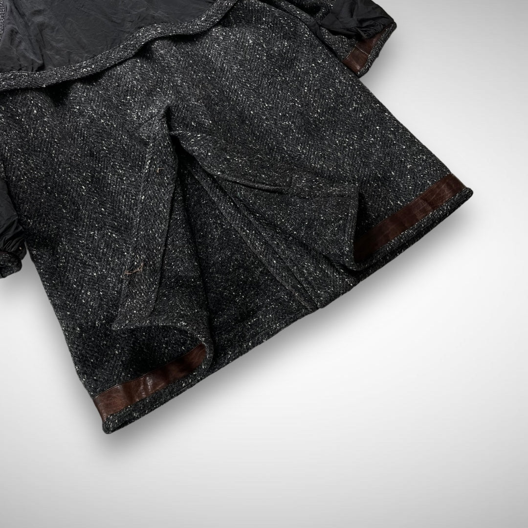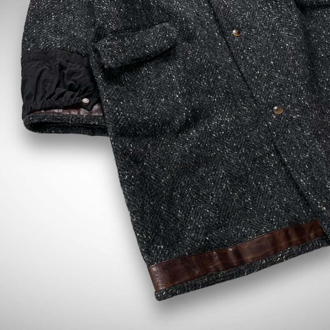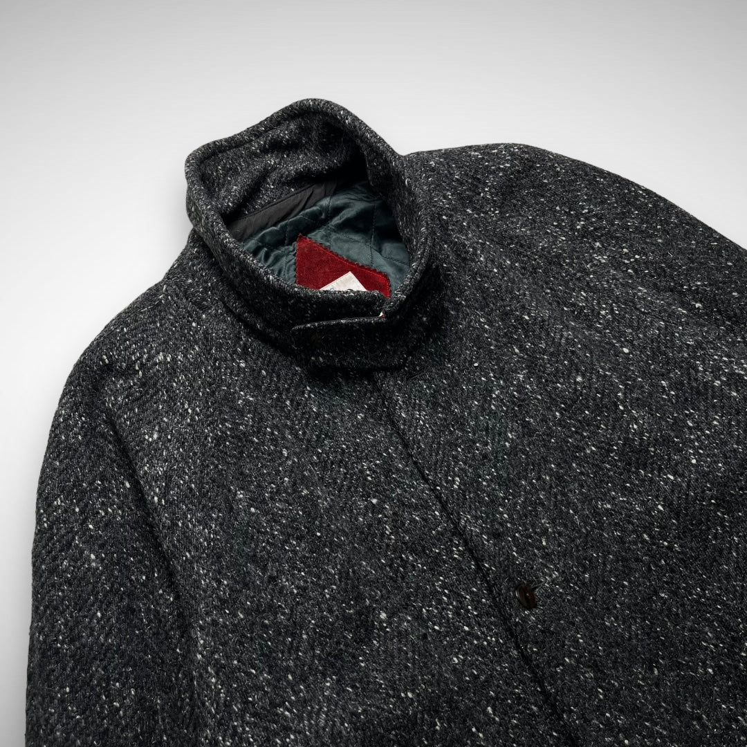 Heavy wool coat in a textured blend, flap cover pockets, button-up closure including collar, adjustable wrist with waterproof covers which are similar to the centre asymmetric back-panel, padded liner and brown leather details and rims throughout.