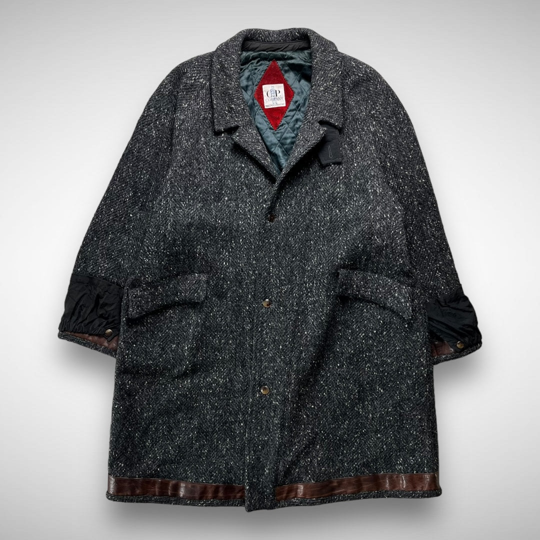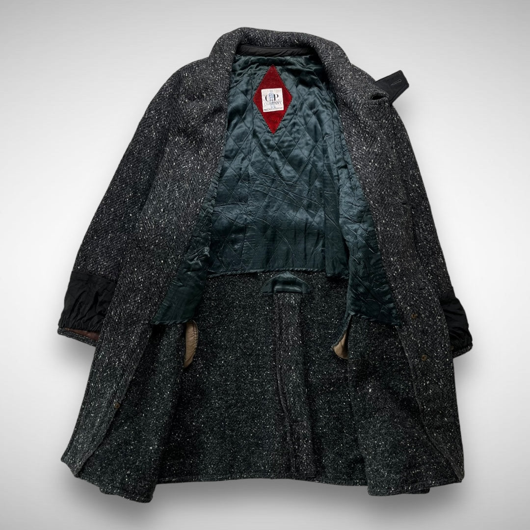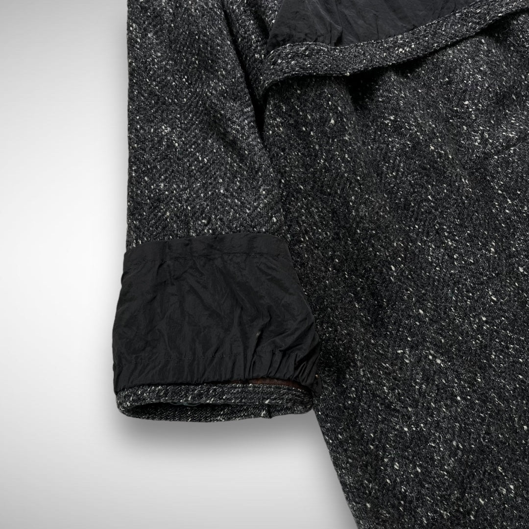 Heavy wool coat in a textured blend, flap cover pockets, button-up closure including collar, adjustable wrist with waterproof covers which are similar to the centre asymmetric back-panel, padded liner and brown leather details and rims throughout.